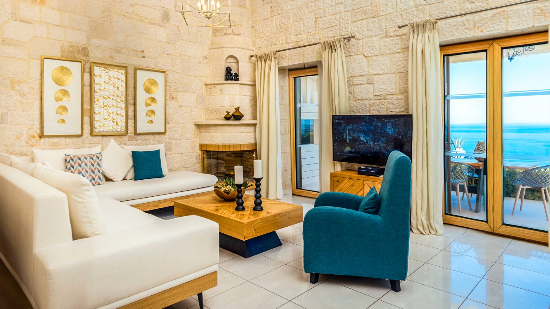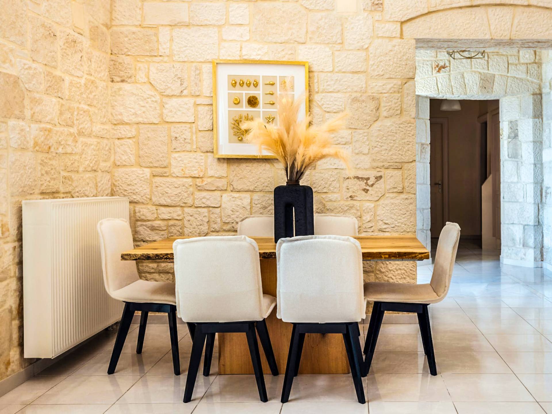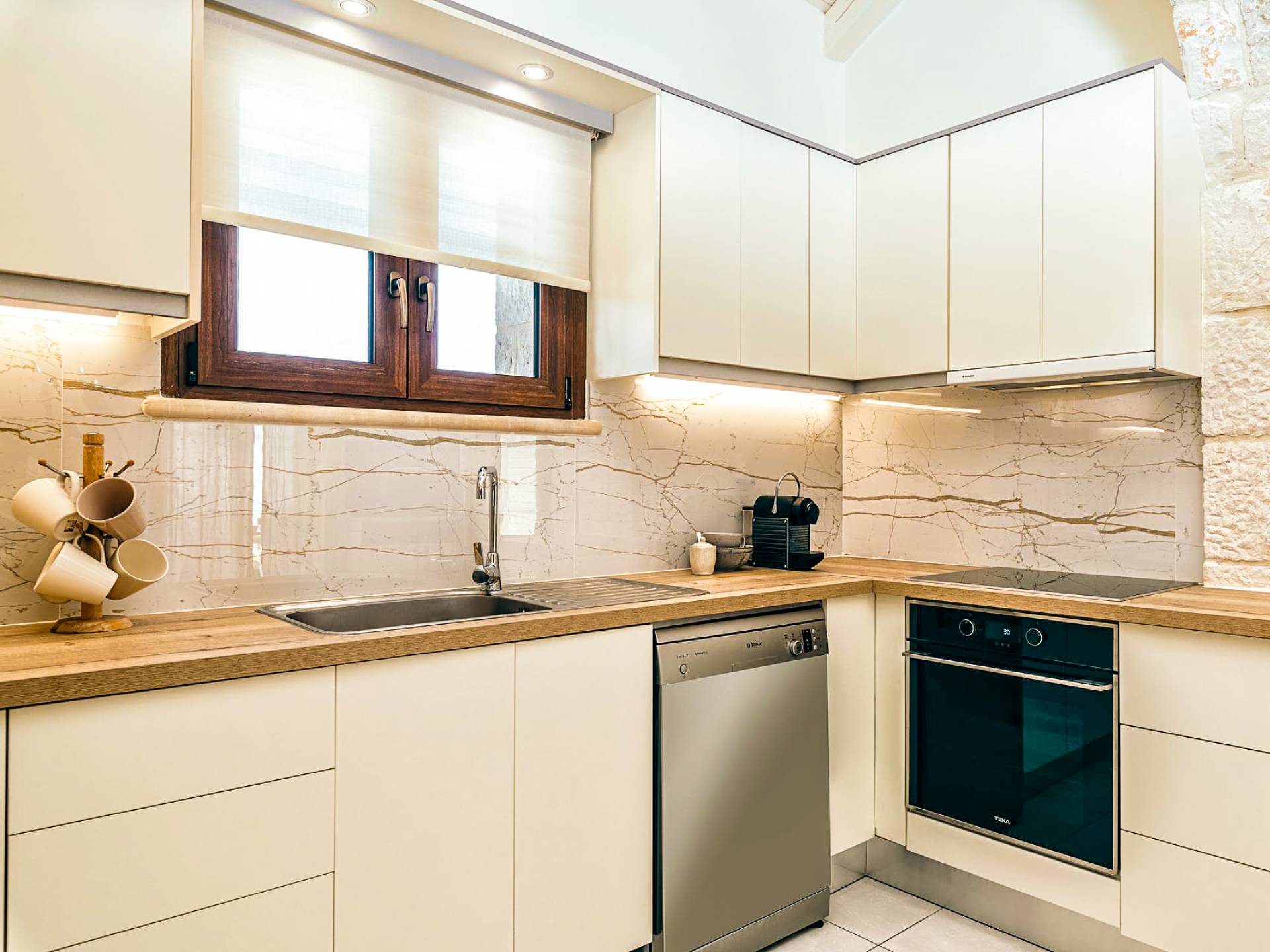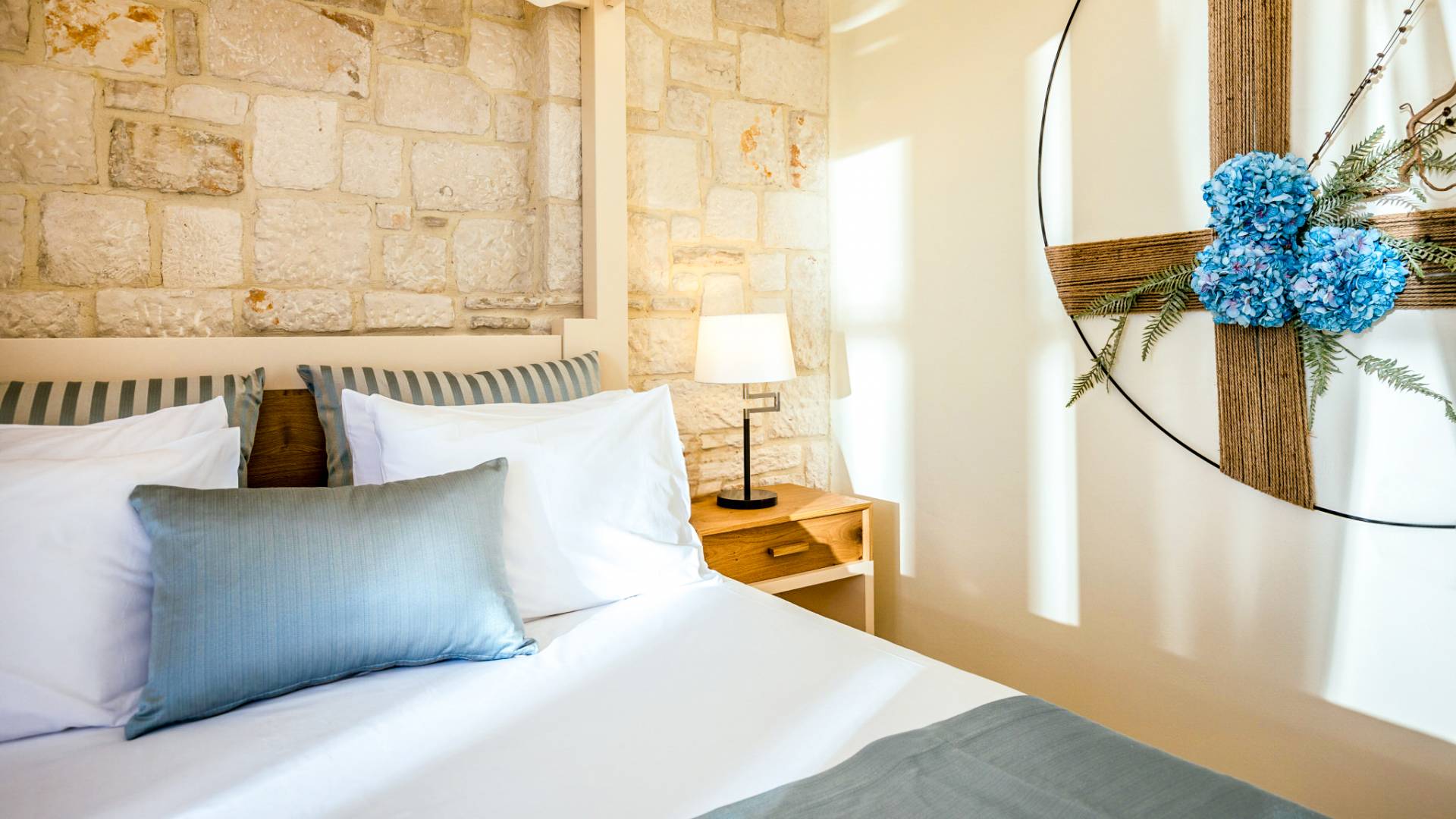 A marble staircase leads you to the first floor that consists of two more bedrooms: one master bedroom (double bed) with an en-suite full bathroom and one twin bedroom with an en-suite shower room.