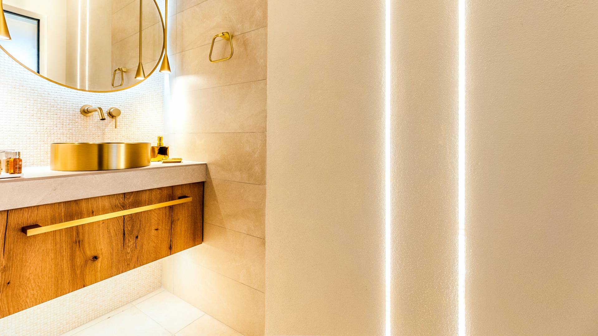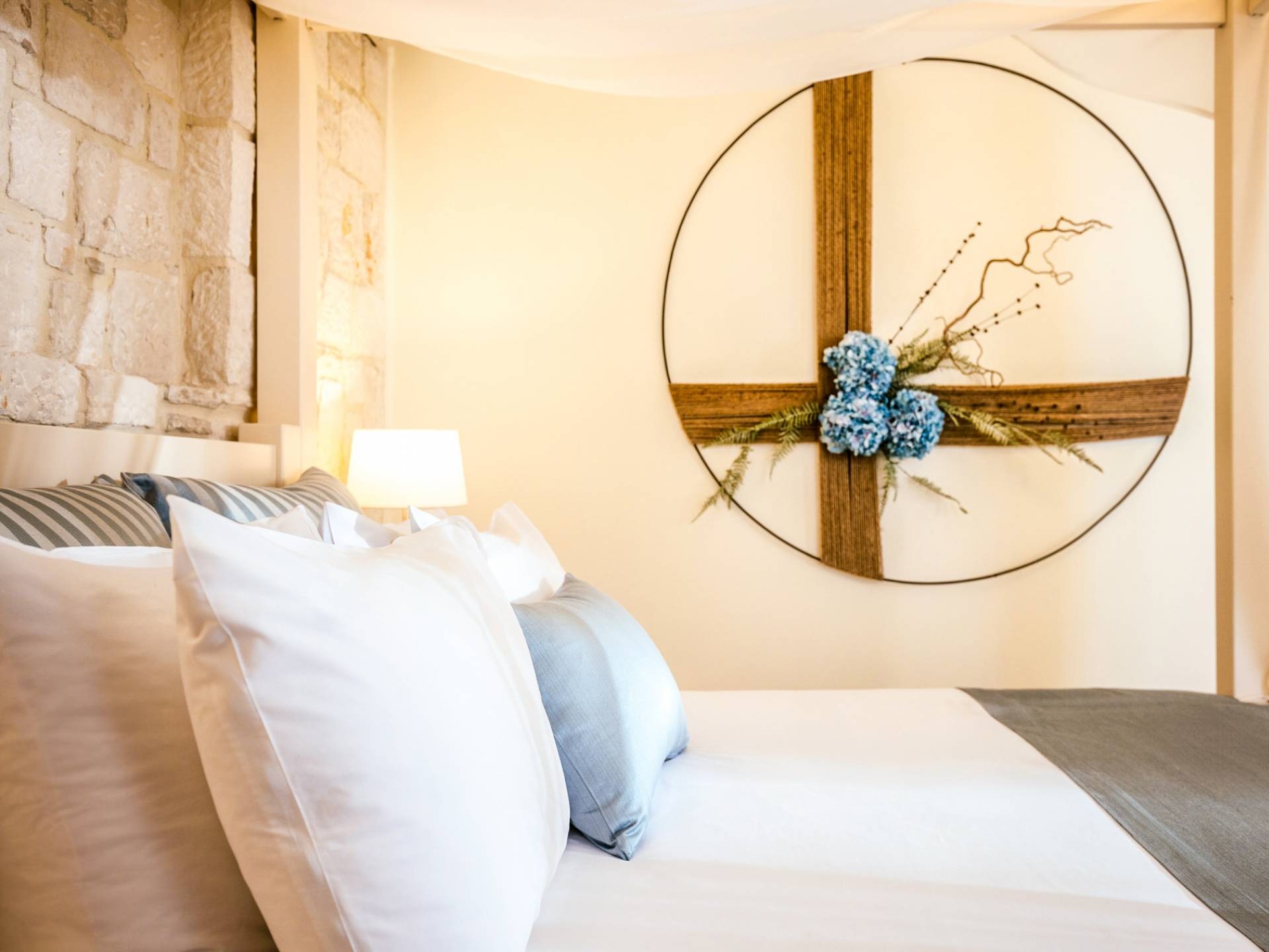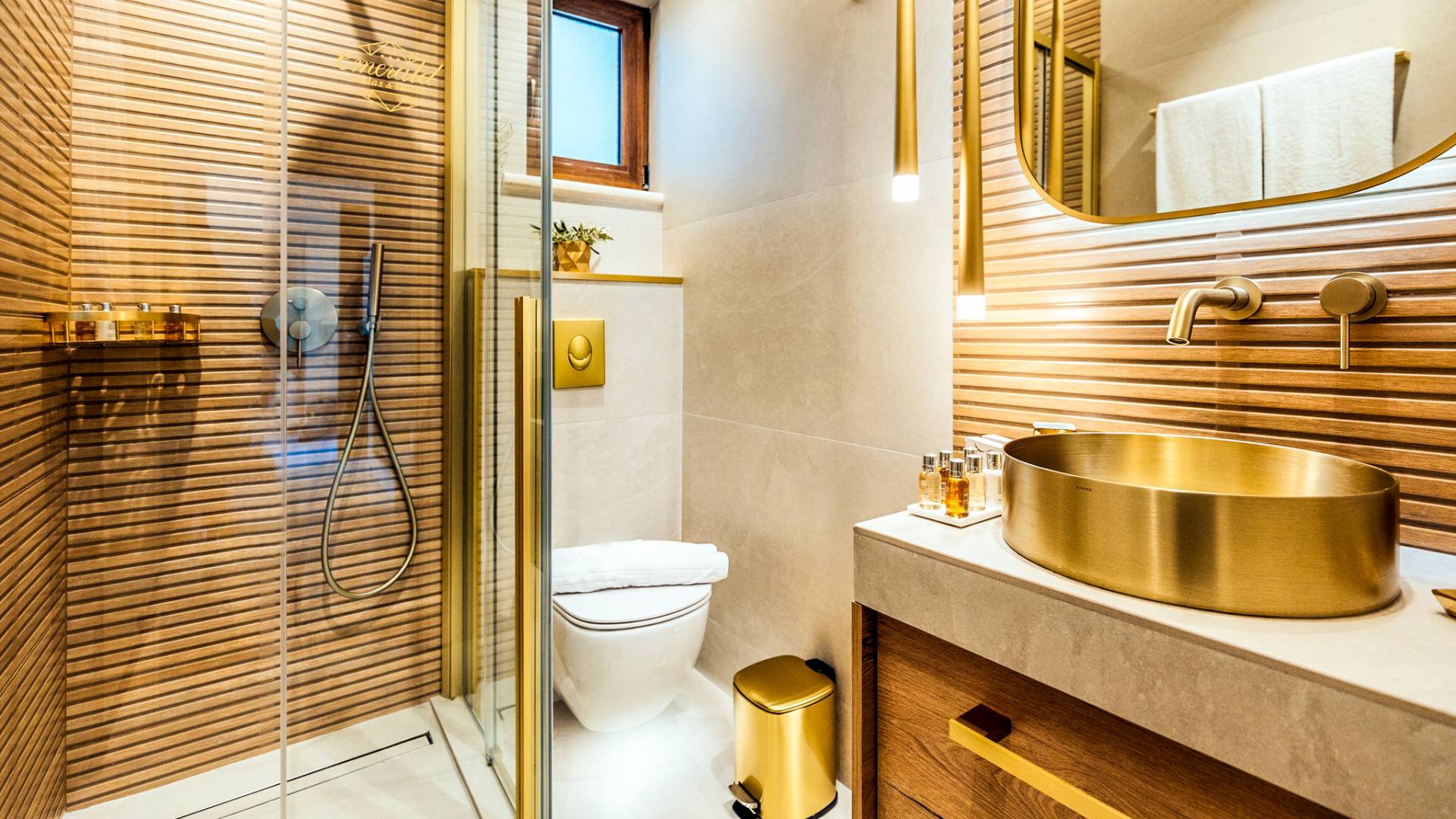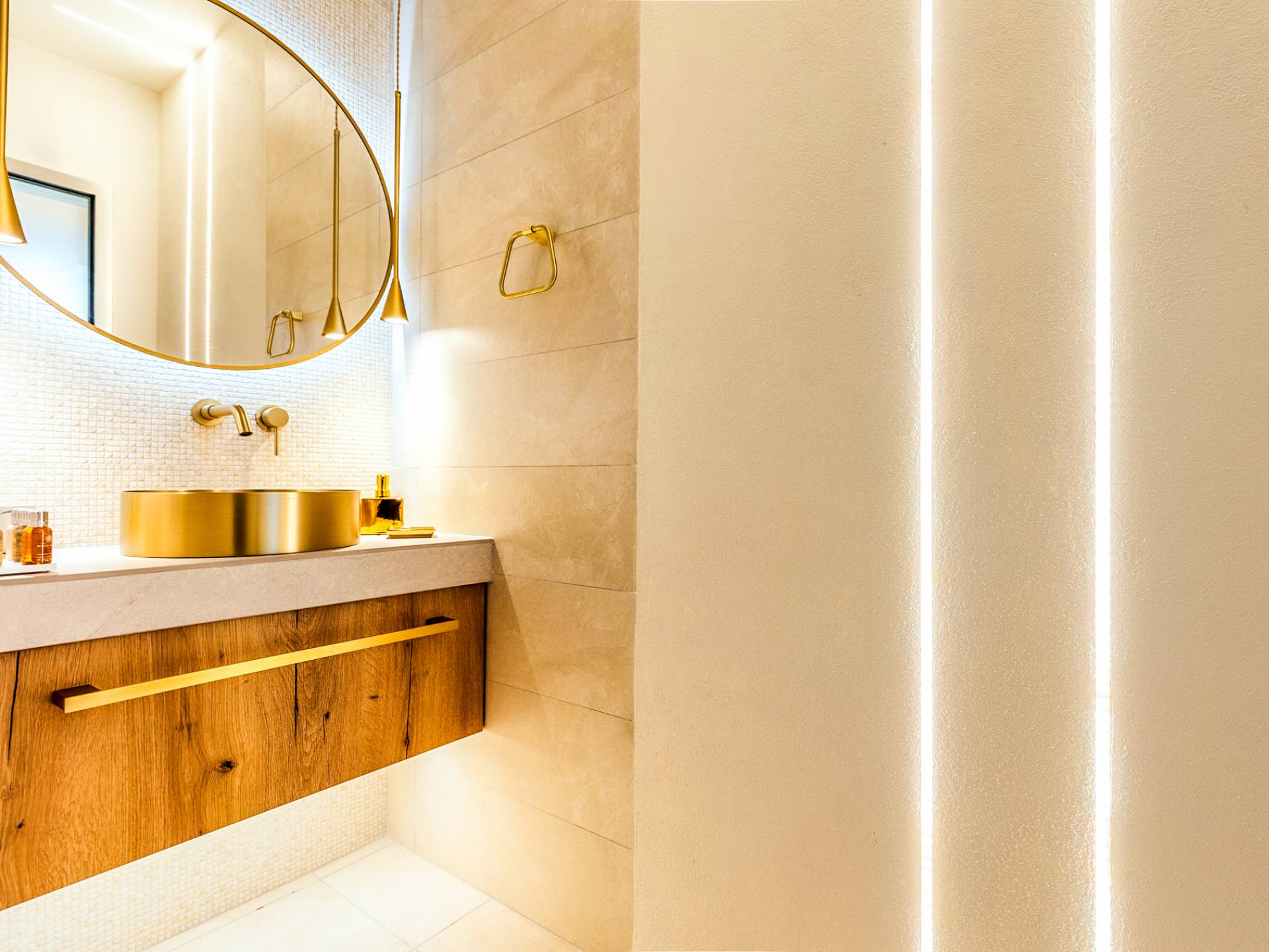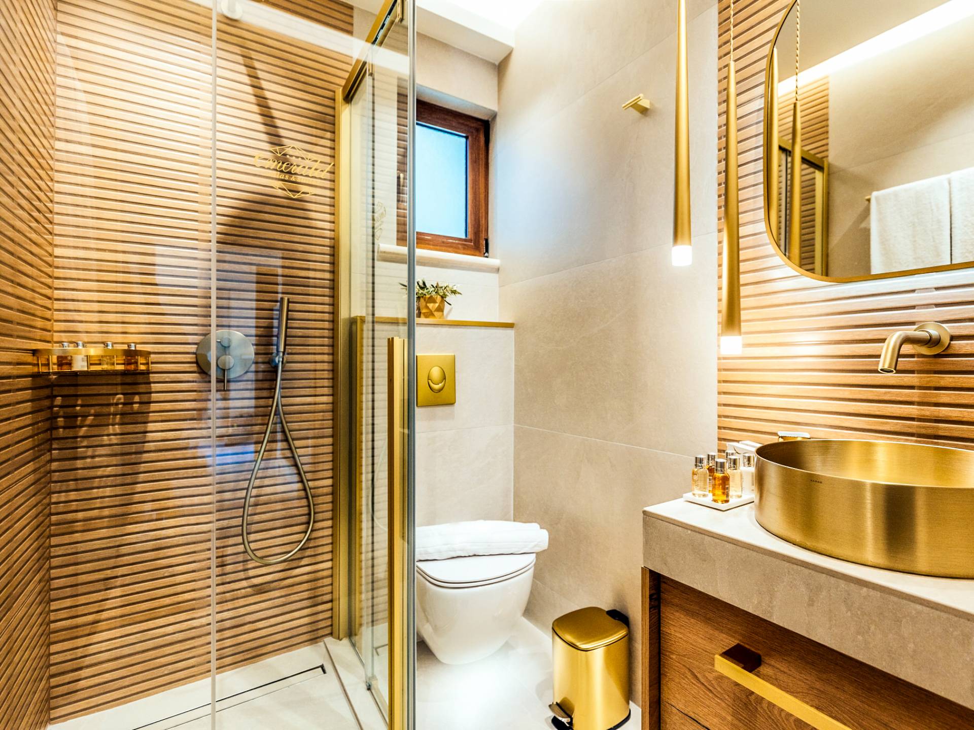 A marble staircase leads you to the first floor that consists of two more bedrooms: one master bedroom (double bed) with an en-suite full bathroom and one twin bedroom with an en-suite shower room.
