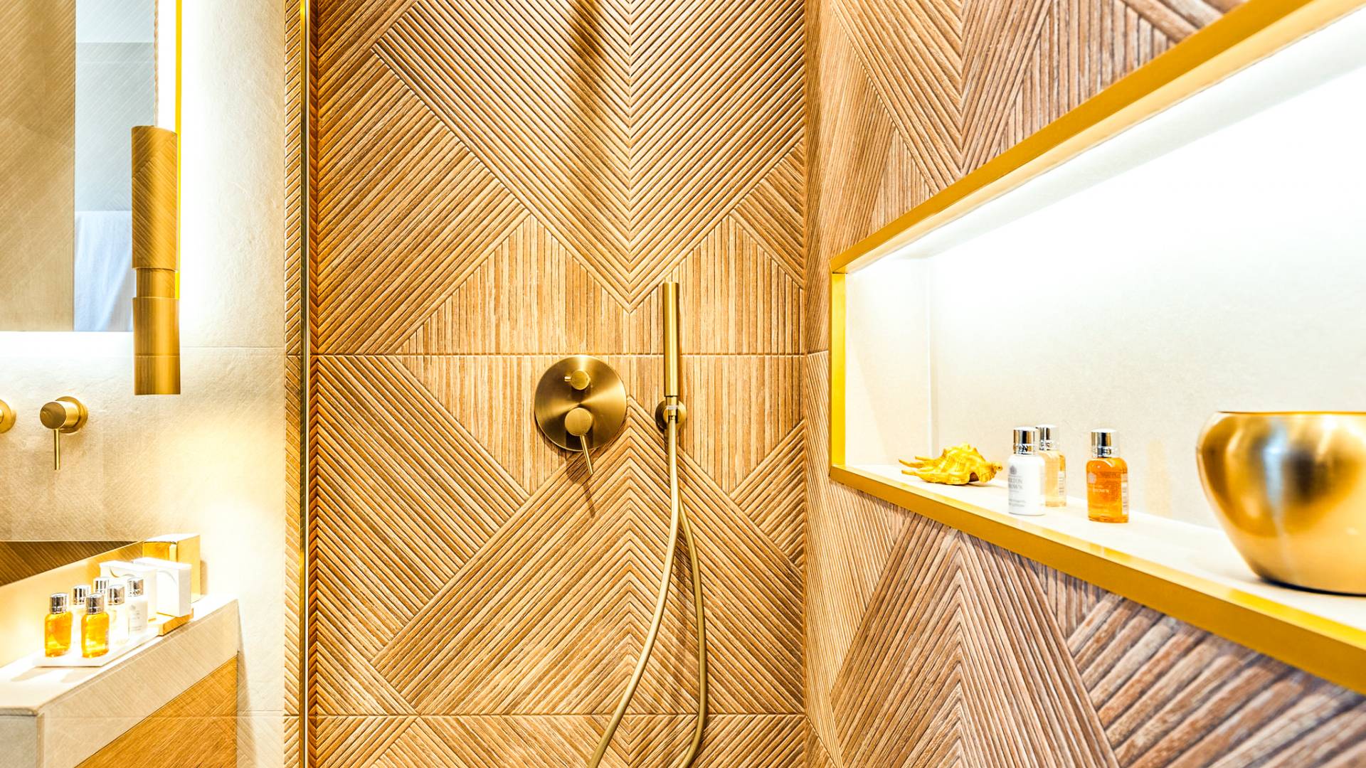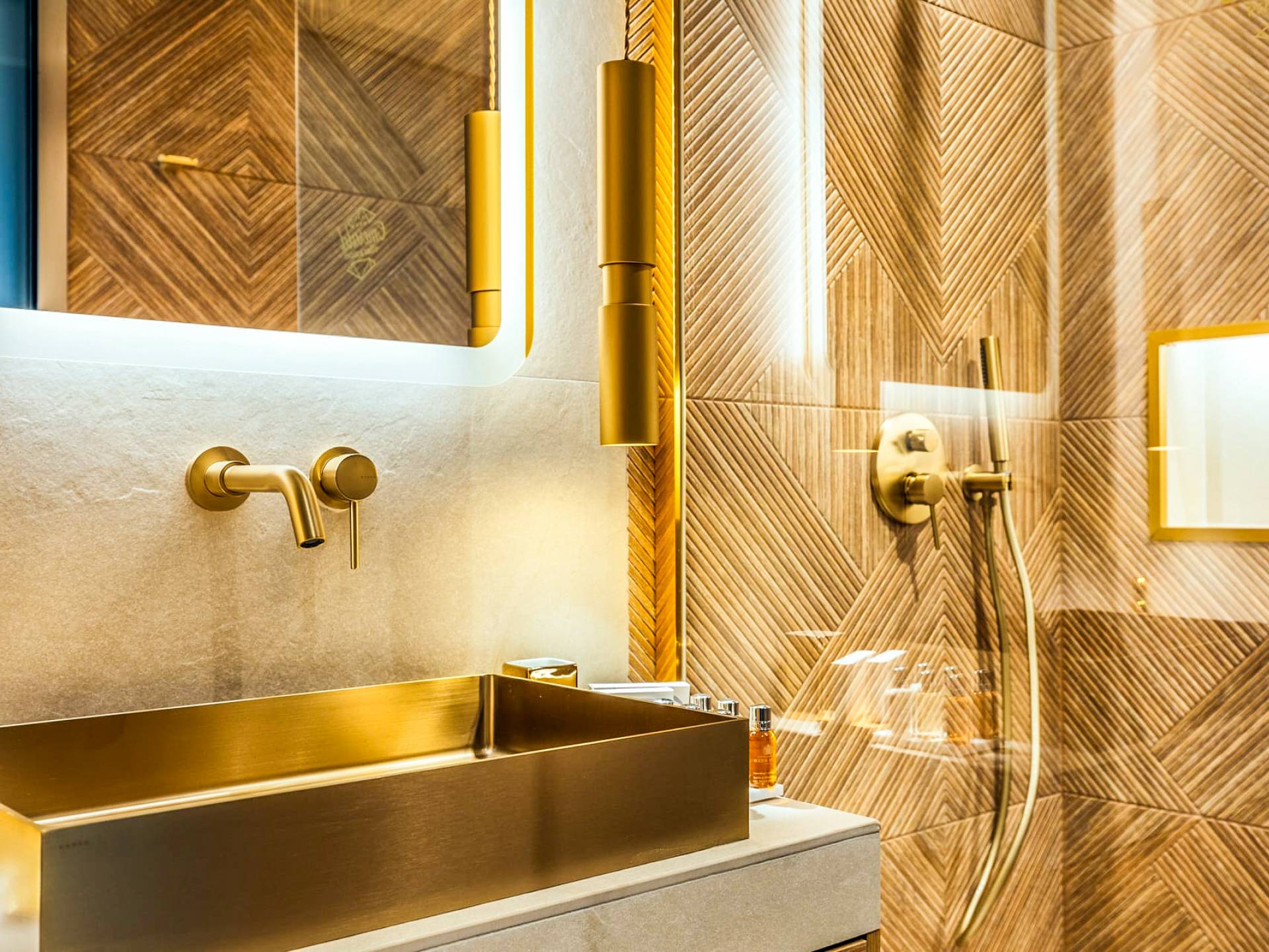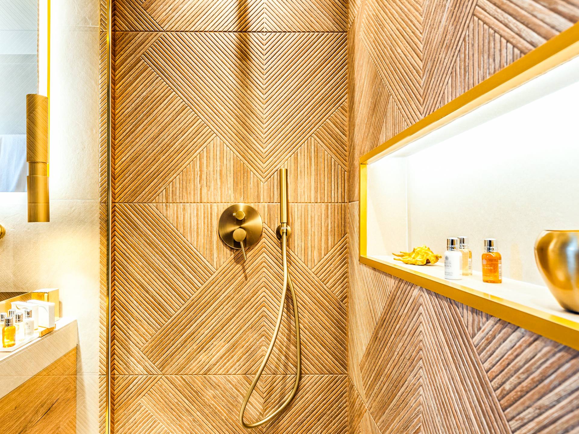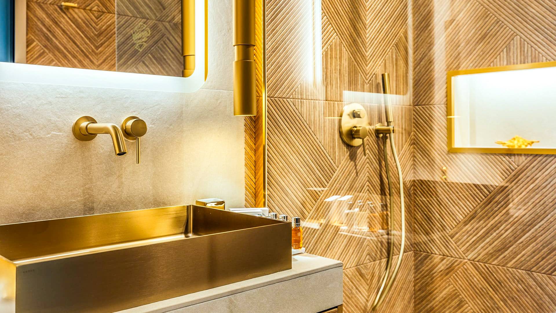 A marble staircase leads you to the first floor that consists of two more bedrooms: one master bedroom (double bed) with an en-suite full bathroom and one twin bedroom with an en-suite shower room.