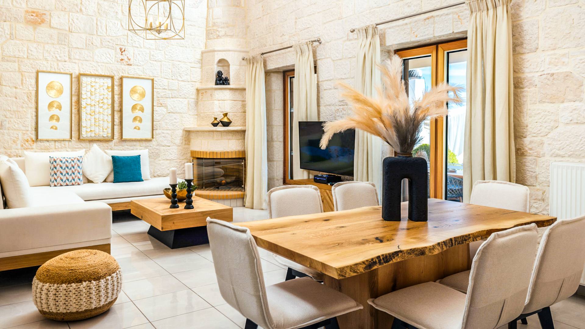 On the ground floor, there is an open plan living/dining area with a fireplace, a large corner sofa and patio doors, a fully equipped kitchen with electric appliances and a full range of cooking equipment/utensils, a master bedroom with a double bed and en suite full bathroom and a twin bedroom with a shower/w-c room next to it. There is also a utility room with a washing machine, iron, and ironing board.