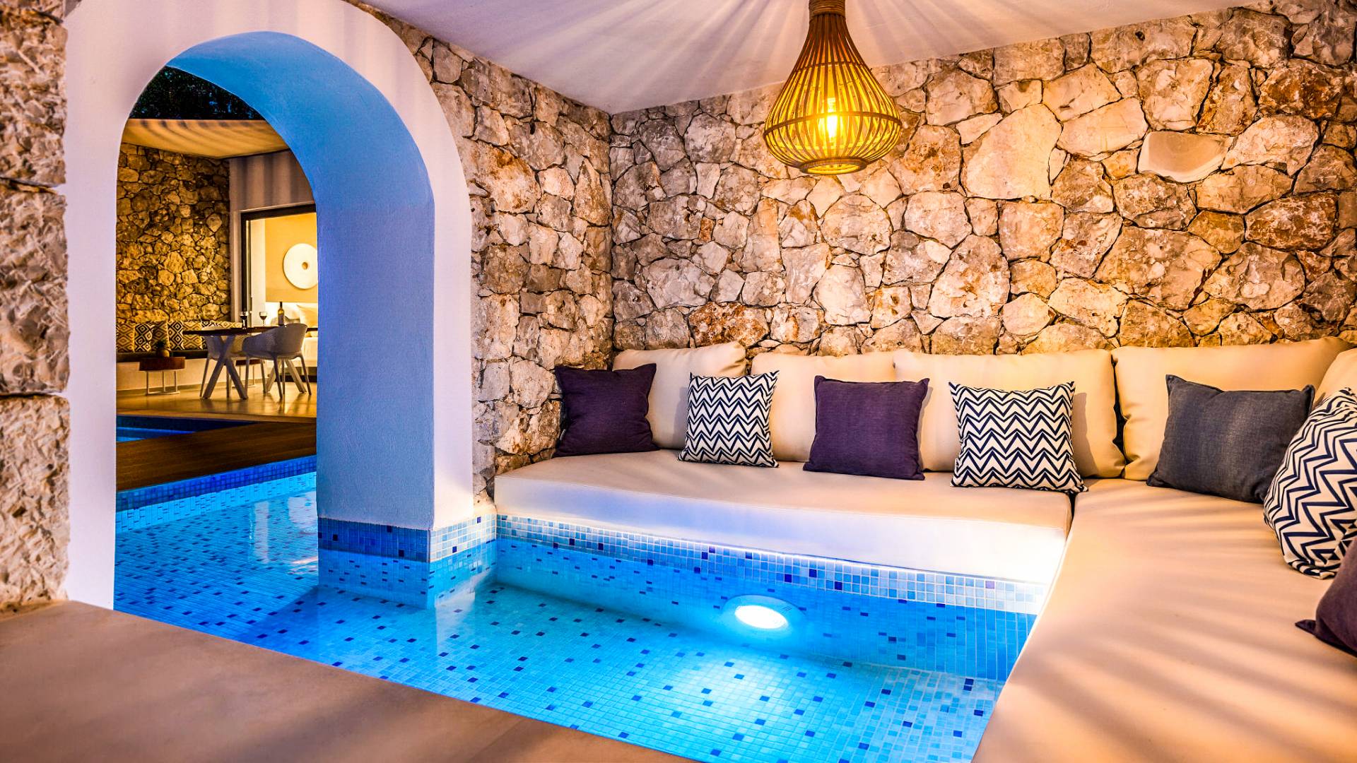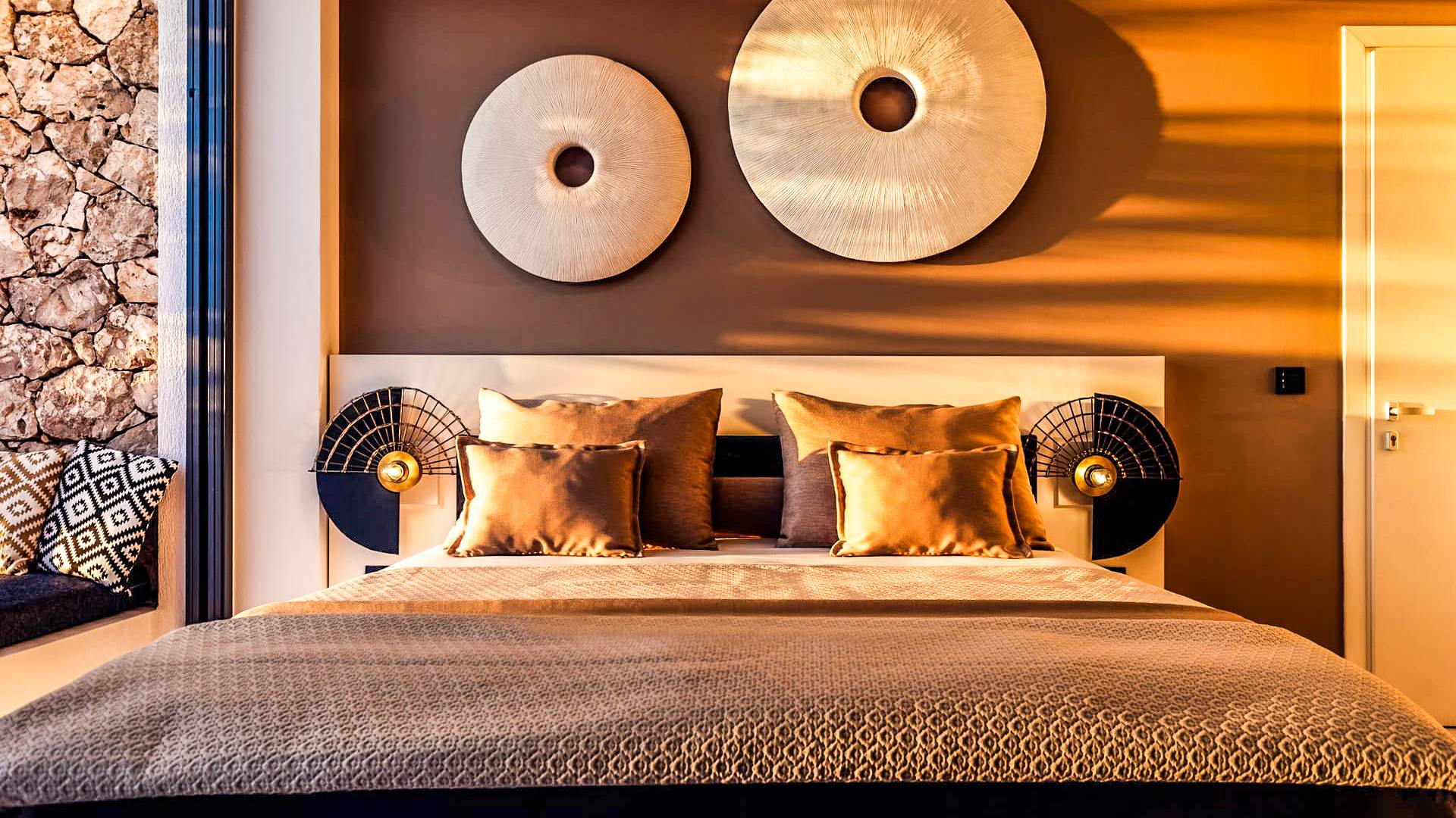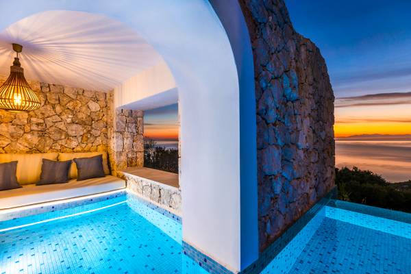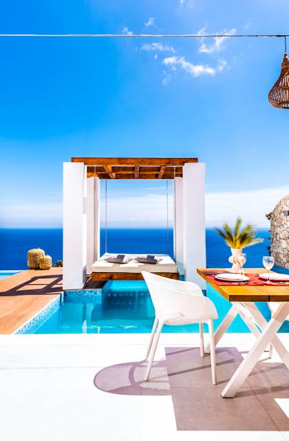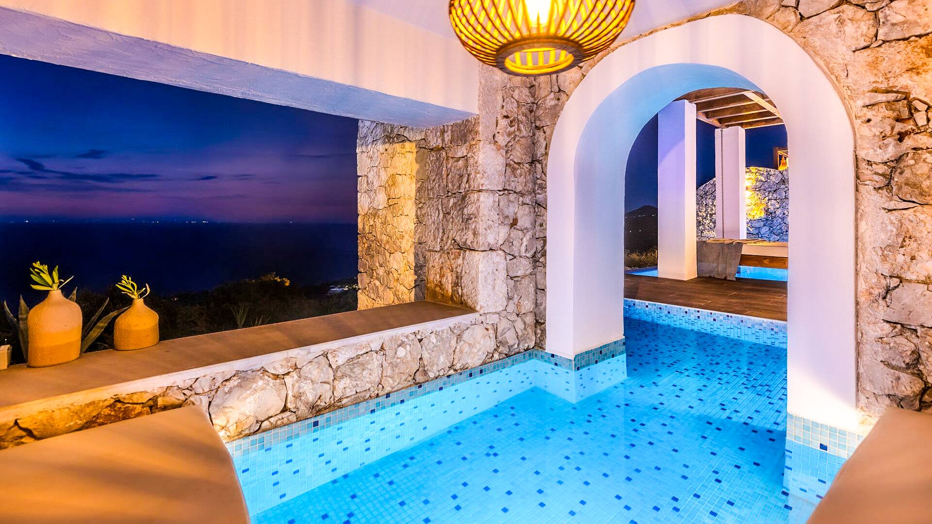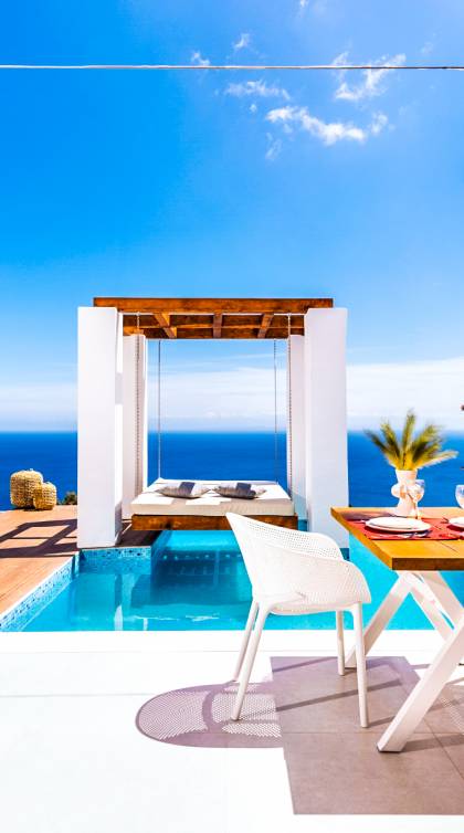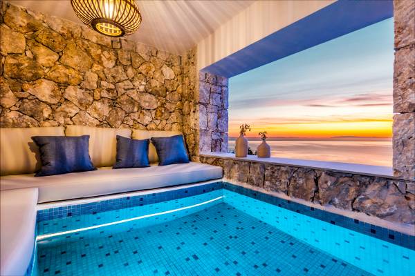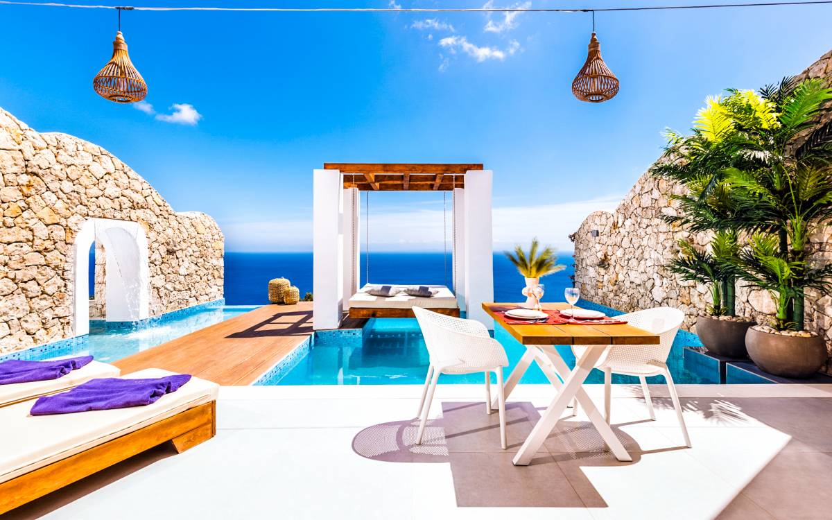 Carved into the hillside, the suite features a spacious open-plan living area that blends comfort with a romantic ambiance. Floor-to-ceiling glass doors open onto a stunning private terrace, where you’ll find your own infinity pool with hydromassage, as well as a unique cave-style plunge pool.