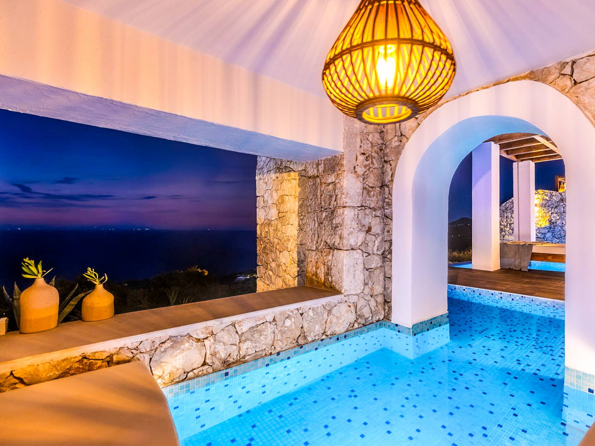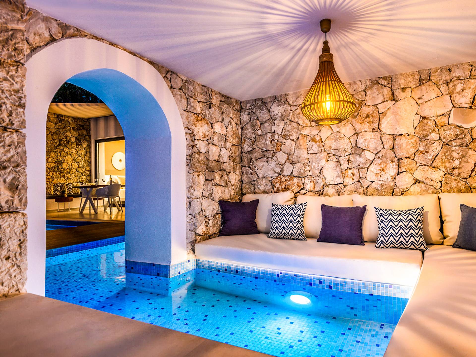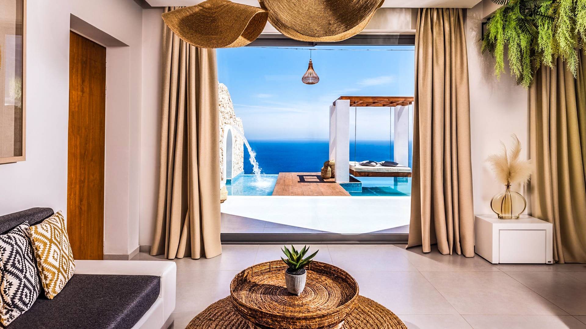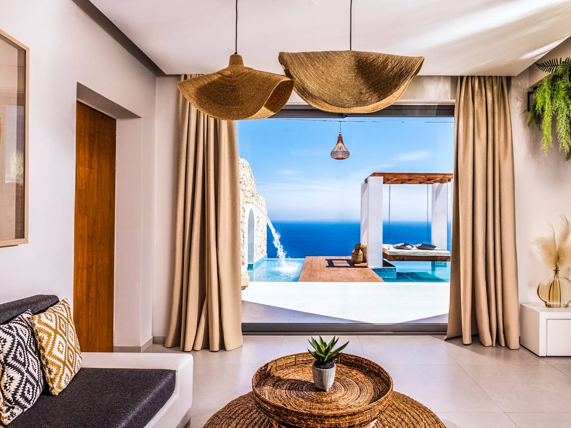 Carved into the hillside, the suite features a spacious open-plan living area that blends comfort with a romantic ambiance. Floor-to-ceiling glass doors open onto a stunning private terrace, where you’ll find your own infinity pool with hydromassage, as well as a unique cave-style plunge pool.