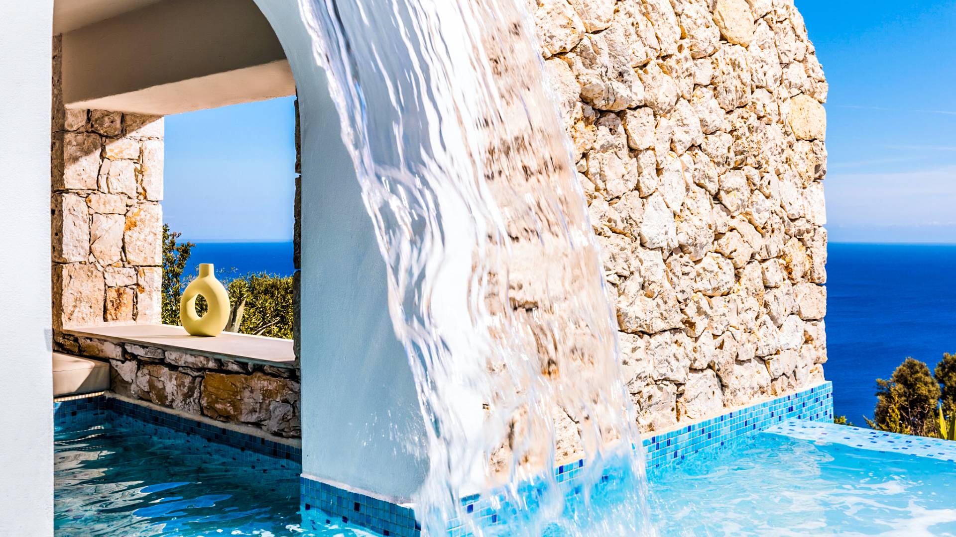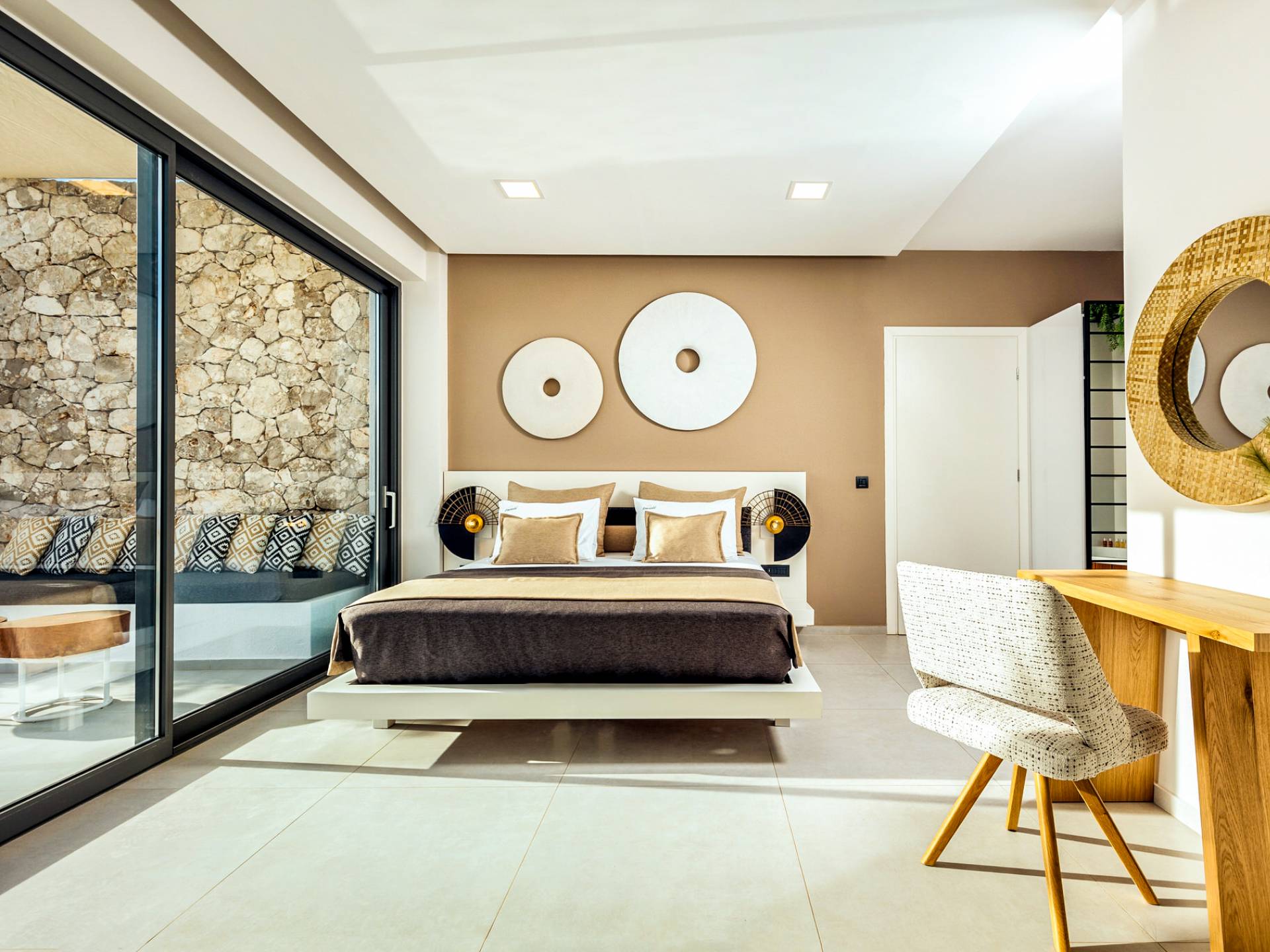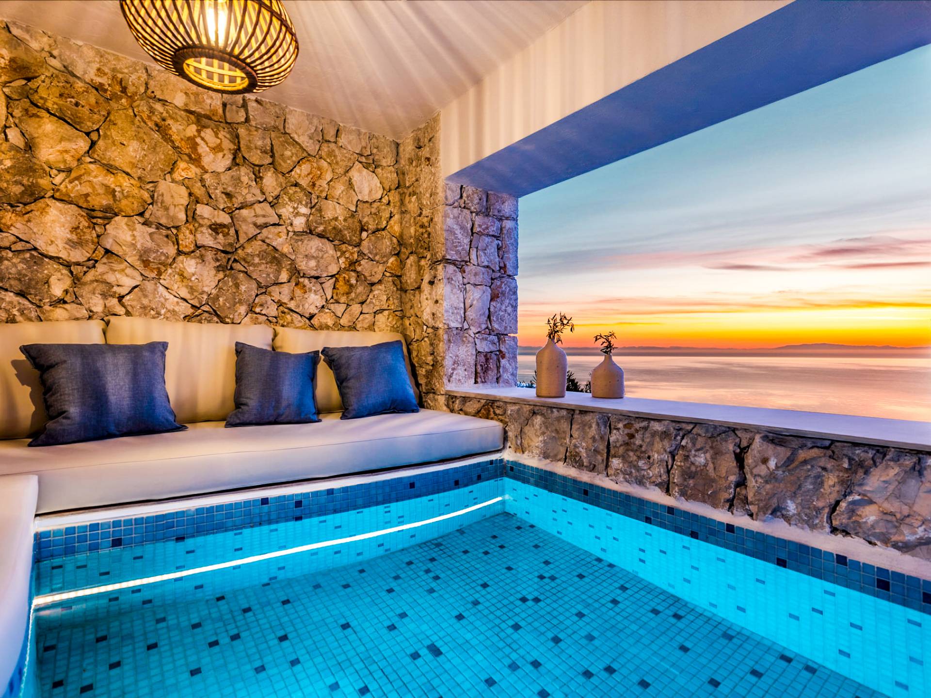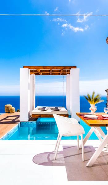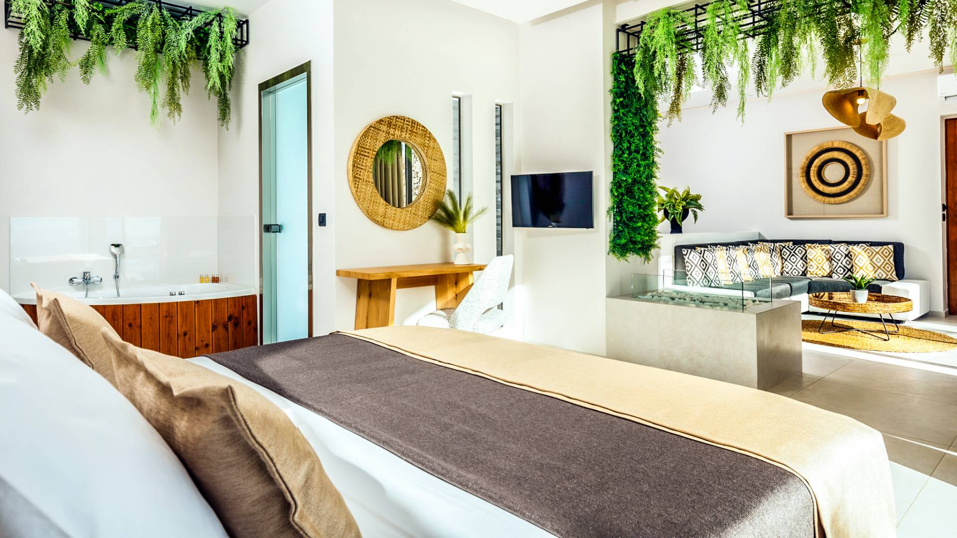 Carved into the hillside, the suite features a spacious open-plan living area that blends comfort with a romantic ambiance. Floor-to-ceiling glass doors open onto a stunning private terrace, where you’ll find your own infinity pool with hydromassage, as well as a unique cave-style plunge pool.