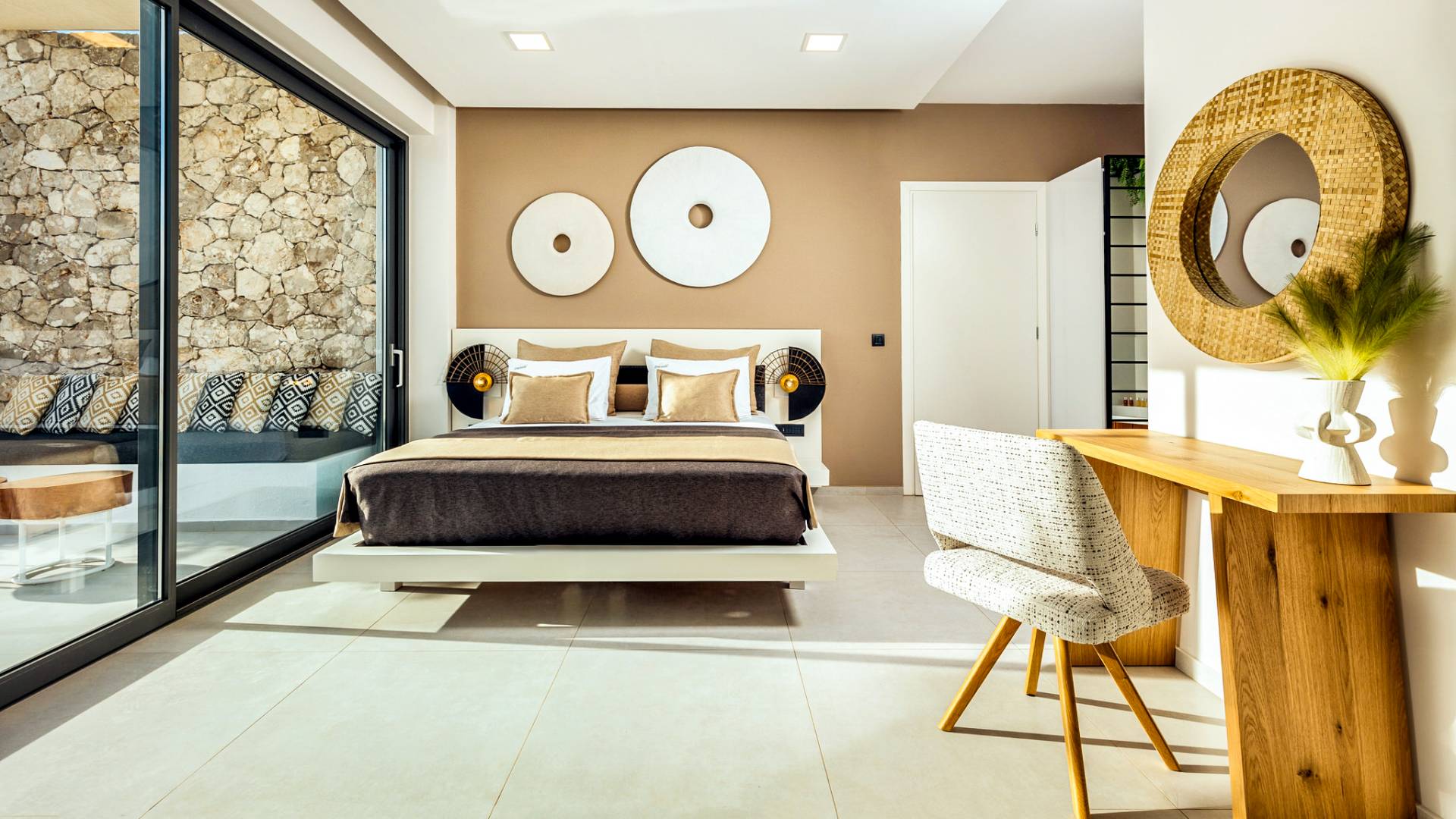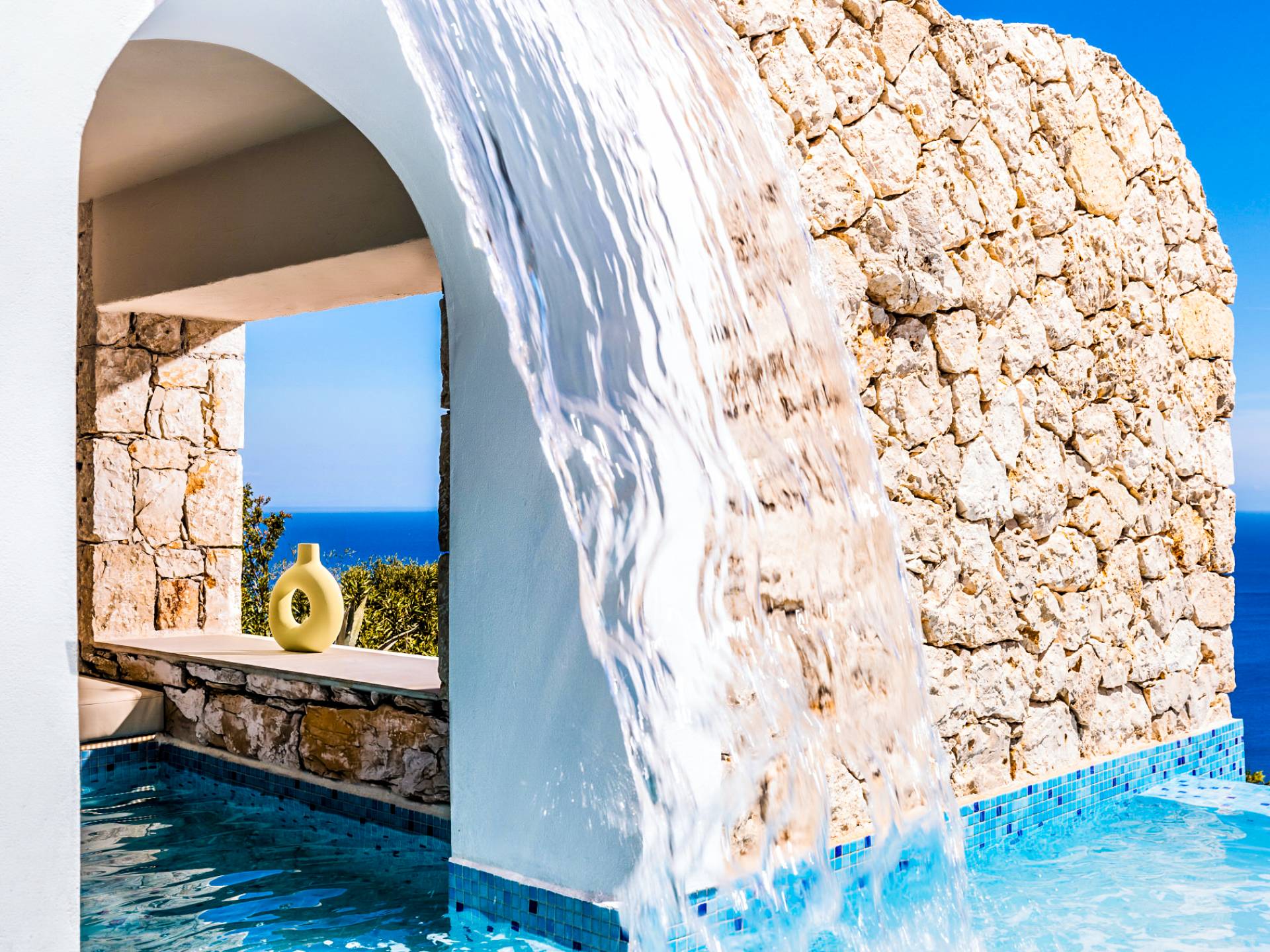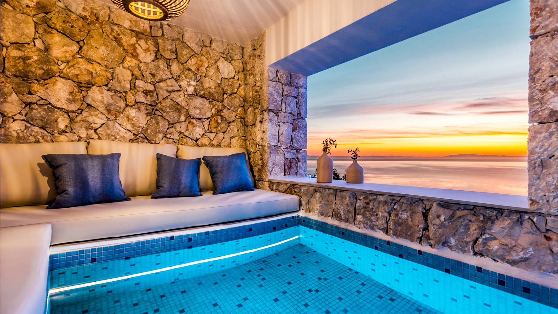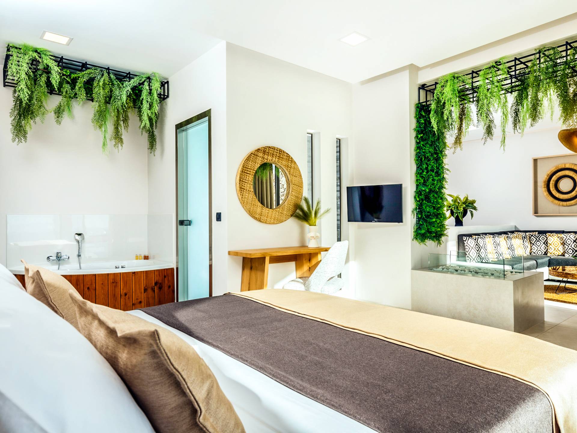 Carved into the hillside, the suite features a spacious open-plan living area that blends comfort with a romantic ambiance. Floor-to-ceiling glass doors open onto a stunning private terrace, where you’ll find your own infinity pool with hydromassage, as well as a unique cave-style plunge pool.