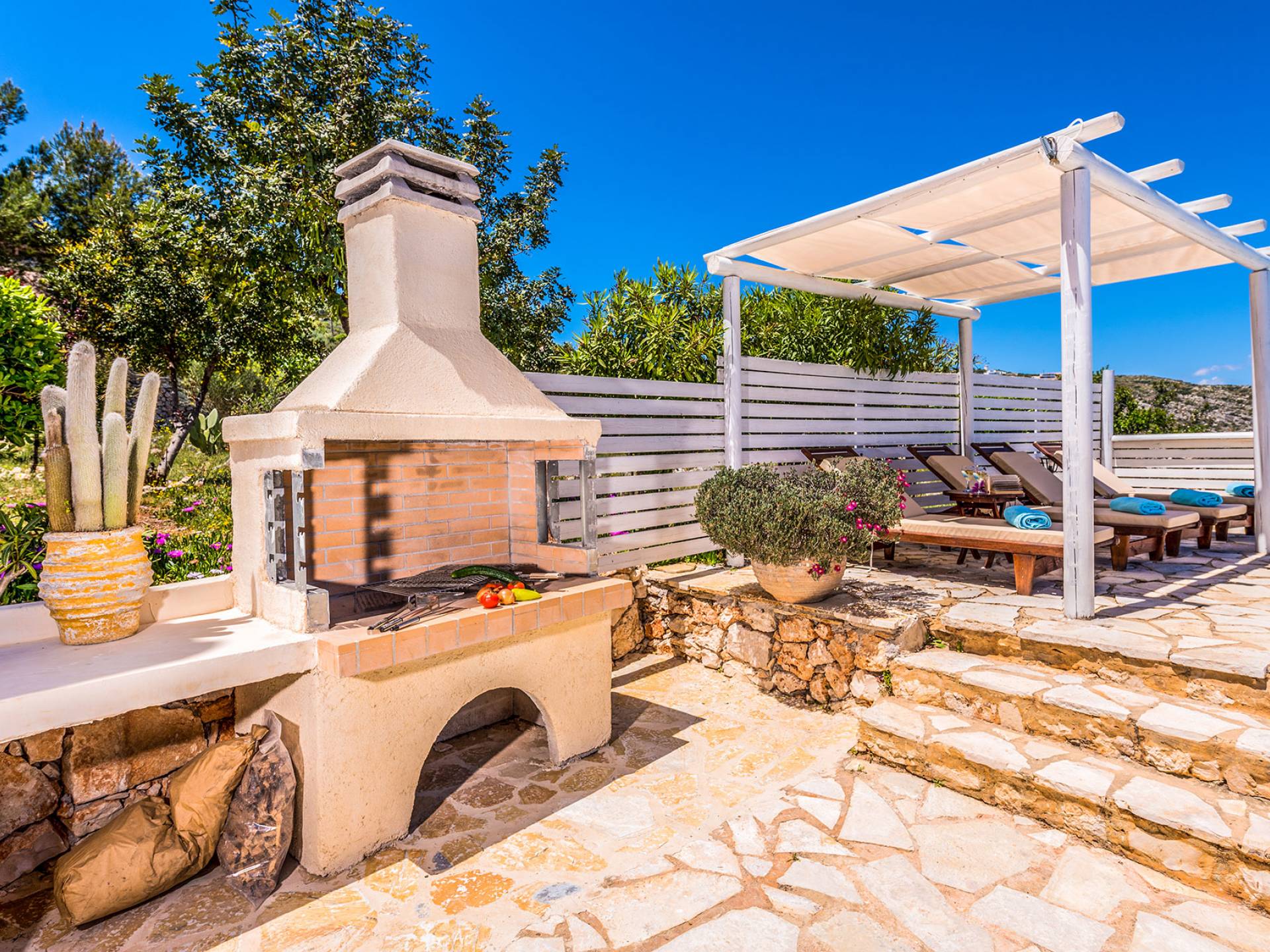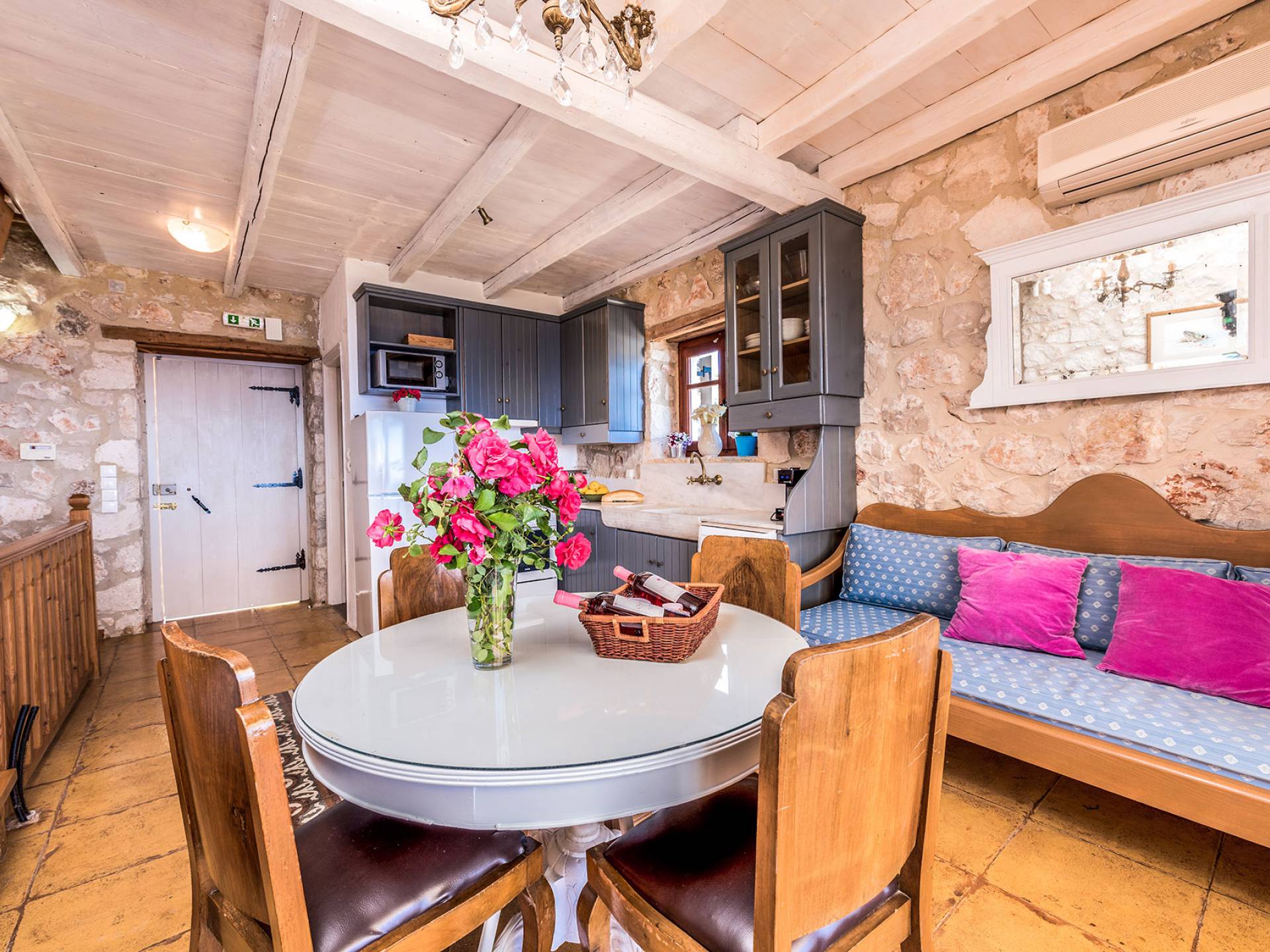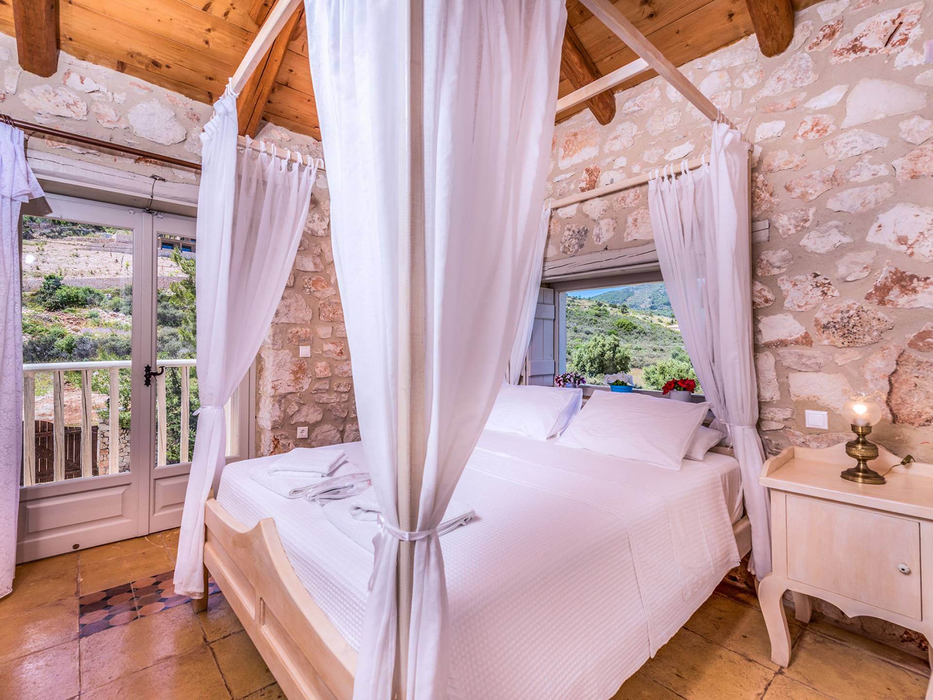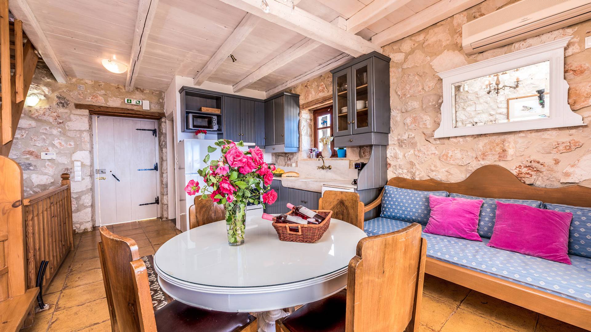 Вход на виллу находится на первом этаже и ведет в просторную гостиную / обеденную зону открытой планировки с полностью оборудованной кухней и ванной комнатой с ванной. Большая веранда с прекрасным видом обставлена деревянным столом и фиксированными диванами. Деревянная лестница ведет на второй этаж, где находится романтическая спальня с двуспальной кроватью с балдахином и собственным балконом.
