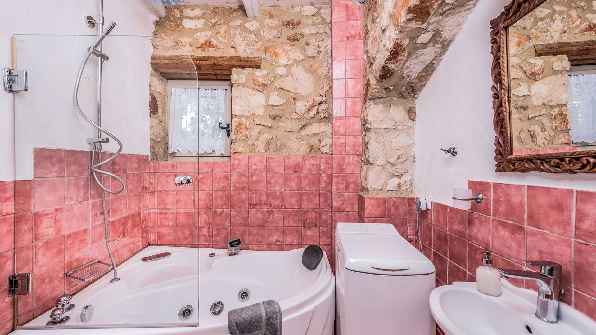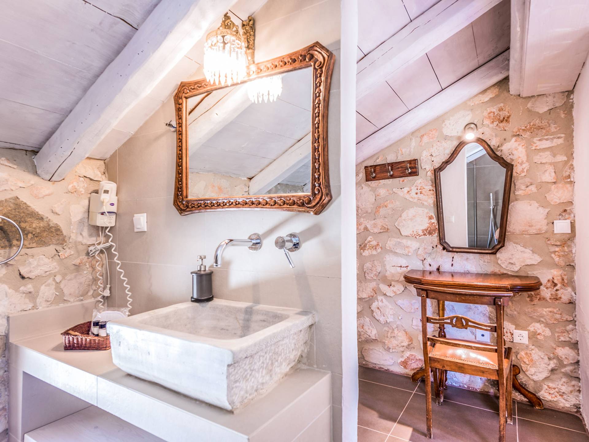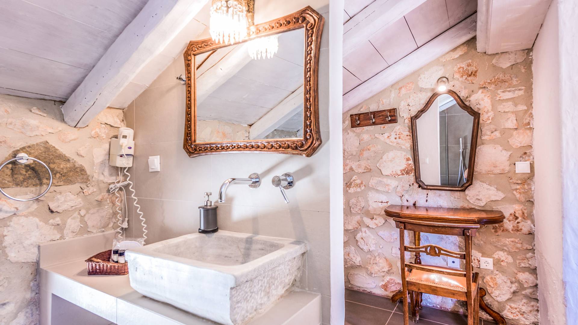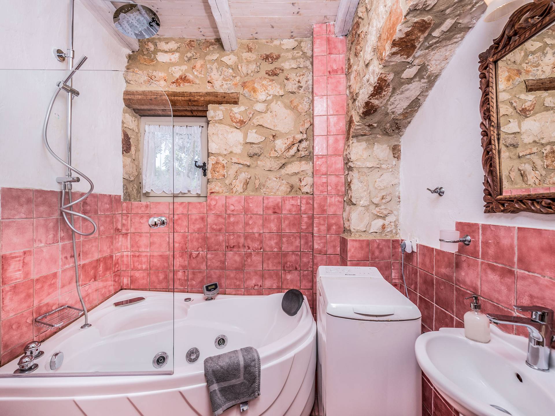 Со второго этажа также ведет деревянная лестница, ведущая на первый этаж, который состоит из двух односпальных кроватей, джакузи с гидромассажем и гостиной с двумя диванами-кроватями. Внешняя площадь составляет около 80 м² и доступна с первого этажа. Он ведет к частному бассейну и зоне для загара с шезлонгами и деревянной беседкой, где можно расслабиться на солнце.