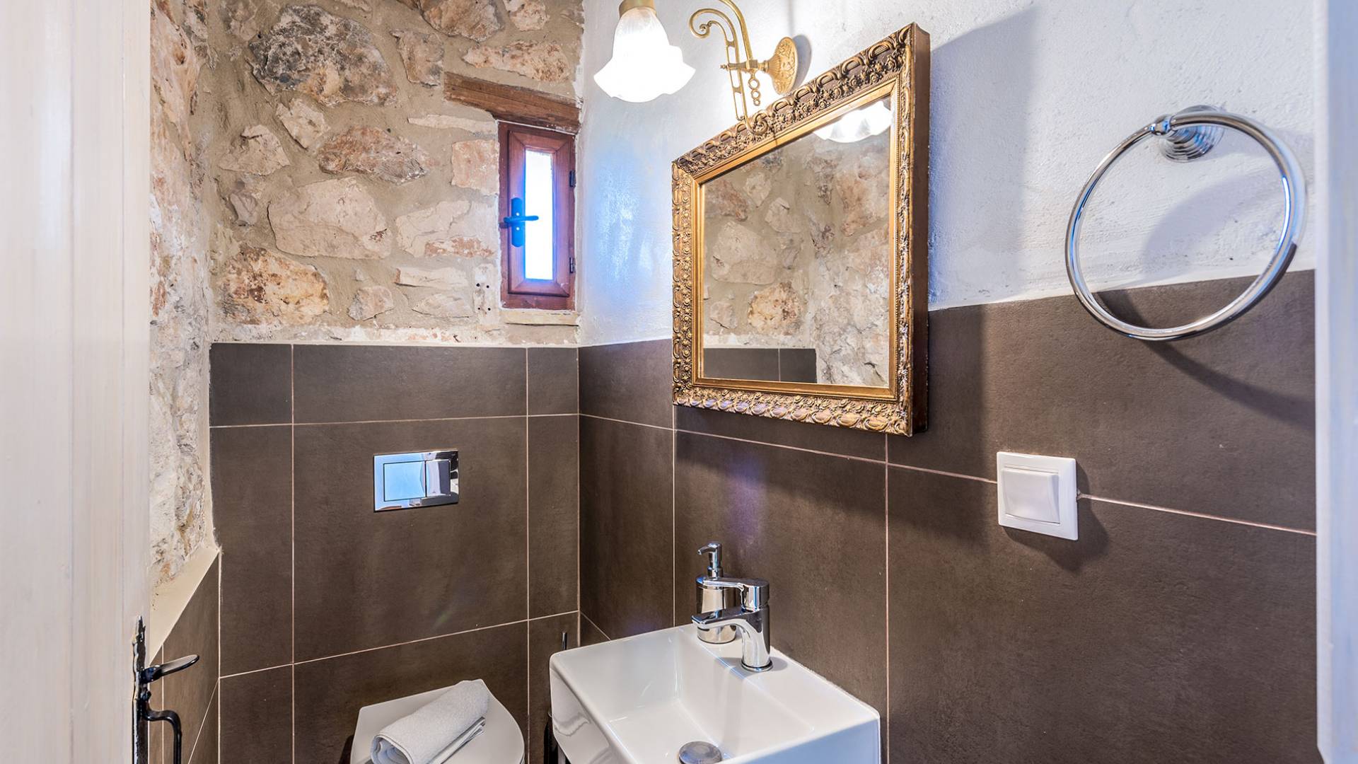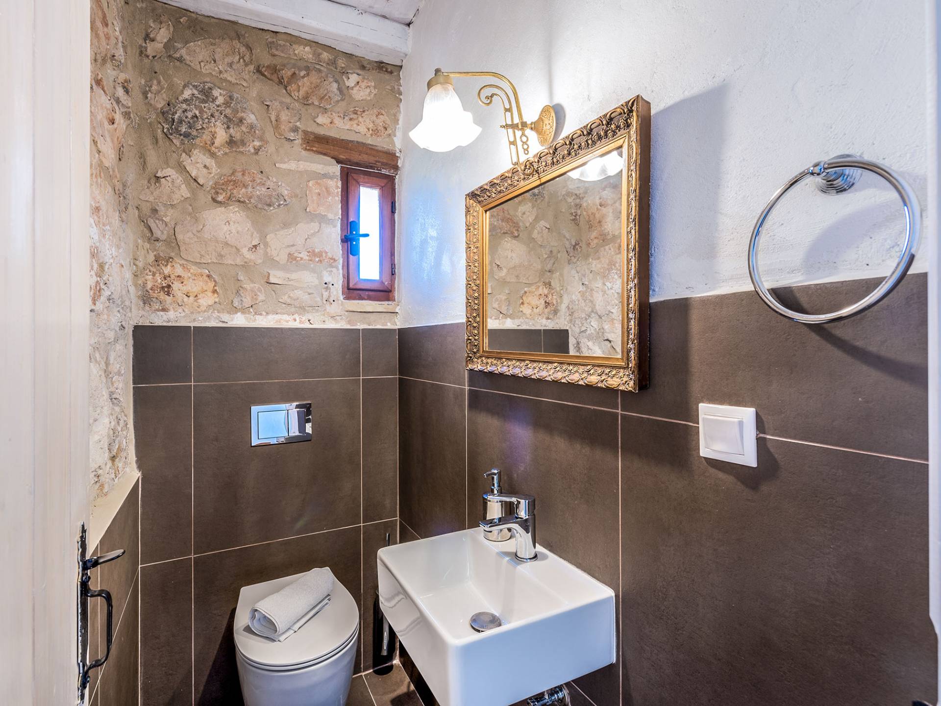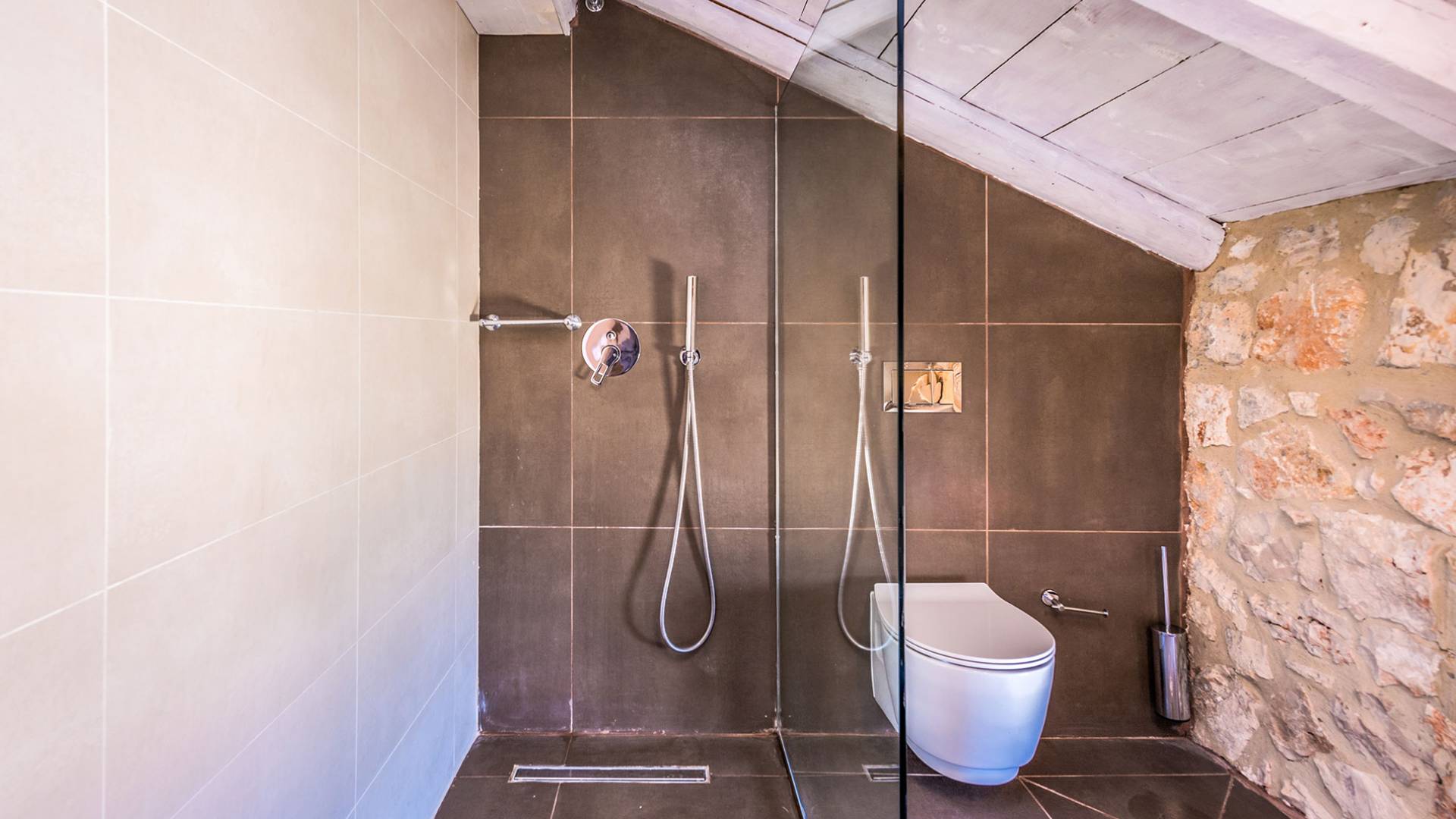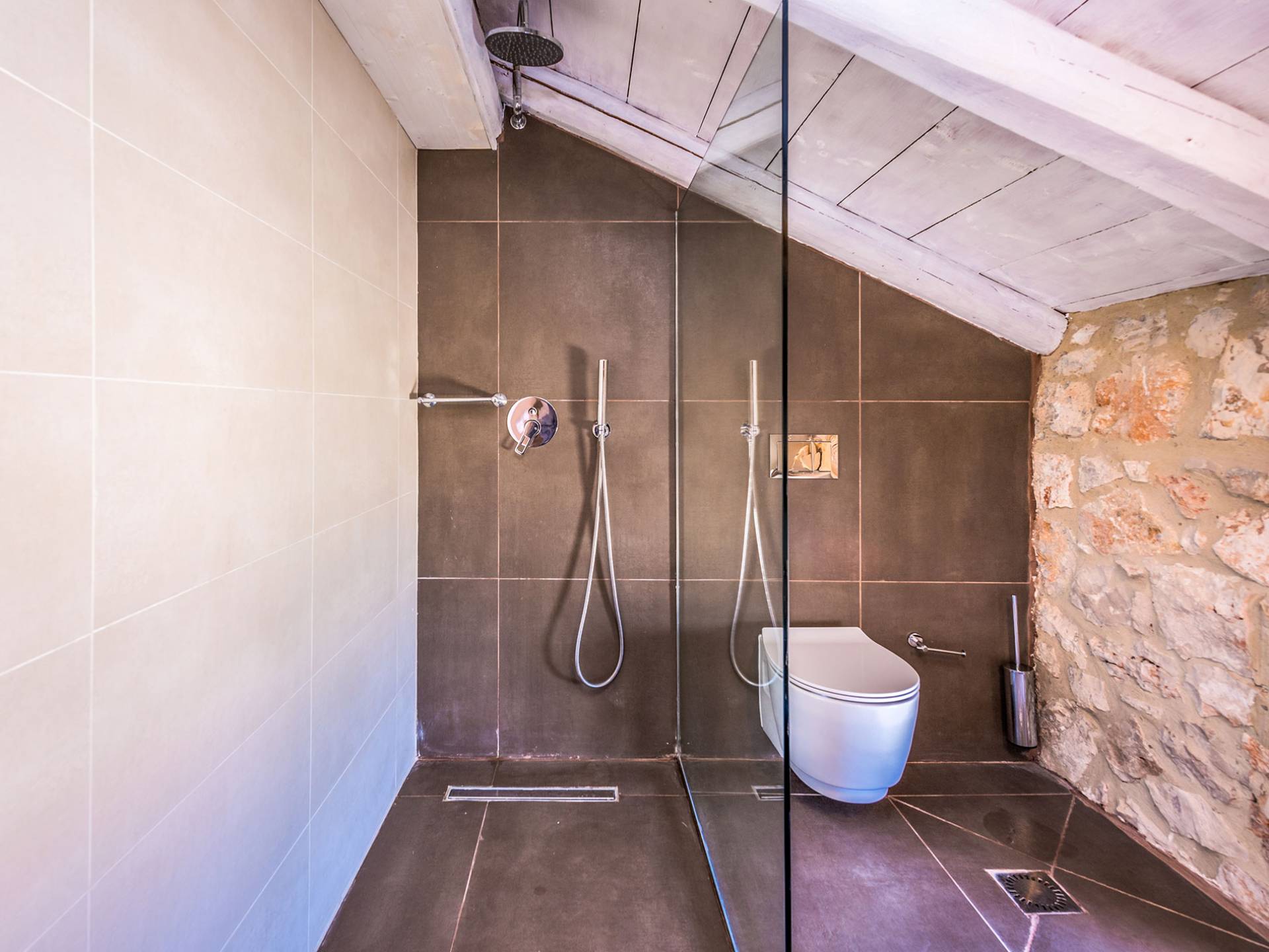 Со второго этажа также ведет деревянная лестница, ведущая на первый этаж, который состоит из двух односпальных кроватей, джакузи с гидромассажем и гостиной с двумя диванами-кроватями. Внешняя площадь составляет около 80 м² и доступна с первого этажа. Он ведет к частному бассейну и зоне для загара с шезлонгами и деревянной беседкой, где можно расслабиться на солнце.