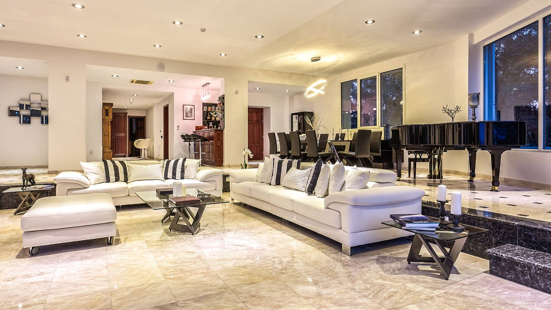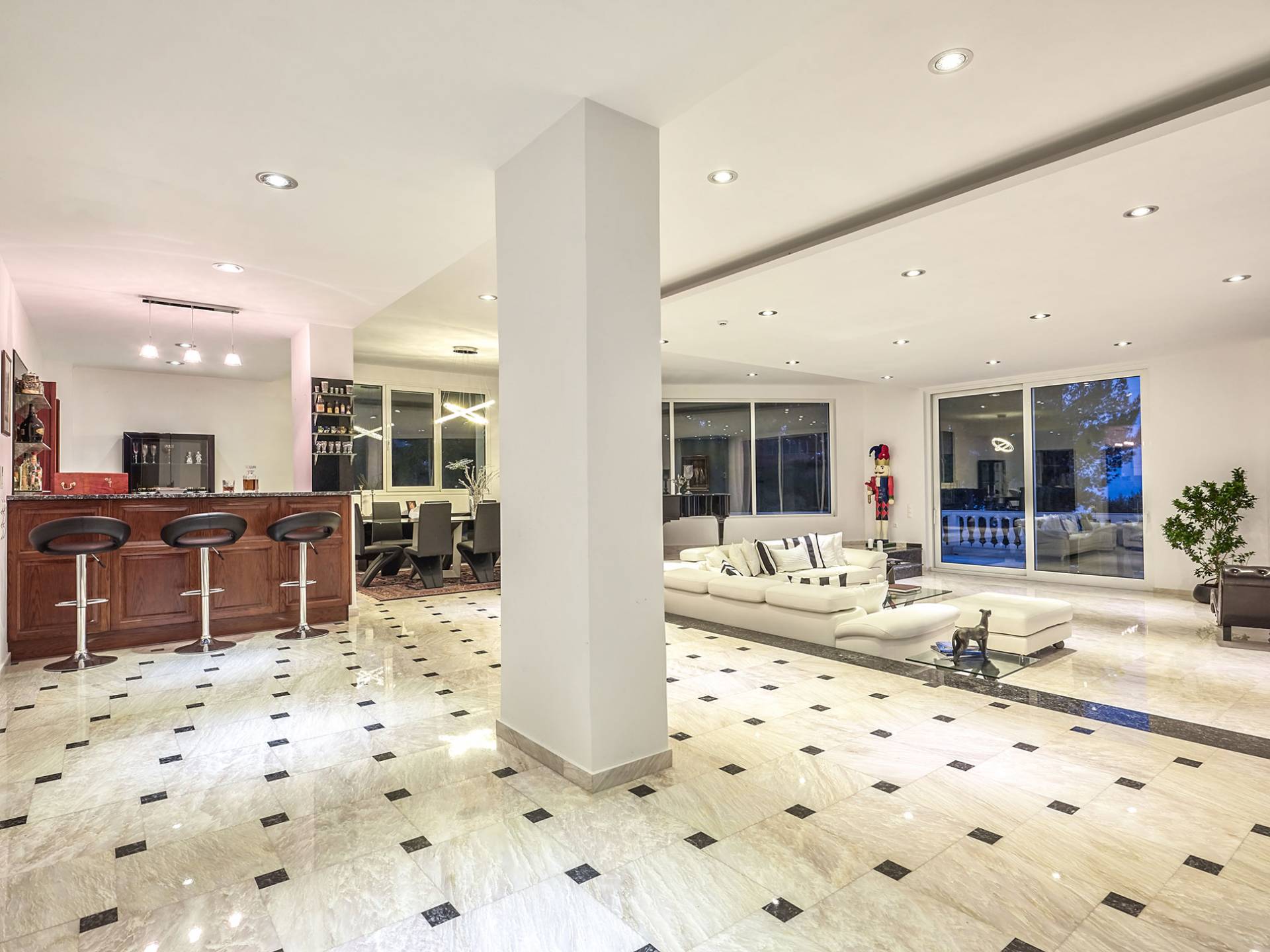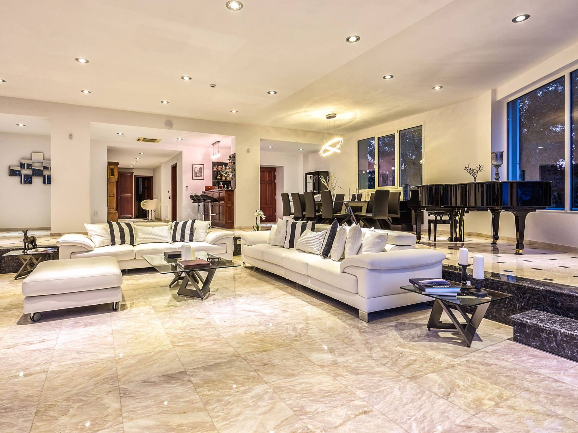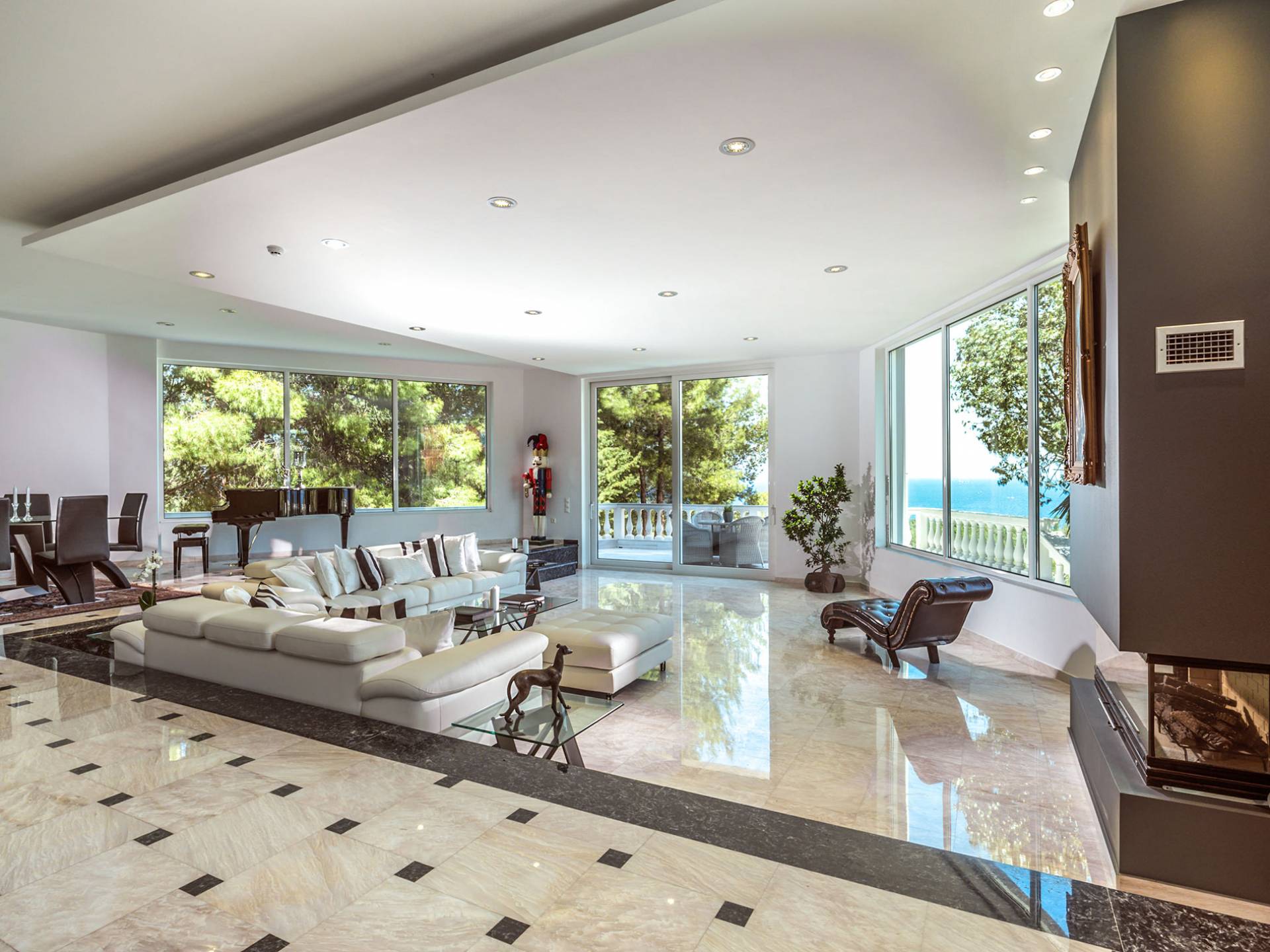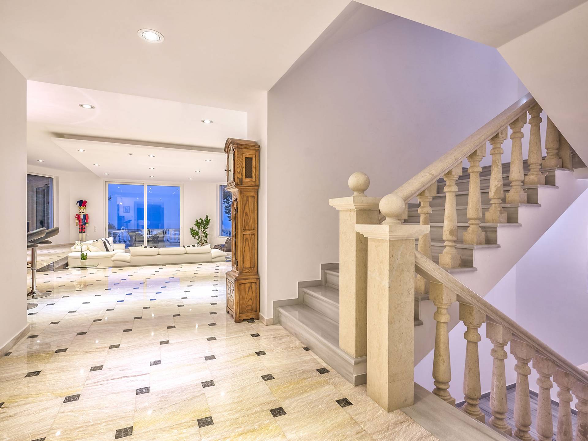 Войдя в Mont Bleu Villa Zakynthos через главную дверь на первом этаже, посетитель сразу поймет величественный характер виллы Mont Bleu, так как здесь есть большая гостиная с расслабляющим видом на окрестности, в комплекте с обеденный стол, камин, рояль и бар с напитками и всем необходимым оборудованием. Пройдя мимо бара, вы увидите кухню слева, полностью оборудованную и обставленную прекрасным сочетанием мрамора и дерева. Также есть небольшой обеденный стол и выходная дверь. На этом же этаже находится кабинет и туалет.