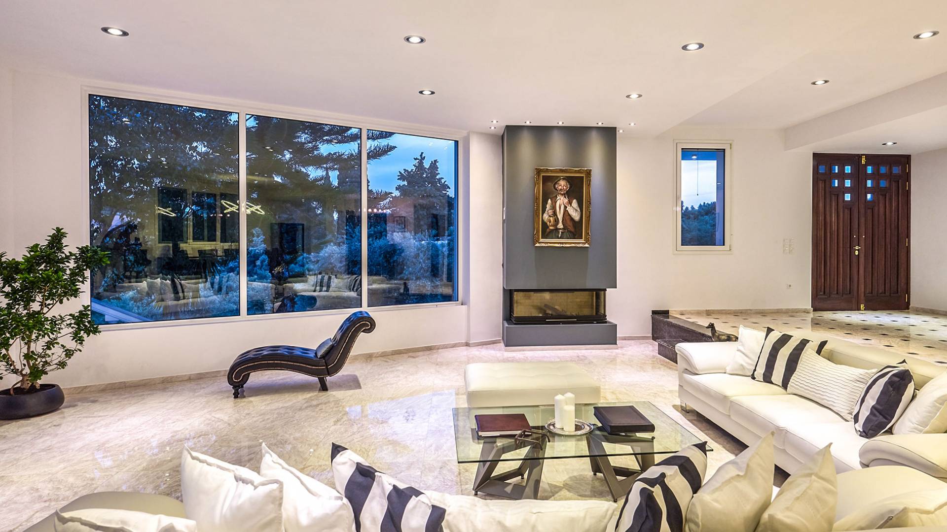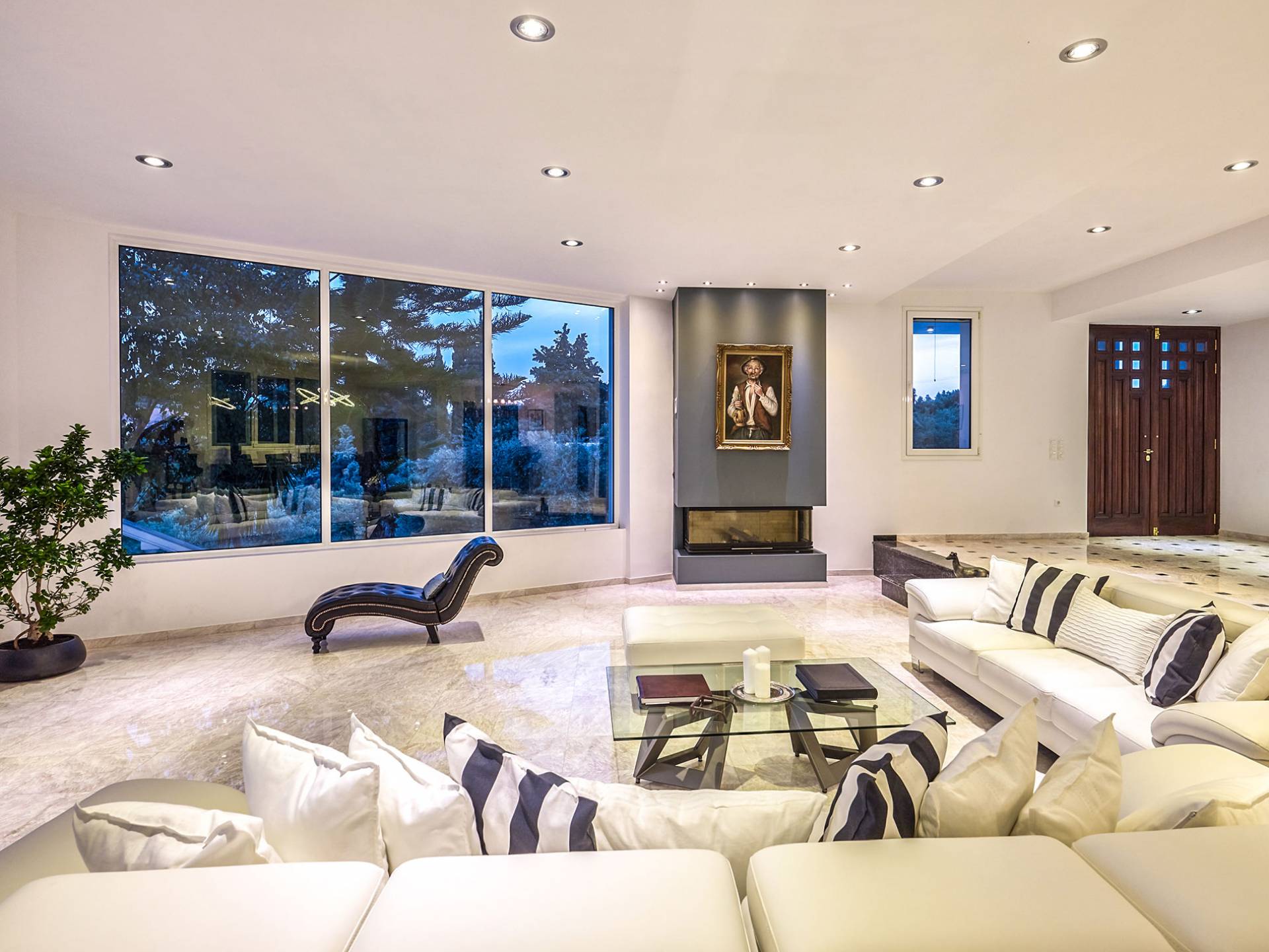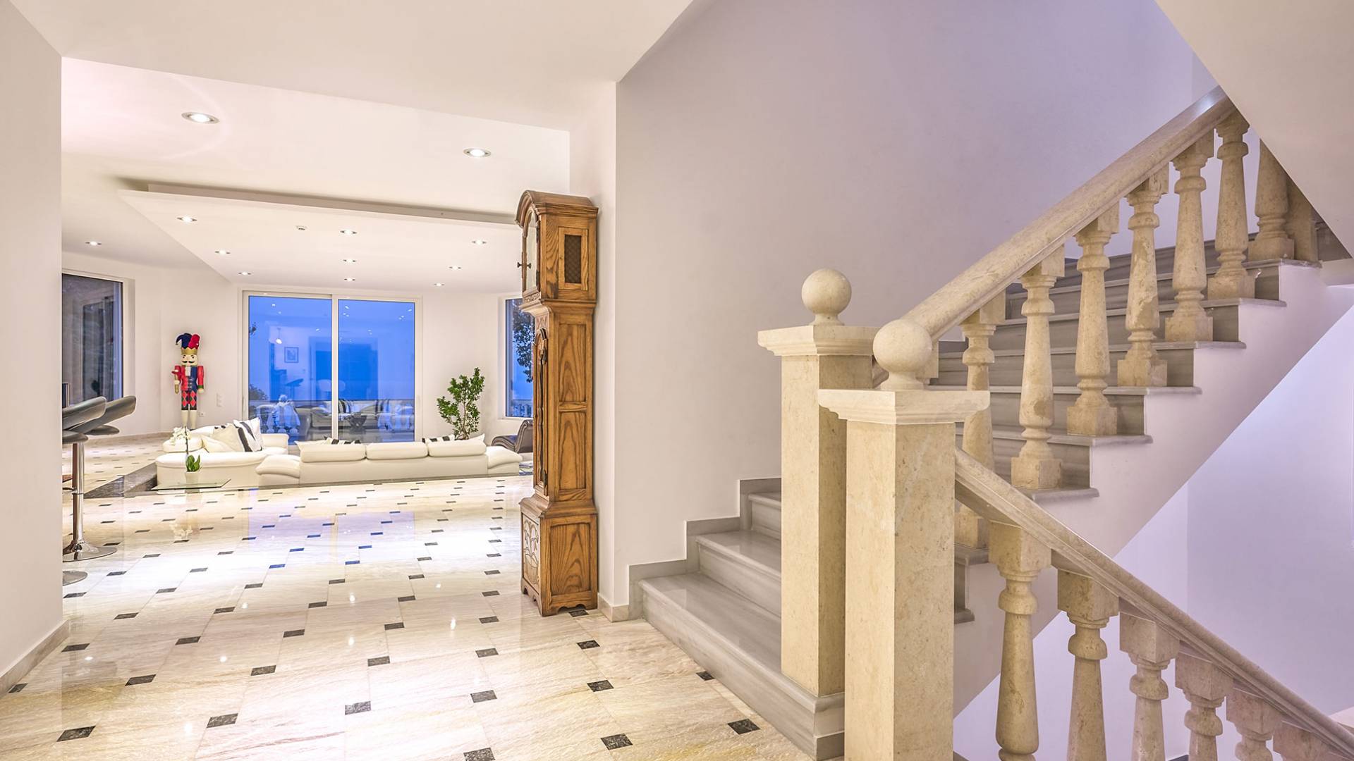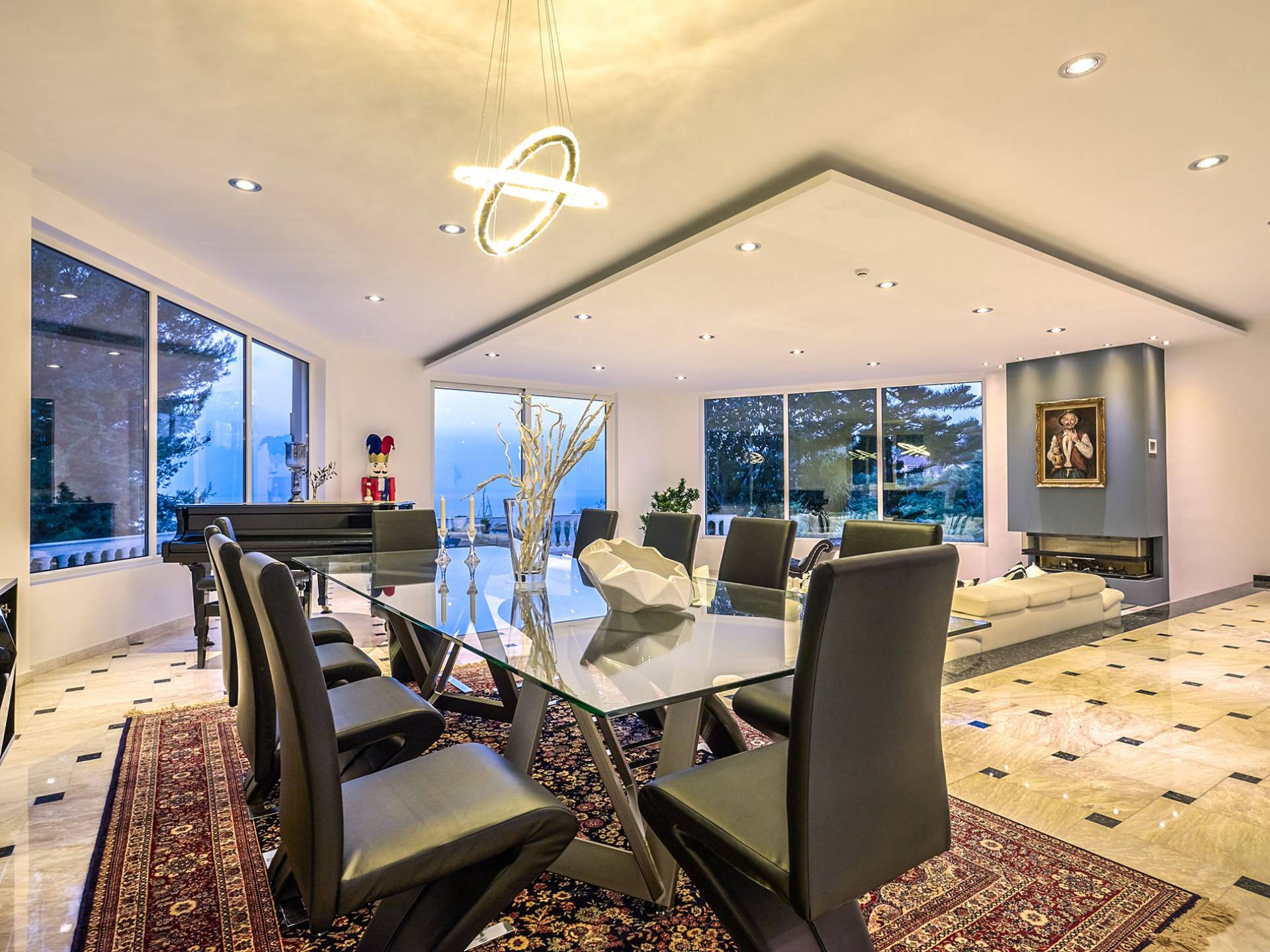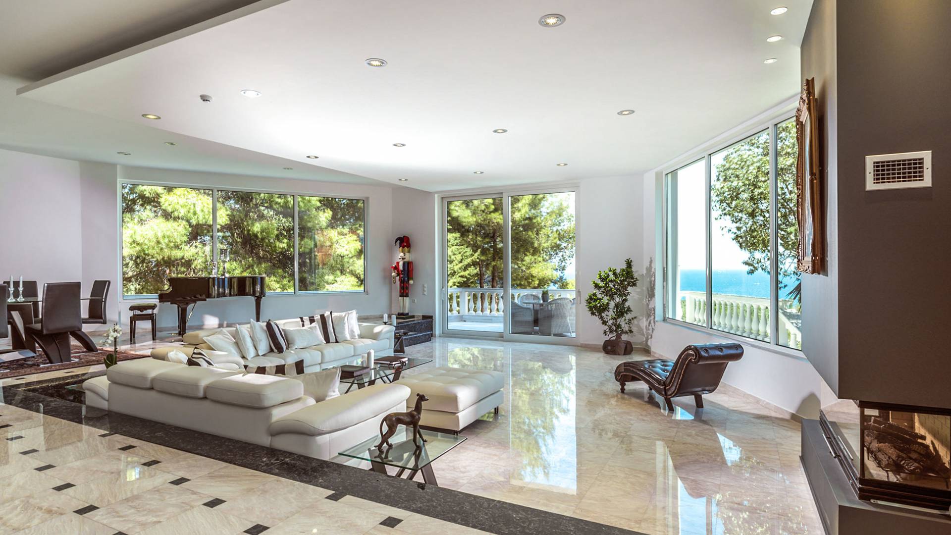 Войдя в Mont Bleu Villa Zakynthos через главную дверь на первом этаже, посетитель сразу поймет величественный характер виллы Mont Bleu, так как здесь есть большая гостиная с расслабляющим видом на окрестности, в комплекте с обеденный стол, камин, рояль и бар с напитками и всем необходимым оборудованием. Пройдя мимо бара, вы увидите кухню слева, полностью оборудованную и обставленную прекрасным сочетанием мрамора и дерева. Также есть небольшой обеденный стол и выходная дверь. На этом же этаже находится кабинет и туалет.