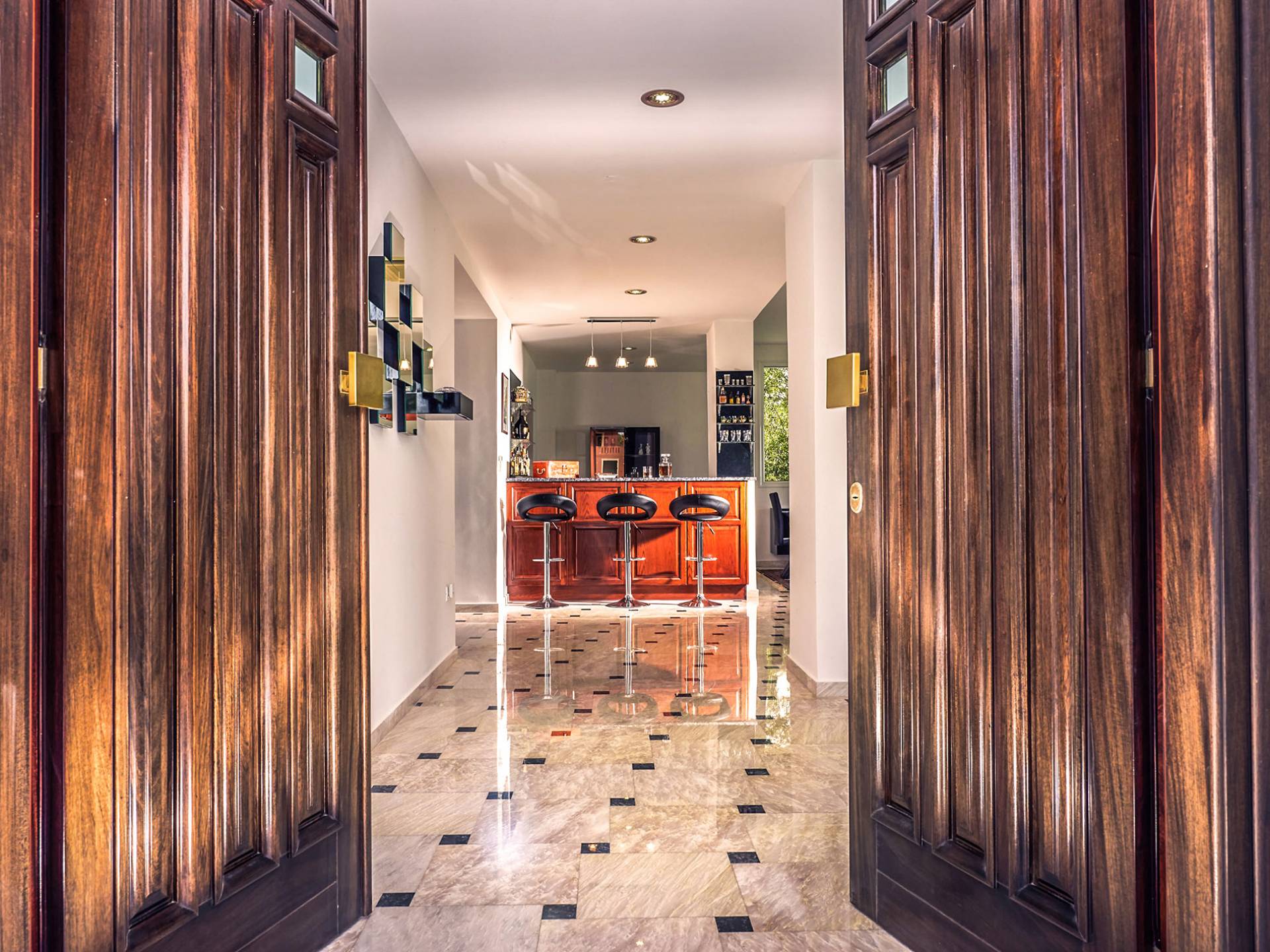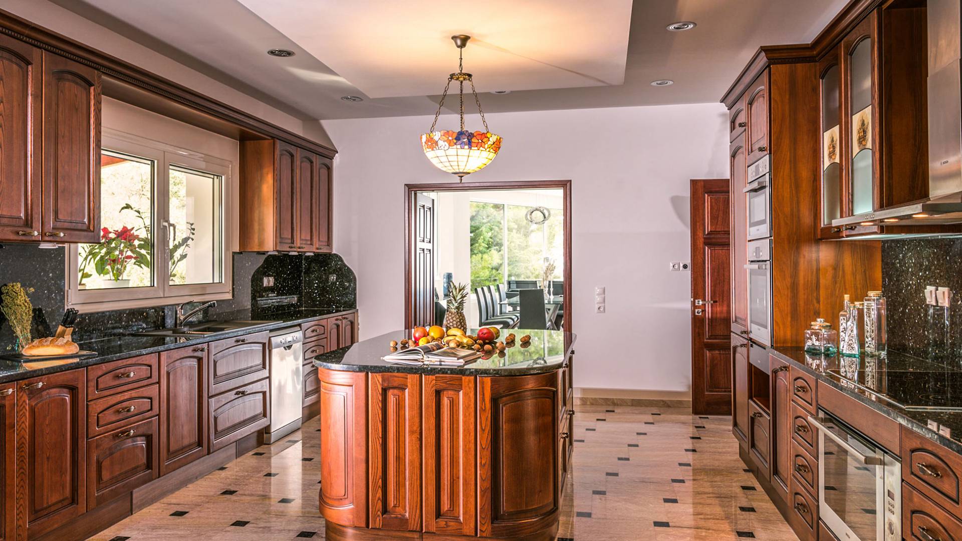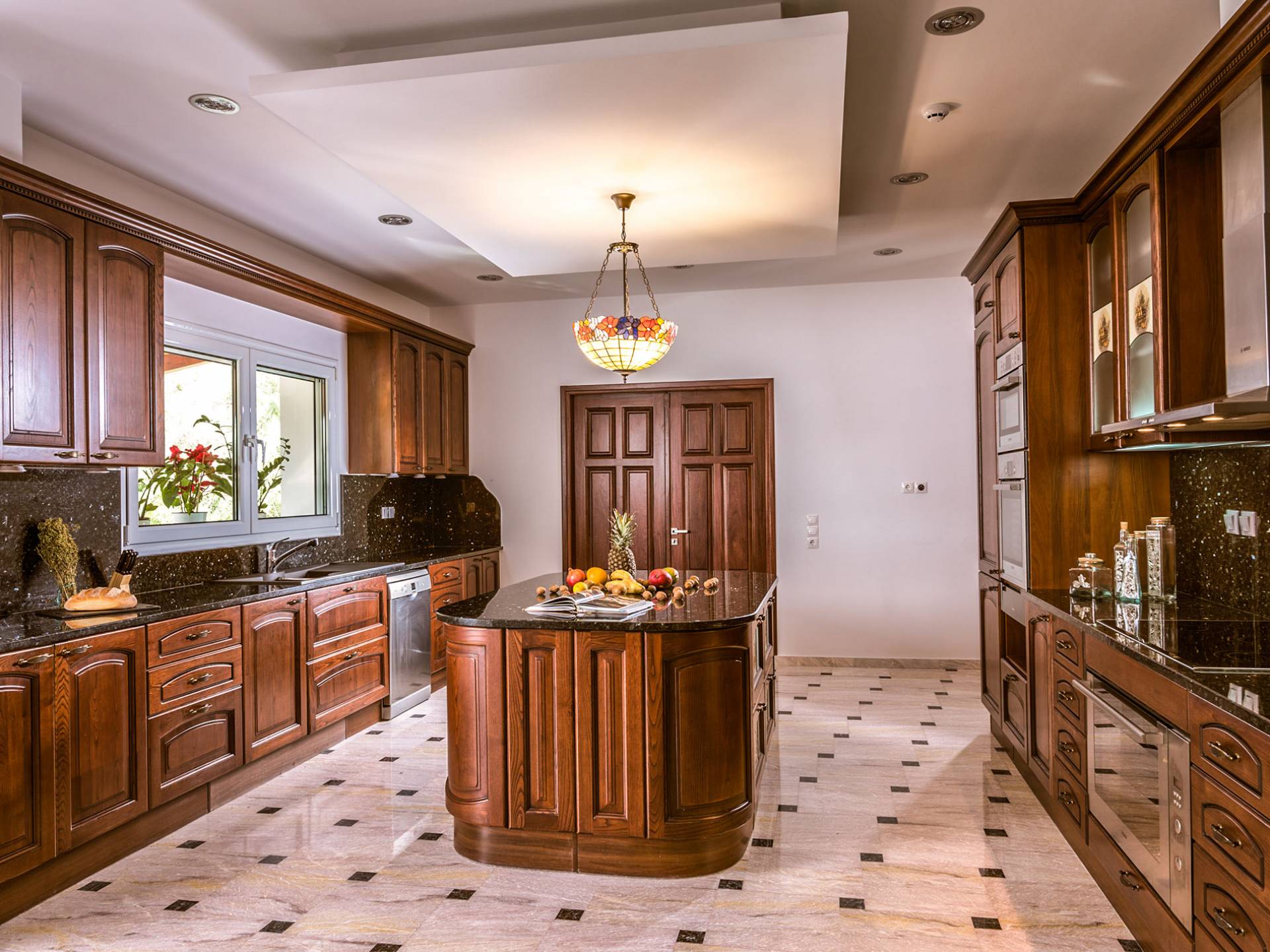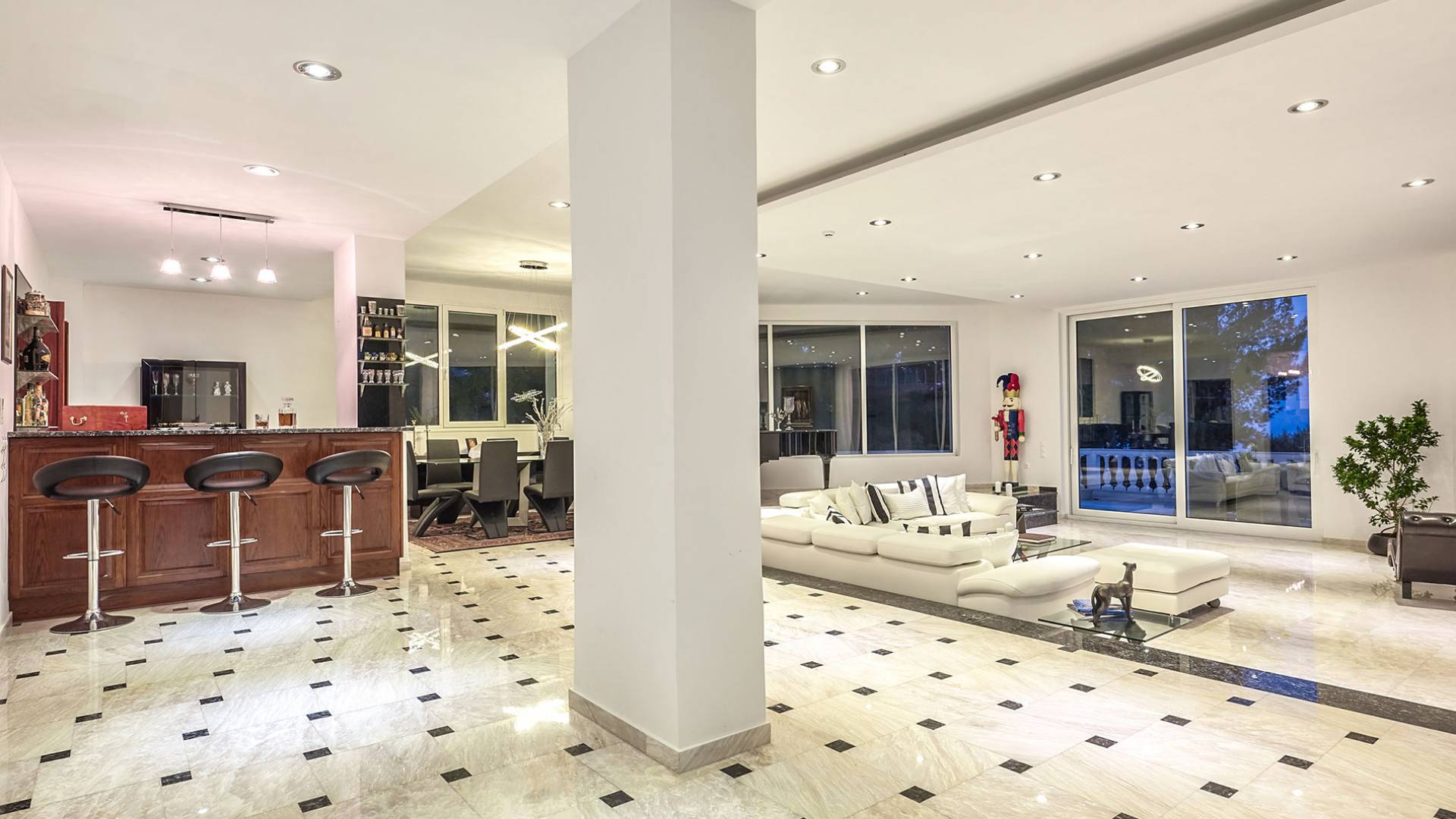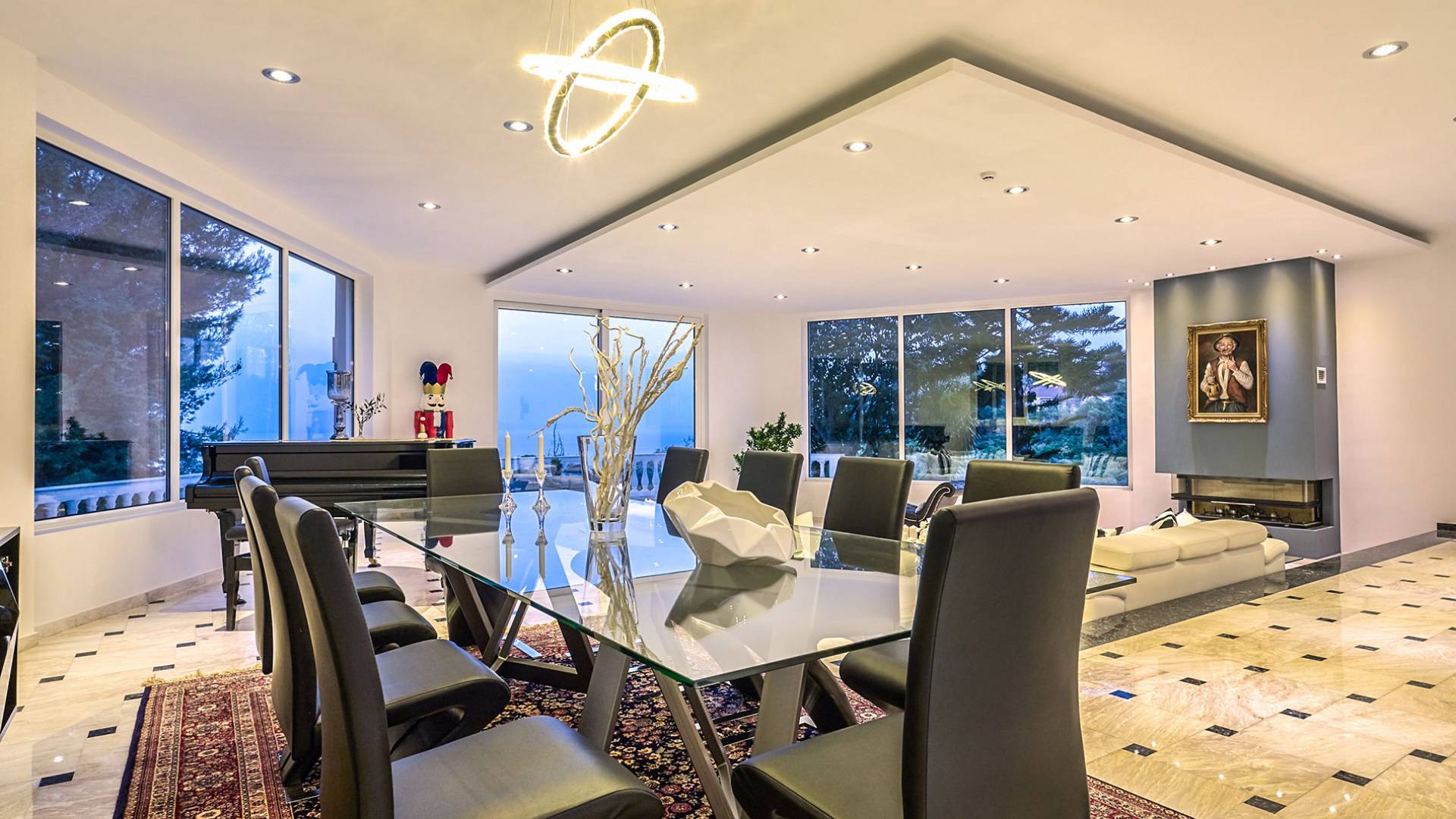 Войдя в Mont Bleu Villa Zakynthos через главную дверь на первом этаже, посетитель сразу поймет величественный характер виллы Mont Bleu, так как здесь есть большая гостиная с расслабляющим видом на окрестности, в комплекте с обеденный стол, камин, рояль и бар с напитками и всем необходимым оборудованием. Пройдя мимо бара, вы увидите кухню слева, полностью оборудованную и обставленную прекрасным сочетанием мрамора и дерева. Также есть небольшой обеденный стол и выходная дверь. На этом же этаже находится кабинет и туалет.