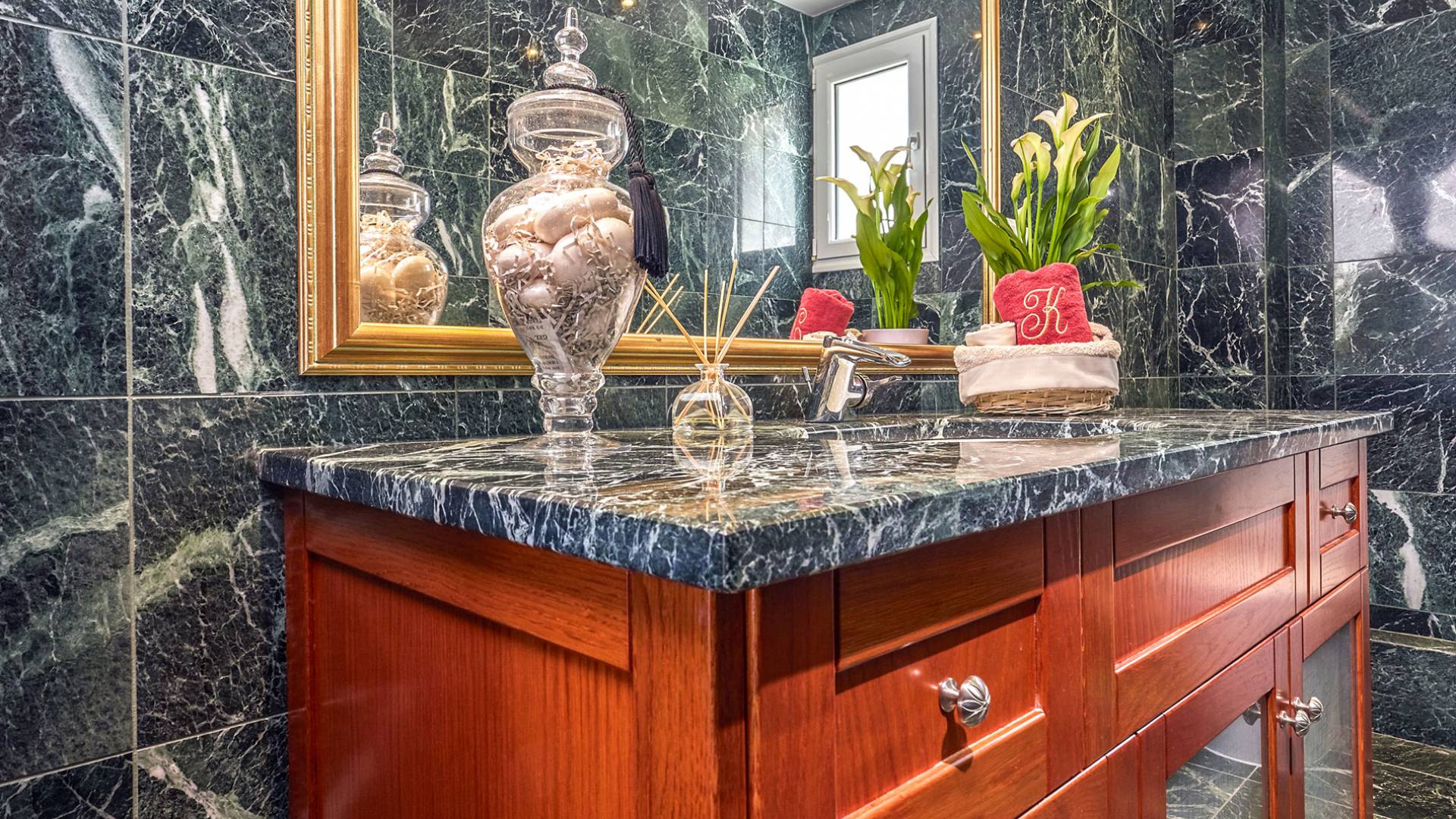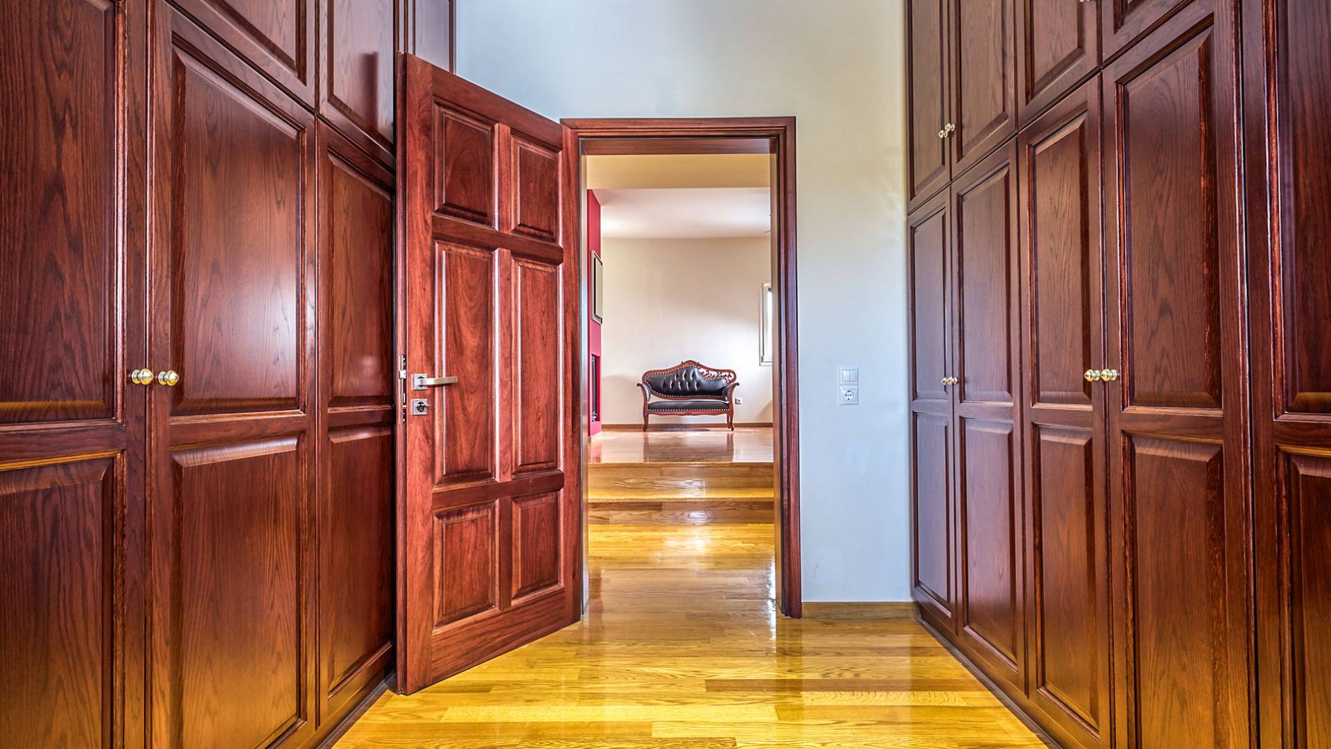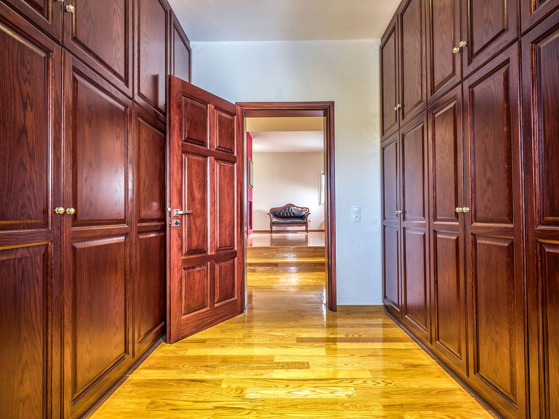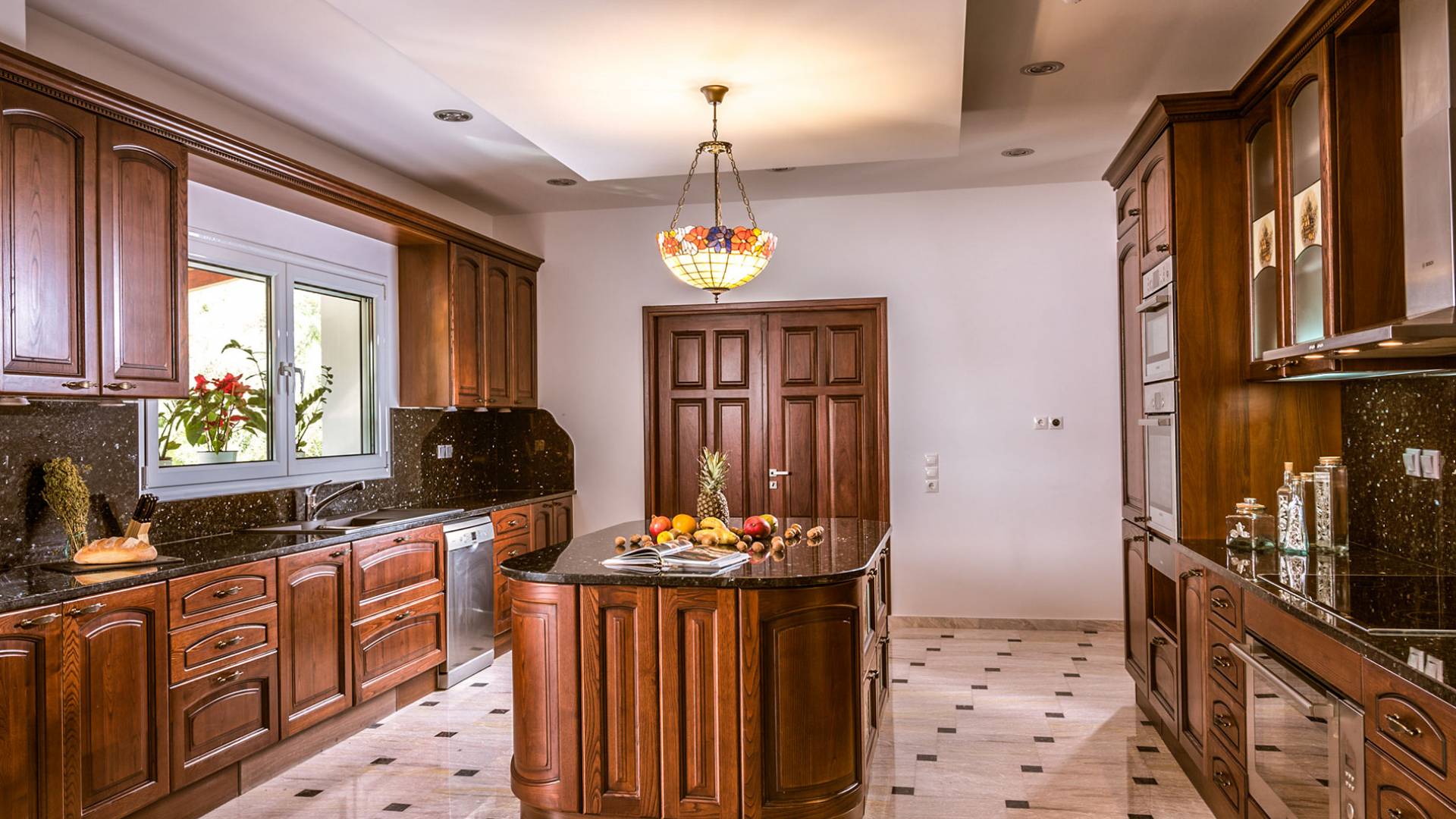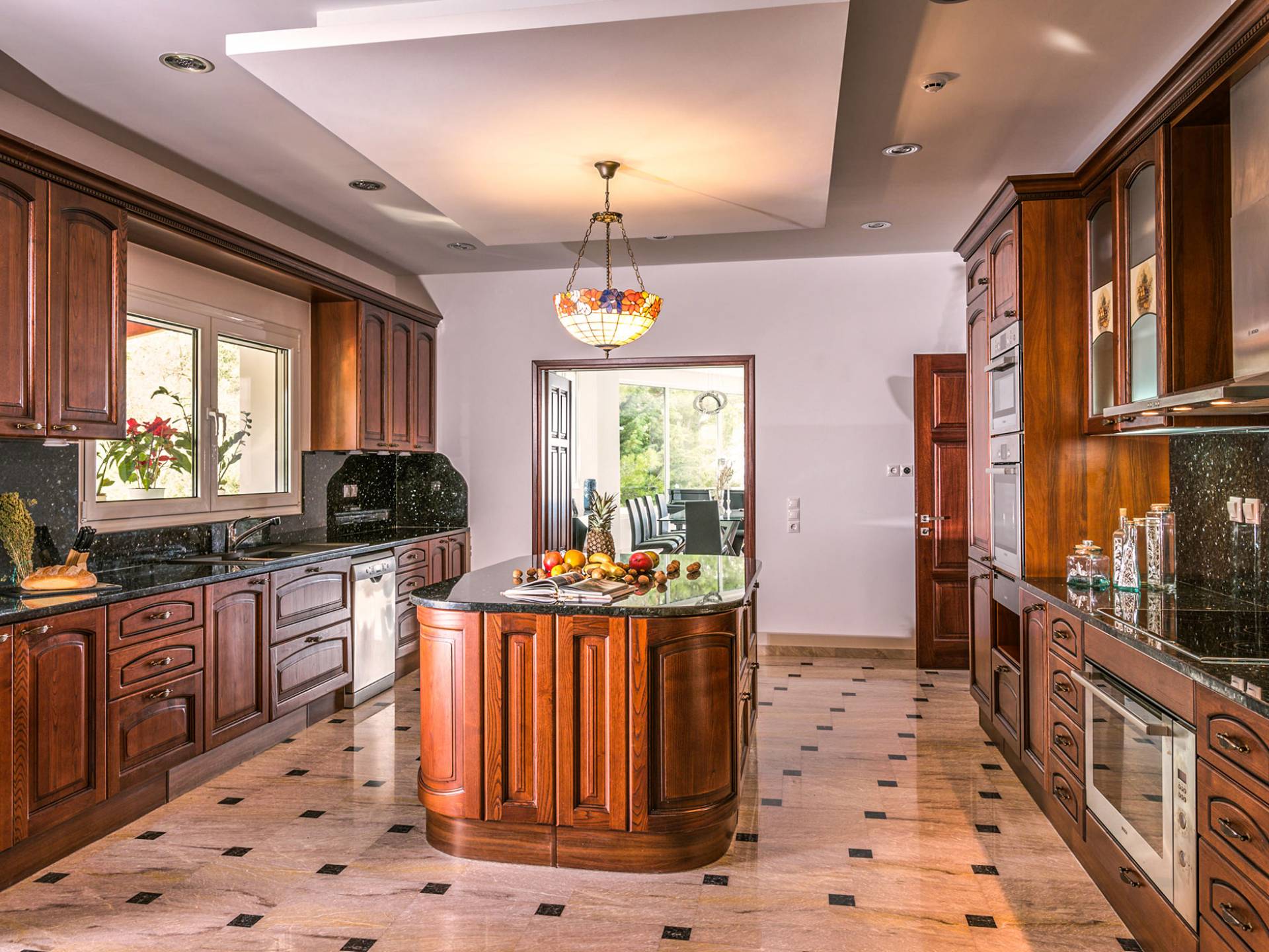 Войдя в Mont Bleu Villa Zakynthos через главную дверь на первом этаже, посетитель сразу поймет величественный характер виллы Mont Bleu, так как здесь есть большая гостиная с расслабляющим видом на окрестности, в комплекте с обеденный стол, камин, рояль и бар с напитками и всем необходимым оборудованием. Пройдя мимо бара, вы увидите кухню слева, полностью оборудованную и обставленную прекрасным сочетанием мрамора и дерева. Также есть небольшой обеденный стол и выходная дверь. На этом же этаже находится кабинет и туалет.