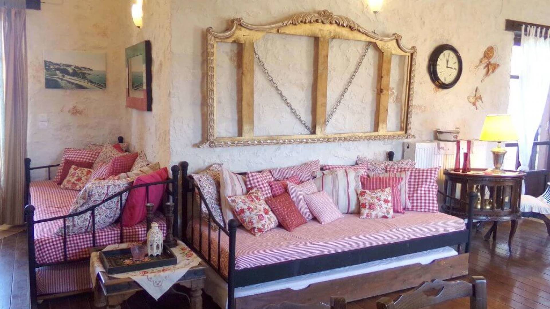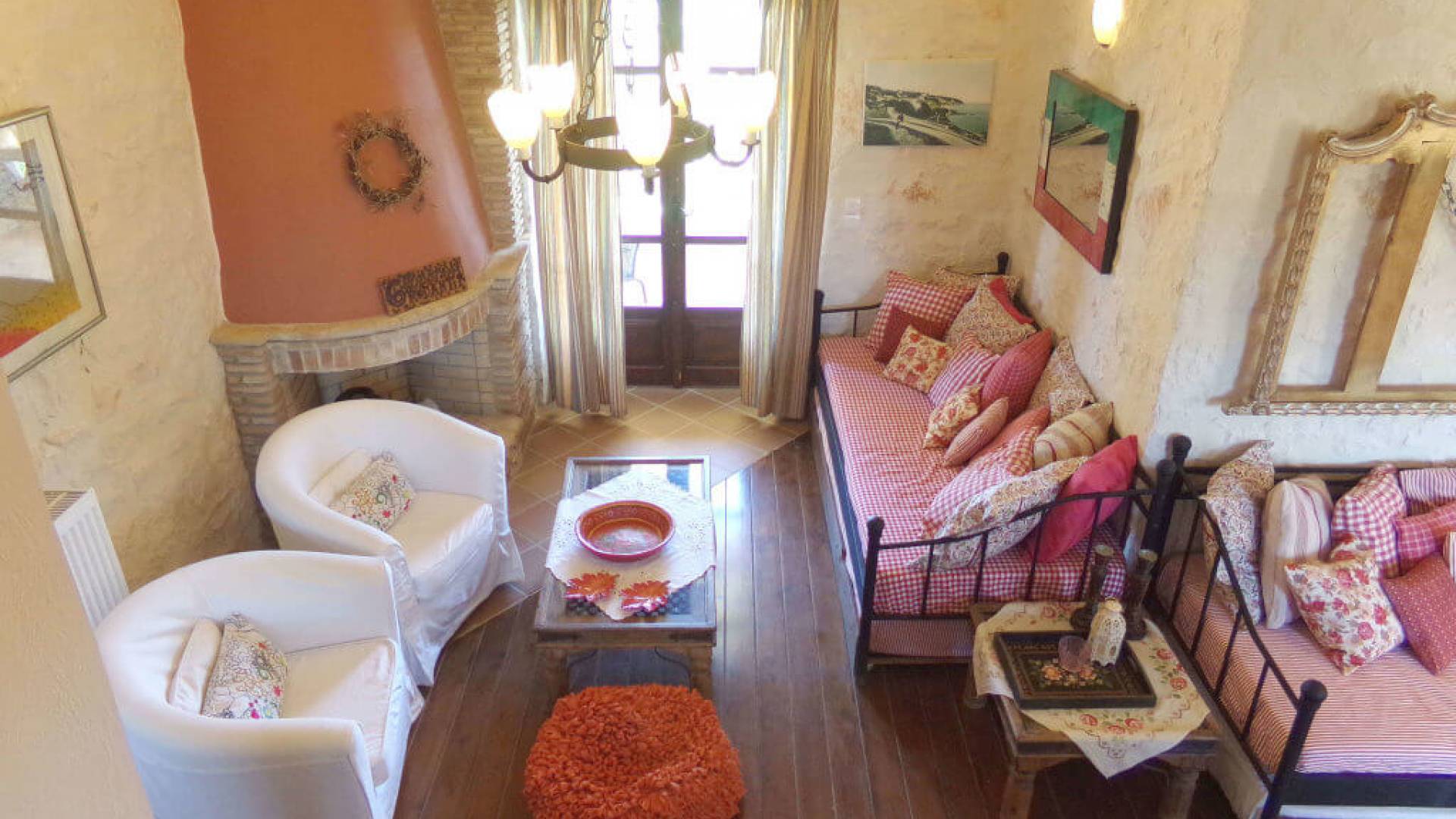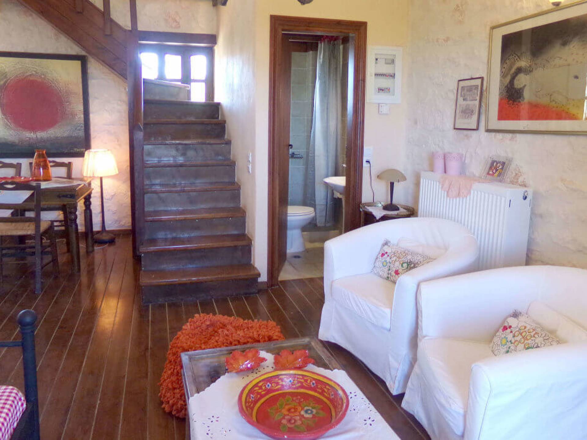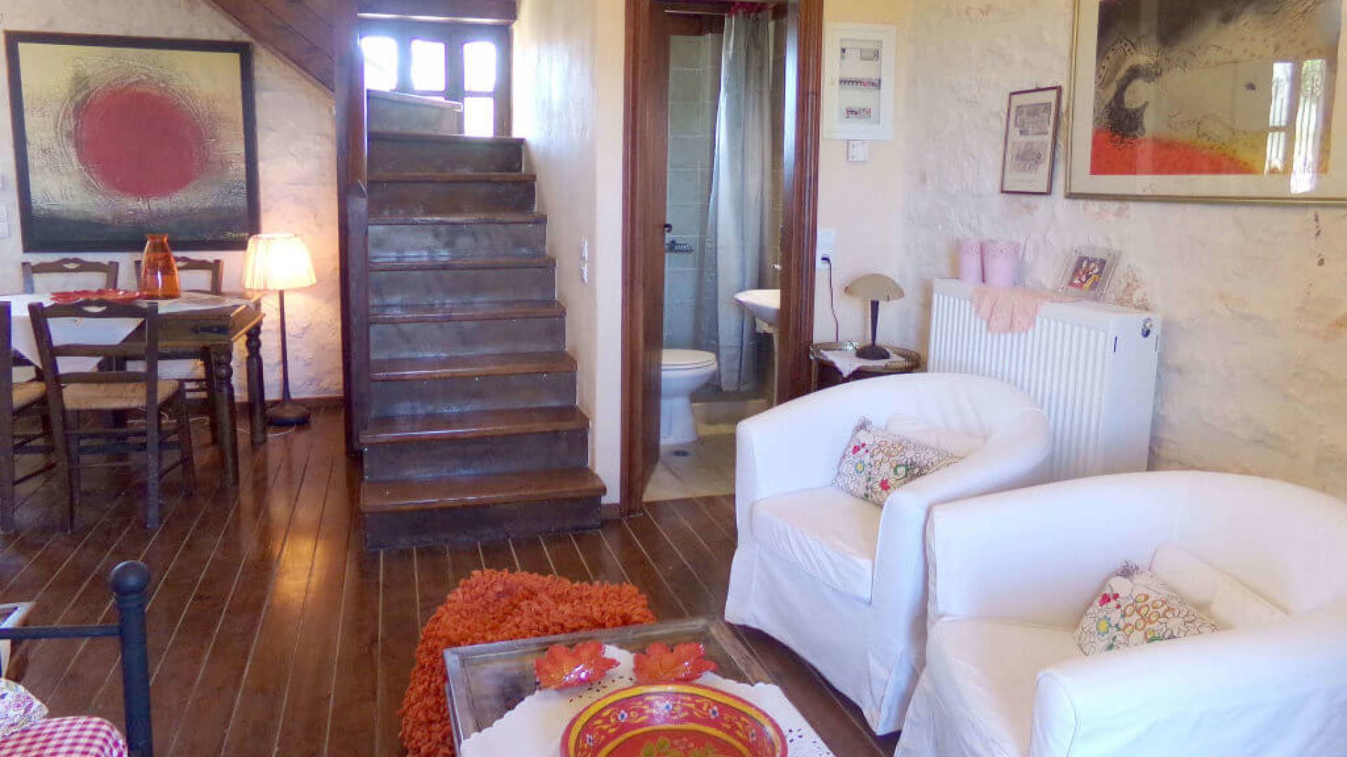 Во всех апартаментах есть гостиная зона на первом уровне (где могут разместиться еще 2 гостя), красиво оформленная антикварной мебелью, освещением, зеркалами, традиционной вышивкой и множеством подушек, создающих ауру закинтийского гостеприимства. Рядом находится полностью оборудованная кухня с холодильником, плитой, духовкой, посудомоечной и стиральной машинами, посудой и всей необходимой посудой. Здесь также есть очаровательная романтическая спальня с двуспальной кроватью, камином и ванной с душем и туалетом.
