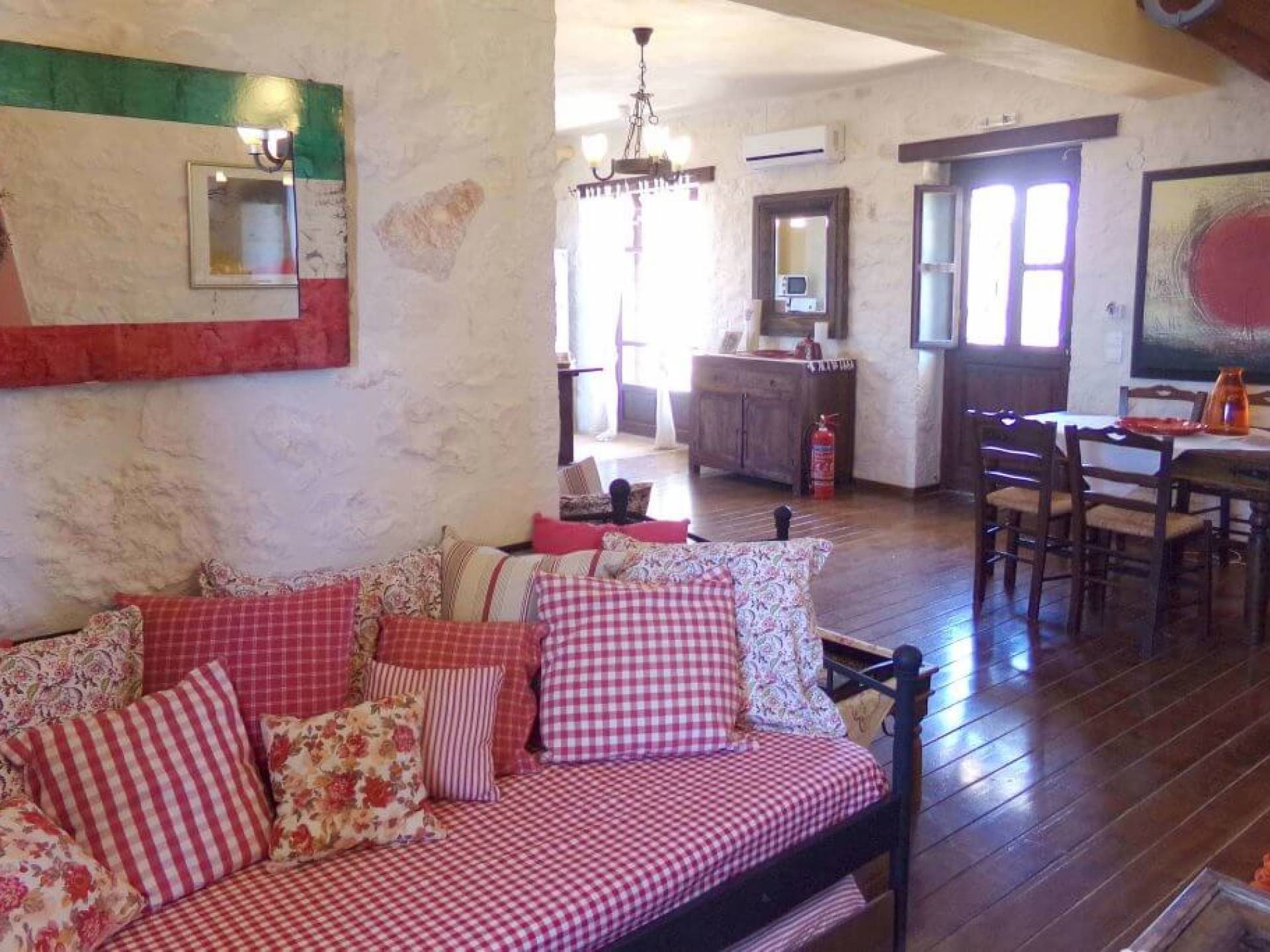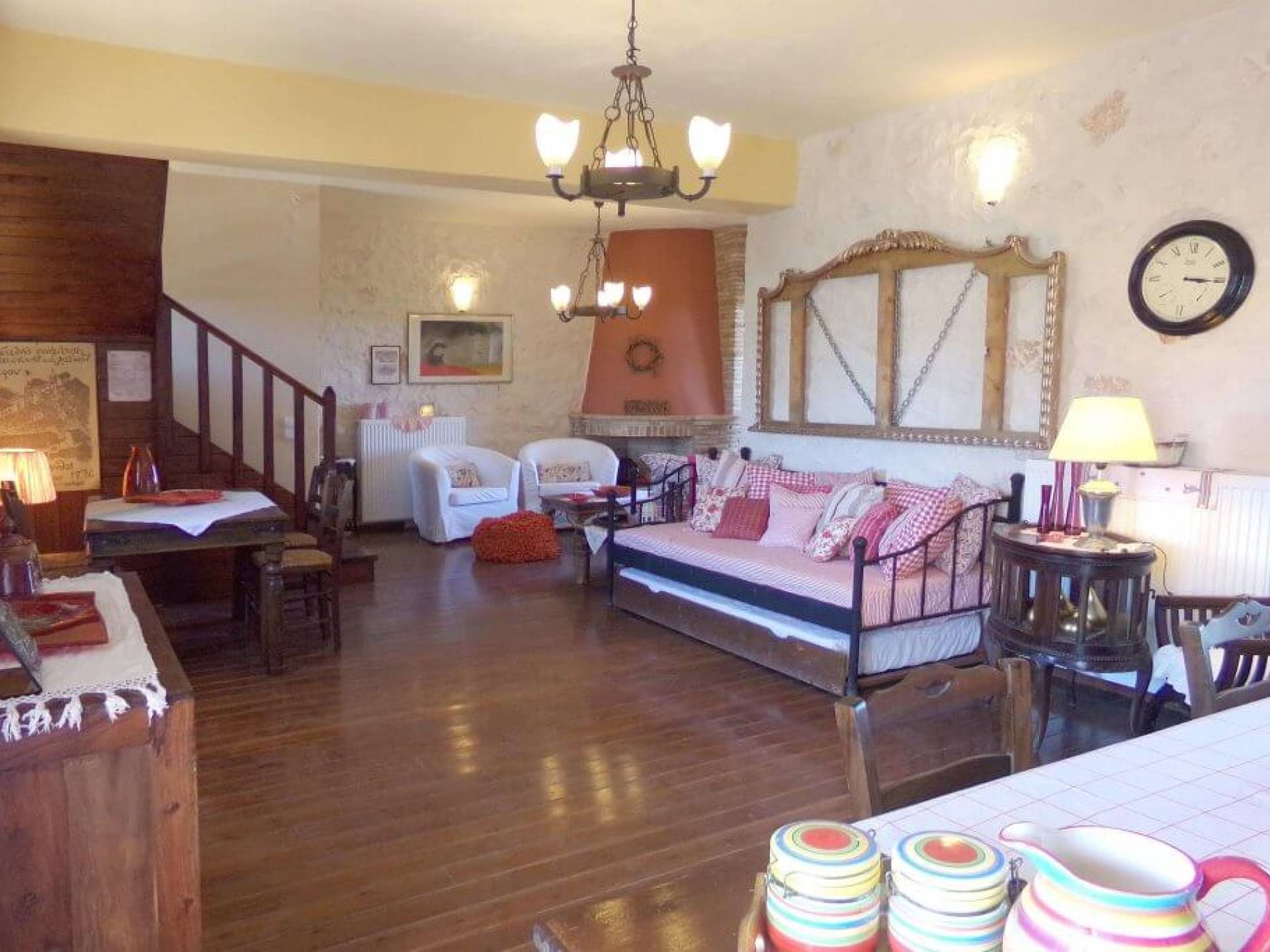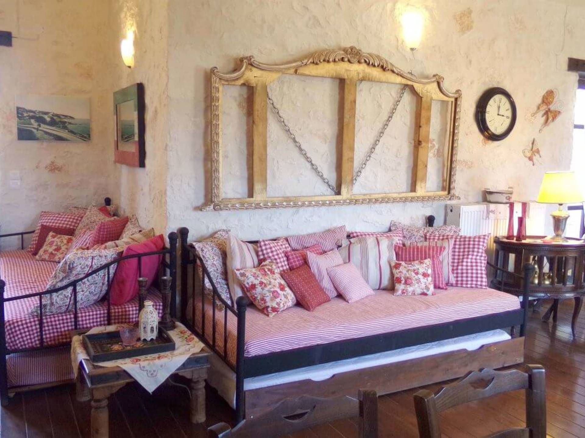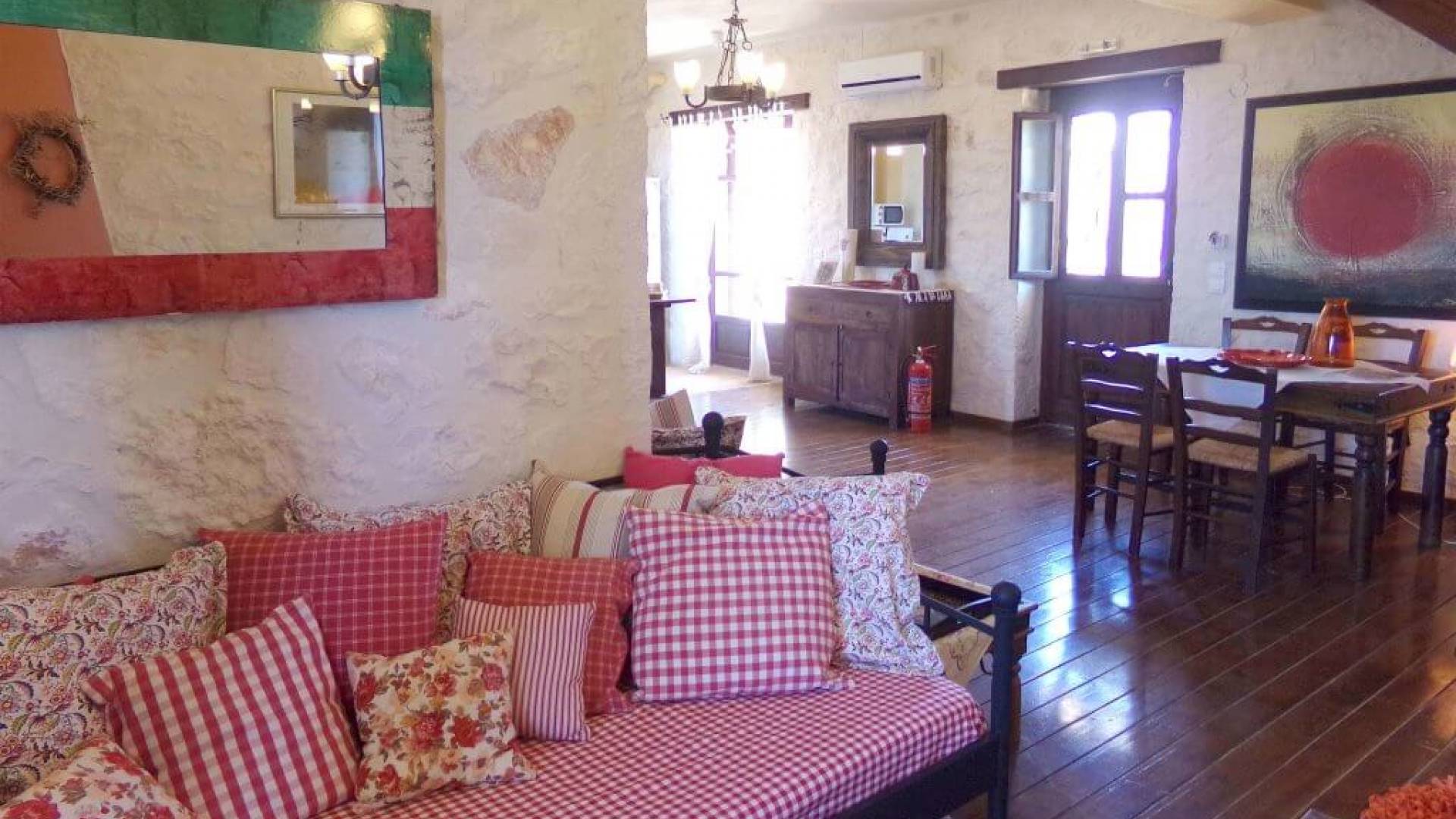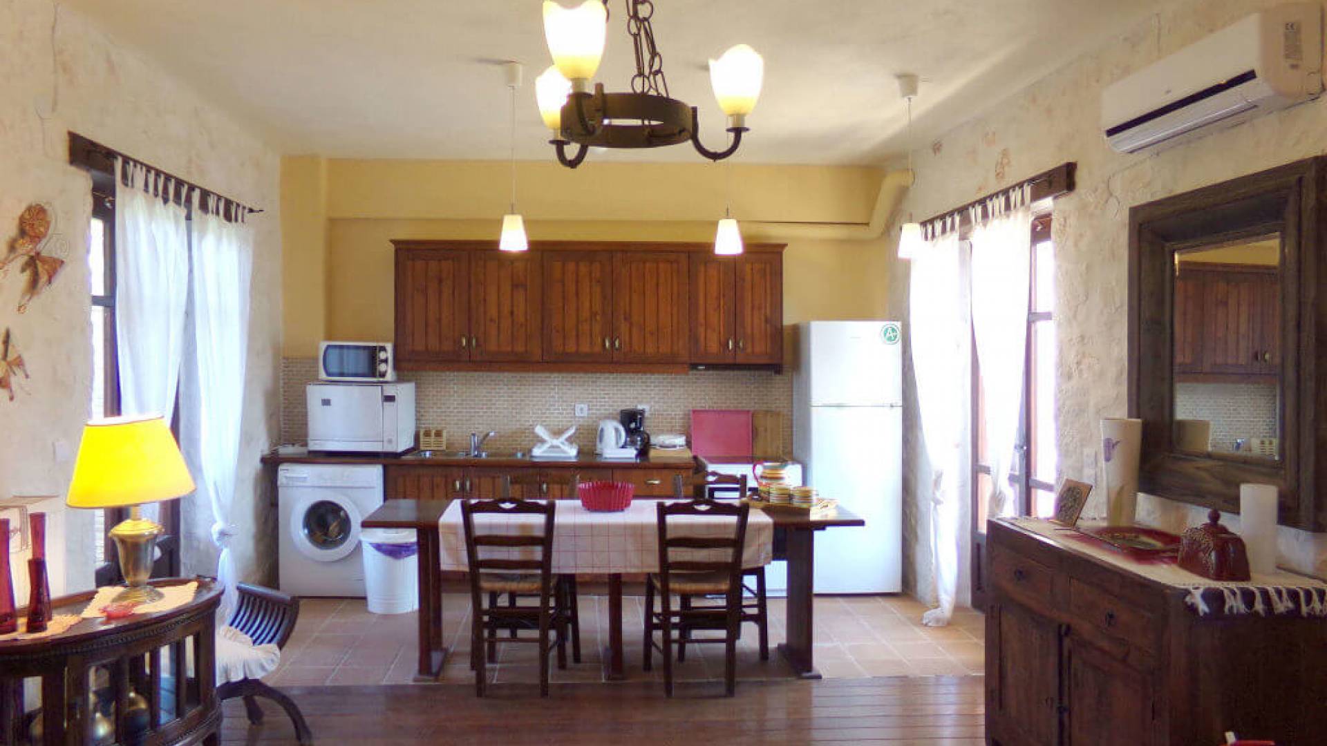 Во всех апартаментах есть гостиная зона на первом уровне (где могут разместиться еще 2 гостя), красиво оформленная антикварной мебелью, освещением, зеркалами, традиционной вышивкой и множеством подушек, создающих ауру закинтийского гостеприимства. Рядом находится полностью оборудованная кухня с холодильником, плитой, духовкой, посудомоечной и стиральной машинами, посудой и всей необходимой посудой. Здесь также есть очаровательная романтическая спальня с двуспальной кроватью, камином и ванной с душем и туалетом.
