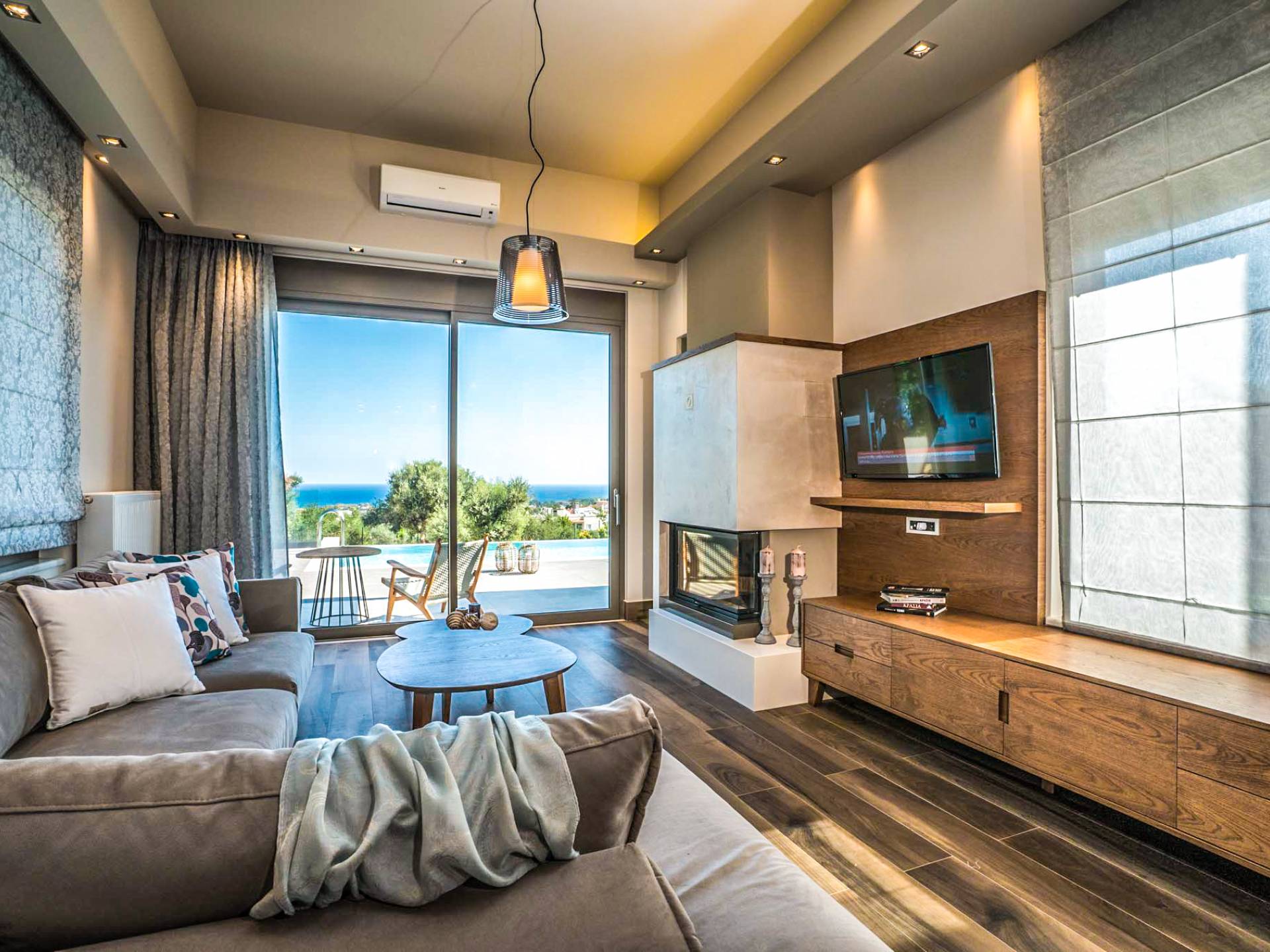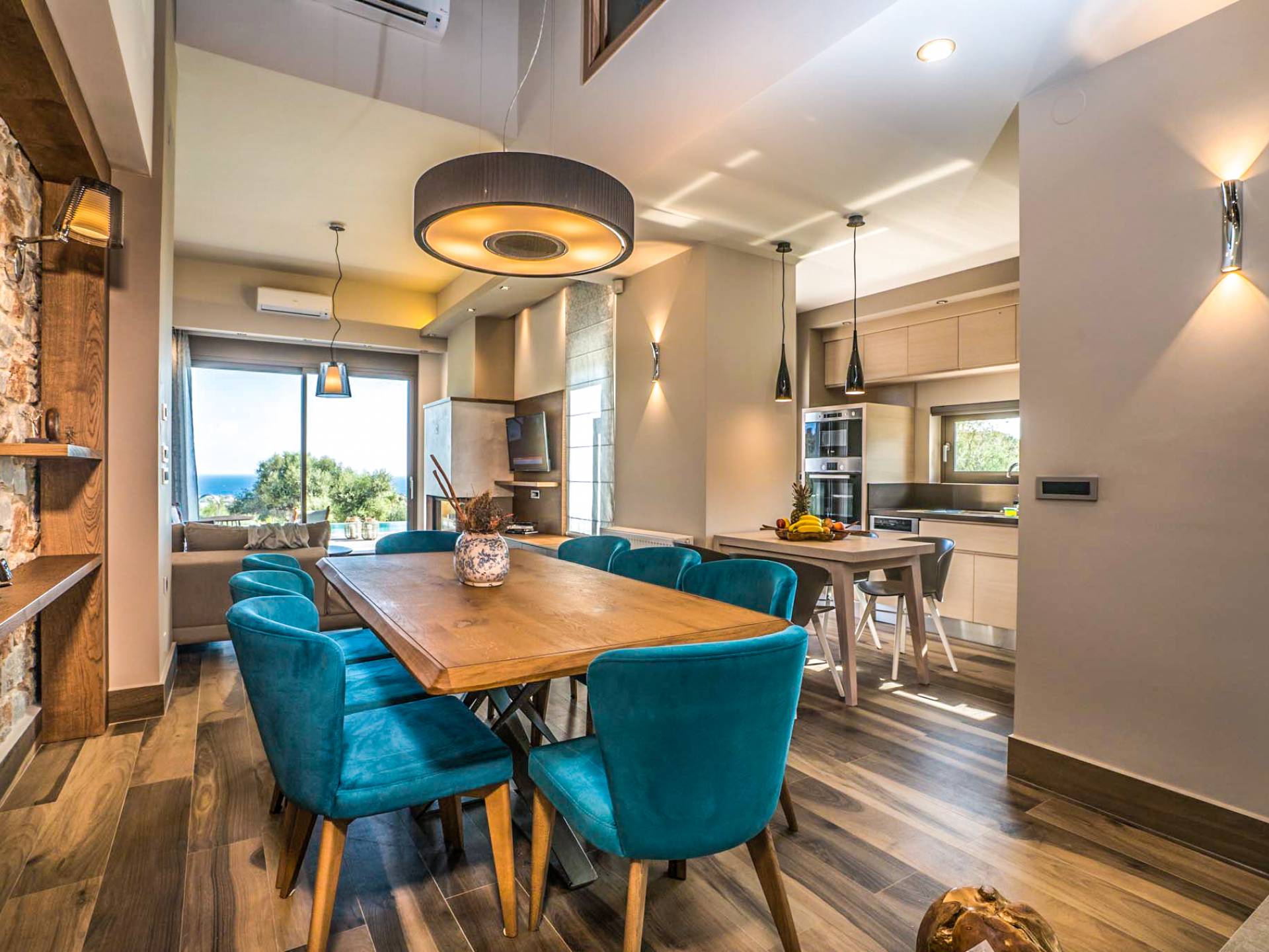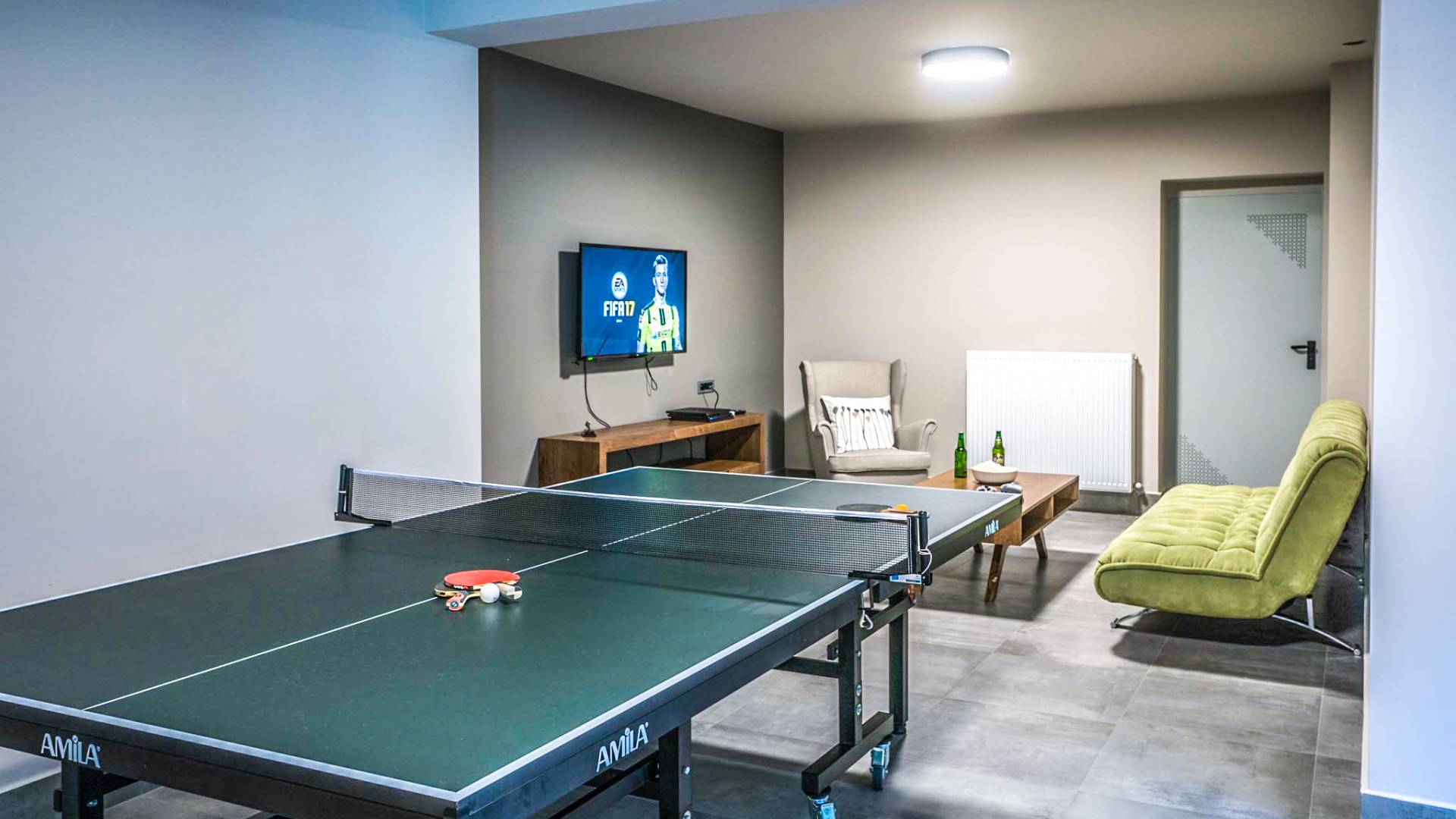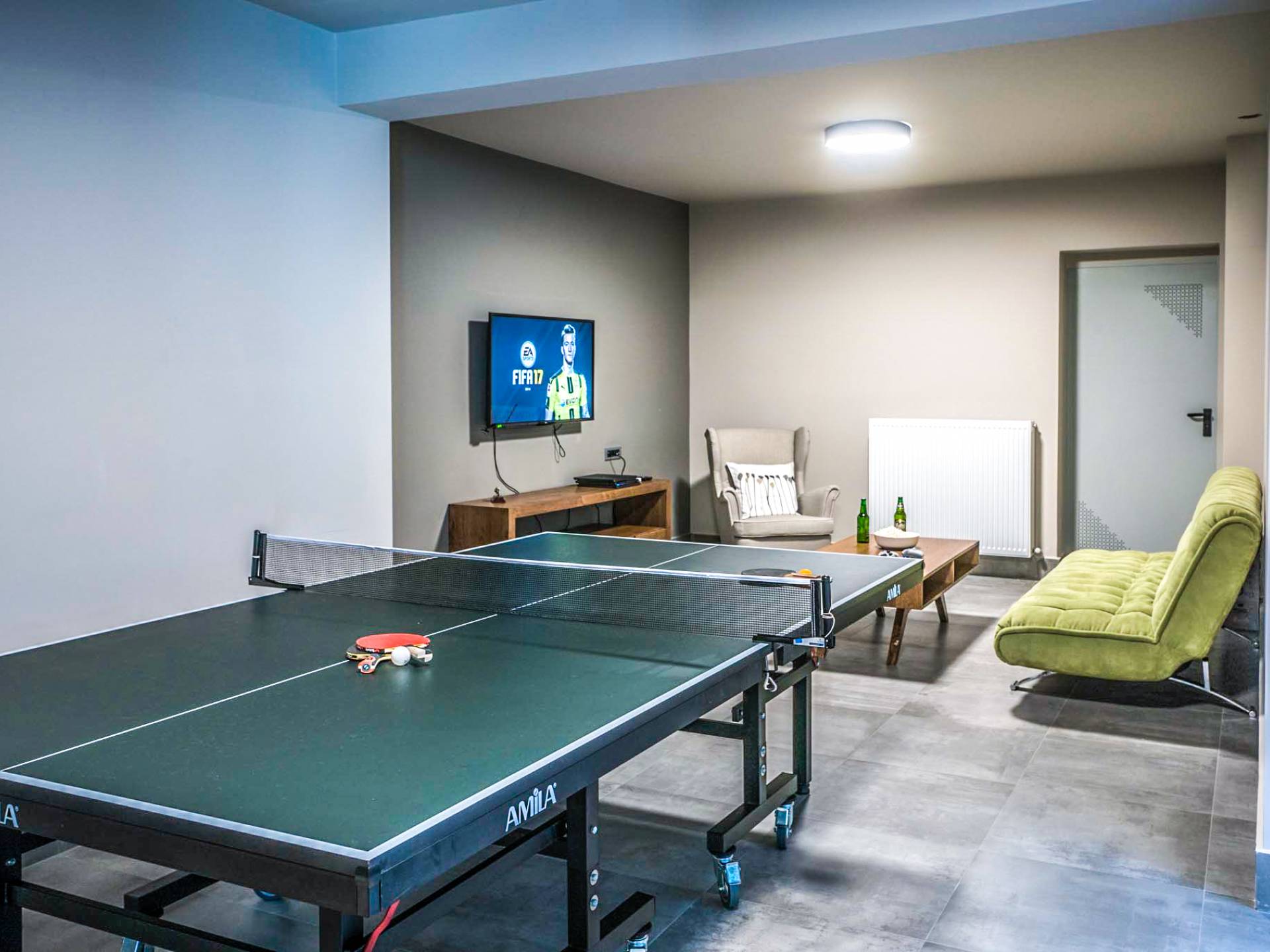 Вилла Afroditi Chania состоит из 3 уровней и может вместить до 8 взрослых и 1 ребенка. На первом этаже находится основная гостиная с большими и удобными диванами, обеденная зона и полностью оборудованная кухня. Есть также 2 спальни с двуспальными кроватями, которые имеют общую ванную комнату с душем. На втором этаже находится еще одна спальня с большой двуспальной кроватью и ванной комнатой с душем. На нижнем этаже есть еще одна гостиная, одна спальня с ванной комнатой и игровая комната с тренажерным залом и бильярдным столом.