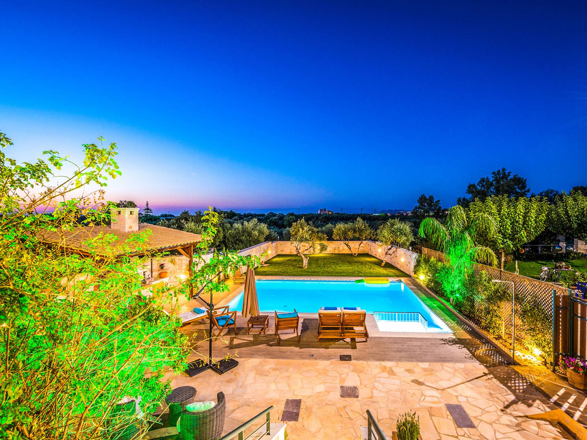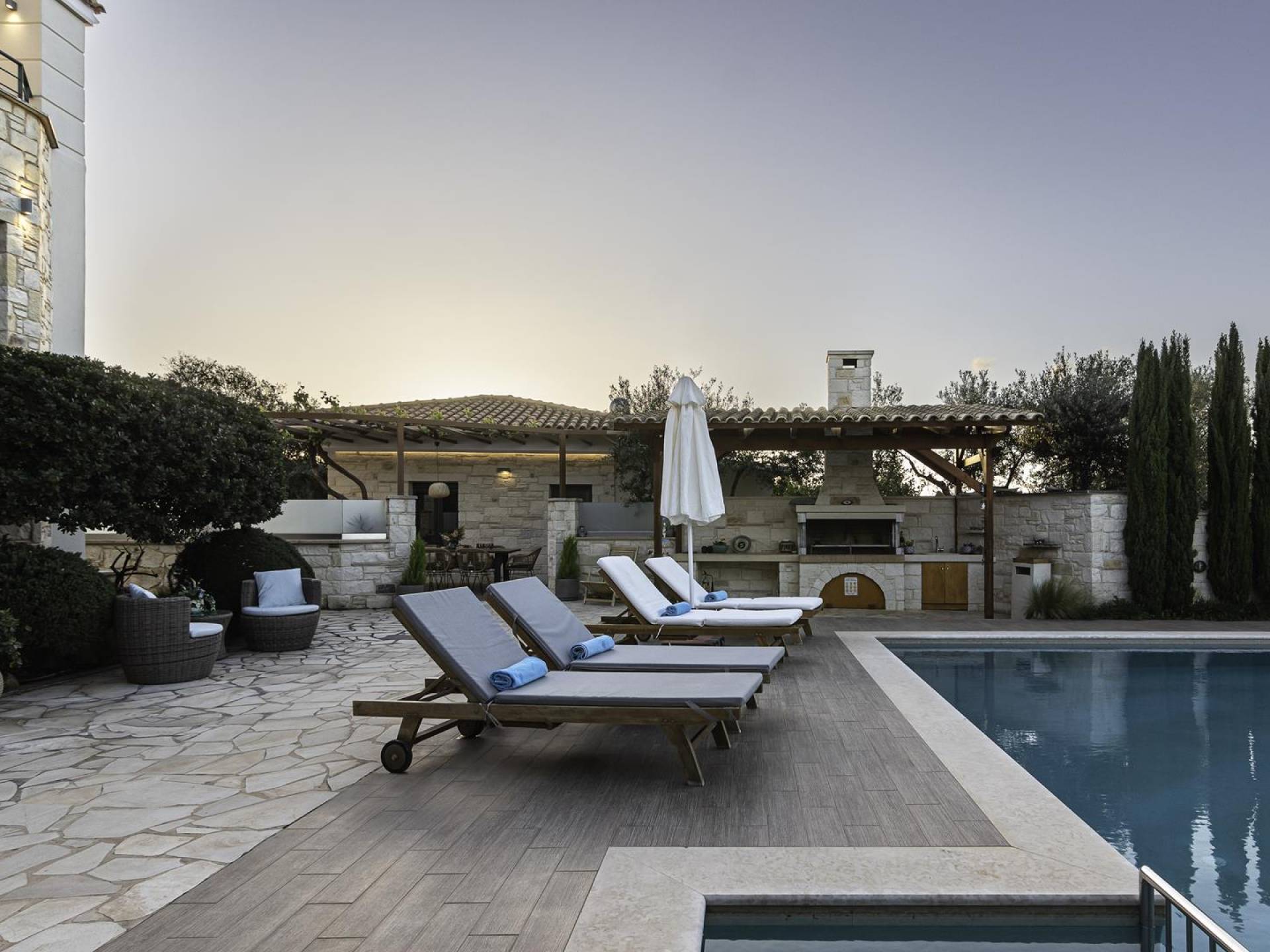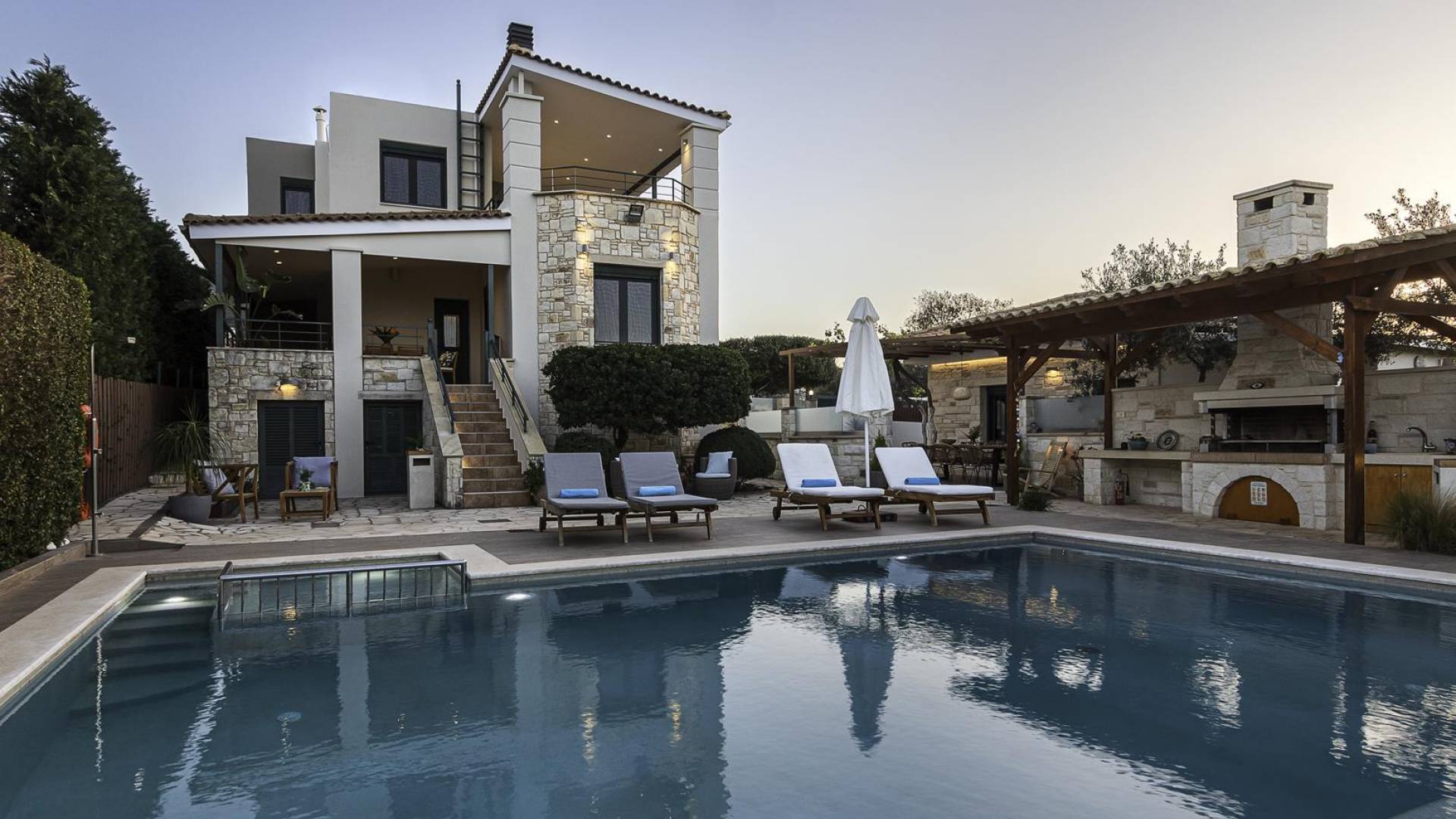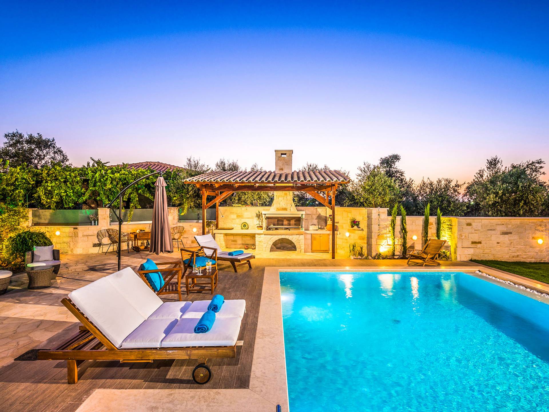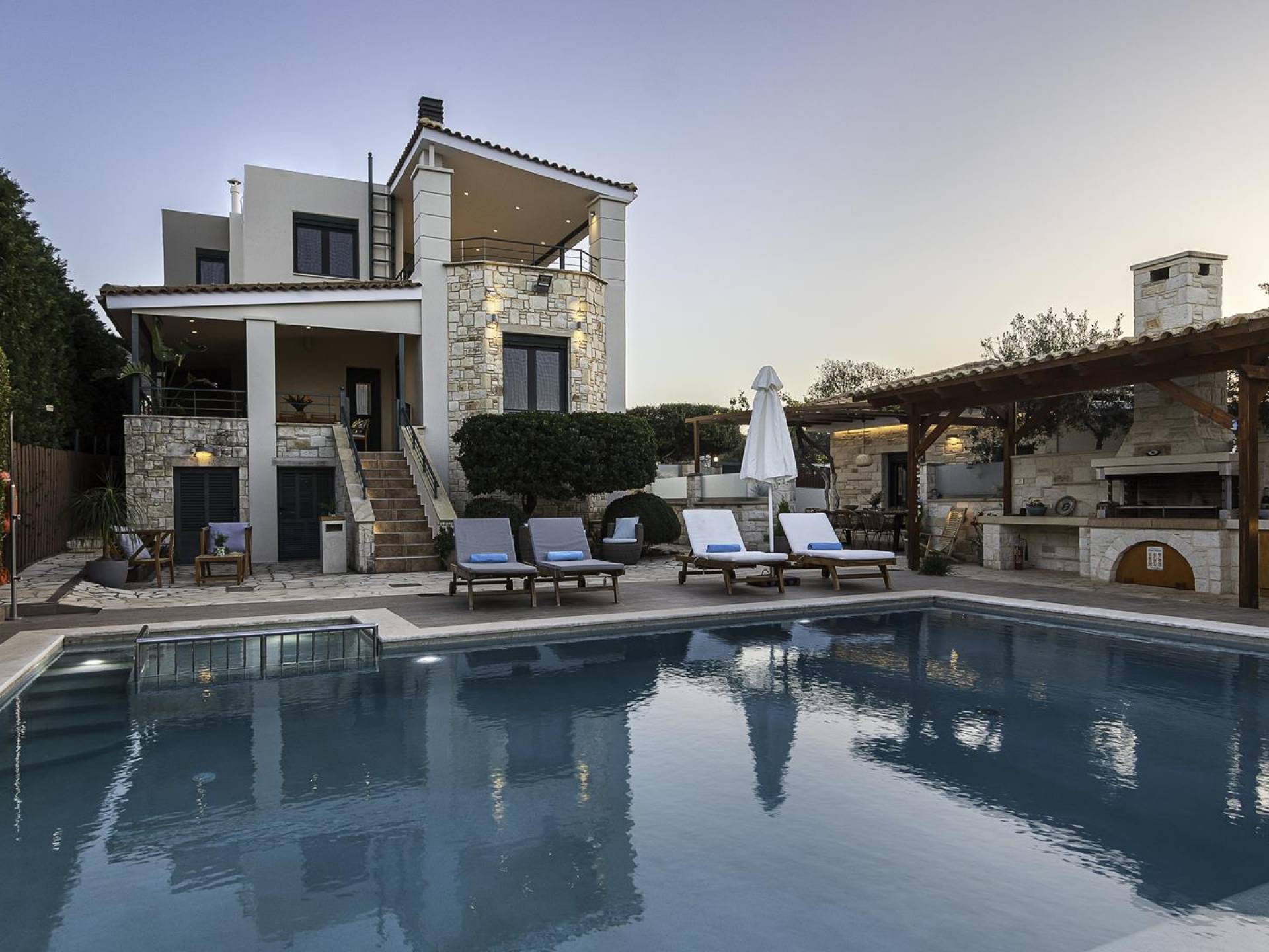 Antonia Blue Villa Chania имеет удивительное открытое пространство с большим частным бассейном и прекрасным видом. На вилле также есть большой сад с шезлонгами и зонтиками, который идеально подходит для отдыха под критским солнцем. Также предоставляются пляжные полотенца. Это лучший выбор для семей с детьми или пар, для незабываемого отдыха на Крите. Вечером вы можете насладиться великолепным романтическим закатом, который раскрашивает прекрасными красками чистое синее средиземноморское небо, или вы можете проехать примерно 5-6 минут до центра города Ханья и Старой гавани.