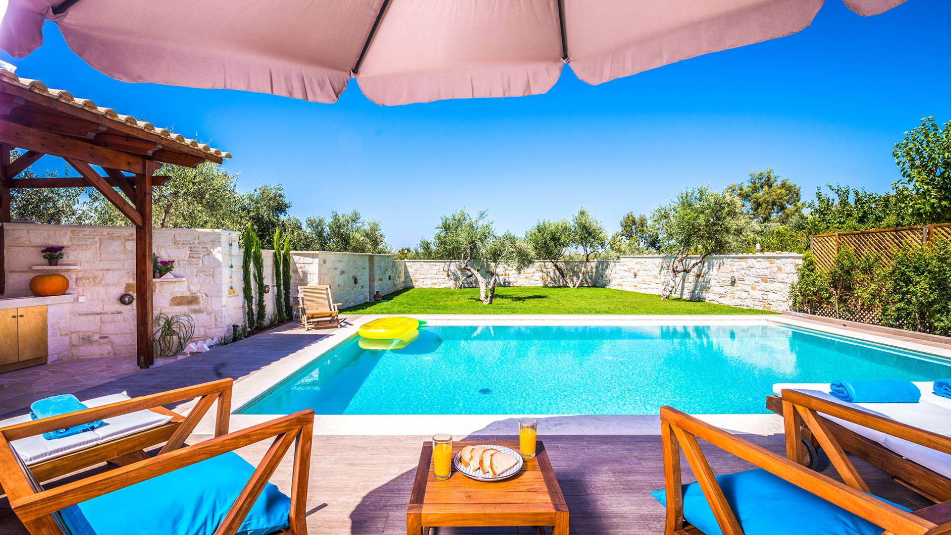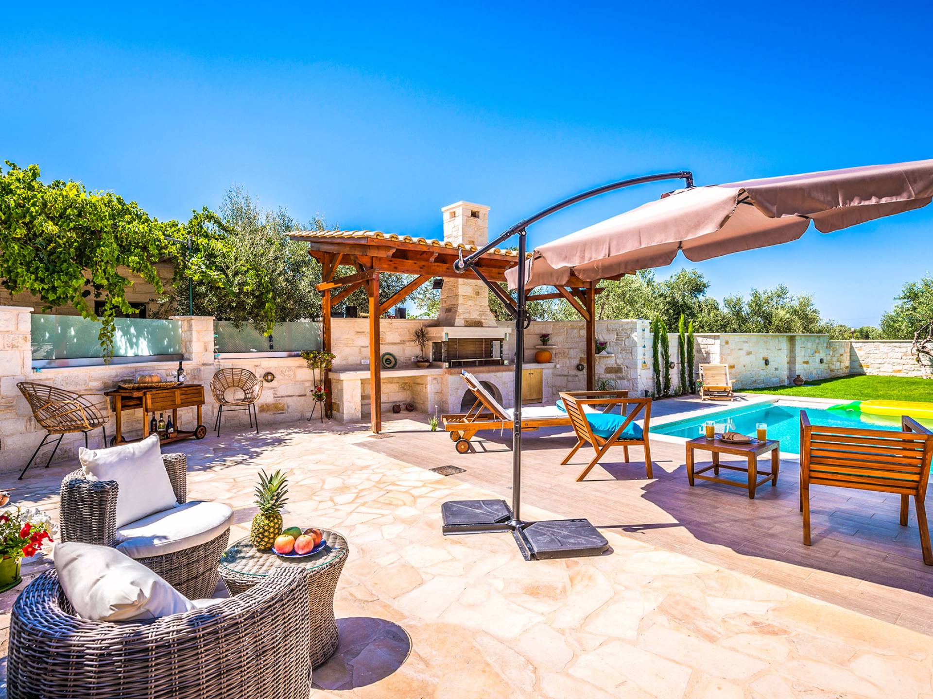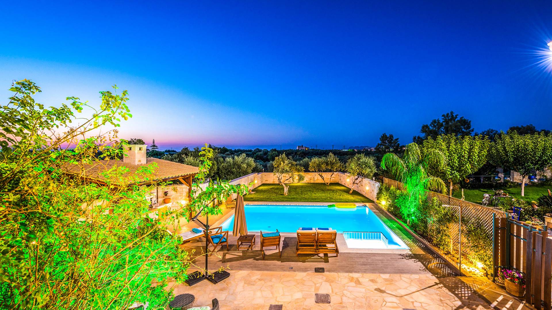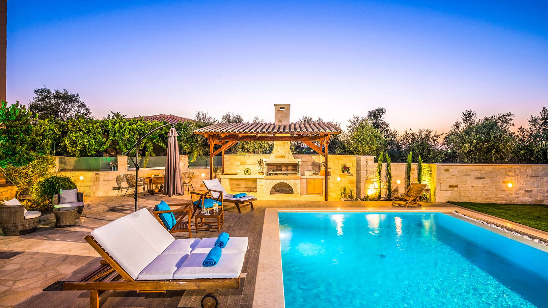 Antonia Blue Villa Chania имеет удивительное открытое пространство с большим частным бассейном и прекрасным видом. На вилле также есть большой сад с шезлонгами и зонтиками, который идеально подходит для отдыха под критским солнцем. Также предоставляются пляжные полотенца. Это лучший выбор для семей с детьми или пар, для незабываемого отдыха на Крите. Вечером вы можете насладиться великолепным романтическим закатом, который раскрашивает прекрасными красками чистое синее средиземноморское небо, или вы можете проехать примерно 5-6 минут до центра города Ханья и Старой гавани.