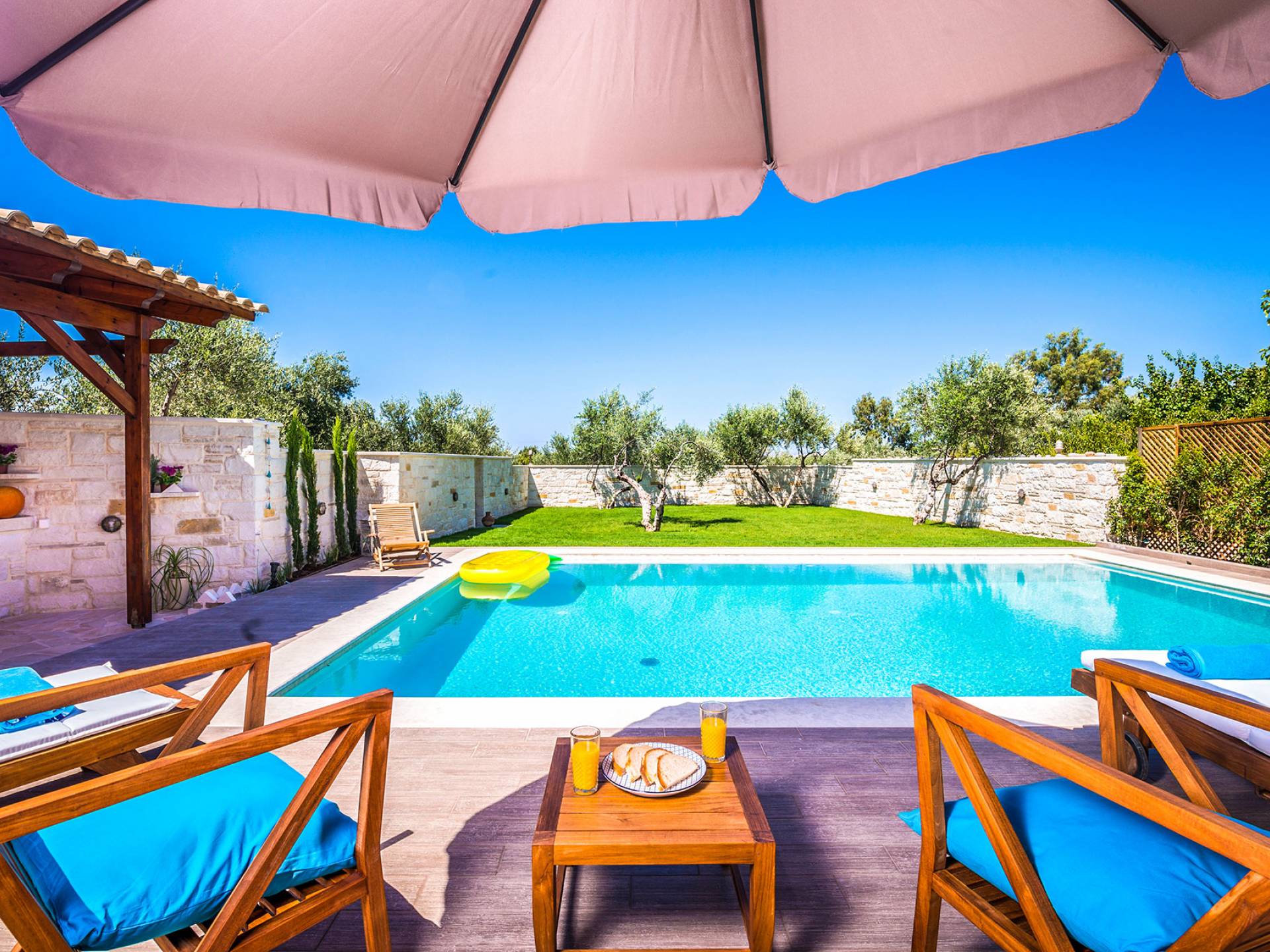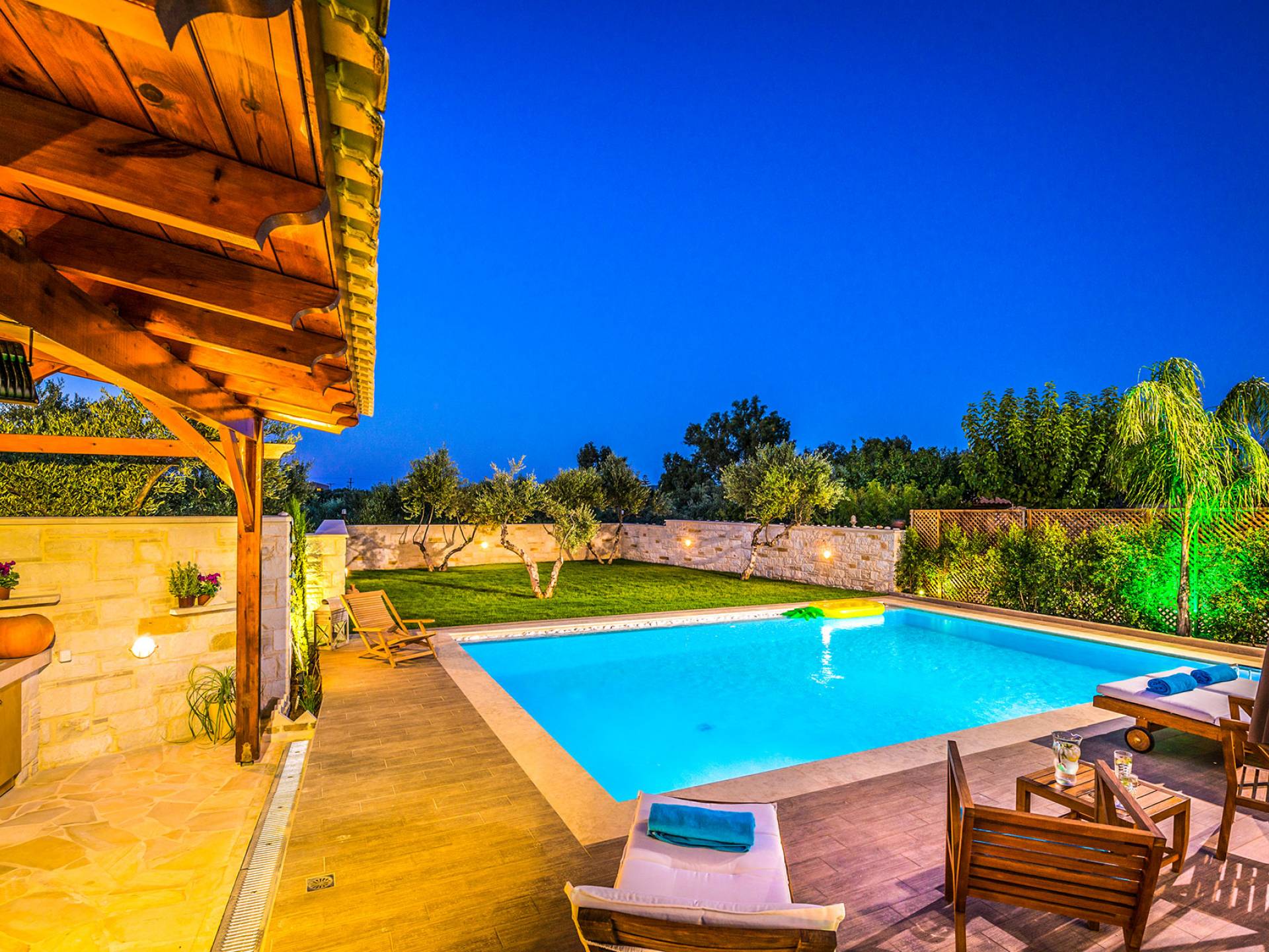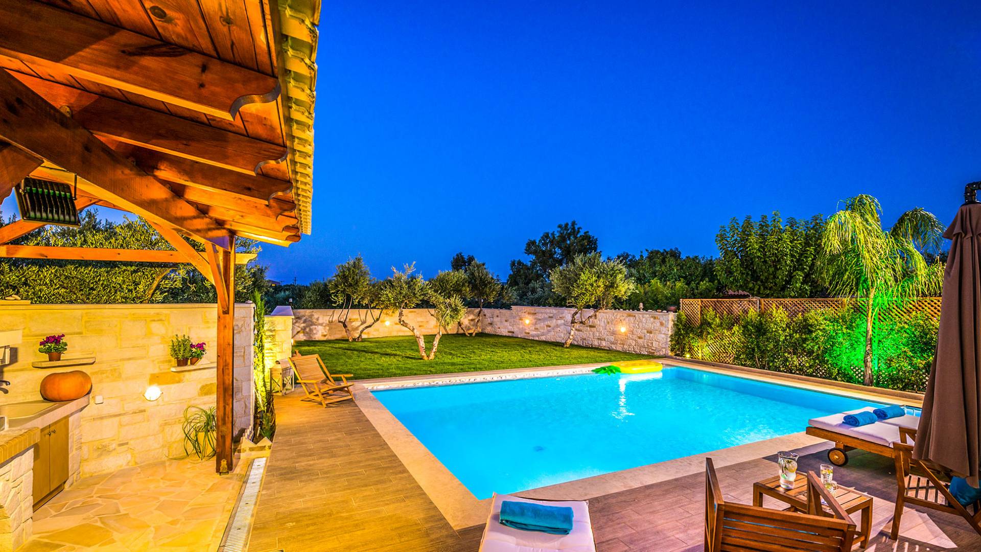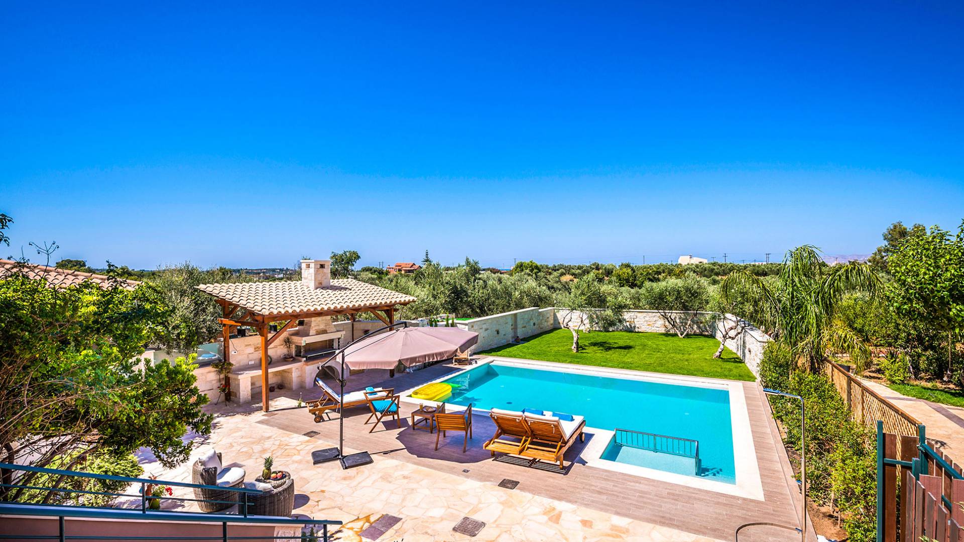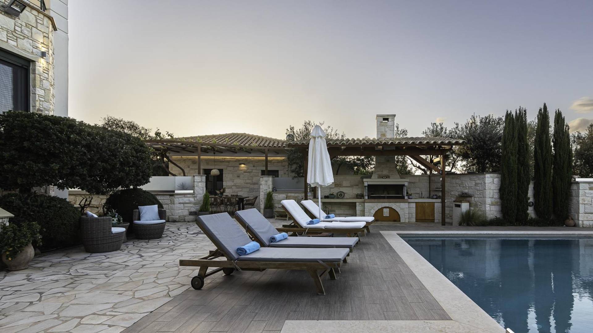 Antonia Blue Villa Chania имеет удивительное открытое пространство с большим частным бассейном и прекрасным видом. На вилле также есть большой сад с шезлонгами и зонтиками, который идеально подходит для отдыха под критским солнцем. Также предоставляются пляжные полотенца. Это лучший выбор для семей с детьми или пар, для незабываемого отдыха на Крите. Вечером вы можете насладиться великолепным романтическим закатом, который раскрашивает прекрасными красками чистое синее средиземноморское небо, или вы можете проехать примерно 5-6 минут до центра города Ханья и Старой гавани.