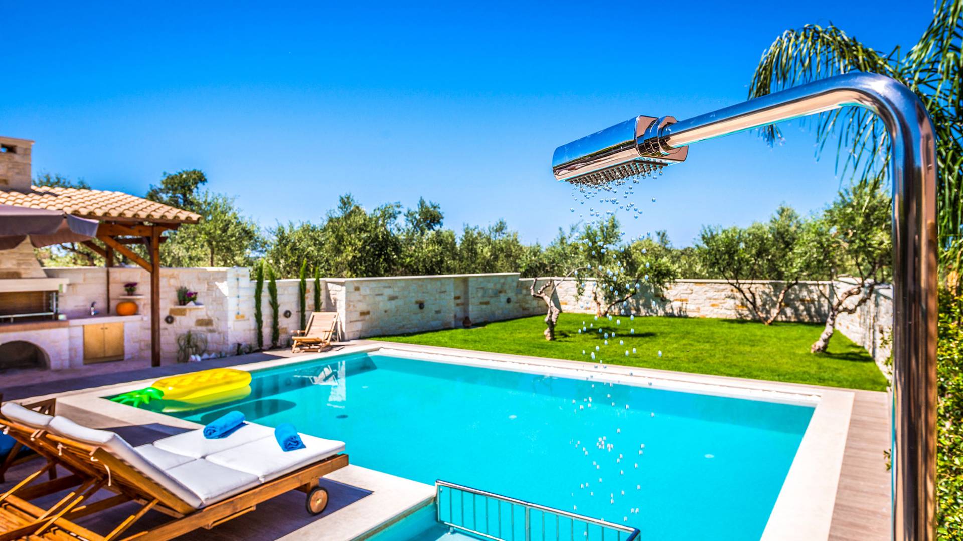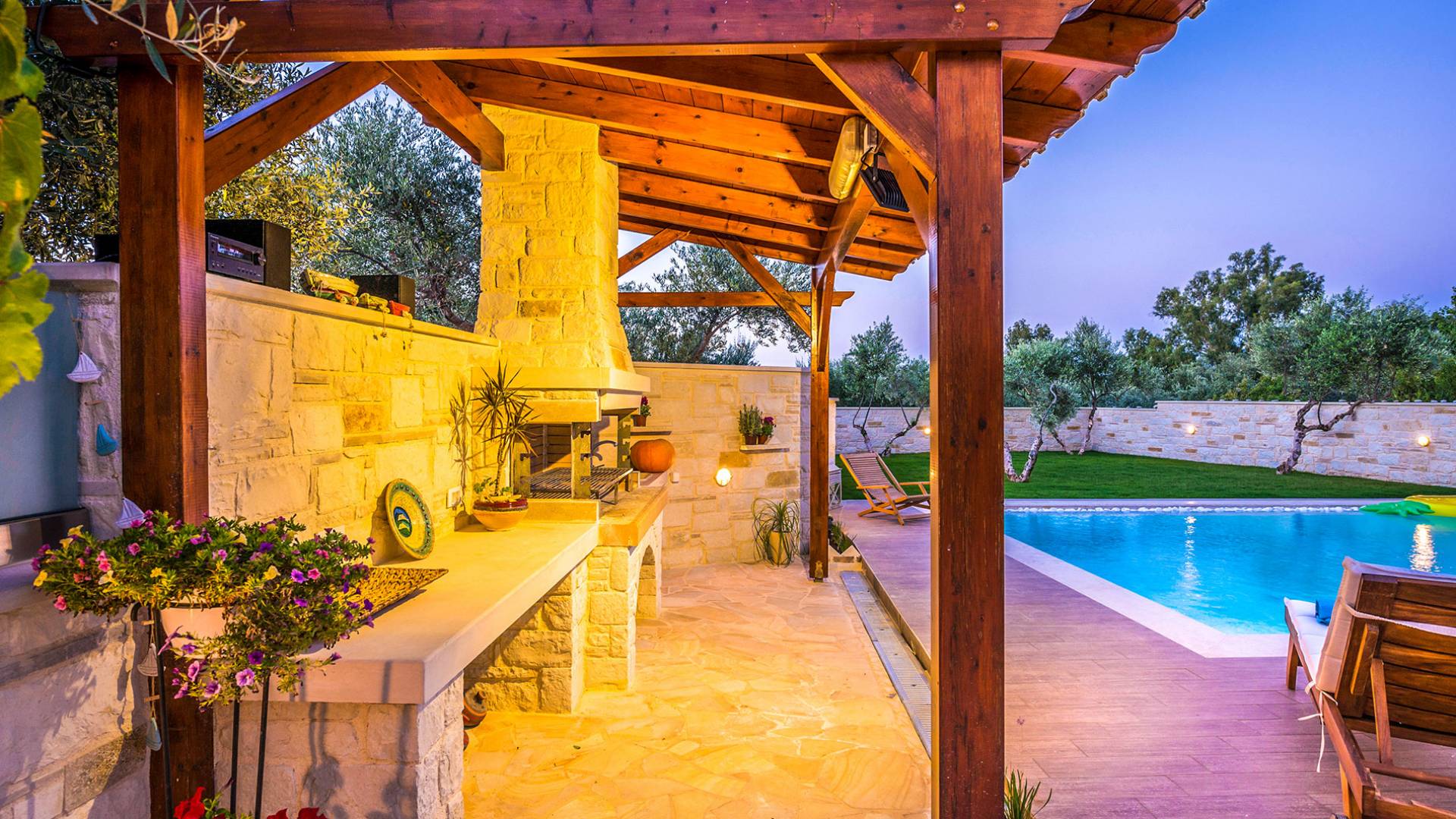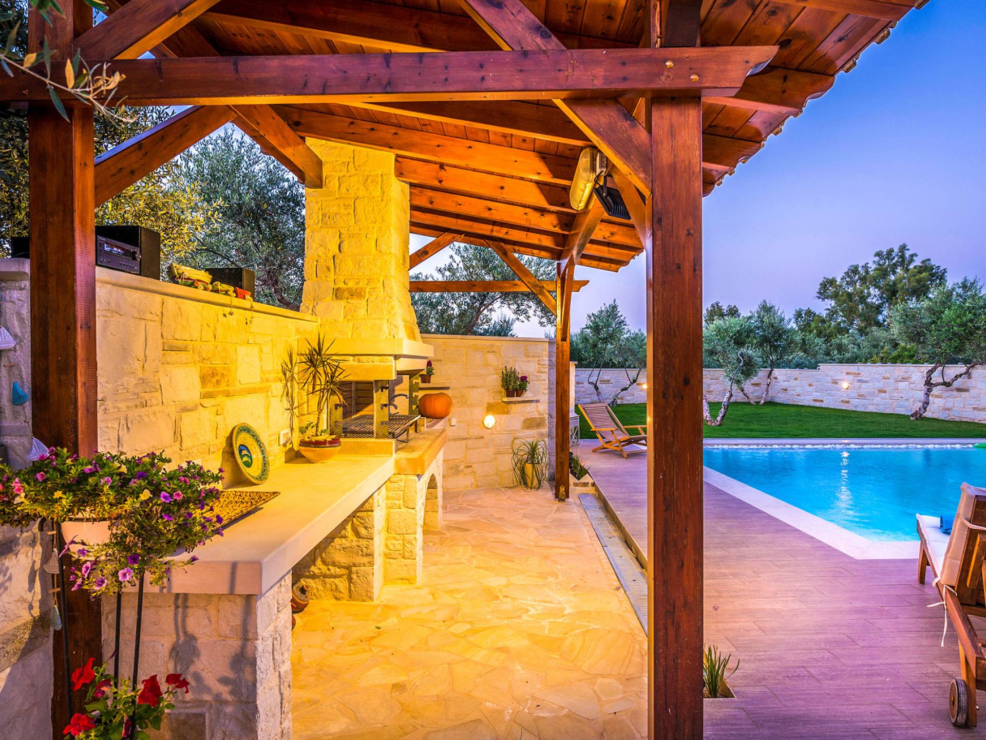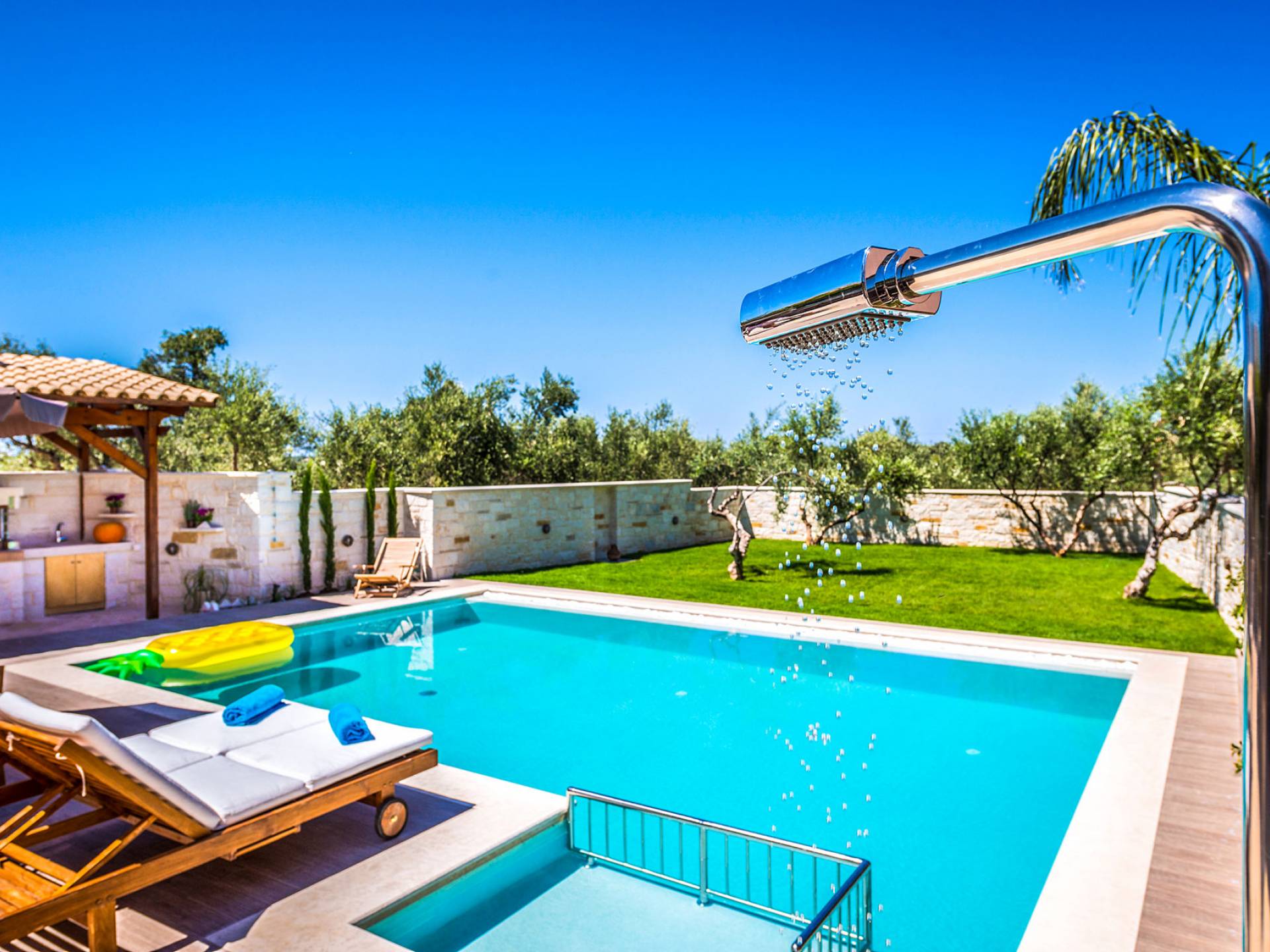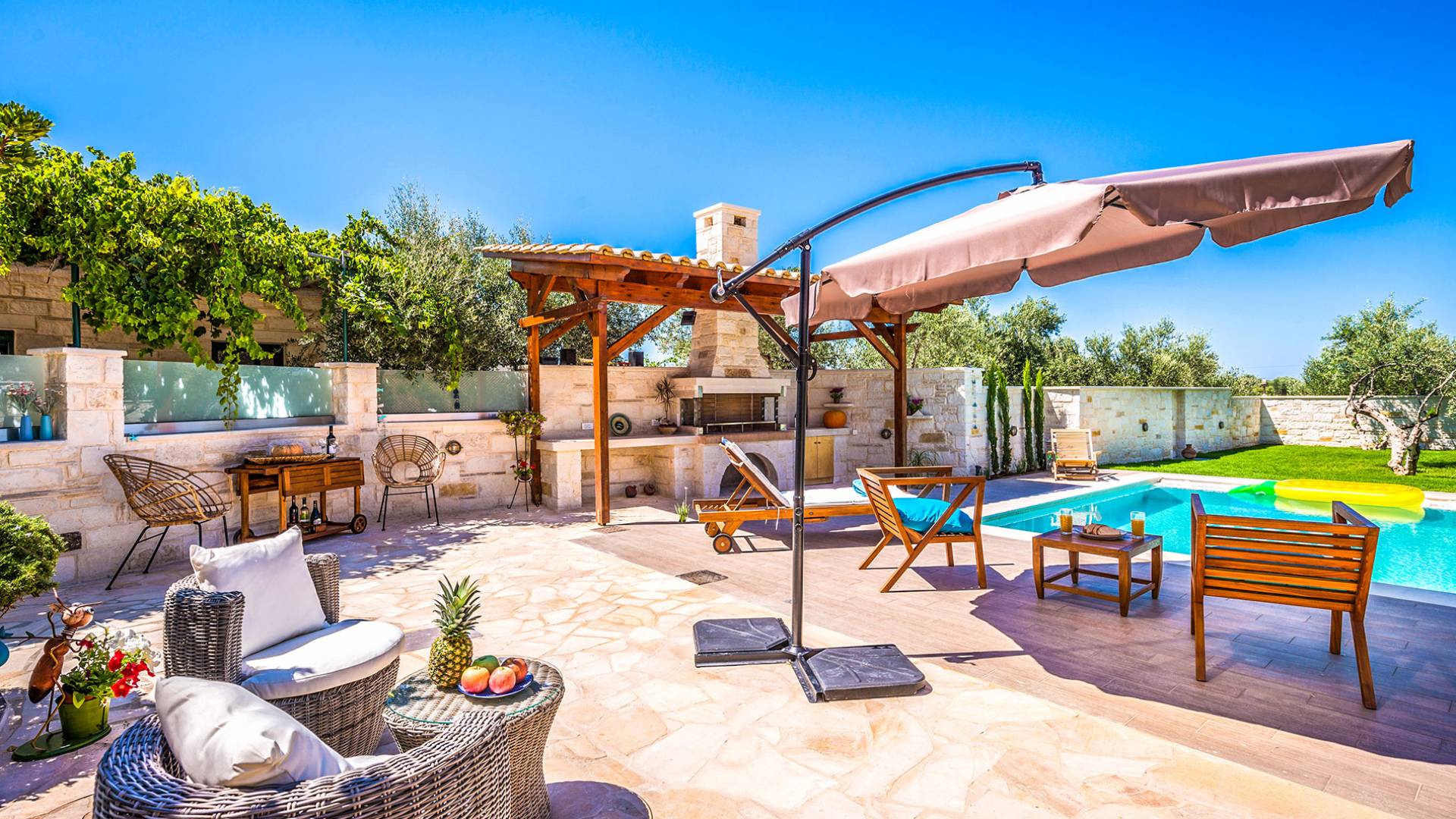 Antonia Blue Villa Chania имеет удивительное открытое пространство с большим частным бассейном и прекрасным видом. На вилле также есть большой сад с шезлонгами и зонтиками, который идеально подходит для отдыха под критским солнцем. Также предоставляются пляжные полотенца. Это лучший выбор для семей с детьми или пар, для незабываемого отдыха на Крите. Вечером вы можете насладиться великолепным романтическим закатом, который раскрашивает прекрасными красками чистое синее средиземноморское небо, или вы можете проехать примерно 5-6 минут до центра города Ханья и Старой гавани.
