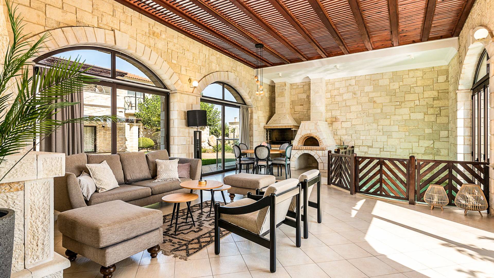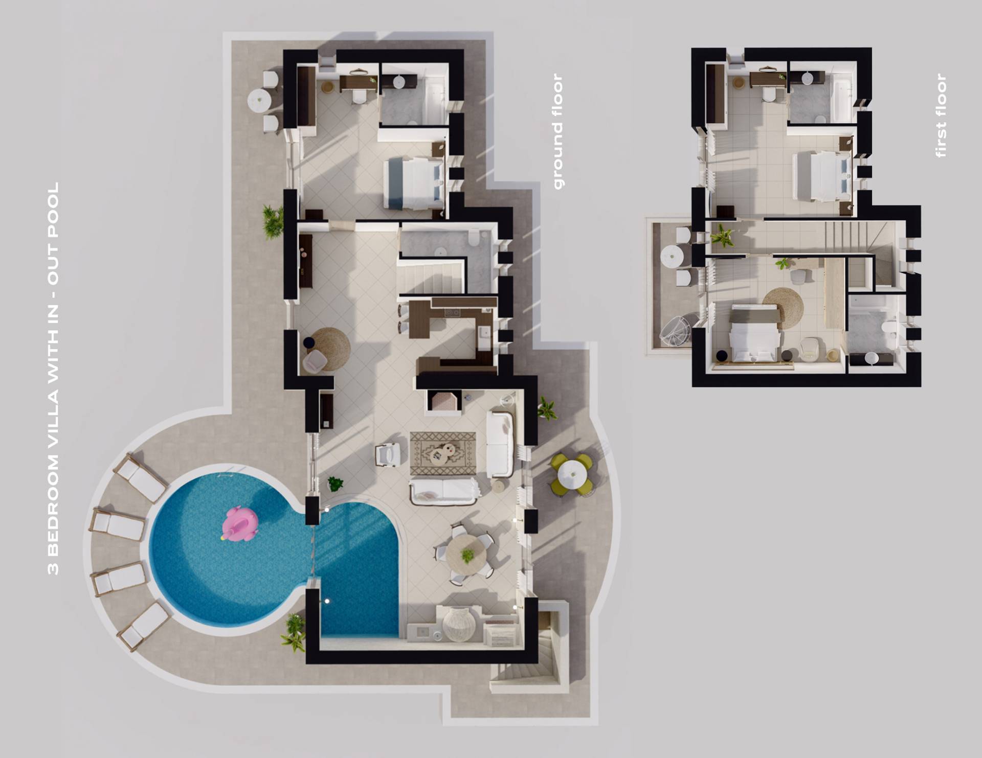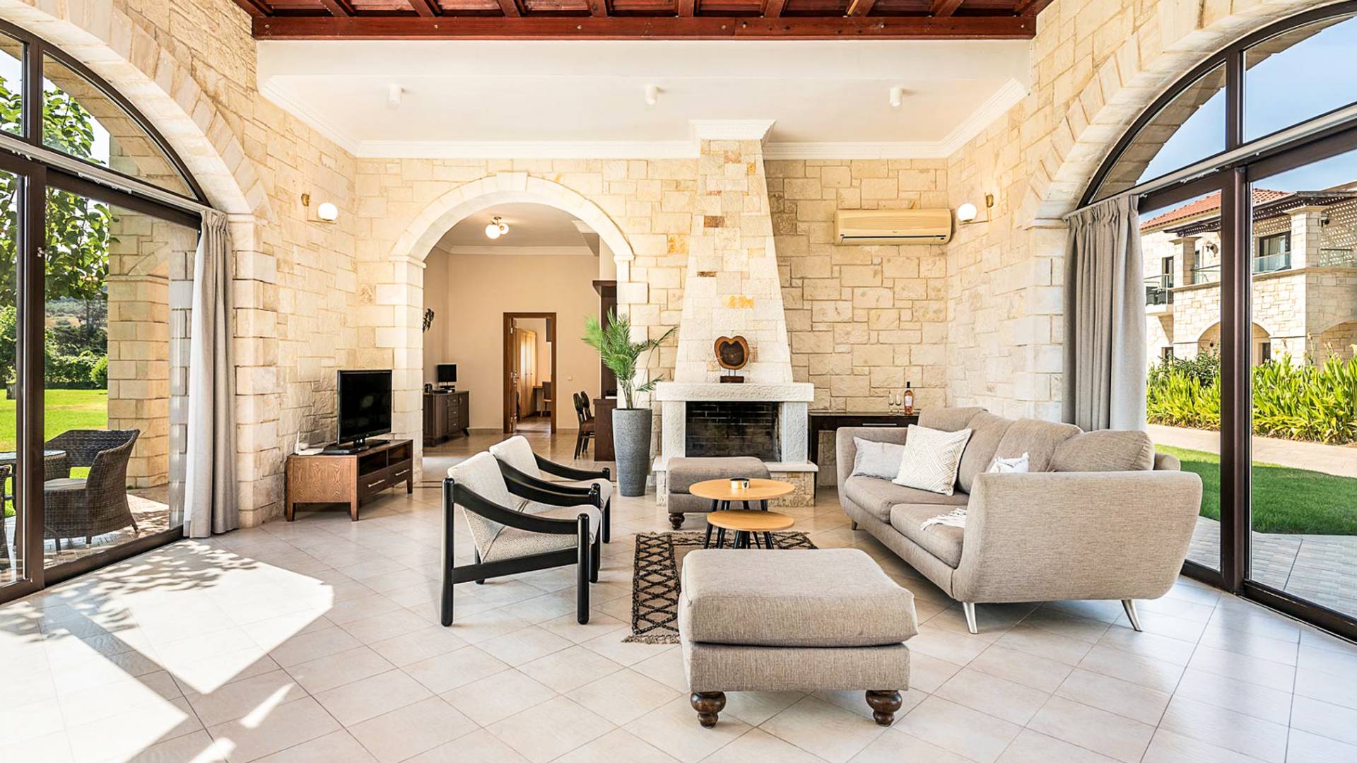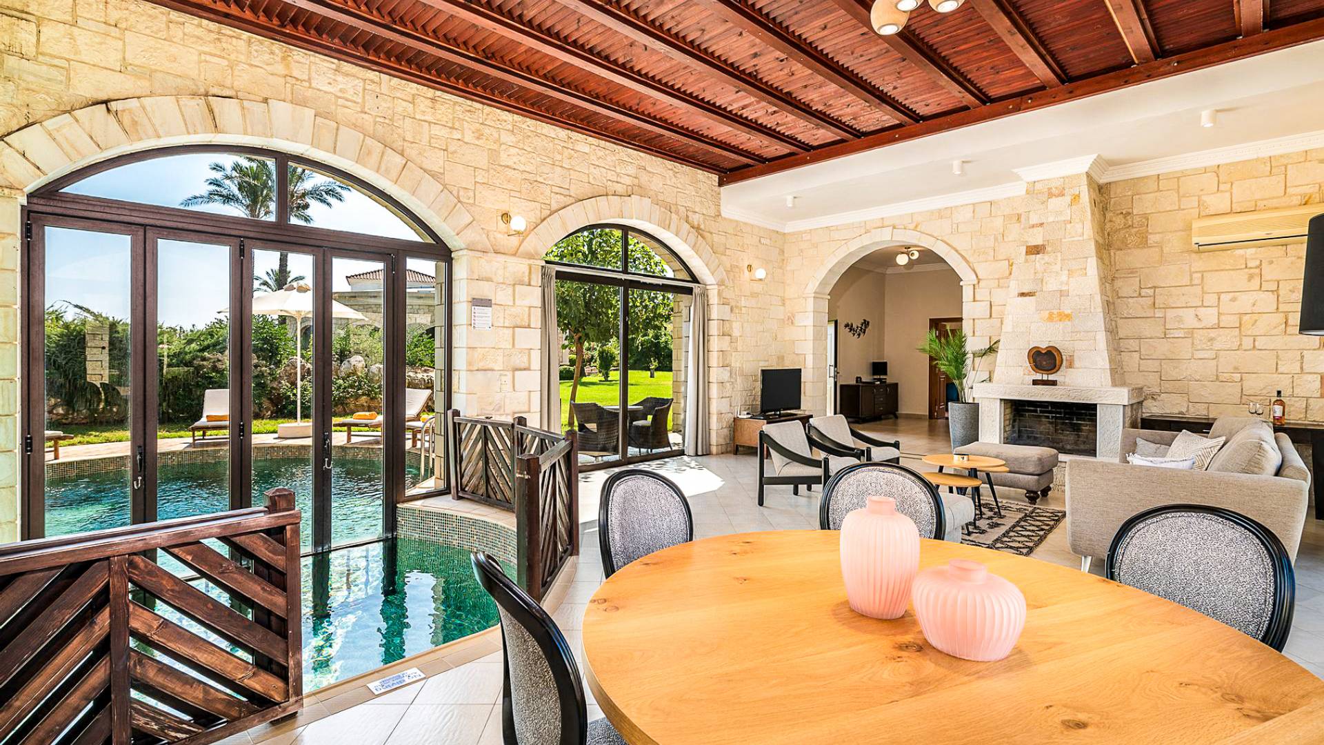 На первом этаже находится гостиная и обеденная зона открытой планировки с камином и принадлежностями для барбекю, которая сочетает в себе закрытый и открытый частные бассейны, обеспечивает все удобства и роскошь и создает поистине очаровательную атмосферу. На первом этаже находится спальня с двуспальной кроватью с ванной комнатой, туалет и дополнительная кровать. На втором этаже две спальни с двуспальными кроватями с ванными комнатами и просторные балконы с видом на чудесную сельскую местность. Во всех номерах есть 32-дюймовый телевизор с плоским экраном, кондиционер, центральное отопление, что делает виллу подходящей для проживания в течение всего года, садовую мебель, шезлонги и зонтики от солнца.