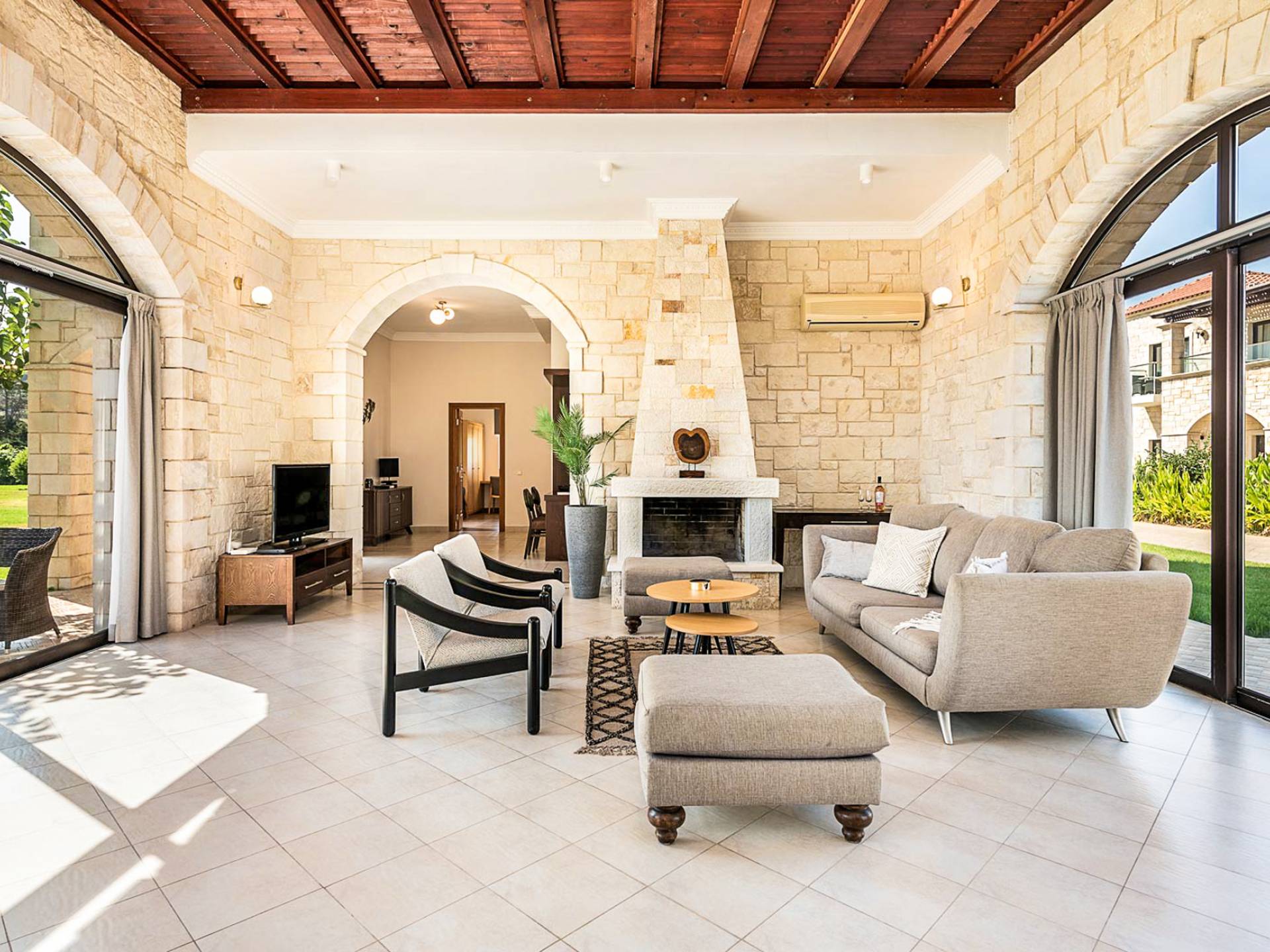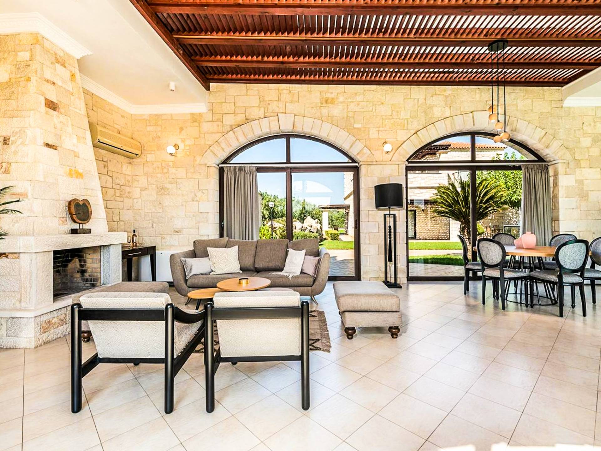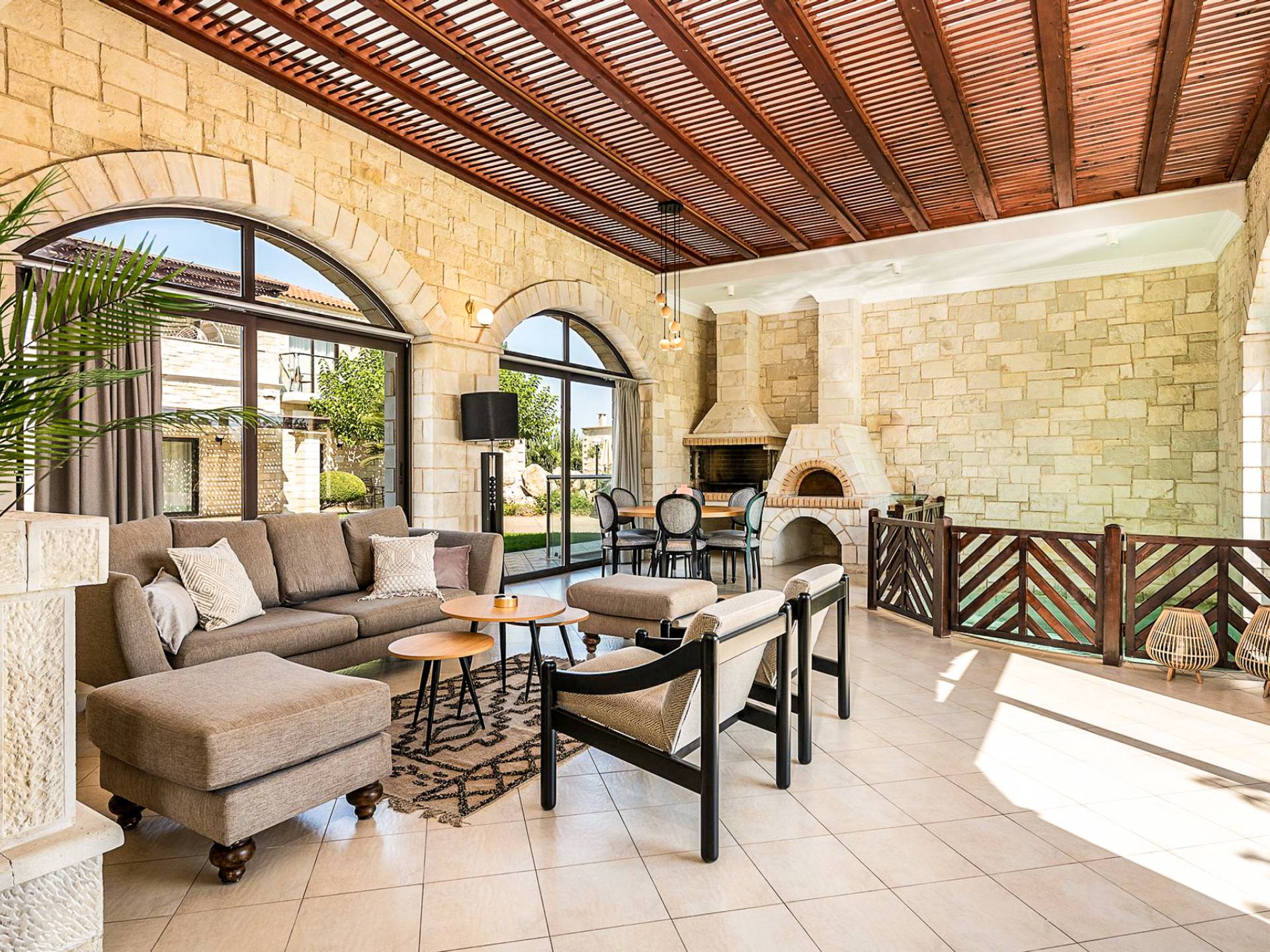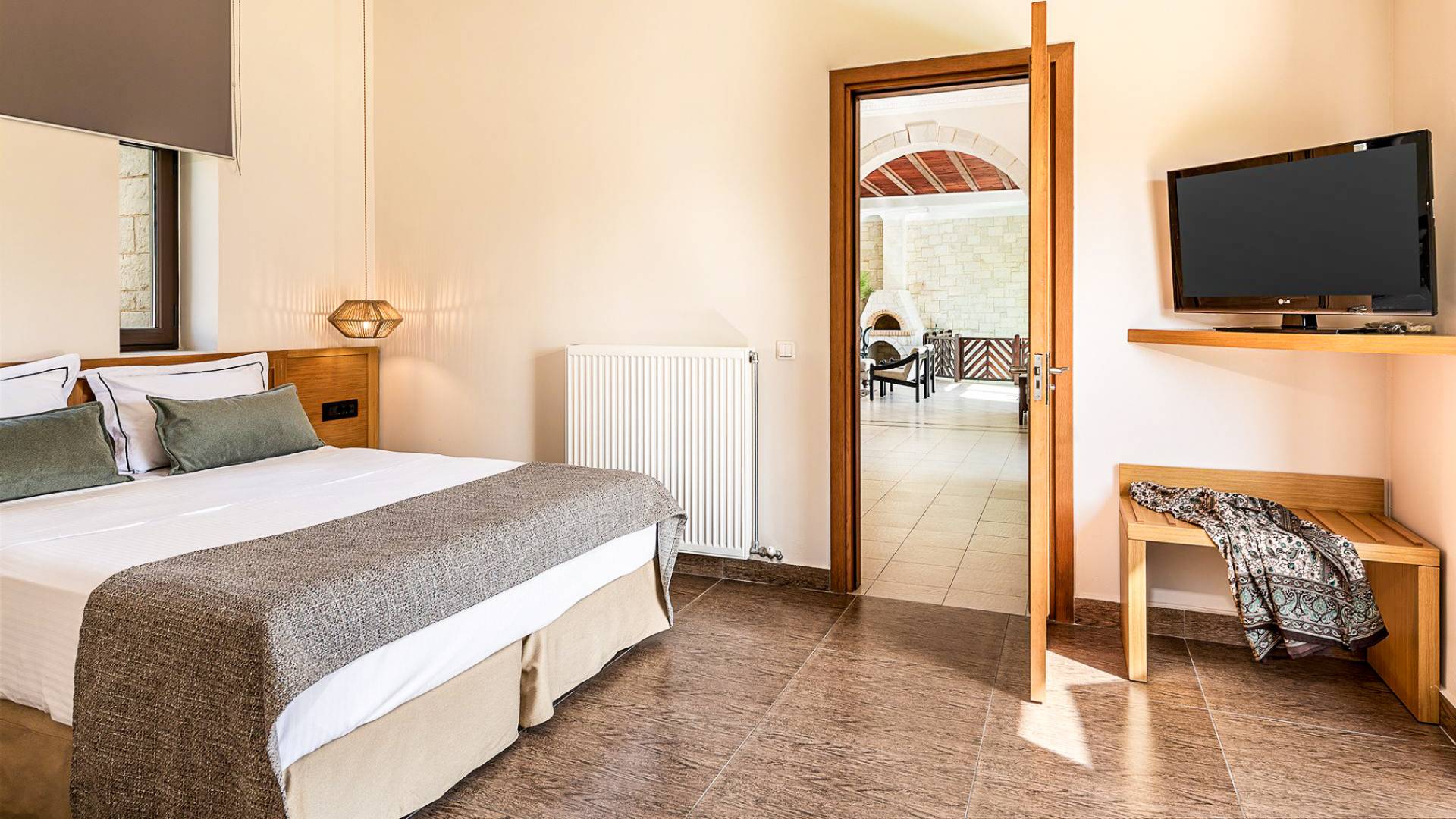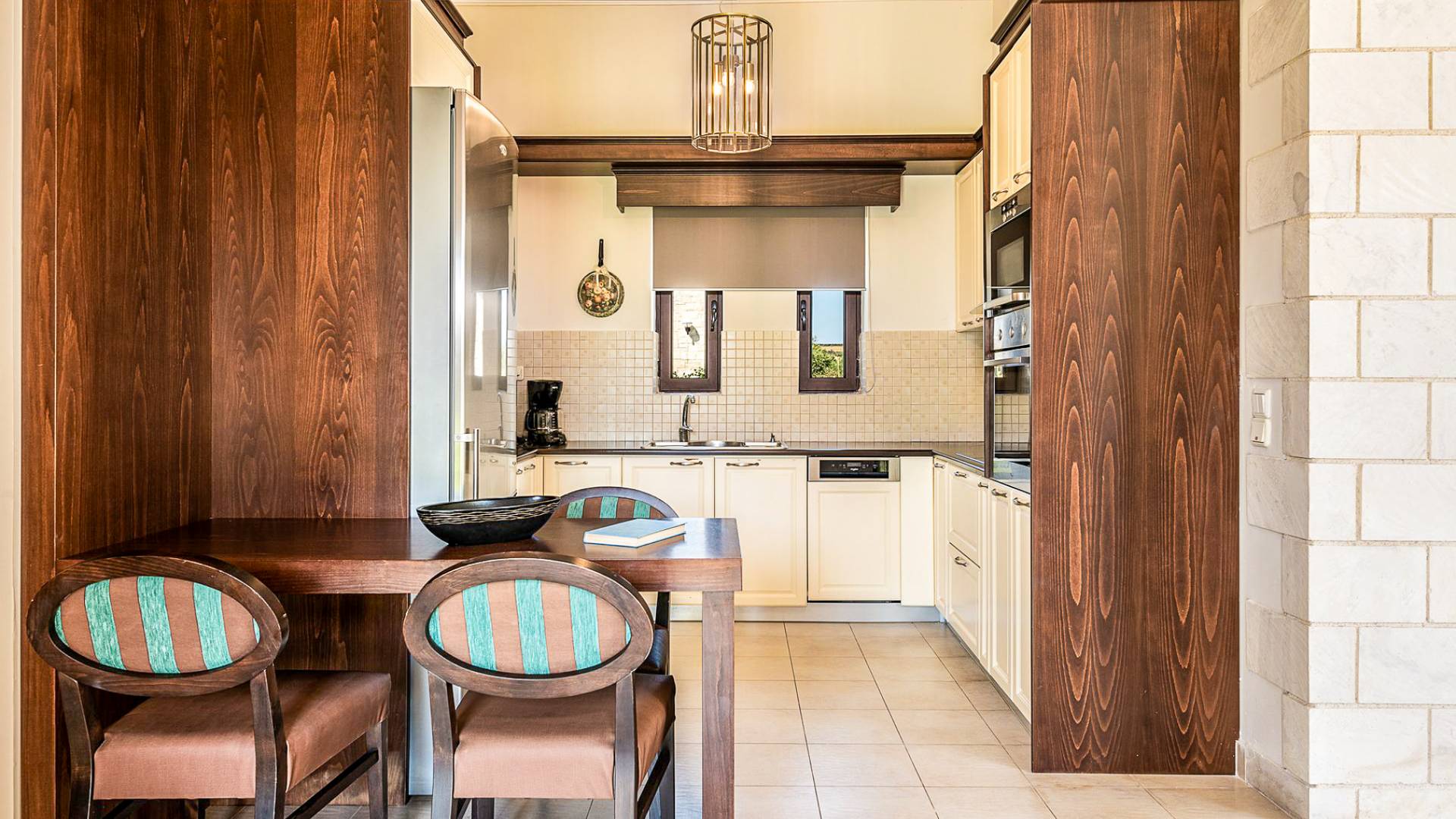 На первом этаже находится гостиная и обеденная зона открытой планировки с камином и принадлежностями для барбекю, которая сочетает в себе закрытый и открытый частные бассейны, обеспечивает все удобства и роскошь и создает поистине очаровательную атмосферу. На первом этаже находится спальня с двуспальной кроватью с ванной комнатой, туалет и дополнительная кровать. На втором этаже две спальни с двуспальными кроватями с ванными комнатами и просторные балконы с видом на чудесную сельскую местность. Во всех номерах есть 32-дюймовый телевизор с плоским экраном, кондиционер, центральное отопление, что делает виллу подходящей для проживания в течение всего года, садовую мебель, шезлонги и зонтики от солнца.