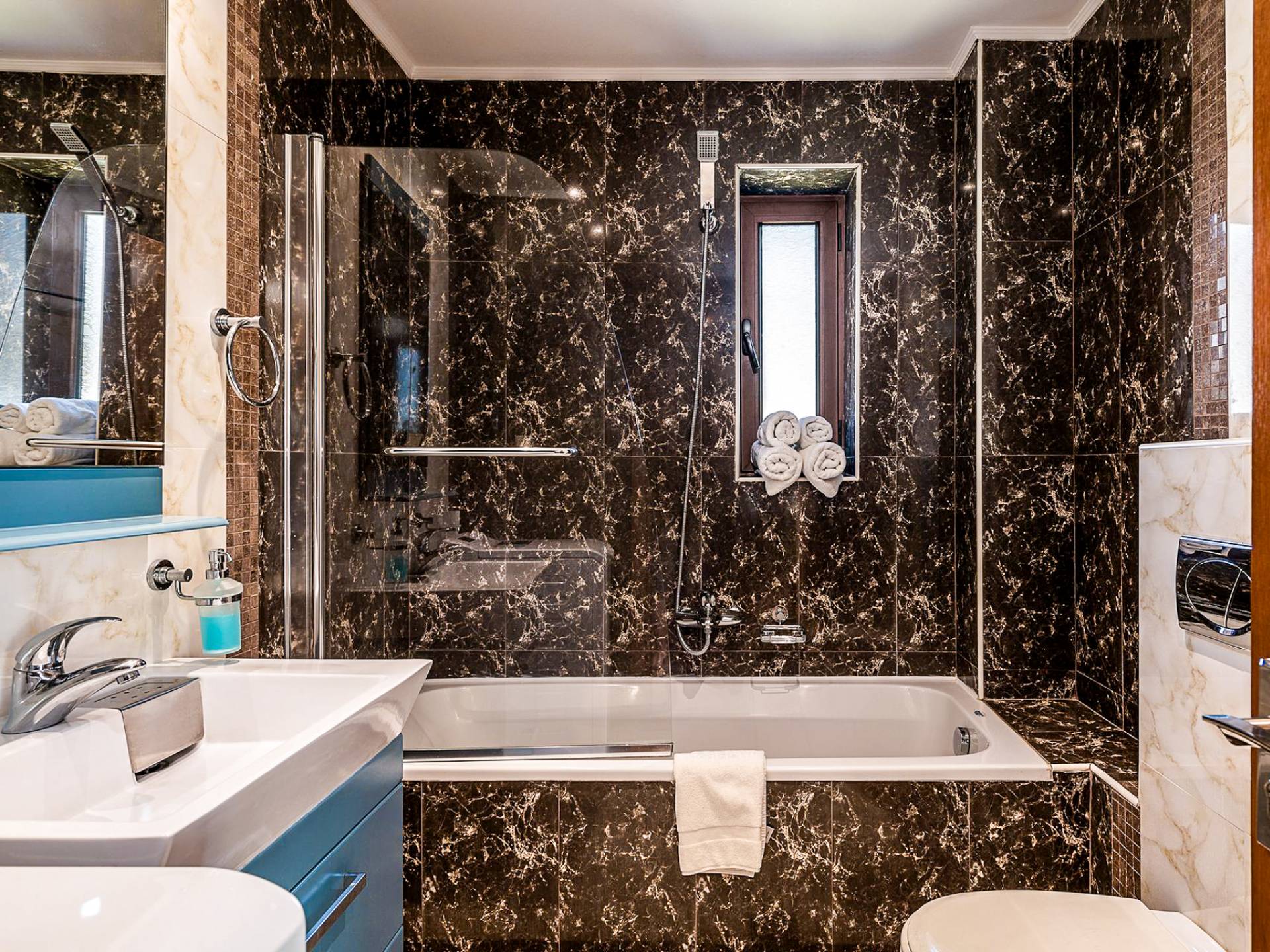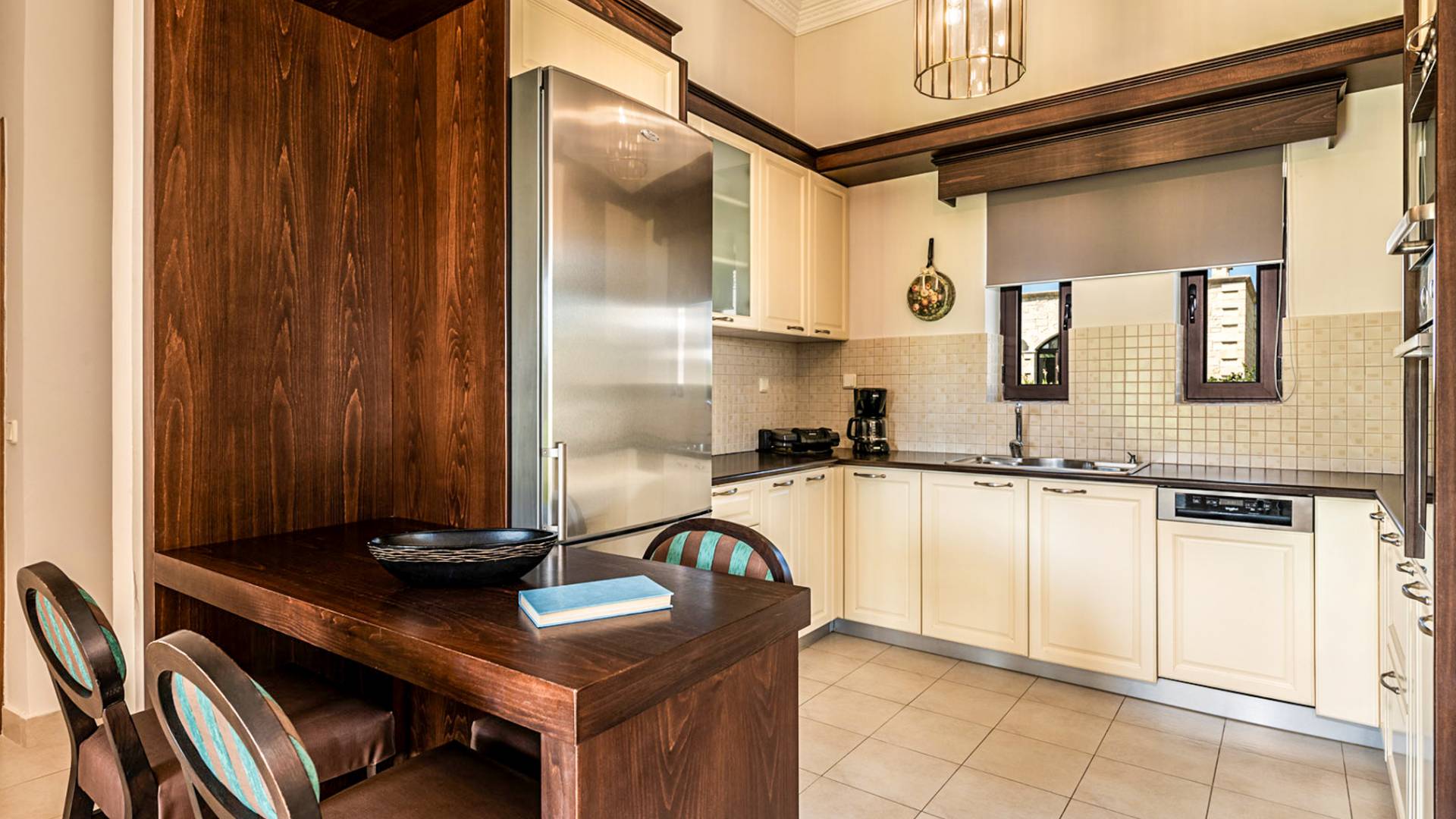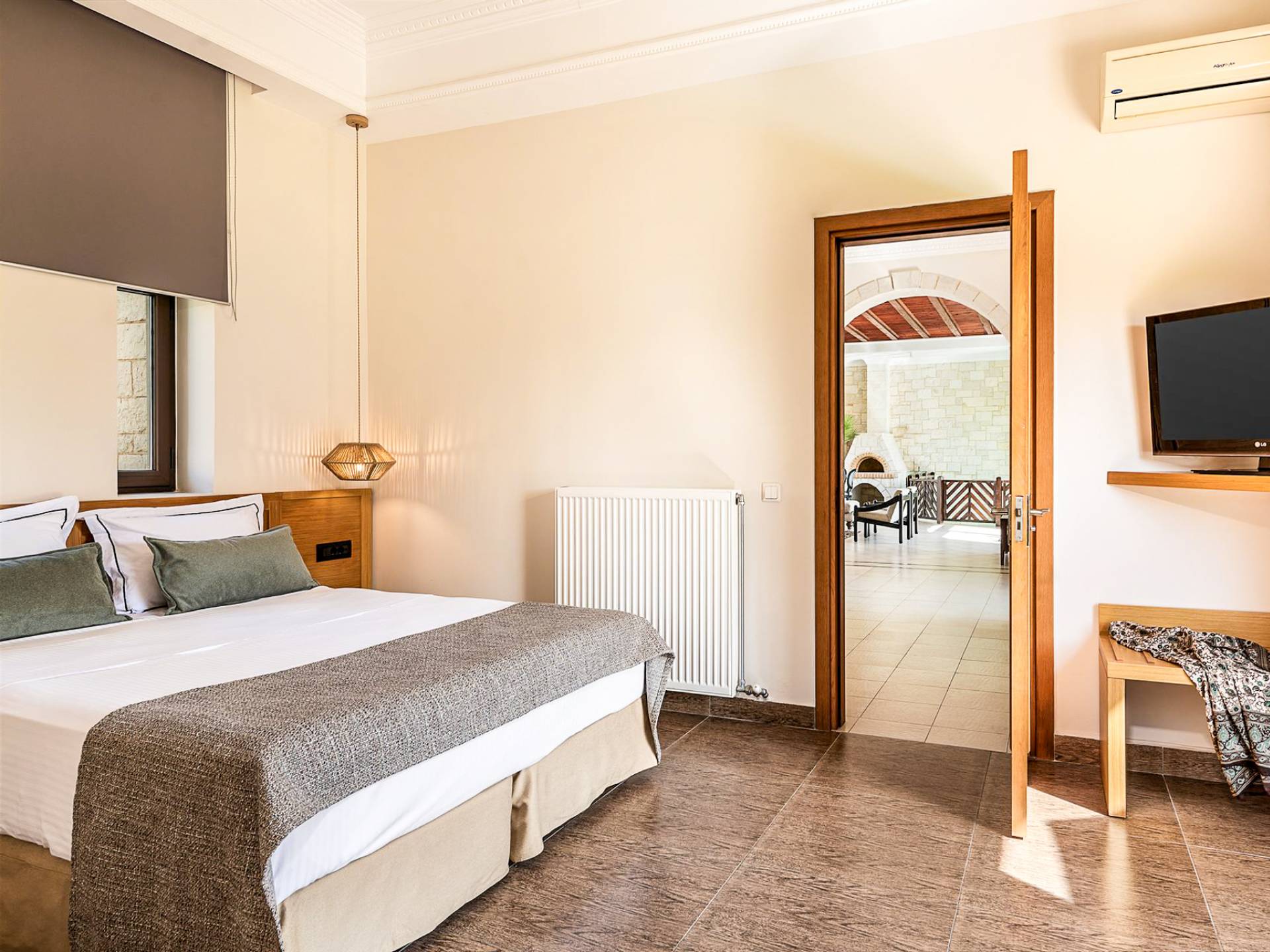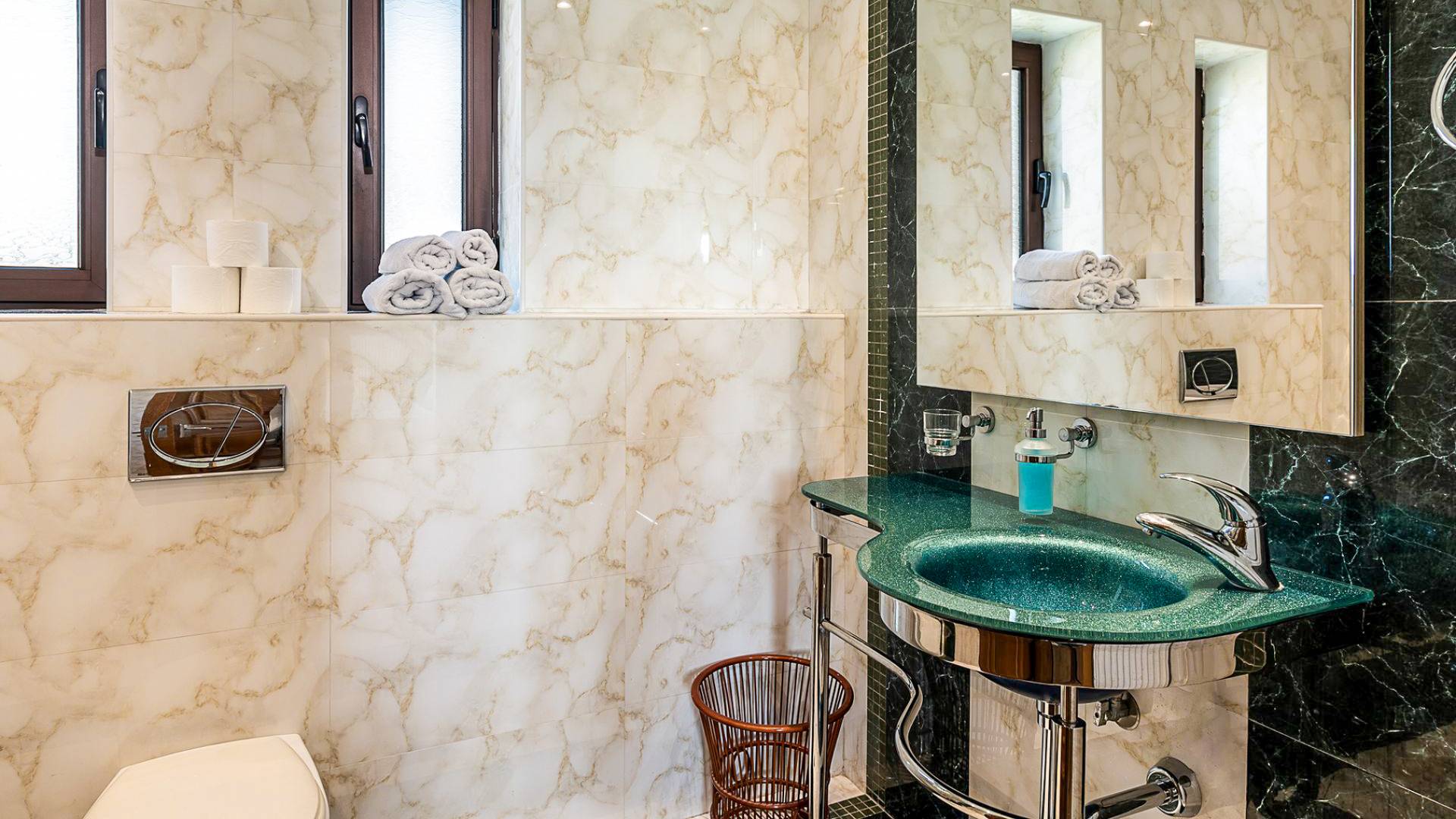 На первом этаже находится гостиная и обеденная зона открытой планировки с камином и принадлежностями для барбекю, которая сочетает в себе закрытый и открытый частные бассейны, обеспечивает все удобства и роскошь и создает поистине очаровательную атмосферу. На первом этаже находится спальня с двуспальной кроватью с ванной комнатой, туалет и дополнительная кровать. На втором этаже две спальни с двуспальными кроватями с ванными комнатами и просторные балконы с видом на чудесную сельскую местность. Во всех номерах есть 32-дюймовый телевизор с плоским экраном, кондиционер, центральное отопление, что делает виллу подходящей для проживания в течение всего года, садовую мебель, шезлонги и зонтики от солнца.