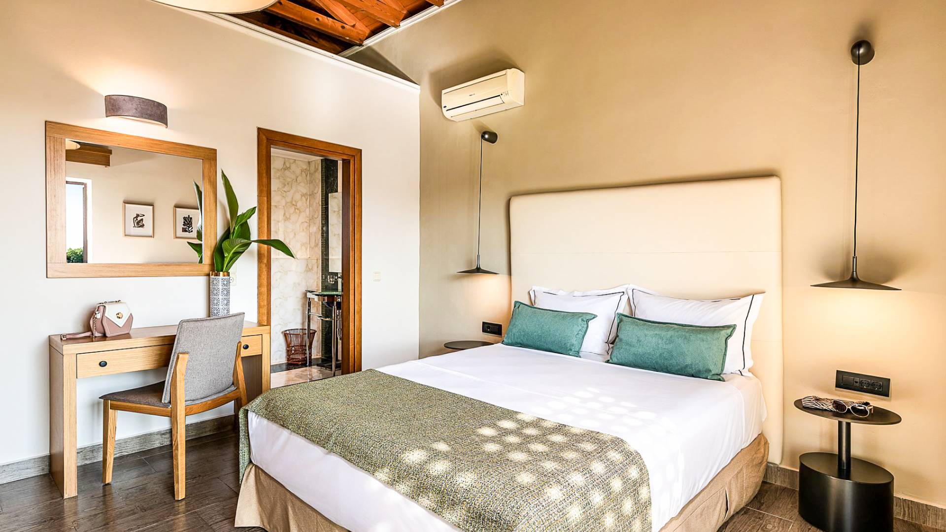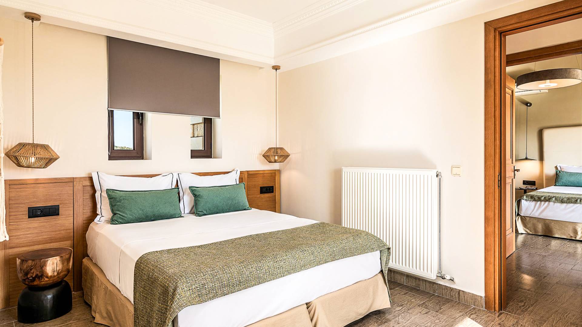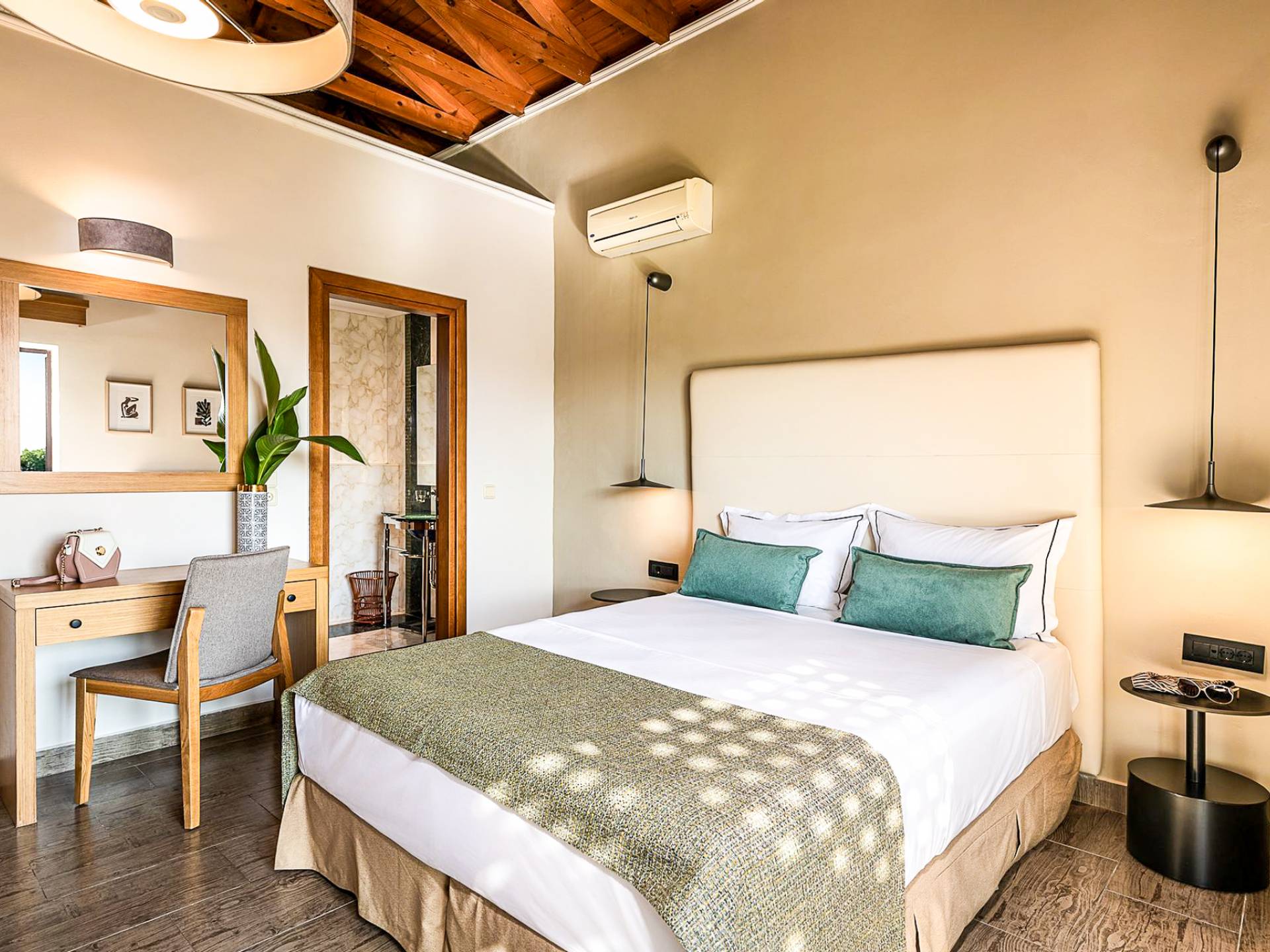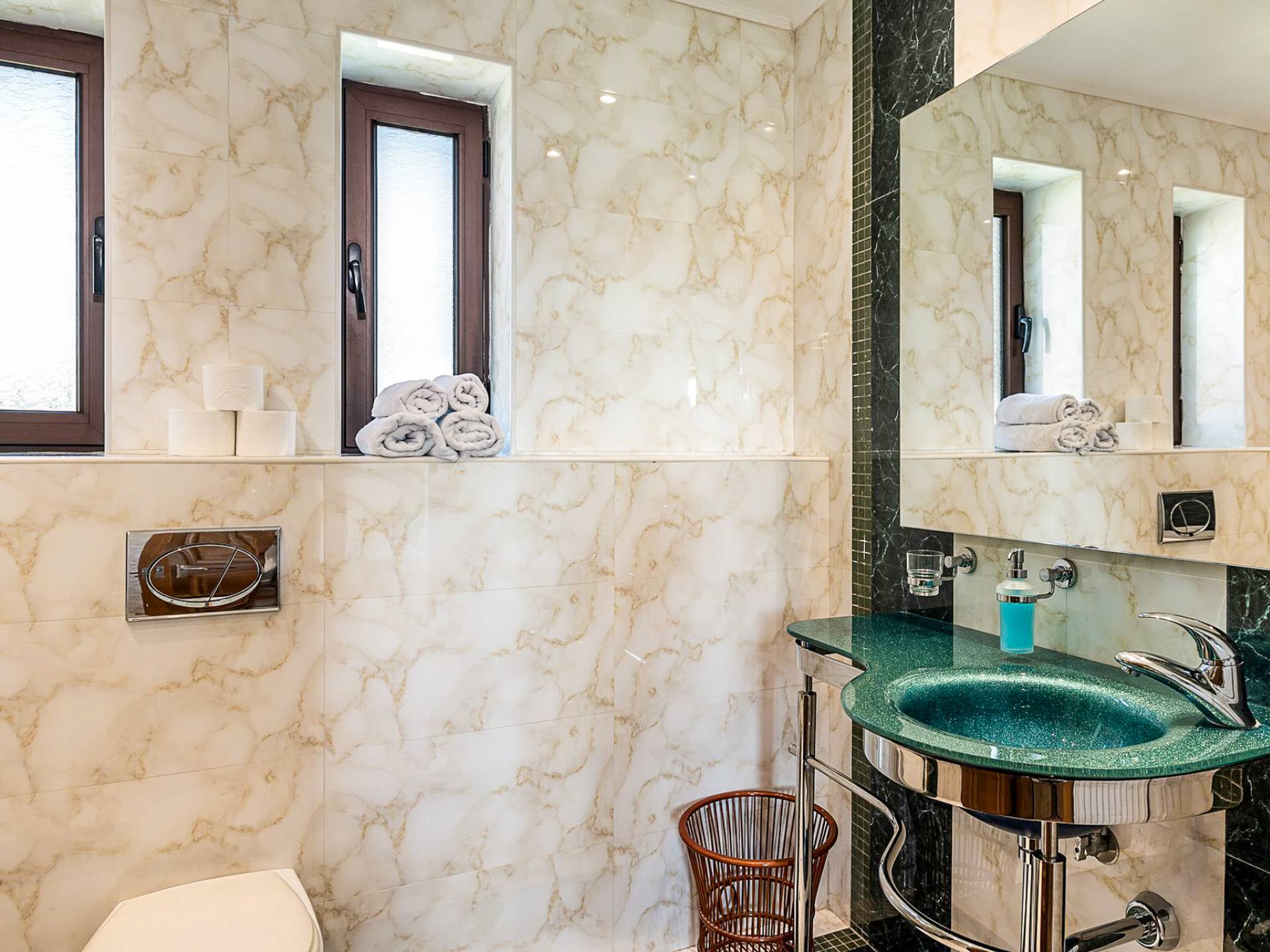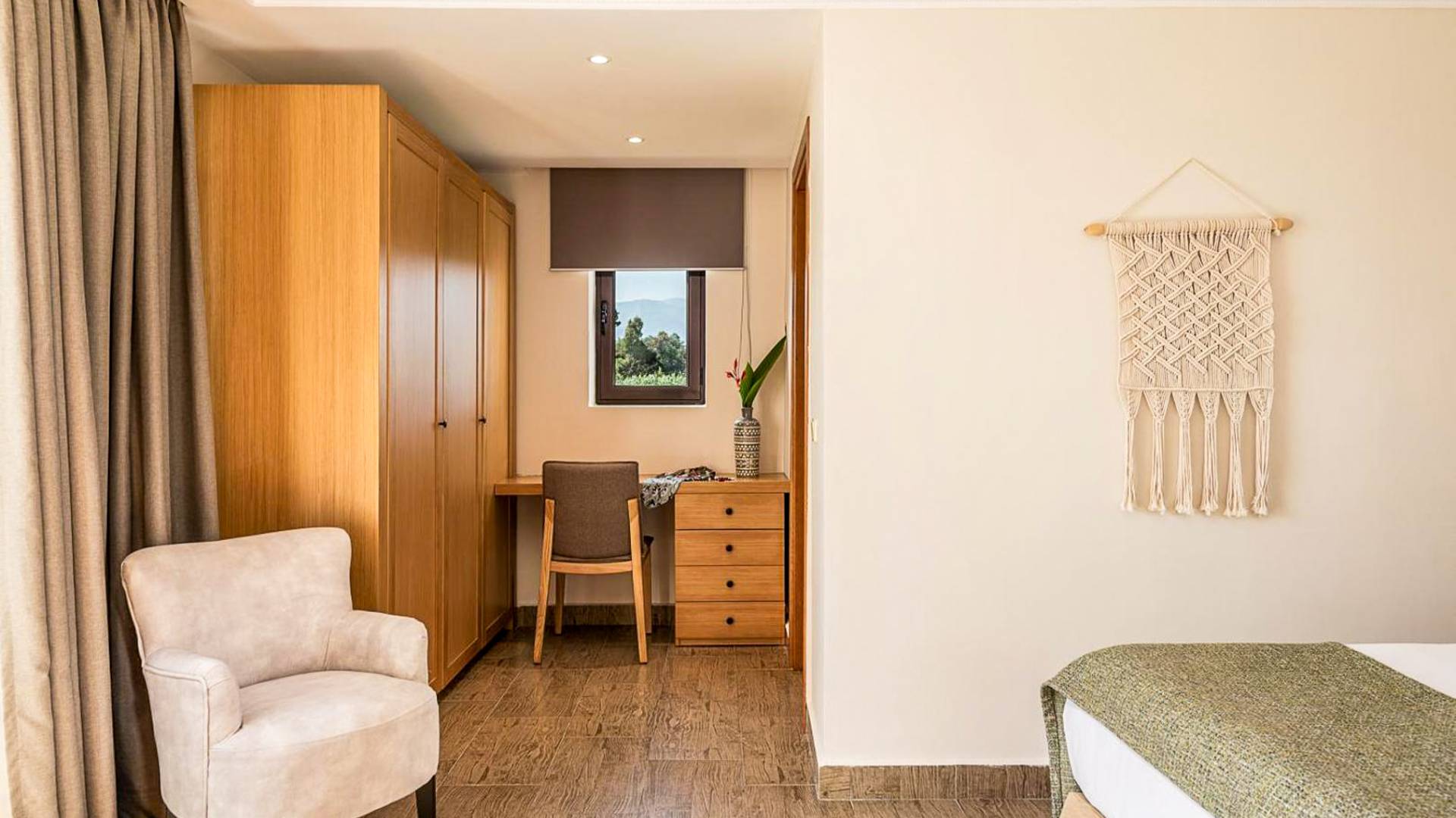 На первом этаже находится гостиная и обеденная зона открытой планировки с камином и принадлежностями для барбекю, которая сочетает в себе закрытый и открытый частные бассейны, обеспечивает все удобства и роскошь и создает поистине очаровательную атмосферу. На первом этаже находится спальня с двуспальной кроватью с ванной комнатой, туалет и дополнительная кровать. На втором этаже две спальни с двуспальными кроватями с ванными комнатами и просторные балконы с видом на чудесную сельскую местность. Во всех номерах есть 32-дюймовый телевизор с плоским экраном, кондиционер, центральное отопление, что делает виллу подходящей для проживания в течение всего года, садовую мебель, шезлонги и зонтики от солнца.