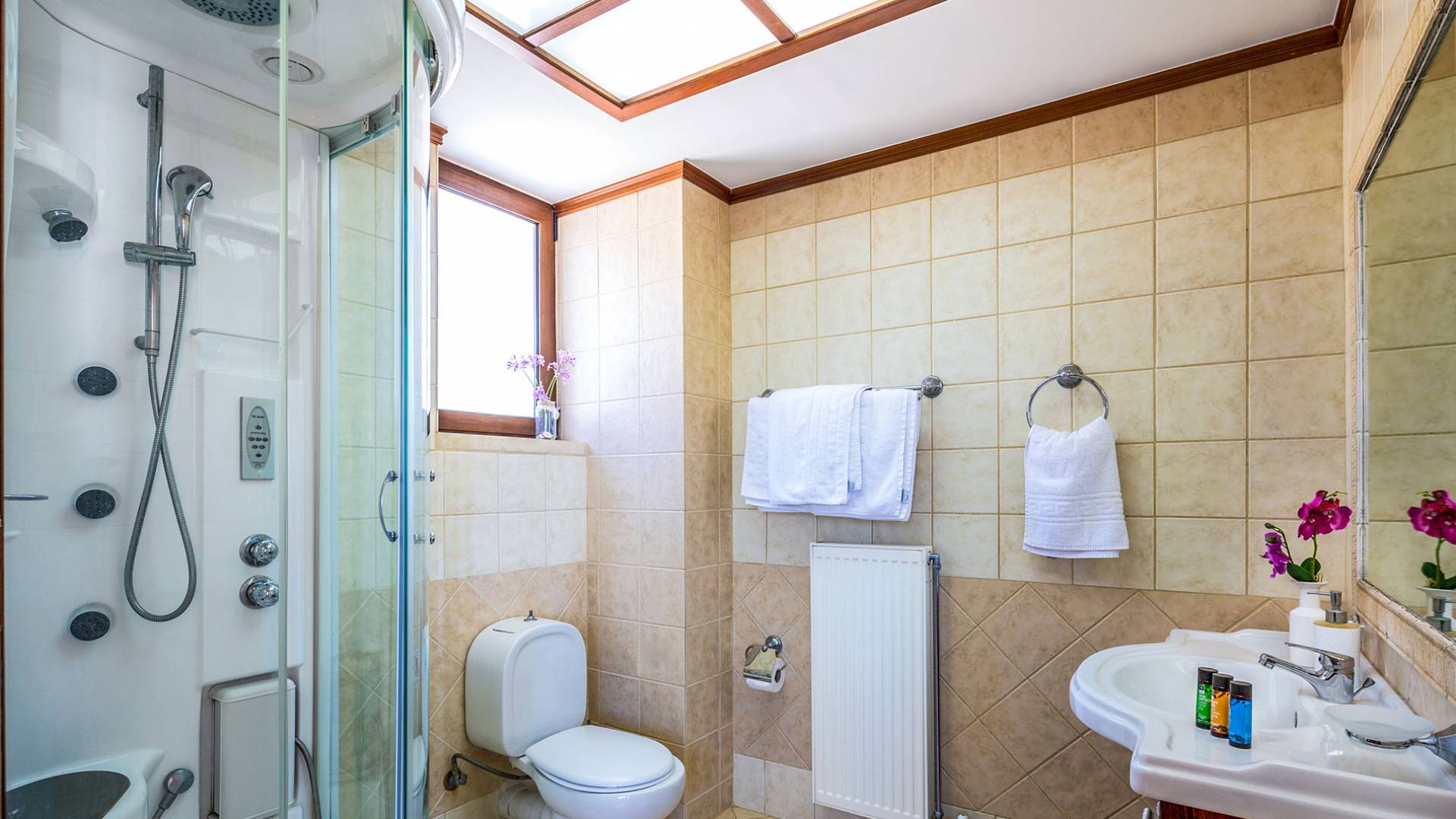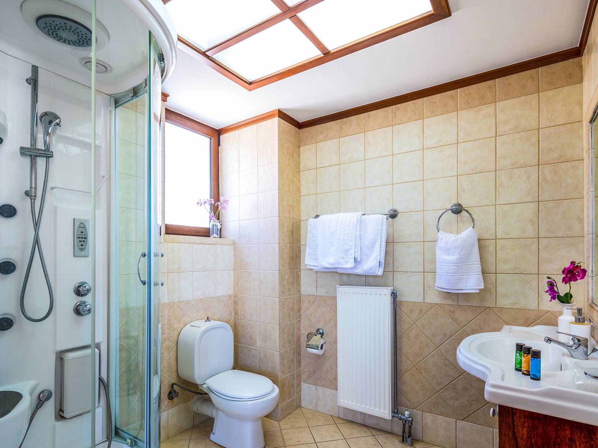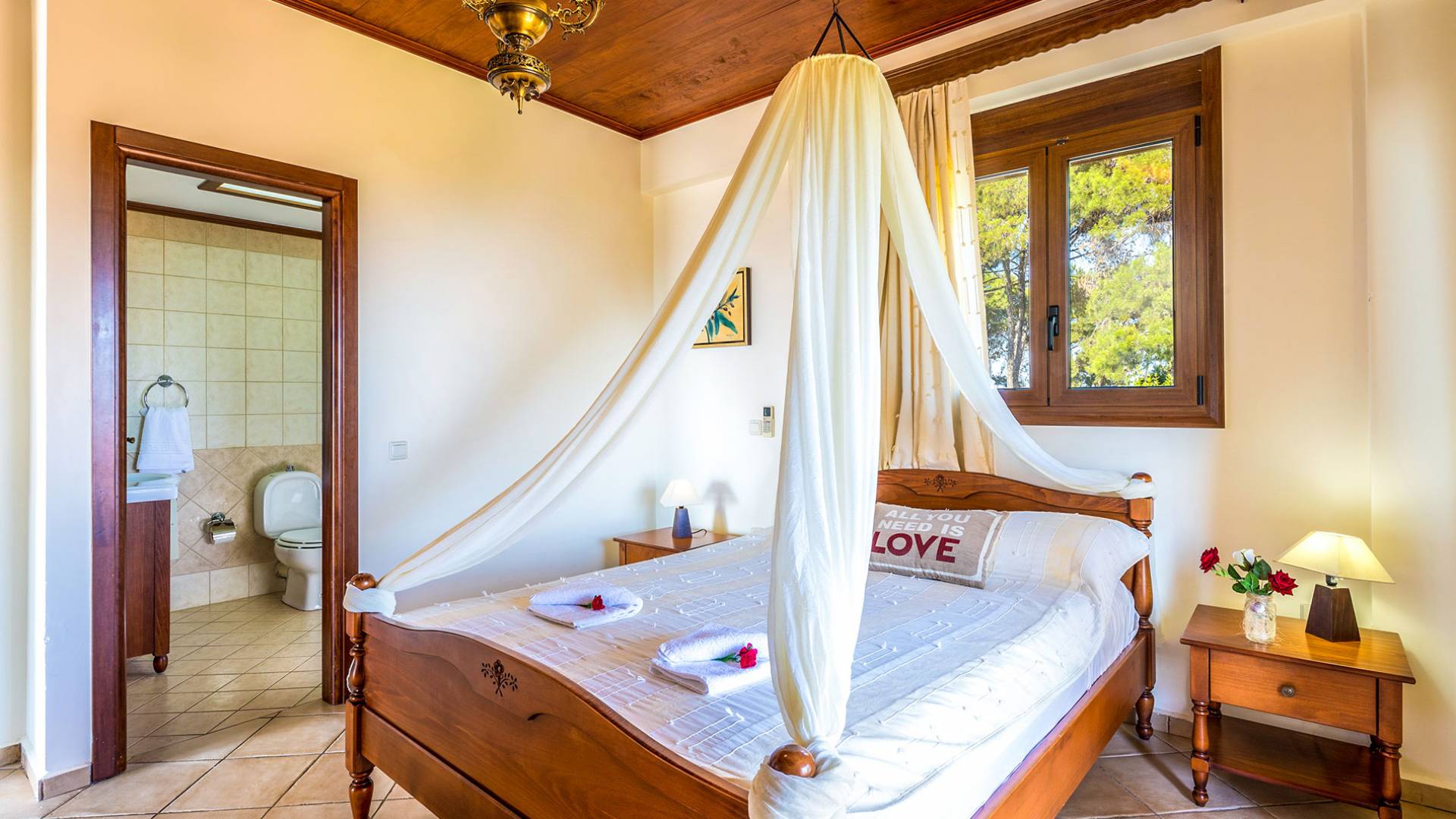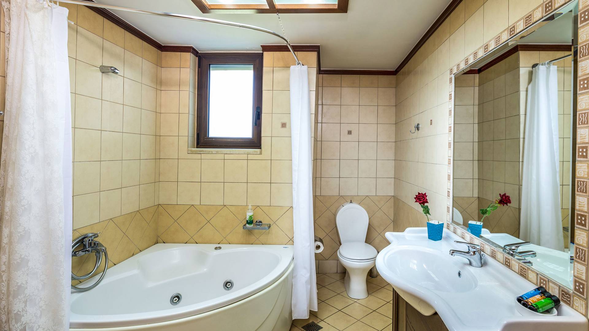 Из центрального входа гостиная с 2 диванами и журнальным столиком ведет на первый этаж виллы. В гостиной вы найдете плазменный телевизор со спутниковыми каналами, DVD-плеер, стерео-проигрыватель компакт-дисков и большой камин. Соединенная с гостиной, кухня оснащена всеми современными удобствами. Там же находится обеденный стол с 8 стульями и камин в углу. Панорамным видом на ландшафт от высоких гор до синего моря можно наслаждаться как с обеденного стола, так и с диванной группы и балкона. Вилла Iris состоит из 4 спален: две с двуспальными кроватями, одна с 3 односпальными кроватями и одна с 2 односпальными кроватями, все с ванными комнатами, телевизором, DVD и гидромассажной ванной или душем.