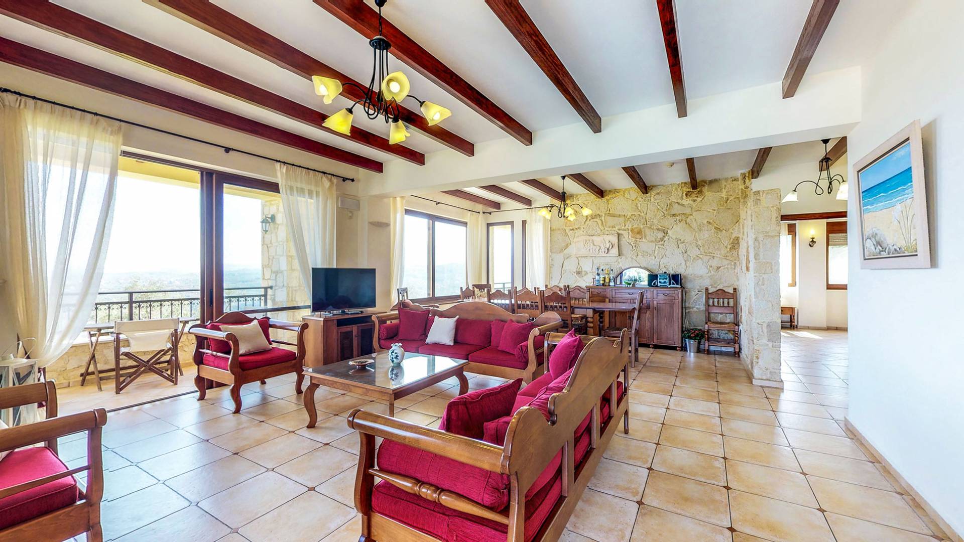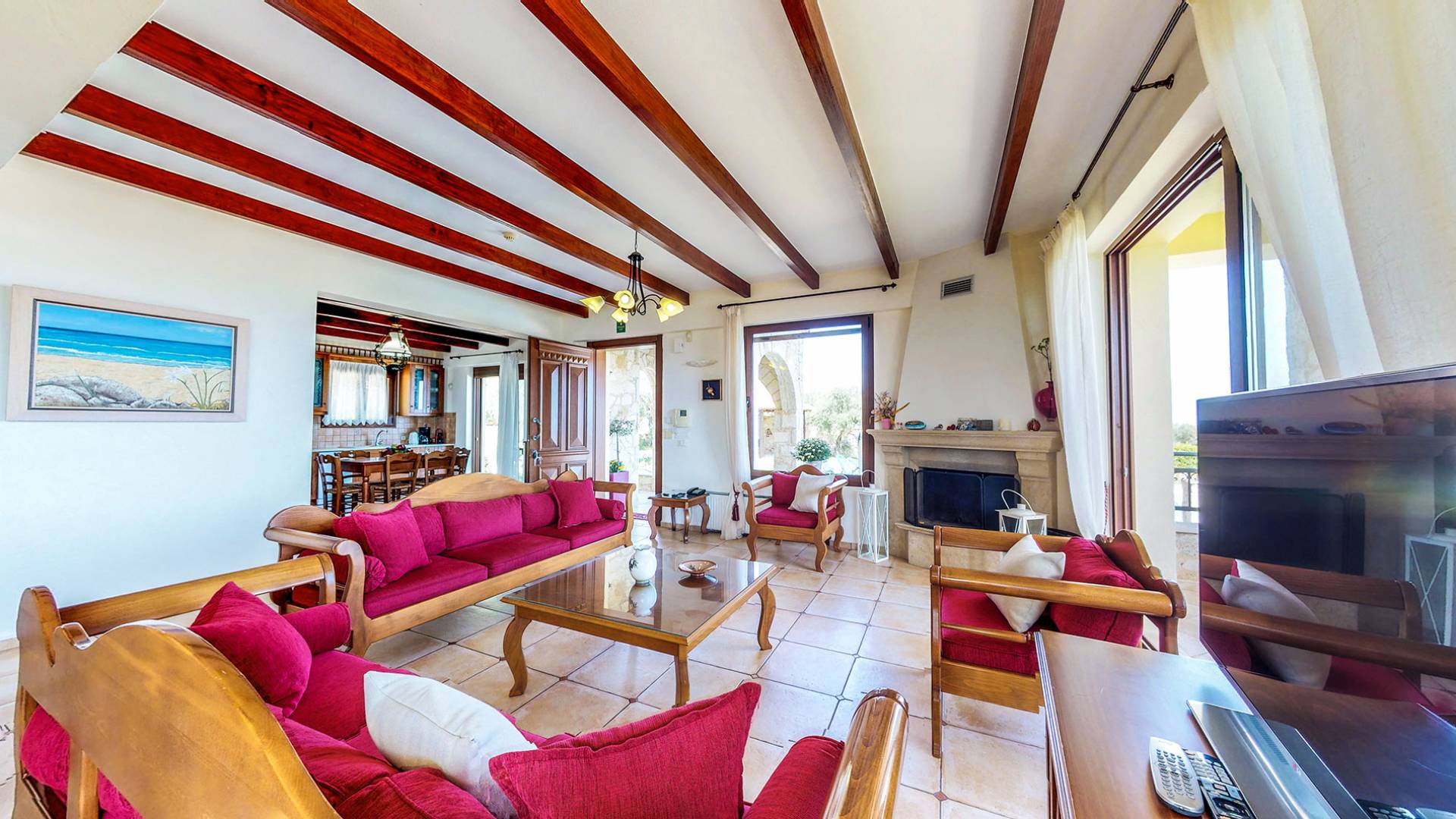 Пройдя через ворота главного входа на виллу, вы попадаете в благоустроенную гостиную открытой планировки с Г-образной кухней. Справа находится современная кухня из дерева, цветовая обработка, пики на потолке и красивое освещение над ними придают комнате приятную и уютную атмосферу. Рядом со столовой с 10 стульями в гостиной с захватывающим видом на море и горы, оттуда на один из 2 диванов или удобное кресло вы можете наблюдать за всеми пейзажами и дневным светом. Редко можно увидеть стервятника, летящего над холмом. В гостиной также есть 32-дюймовый плазменный телевизор, DVD-плеер и стерео-проигрыватель компакт-дисков, а также большой камин в углу. На этом этаже расположены 2 спальни, одна с 2 односпальными кроватями и ванная комната с джакузи, а другая с двуспальной кроватью. кровать, с гидромассажной ванной, ТВ и DVD.