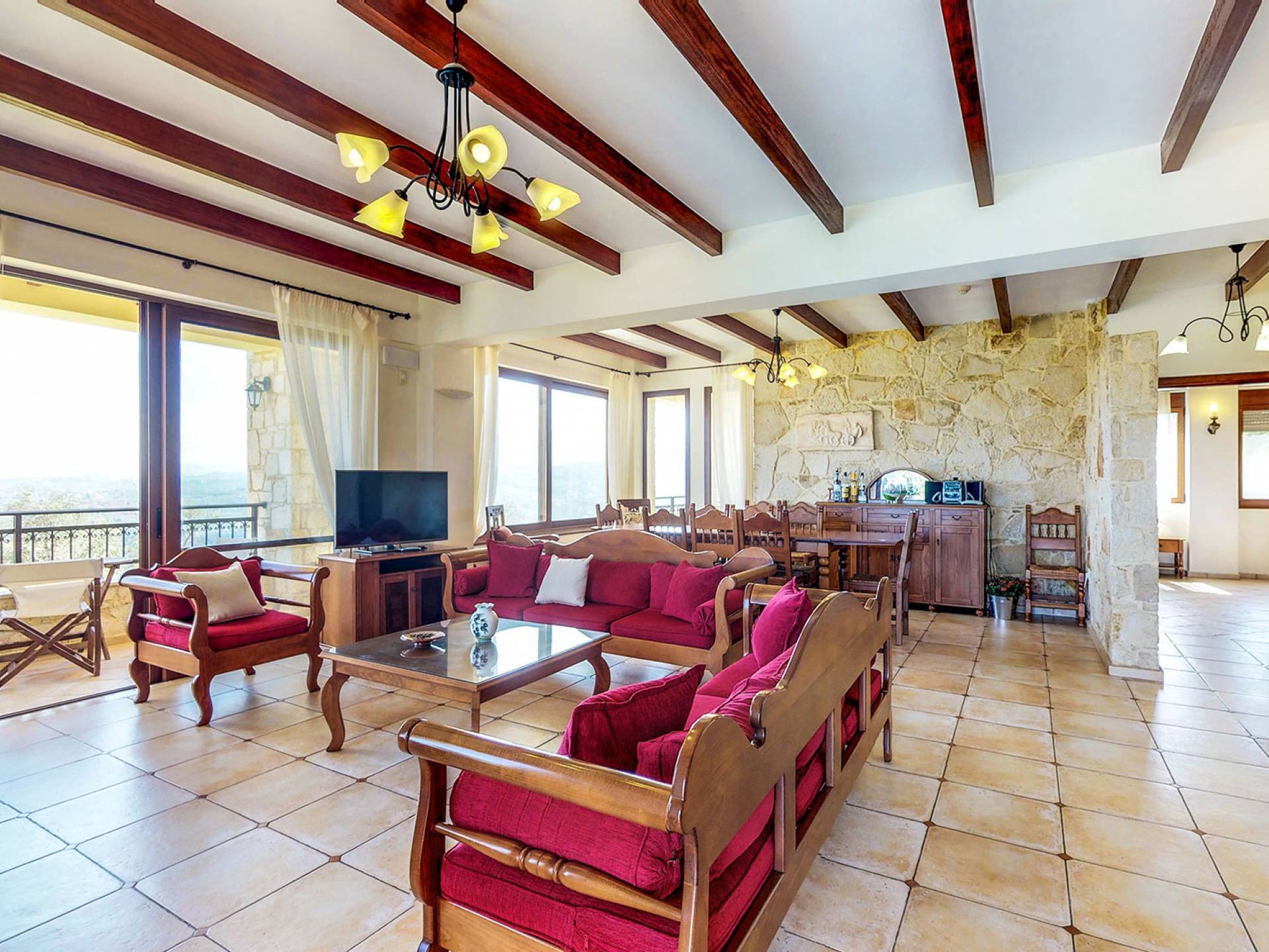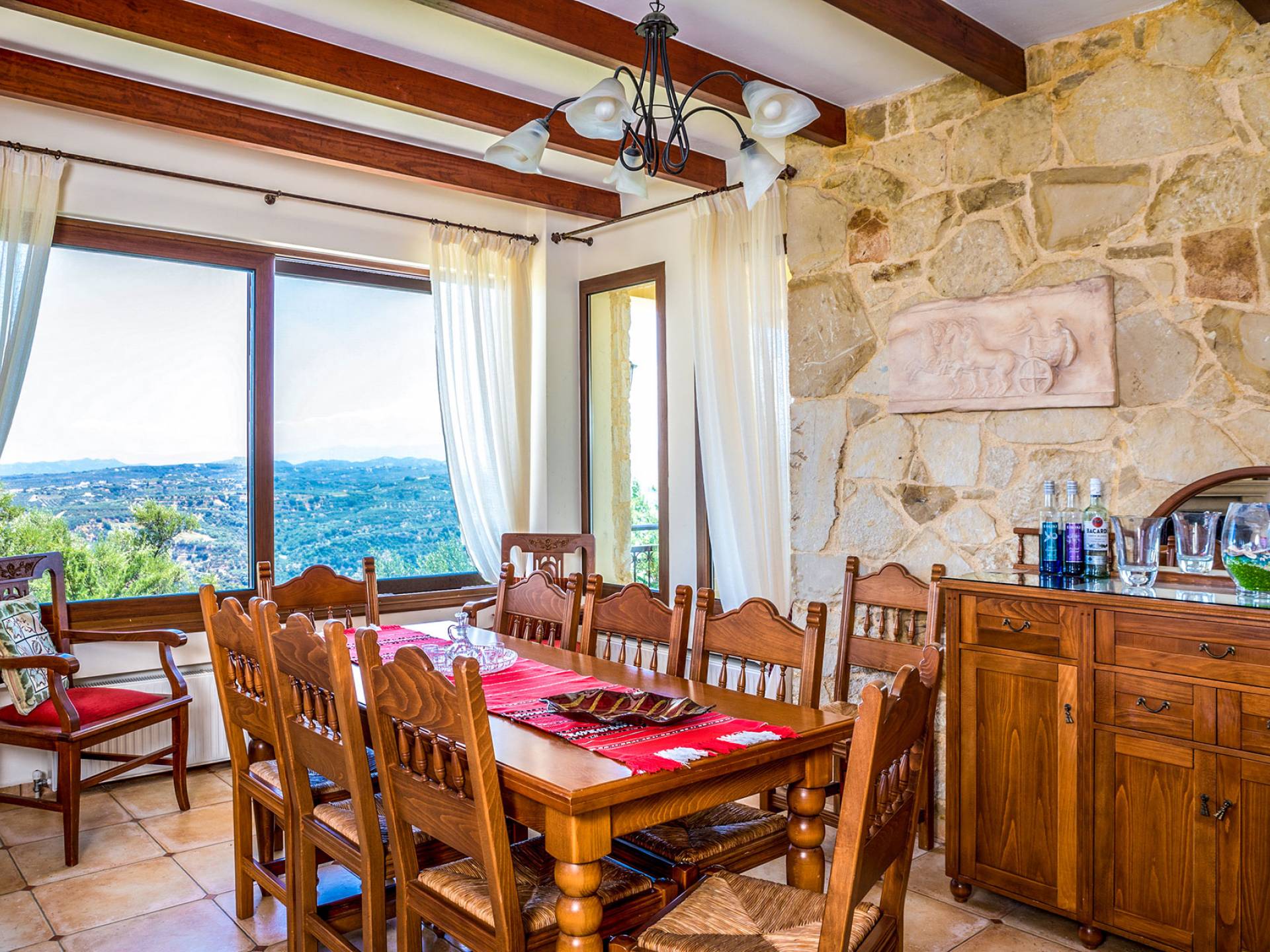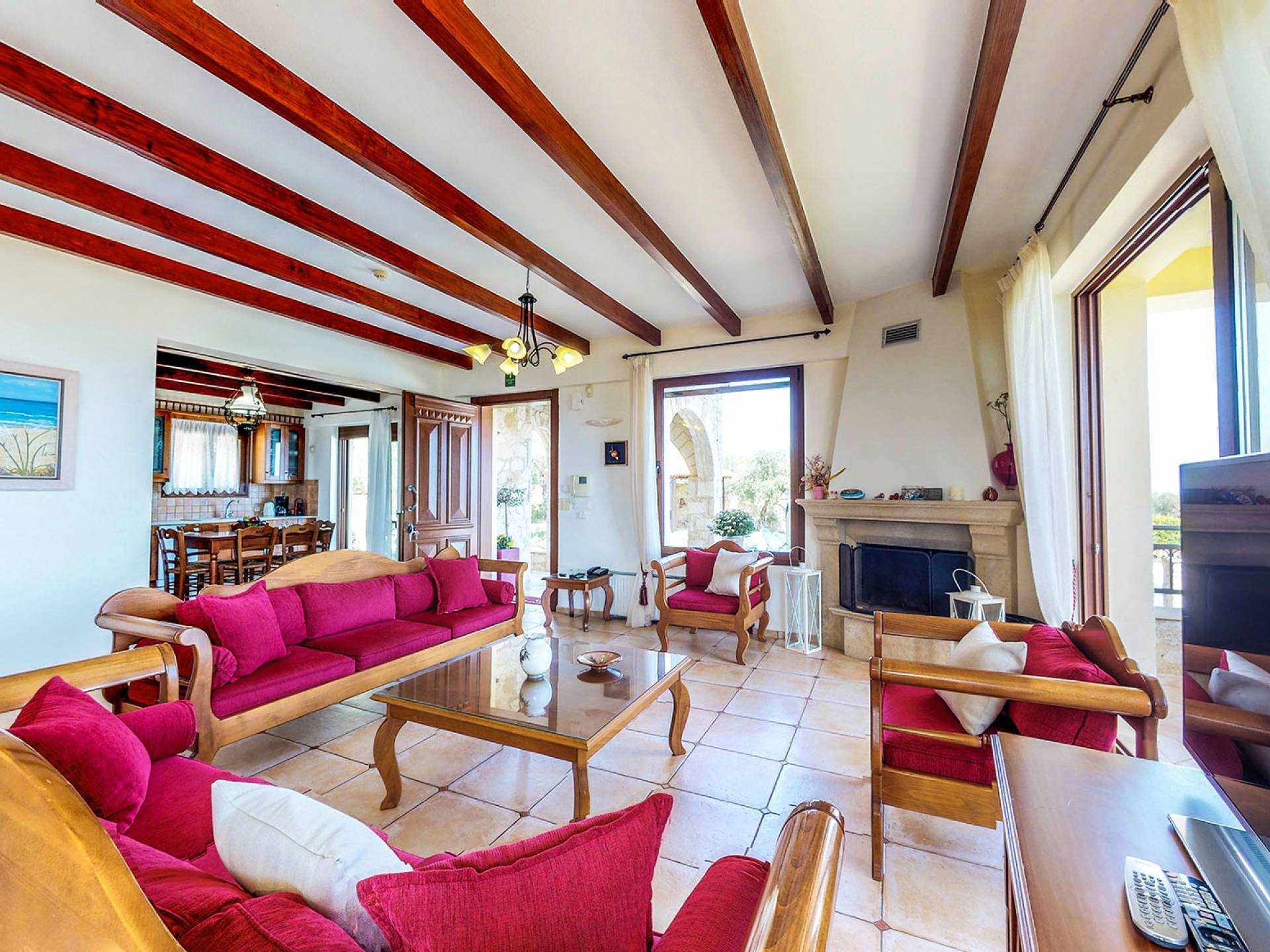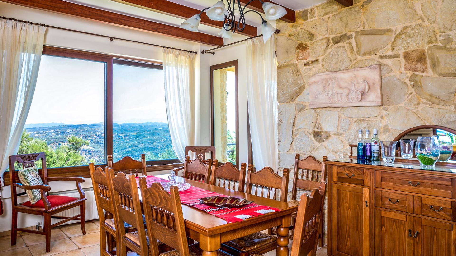 Главный вход с верандой ведет в просторную гостиную открытой планировки в форме L с большим камином в углу, с 2 диванами и креслами вокруг большого журнального столика. За гостиной находится формальная столовая, а с одной стороны - хорошо оборудованная кухня с дополнительным обеденным столом и стульями. С одной стороны кухни - гостевой туалет, в котором также есть стиральная машина. Рядом находится вход в лифт, откуда можно легко добраться до всех уровней виллы Ermis Chania, что также делает ее очень удобной для инвалидов-колясочников.