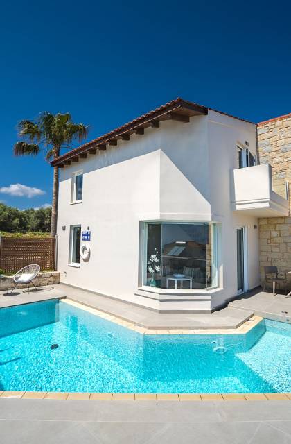 Виллы площадью 65 квадратных метров вмещают до 3 гостей. На первом этаже есть полностью оборудованная кухня, ведущая в открытую гостиную с диваном-кроватью и ванной, а также собственный сад и бассейн. С балкона и из сада открывается фантастический вид на море.