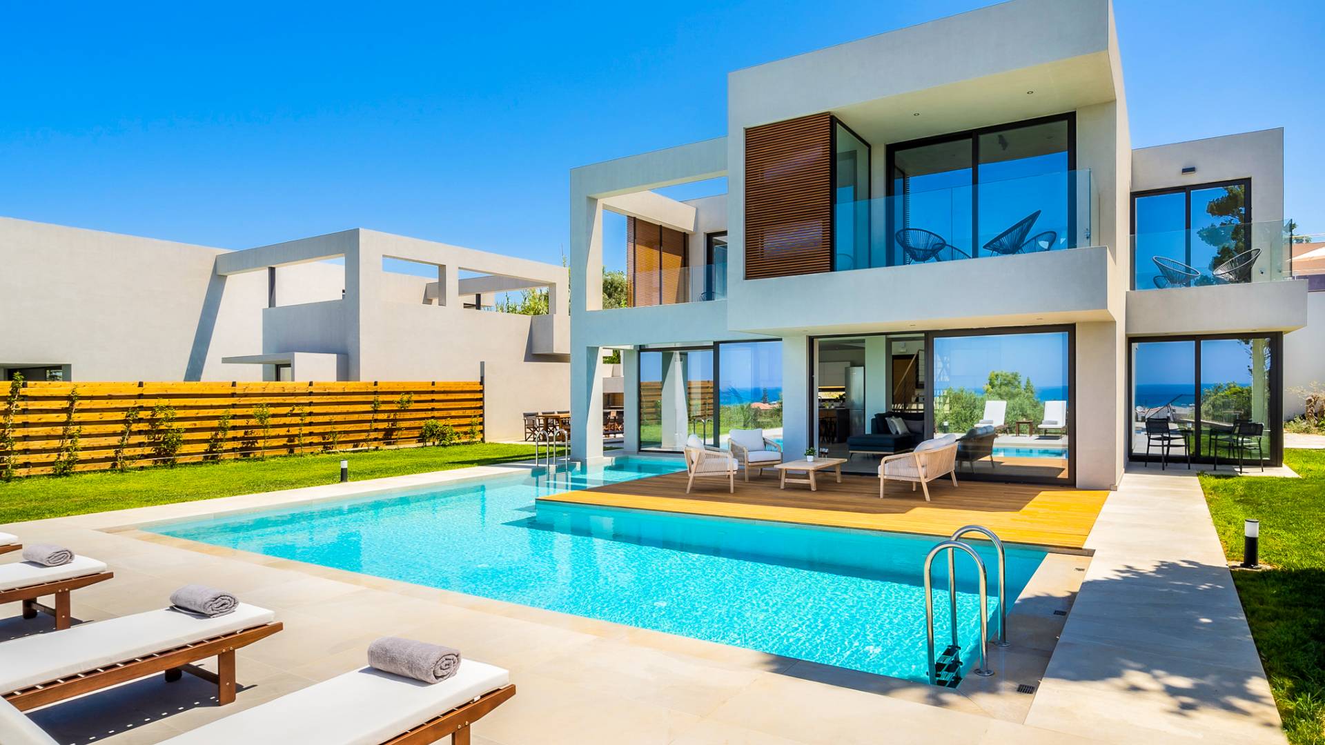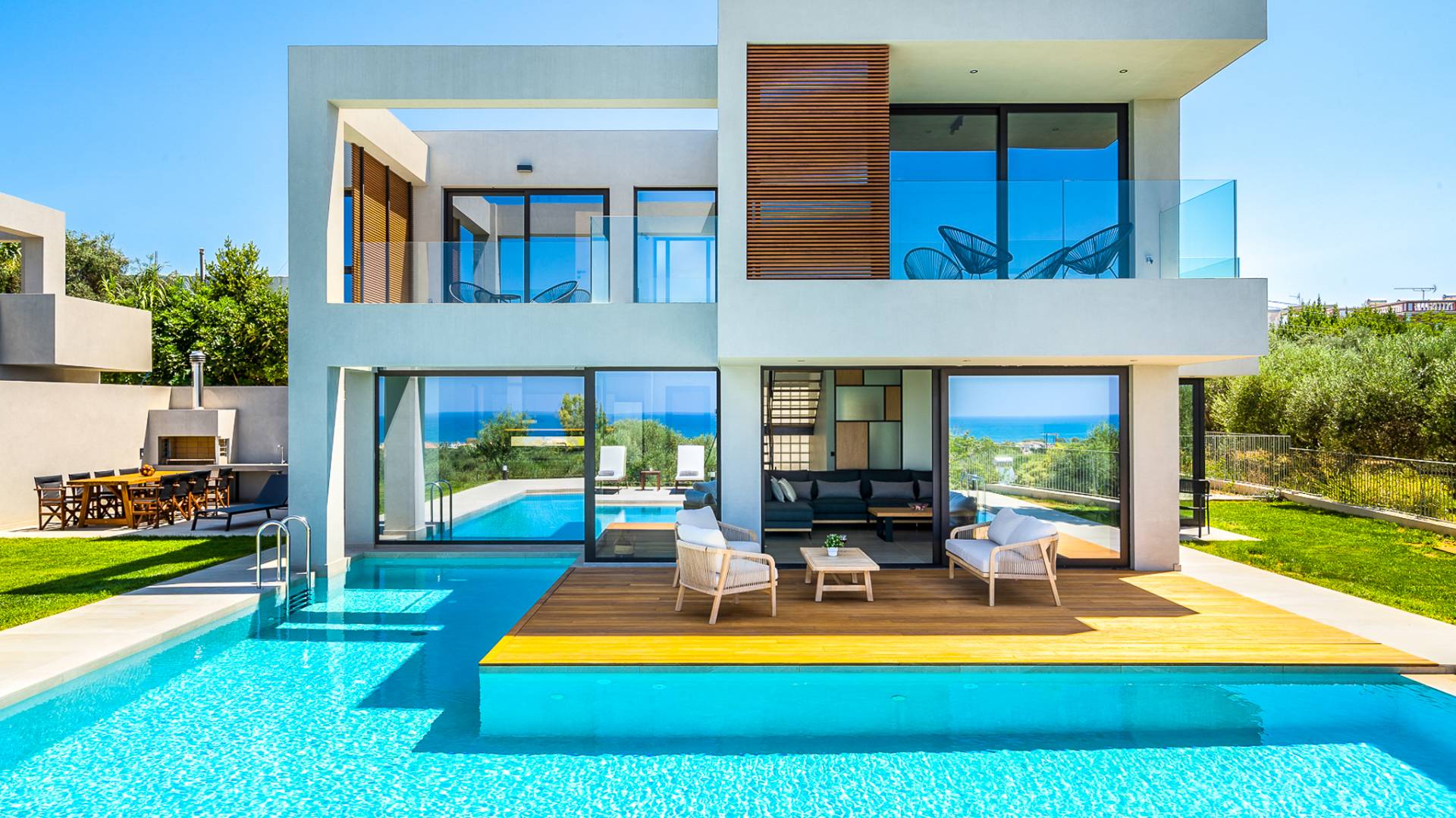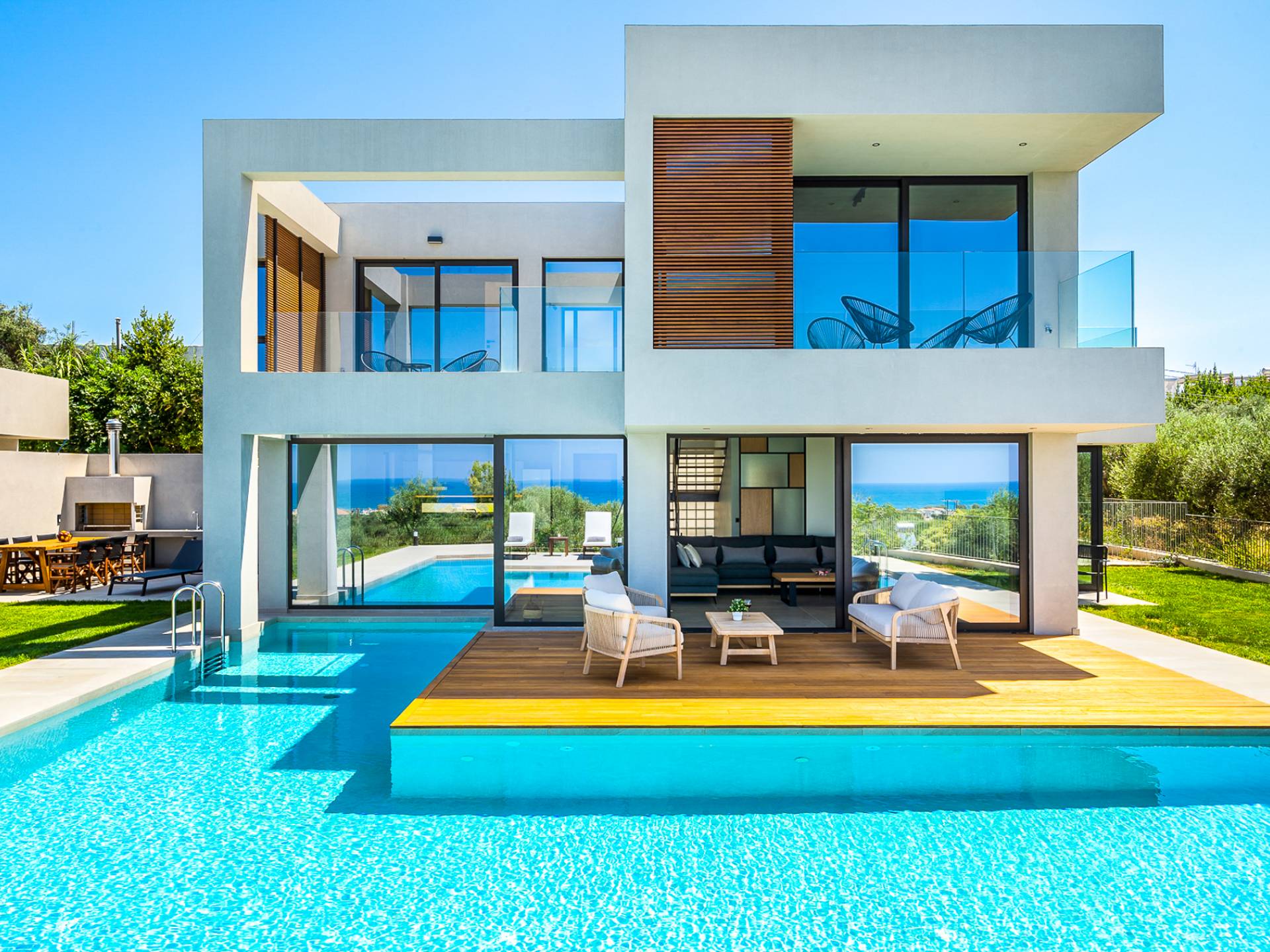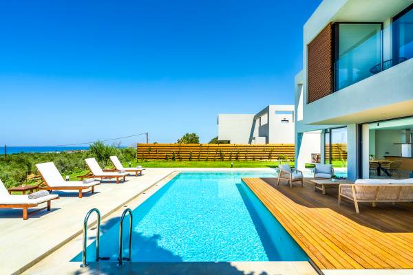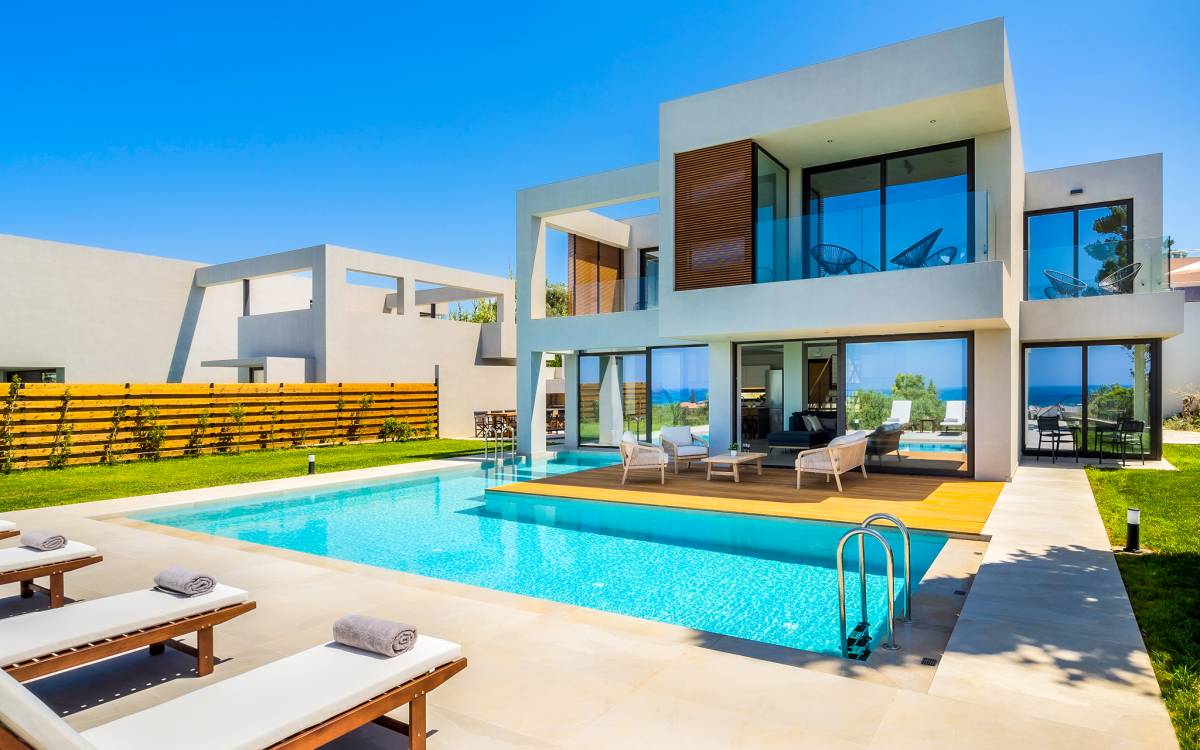 Дом площадью 250 кв.м. Вилла может похвастаться 4 спальнями с ванными комнатами, в которых могут разместиться 8 гостей. Выйдя на подъездную дорогу, можно увидеть, что Nea Villa 2 Crete — вторая из двух дошедших до нас вилл. Яркий кубический дизайн и стена со стеклянными панелями создают невероятный прием на божественной вилле. Каждая деталь используется для создания ощущения простора и простоты: от огромных стеклянных панелей до открытой лестницы. Чистые линии, успокаивающие тона и дерево приглашают вас в большое жилое пространство открытой планировки.