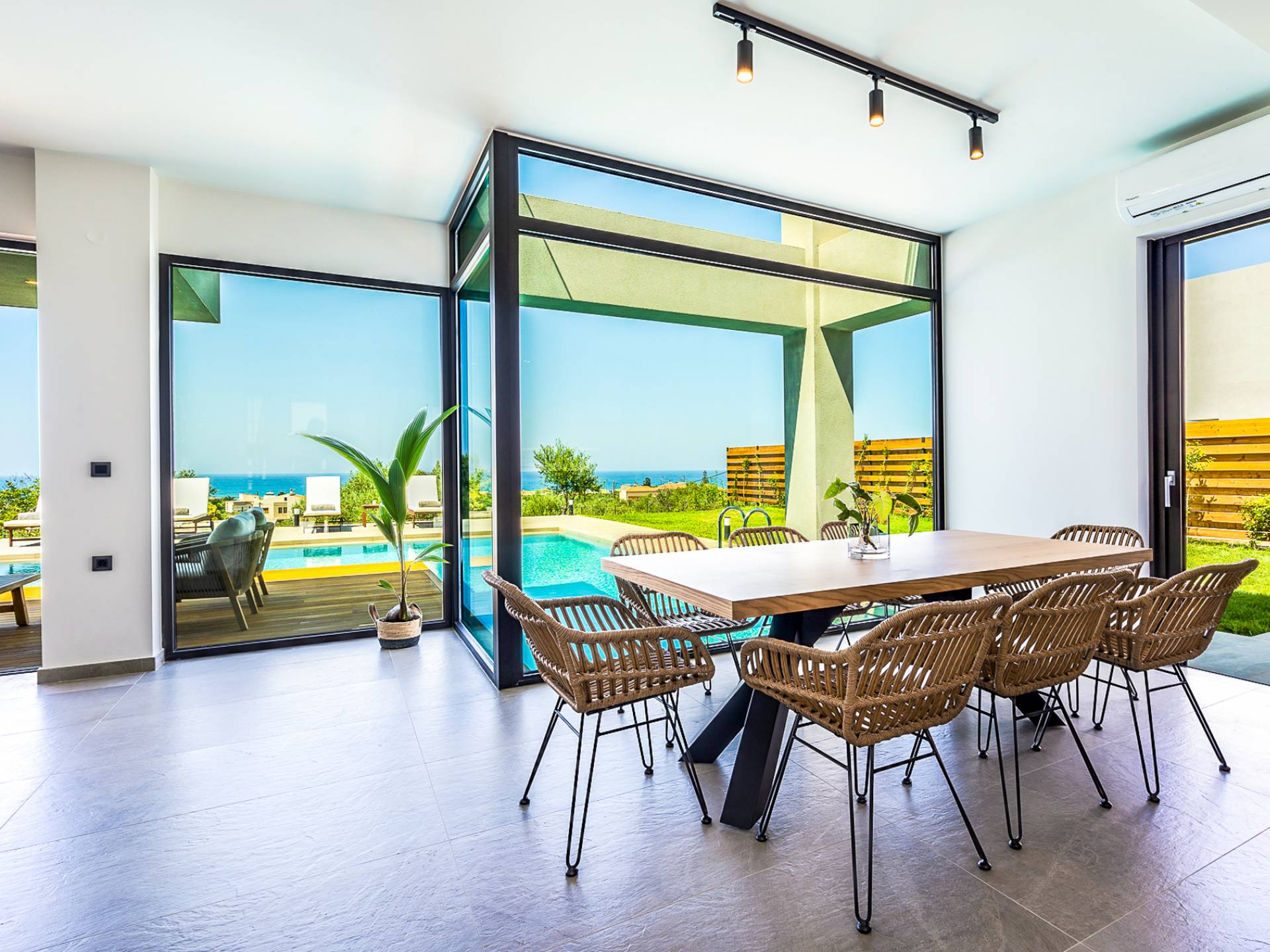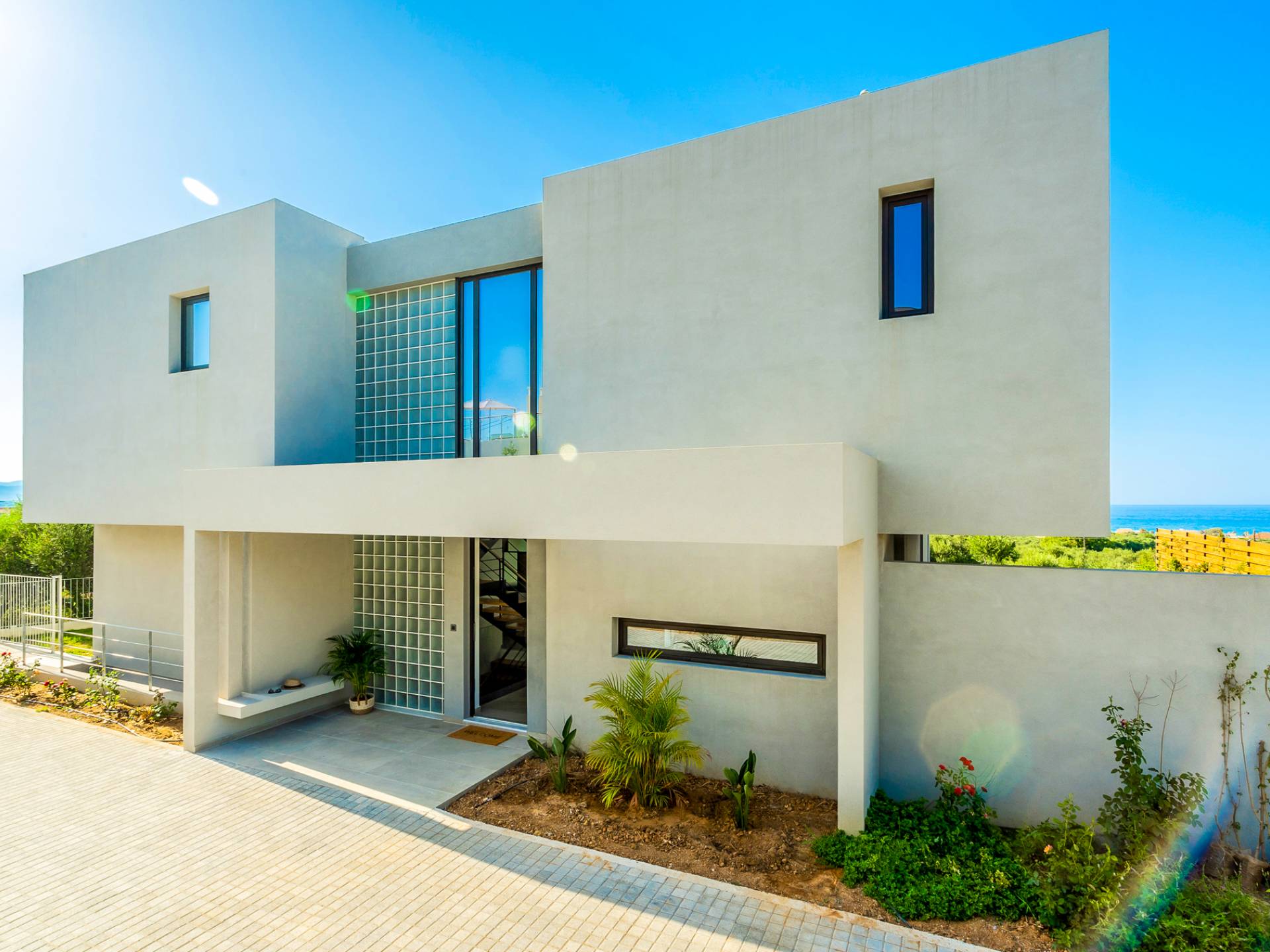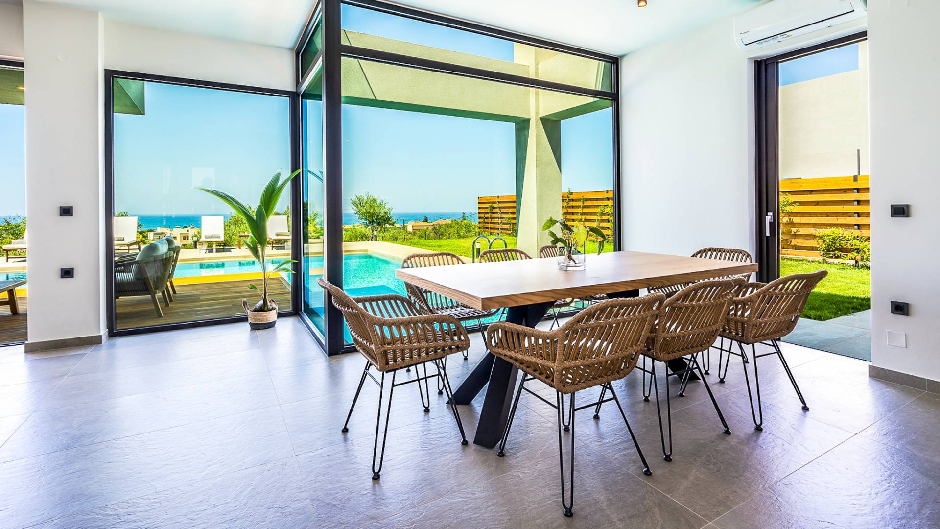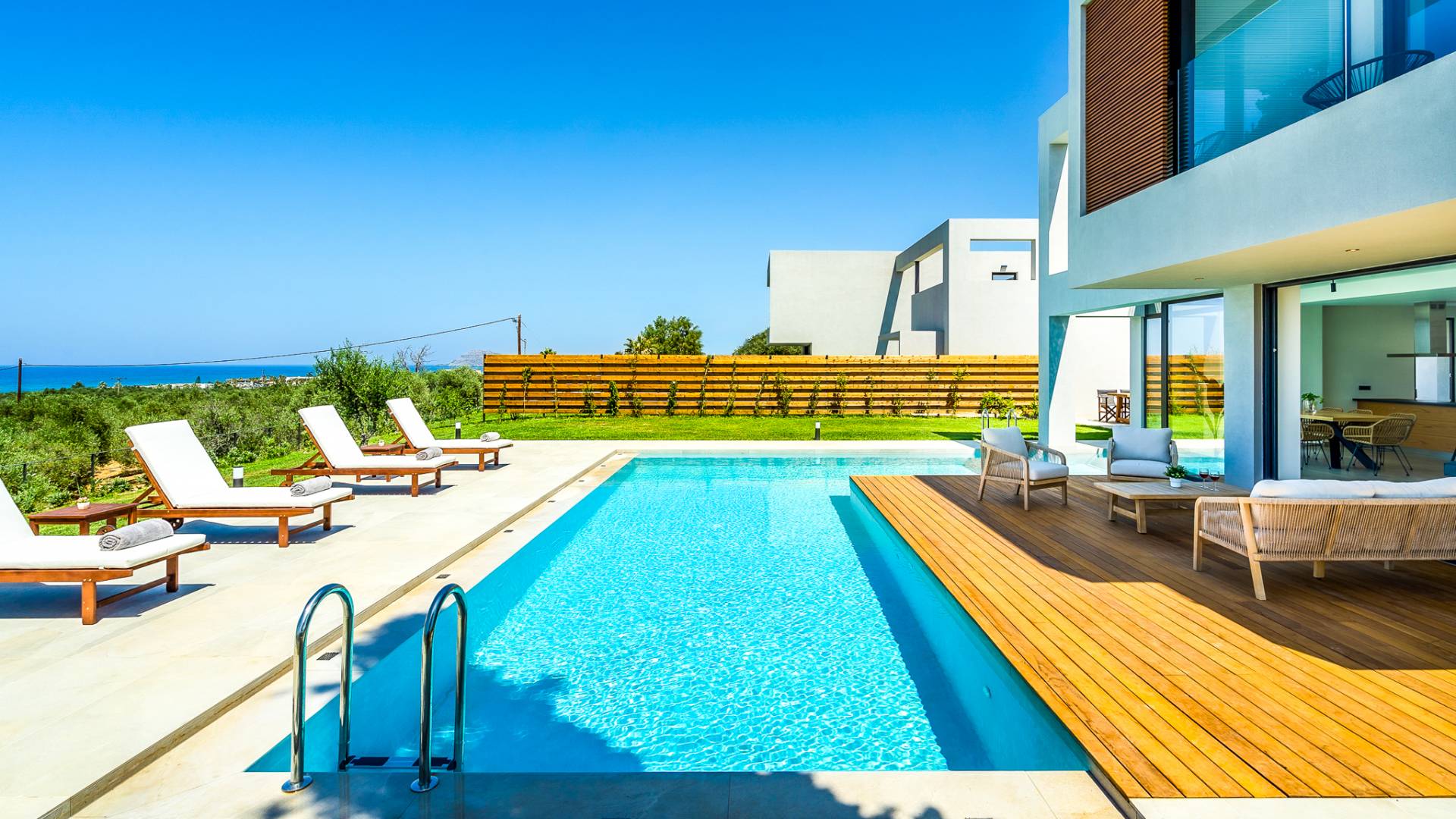 Дом площадью 250 кв.м. Вилла может похвастаться 4 спальнями с ванными комнатами, в которых могут разместиться 8 гостей. Выйдя на подъездную дорогу, можно увидеть, что Nea Villa 2 Crete — вторая из двух дошедших до нас вилл. Яркий кубический дизайн и стена со стеклянными панелями создают невероятный прием на божественной вилле. Каждая деталь используется для создания ощущения простора и простоты: от огромных стеклянных панелей до открытой лестницы. Чистые линии, успокаивающие тона и дерево приглашают вас в большое жилое пространство открытой планировки.
