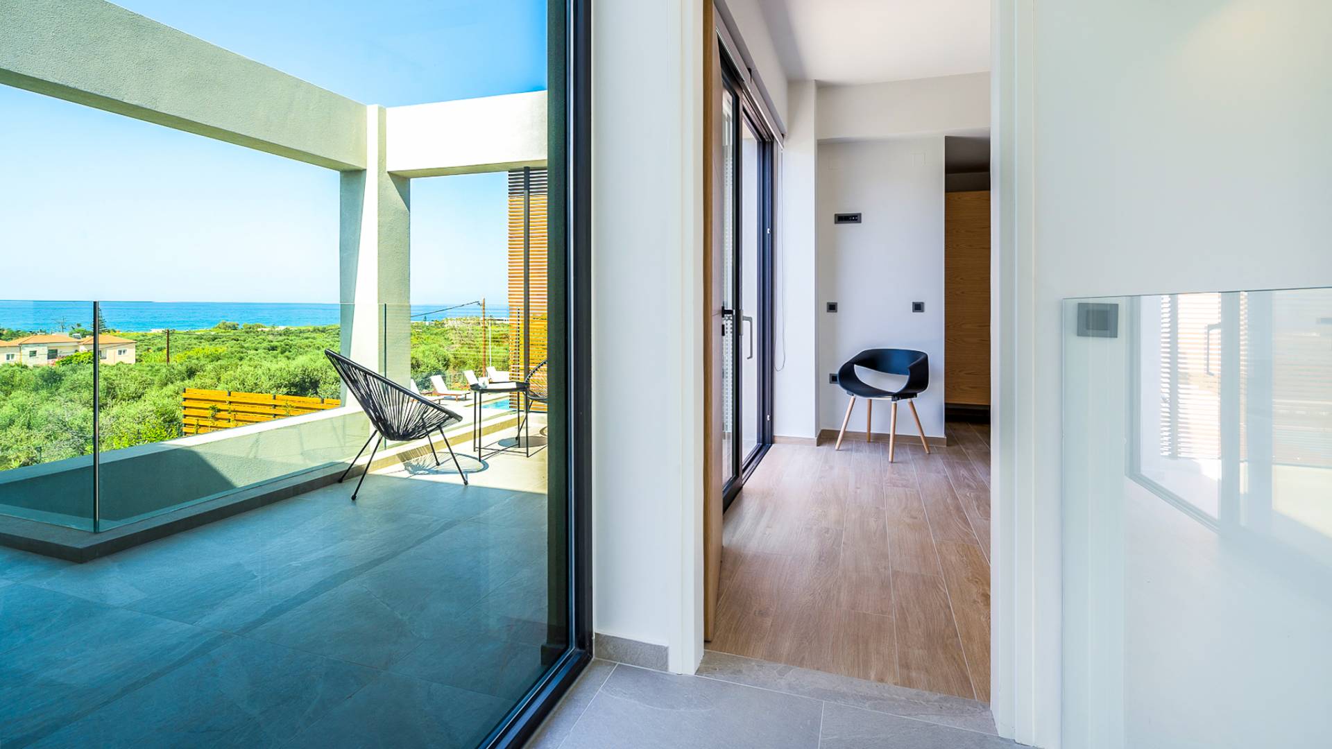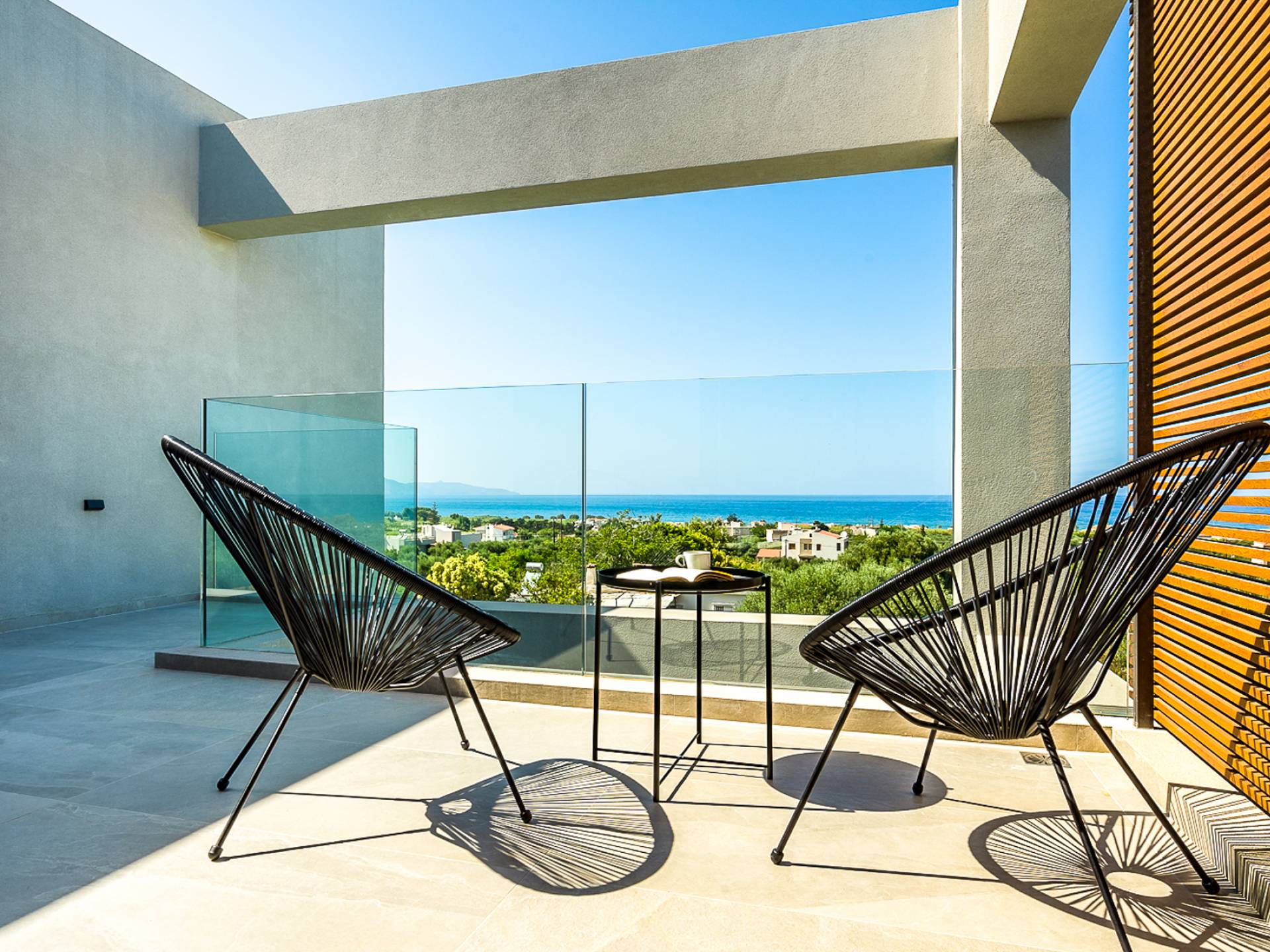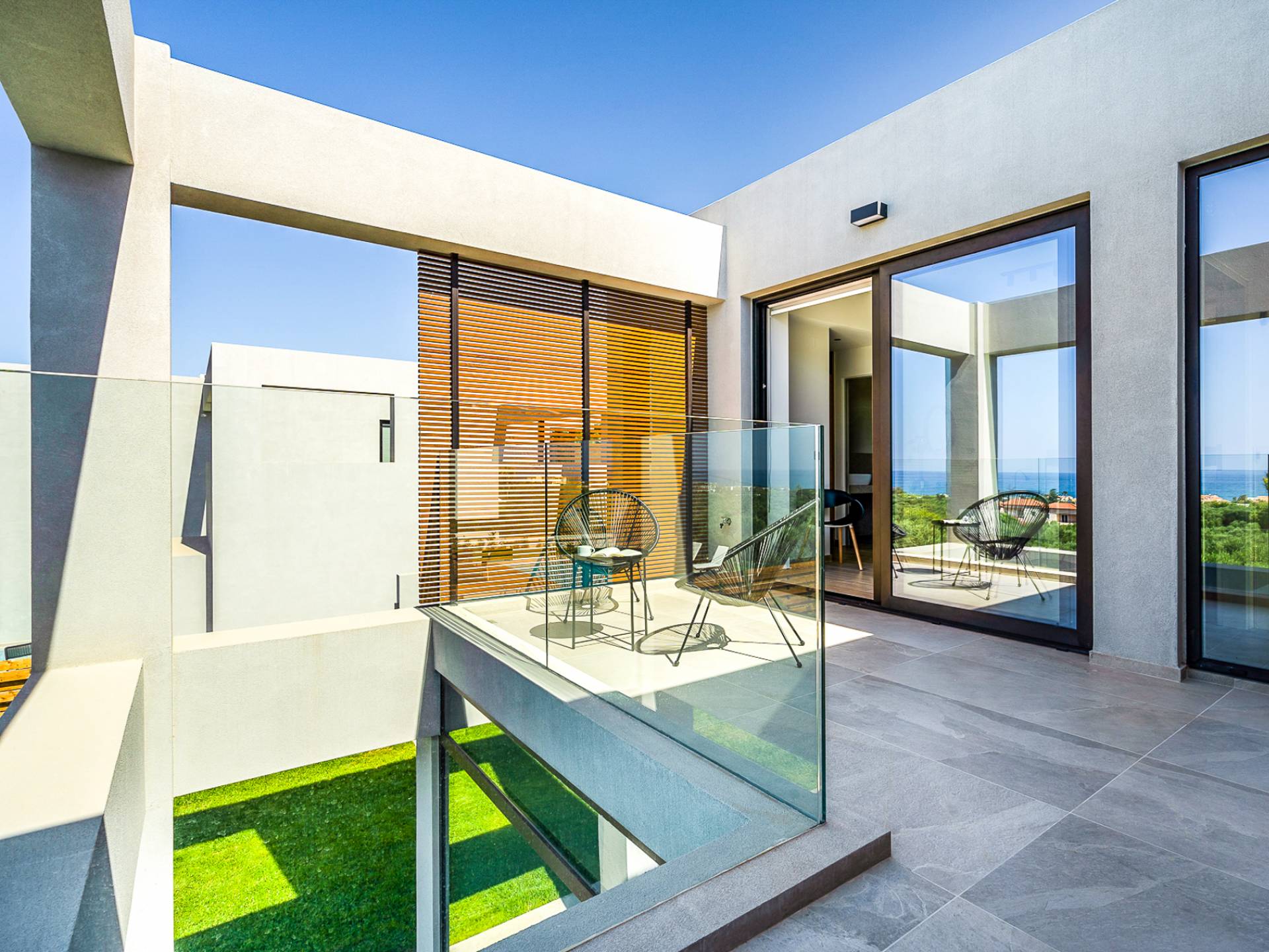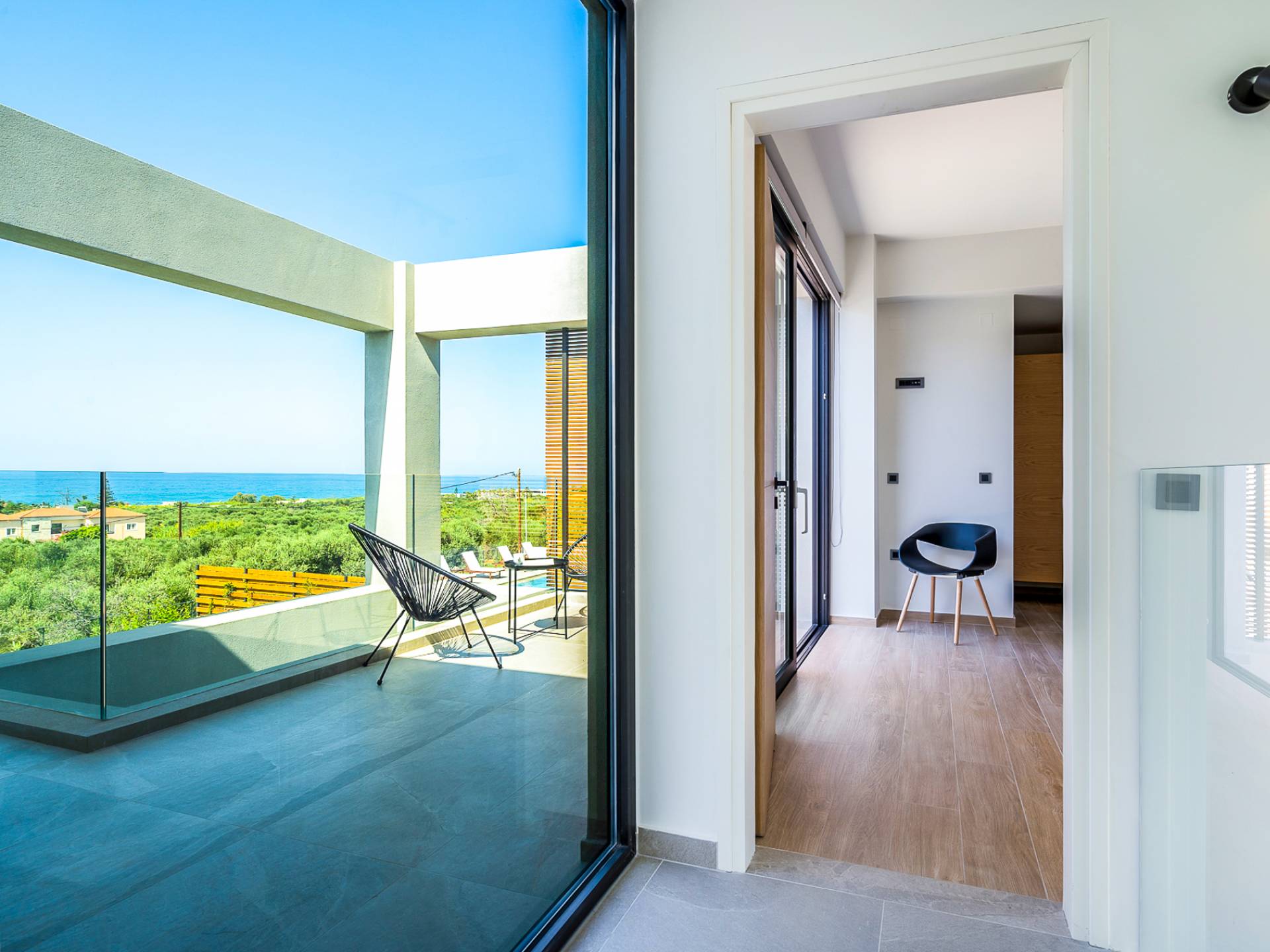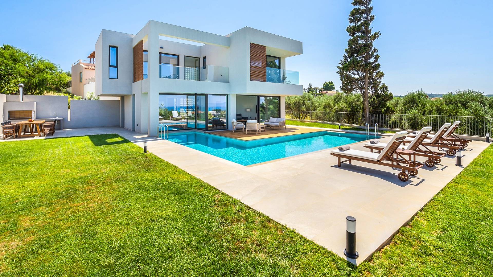 Дом площадью 250 кв.м. Вилла может похвастаться 4 спальнями с ванными комнатами, в которых могут разместиться 8 гостей. Выйдя на подъездную дорогу, можно увидеть, что Nea Villa 2 Crete — вторая из двух дошедших до нас вилл. Яркий кубический дизайн и стена со стеклянными панелями создают невероятный прием на божественной вилле. Каждая деталь используется для создания ощущения простора и простоты: от огромных стеклянных панелей до открытой лестницы. Чистые линии, успокаивающие тона и дерево приглашают вас в большое жилое пространство открытой планировки.