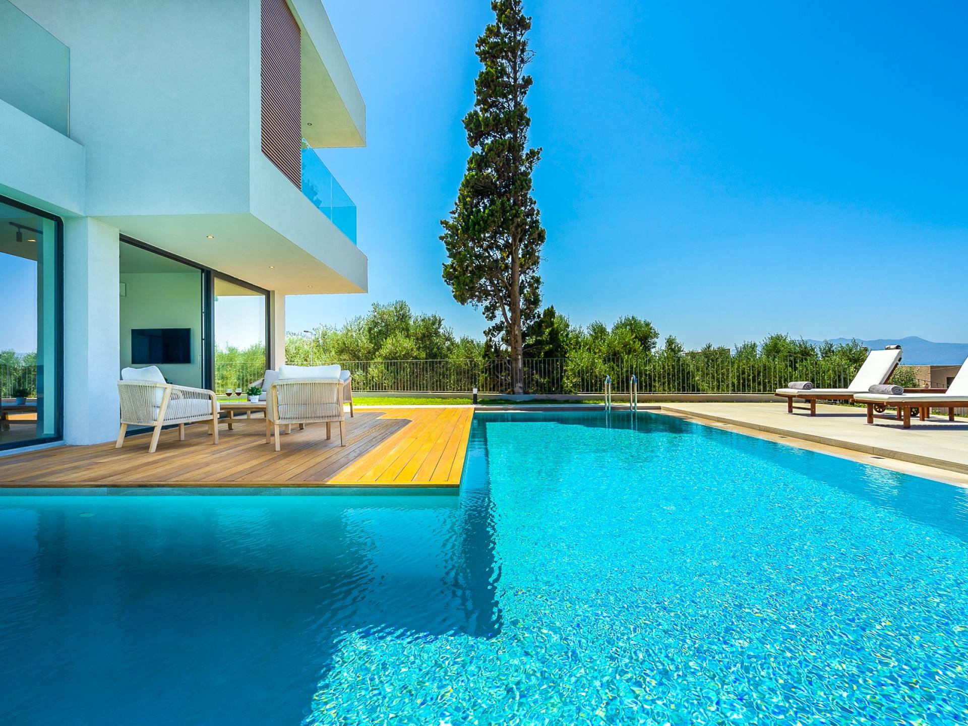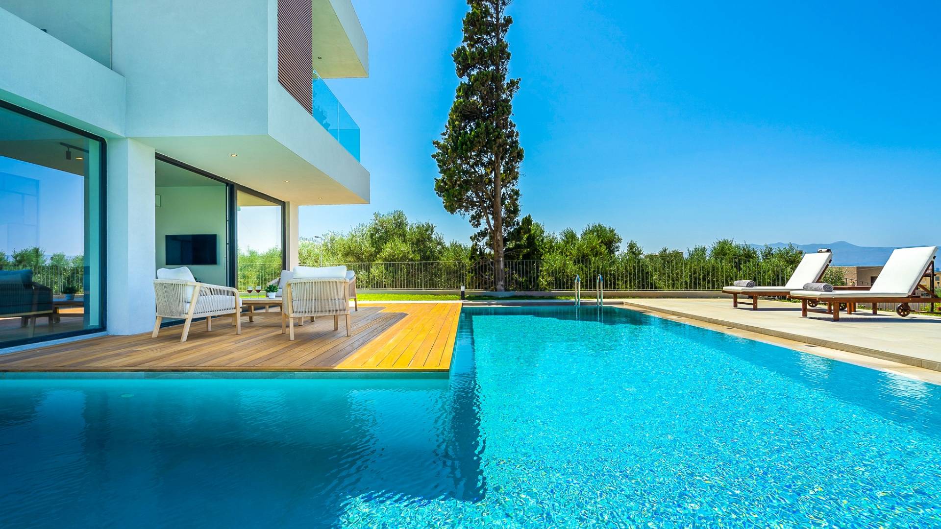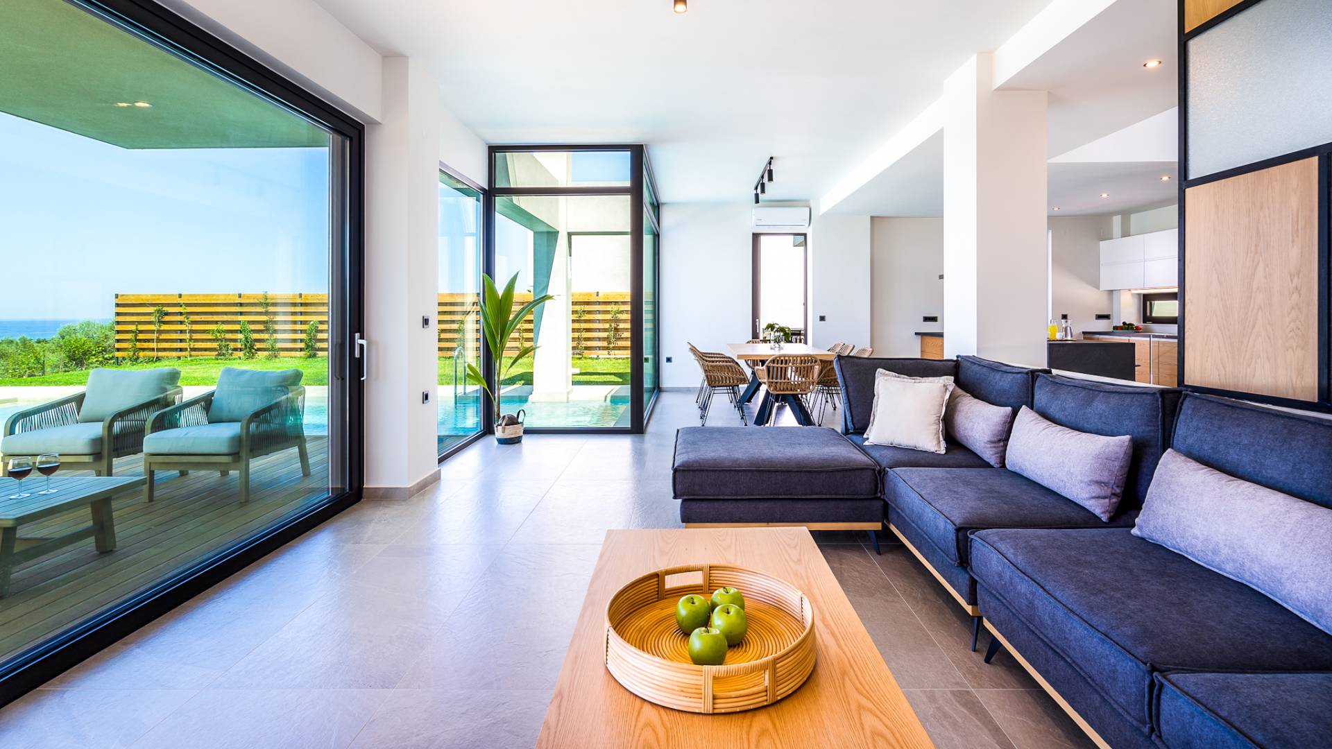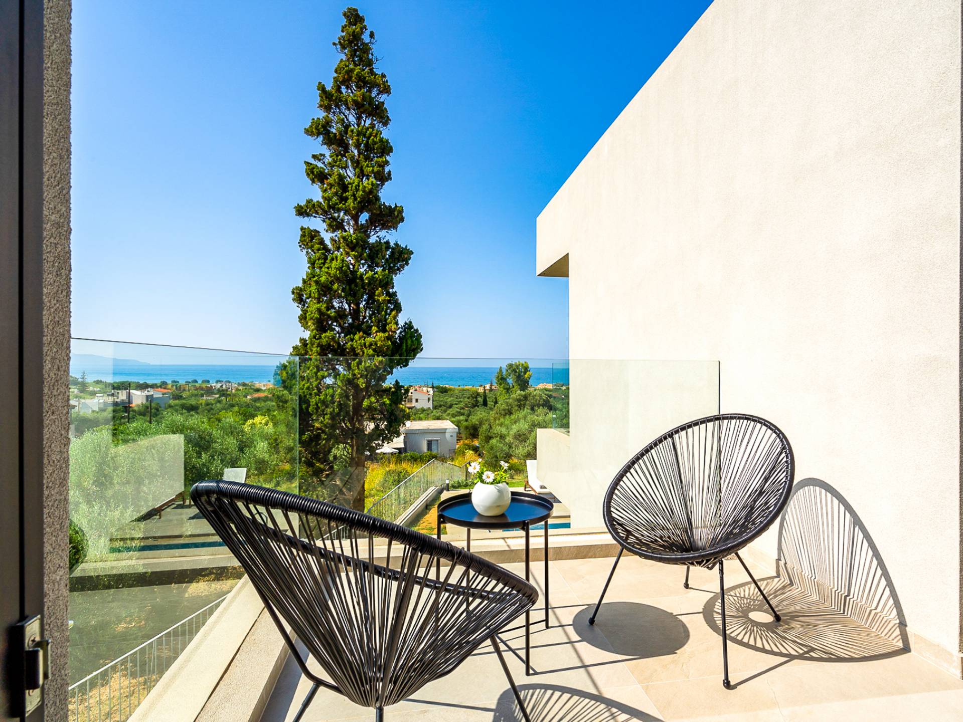 Дом площадью 250 кв.м. Вилла может похвастаться 4 спальнями с ванными комнатами, в которых могут разместиться 8 гостей. Выйдя на подъездную дорогу, можно увидеть, что Nea Villa 2 Crete — вторая из двух дошедших до нас вилл. Яркий кубический дизайн и стена со стеклянными панелями создают невероятный прием на божественной вилле. Каждая деталь используется для создания ощущения простора и простоты: от огромных стеклянных панелей до открытой лестницы. Чистые линии, успокаивающие тона и дерево приглашают вас в большое жилое пространство открытой планировки.