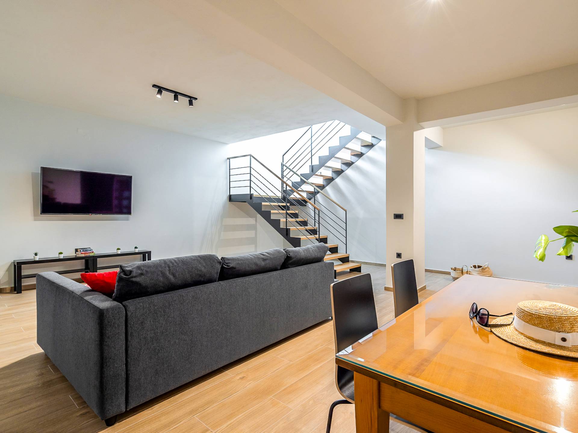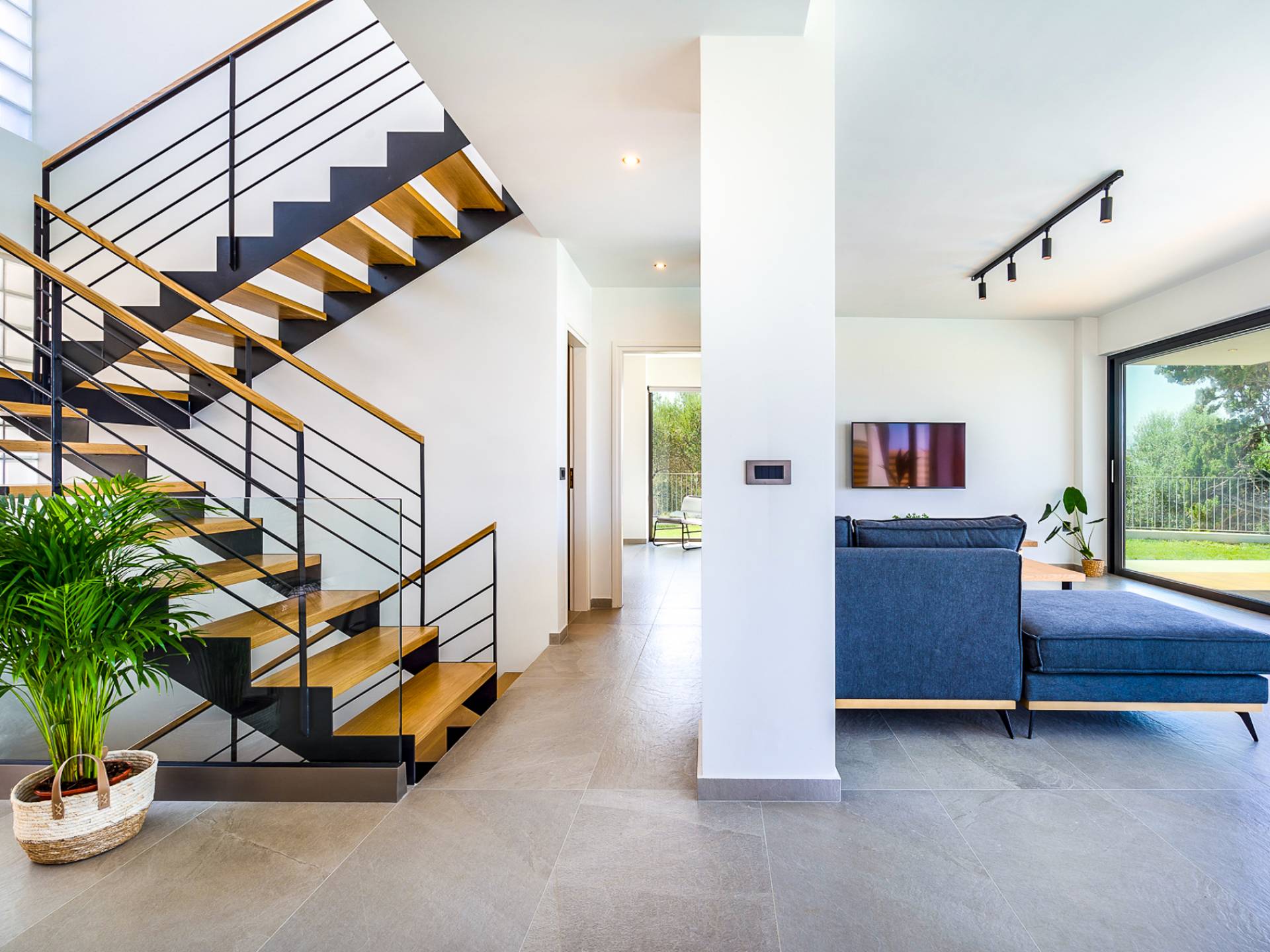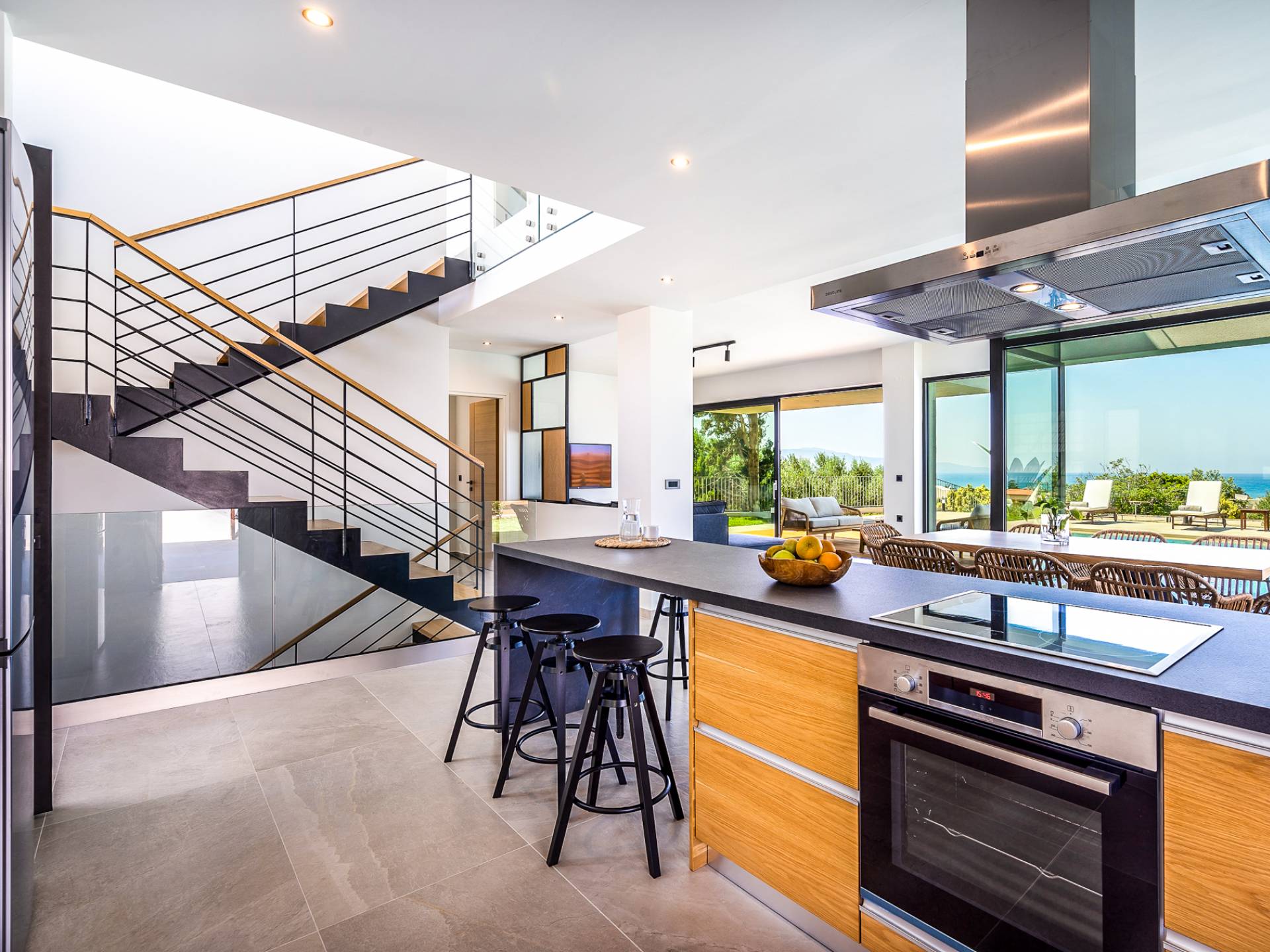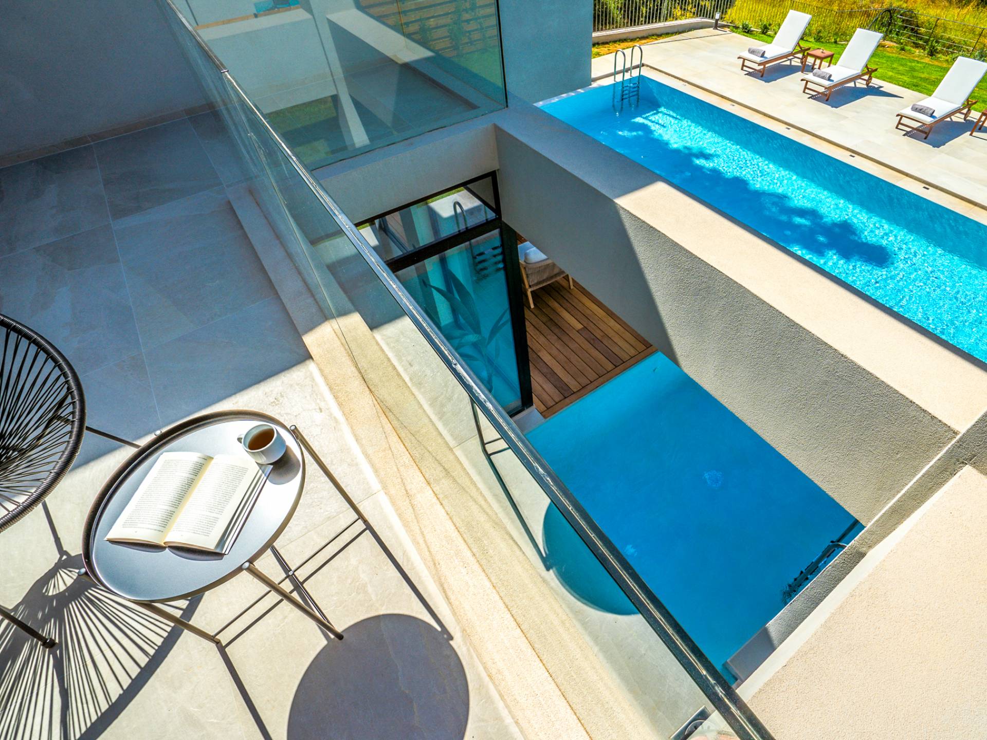Открытая решетчатая деревянная лестница ведет на второй этаж, освещенный светом, проникающим из стены со стеклянными панелями, и открытого коридора со стеклянной балюстрадой, откуда открывается вид на жилое пространство внизу. На втором этаже расположены 3 спальни с ванными комнатами, предлагающие гостям все удобства, необходимые для того, чтобы сон стал сном. Следуя по открытой лестнице на нижний уровень, вы попадаете в игровую комнату. В большой комнате есть диван для телевизора Smart TV с диагональю 4,55 дюйма, PlayStation, а также письменный стол, за которым можно ответить на любое электронное письмо, которое может возникнуть во время отсутствия.