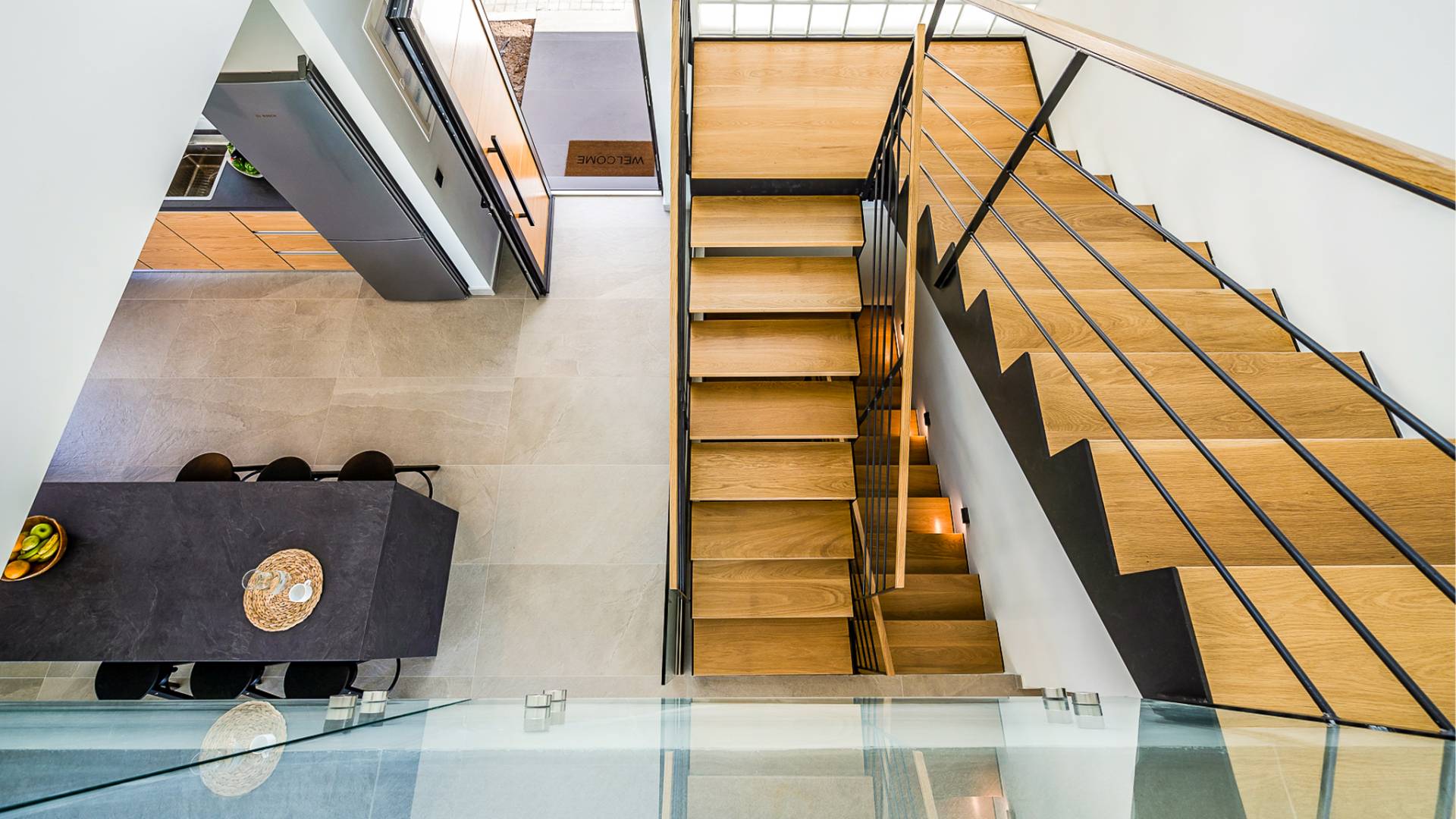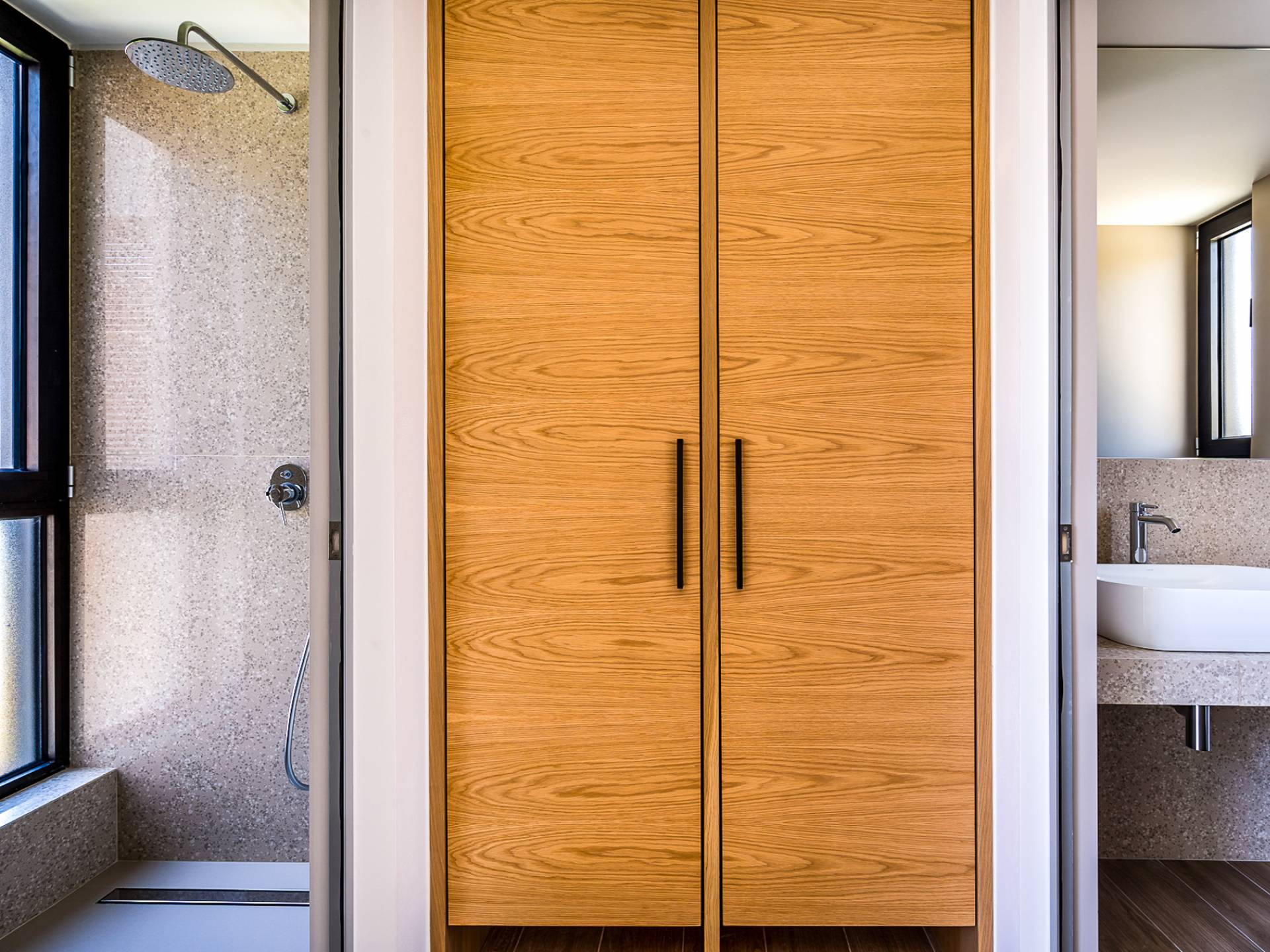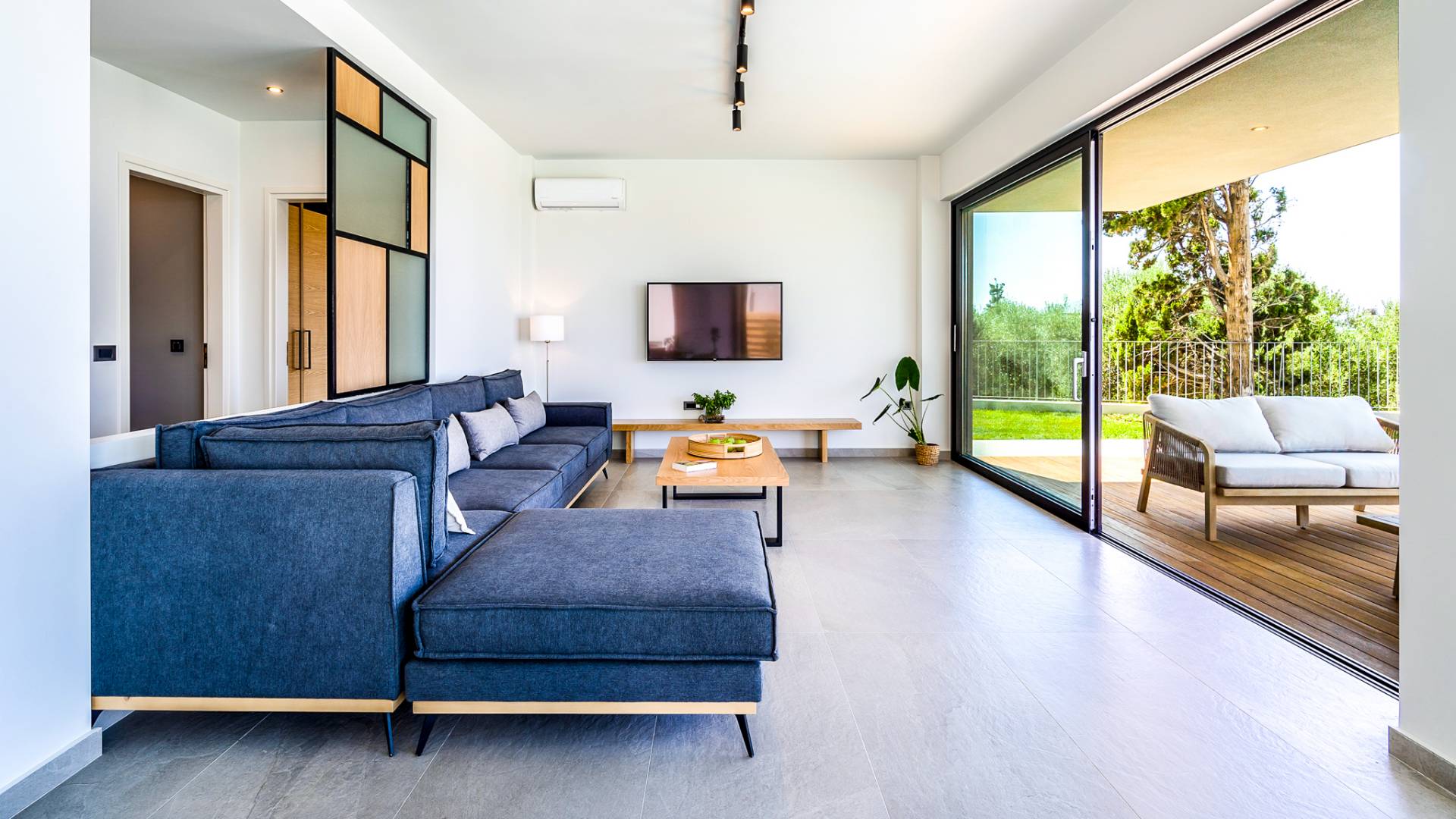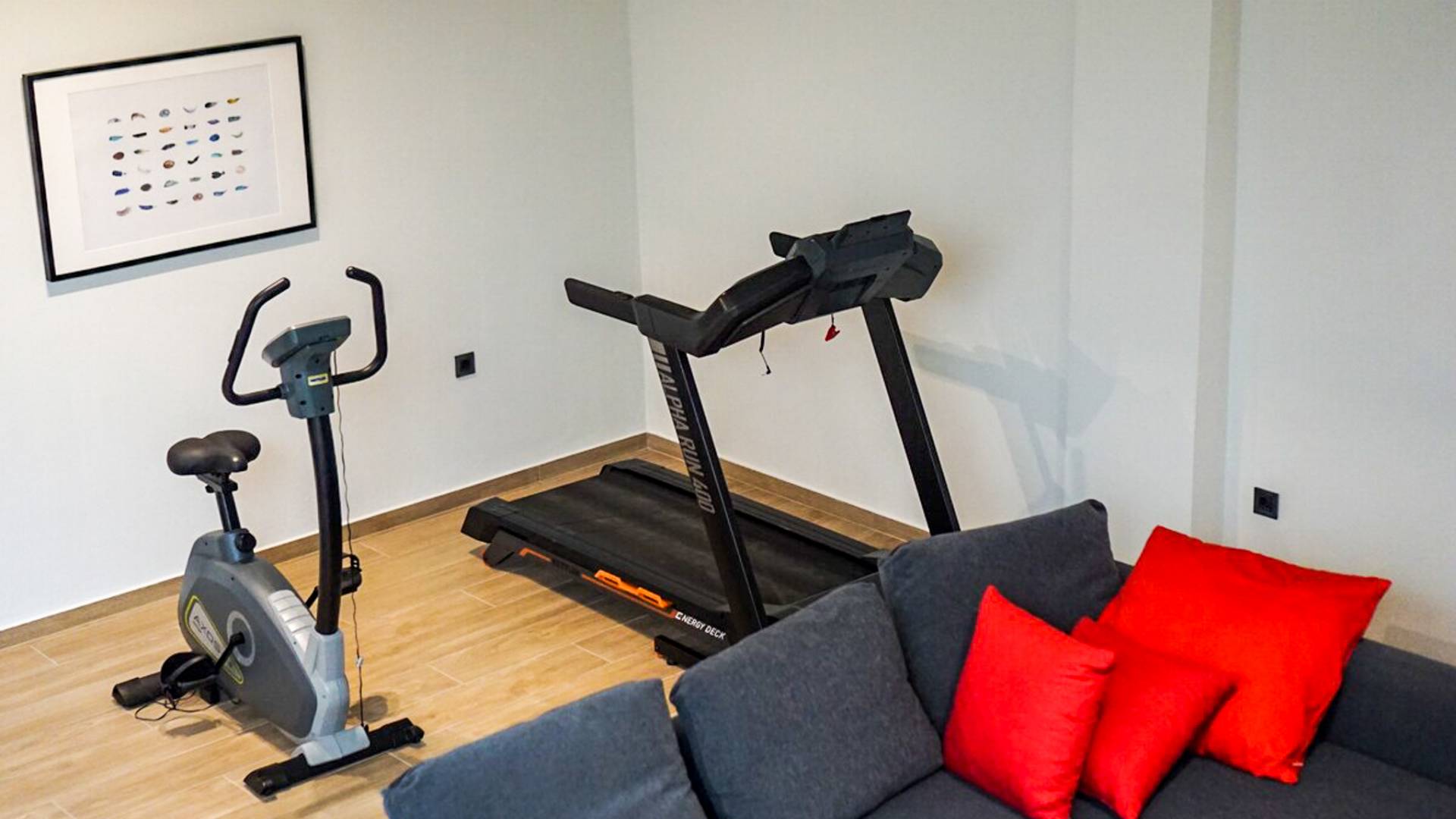 Открытая решетчатая деревянная лестница ведет на второй этаж, освещенный светом, проникающим из стены со стеклянными панелями, и открытого коридора со стеклянной балюстрадой, откуда открывается вид на жилое пространство внизу. На втором этаже расположены 3 спальни с ванными комнатами, предлагающие гостям все удобства, необходимые для того, чтобы сон стал сном. Следуя по открытой лестнице на нижний уровень, вы попадаете в игровую комнату. В большой комнате есть диван для телевизора Smart TV с диагональю 4,55 дюйма, PlayStation, а также письменный стол, за которым можно ответить на любое электронное письмо, которое может возникнуть во время отсутствия.
