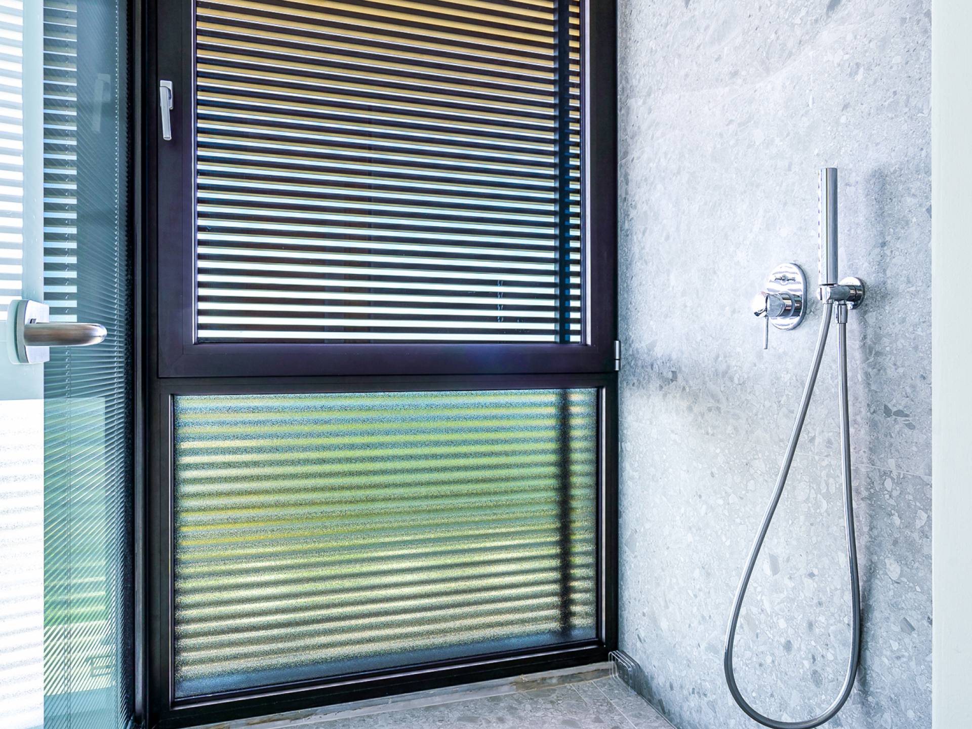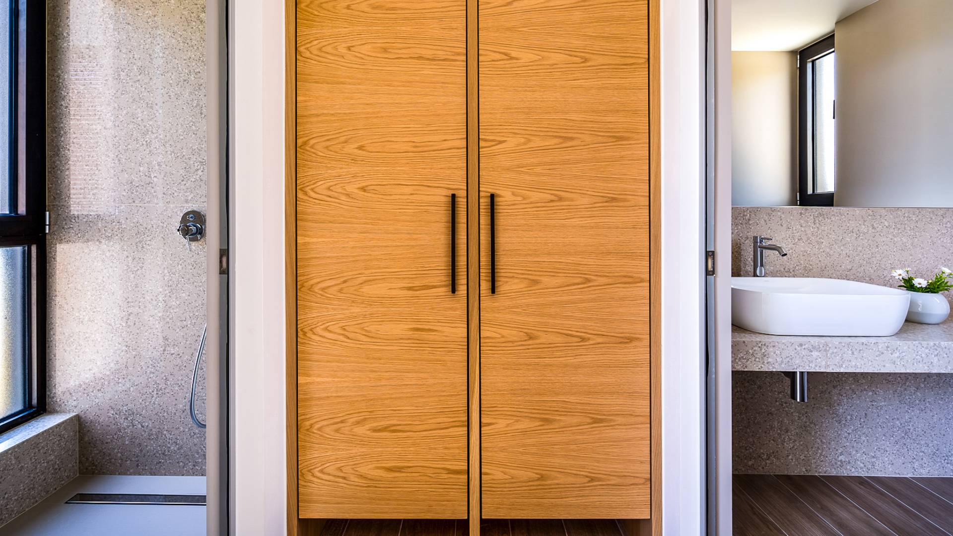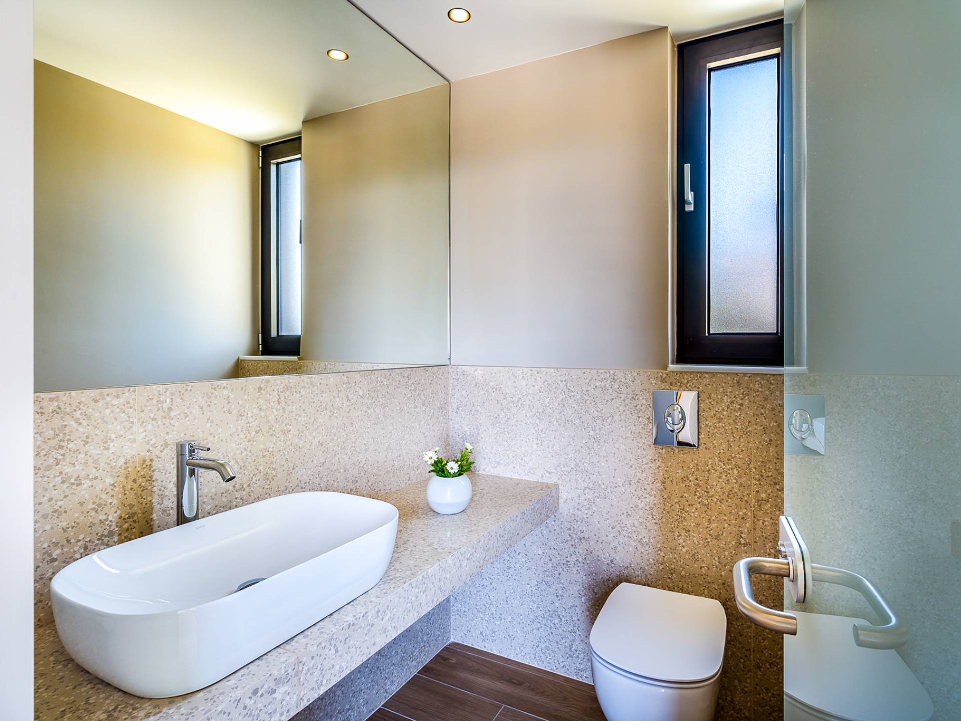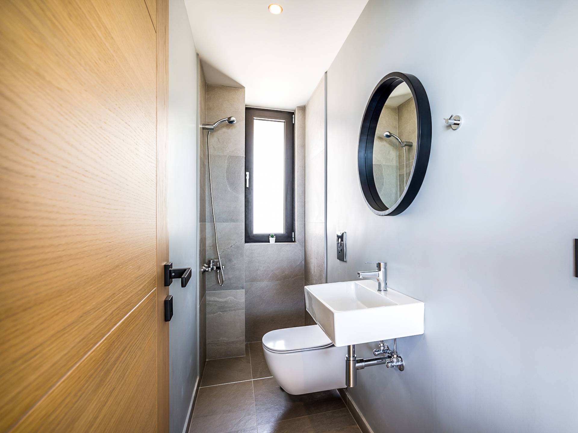 Открытая решетчатая деревянная лестница ведет на второй этаж, освещенный светом, проникающим из стены со стеклянными панелями, и открытого коридора со стеклянной балюстрадой, откуда открывается вид на жилое пространство внизу. На втором этаже расположены 3 спальни с ванными комнатами, предлагающие гостям все удобства, необходимые для того, чтобы сон стал сном. Следуя по открытой лестнице на нижний уровень, вы попадаете в игровую комнату. В большой комнате есть диван для телевизора Smart TV с диагональю 4,55 дюйма, PlayStation, а также письменный стол, за которым можно ответить на любое электронное письмо, которое может возникнуть во время отсутствия.