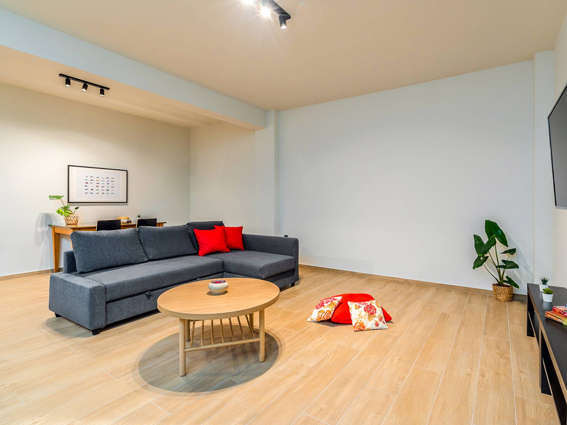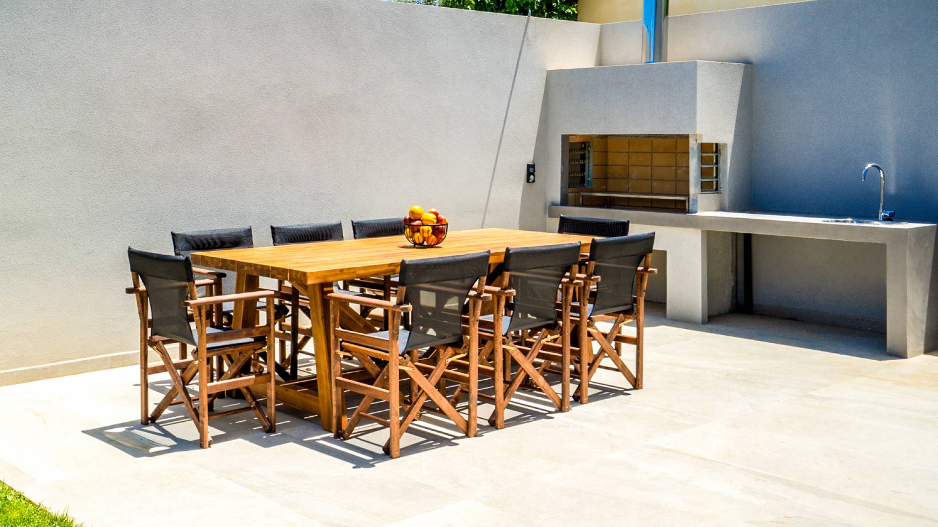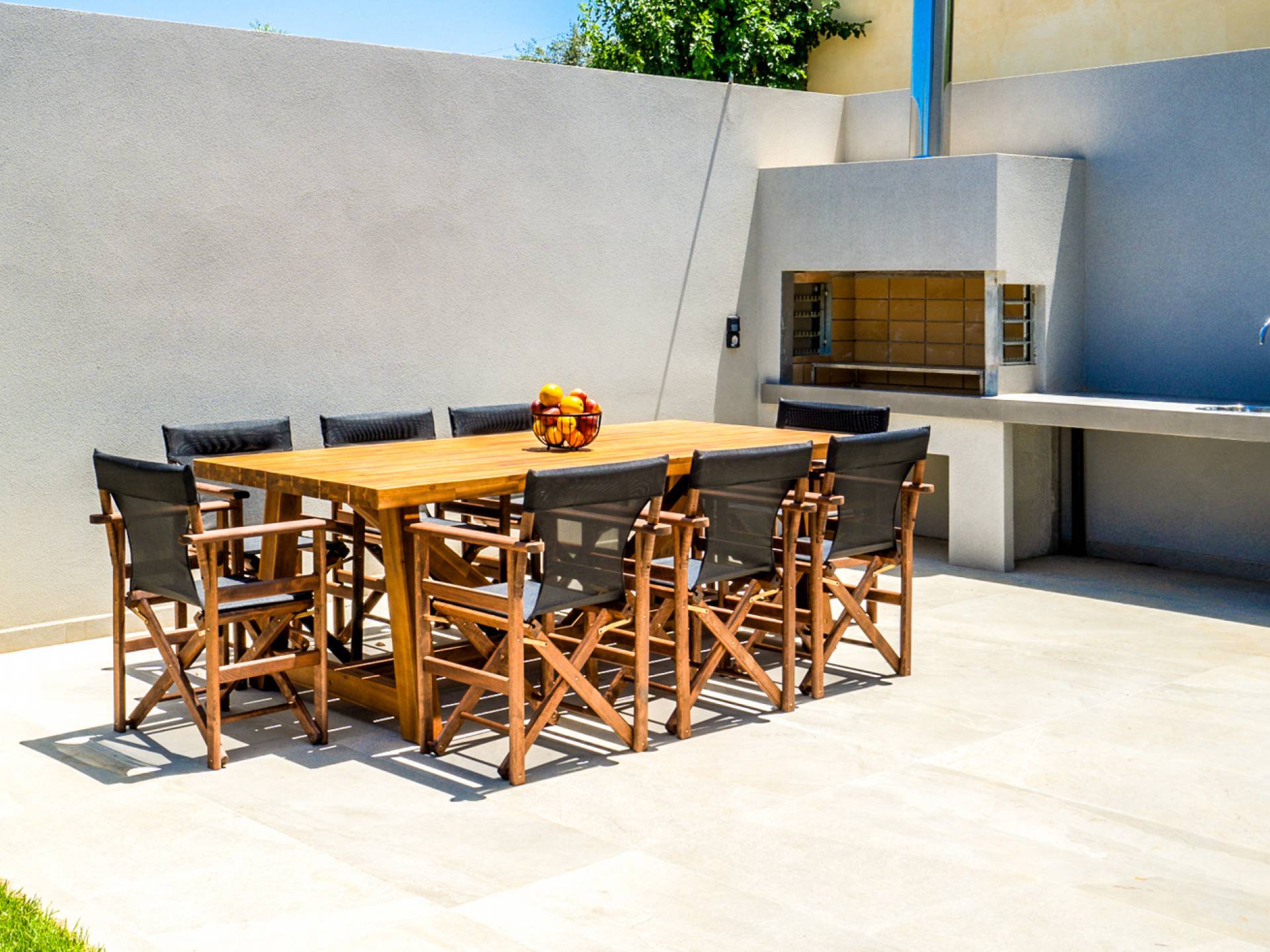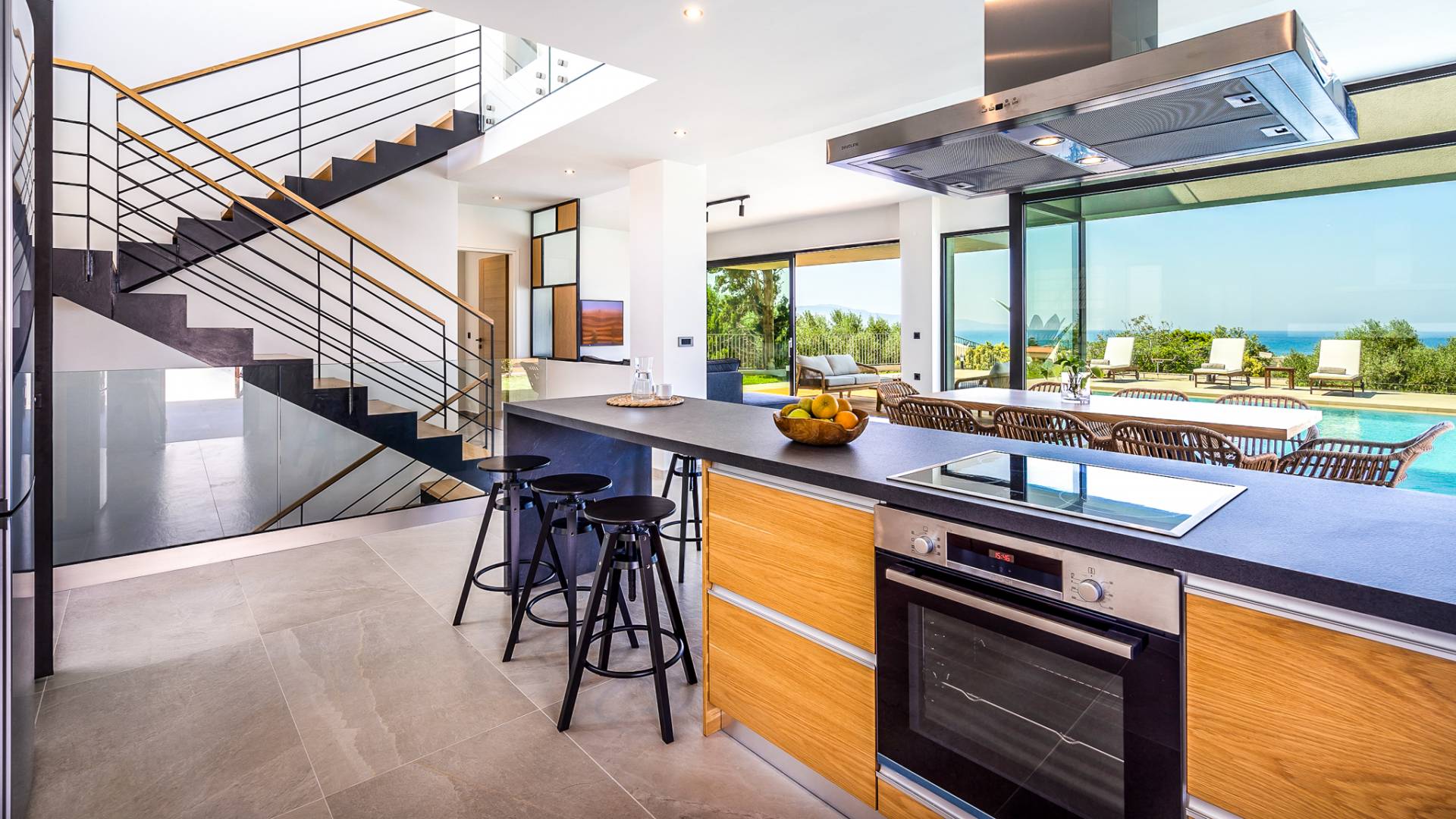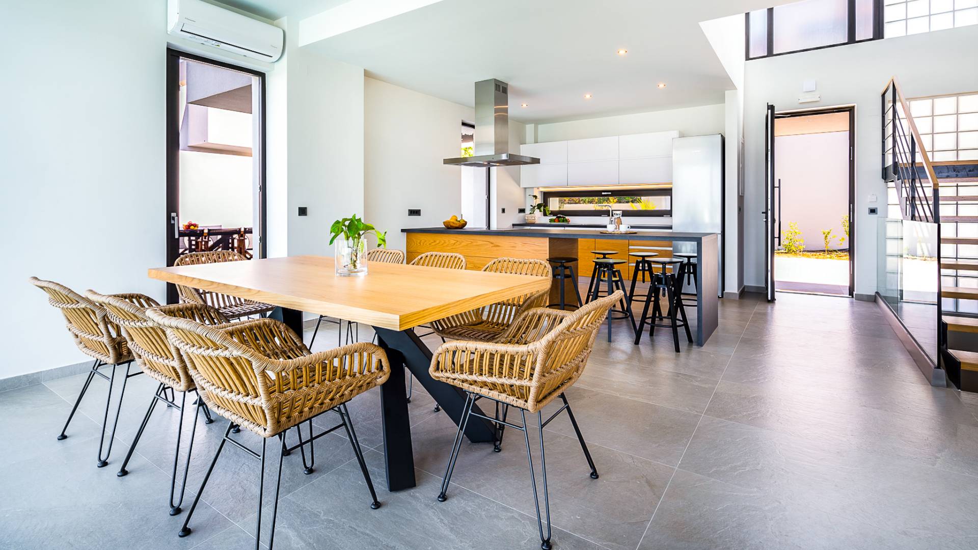 Войдя в дом, поражаешься изобретательности дизайна. Большие диваны создают удобную зону, где можно собраться и насладиться прекрасным видом на море или вечером посмотреть фильм на 55-дюймовом телевизоре Smart TV, а двери патио выходят прямо на террасу и к бассейну. Элегантная кухня предлагает все необходимое, чтобы приготовить вкусные блюда, а также крытую обеденную зону на 8 человек, где можно насладиться трапезой. На первом этаже также находится спальня с двуспальной кроватью (1,50 х 2,00) и выход через патио на веранду и открытую площадку. Ванная комната оборудована душевая кабина с тропическим душем.
