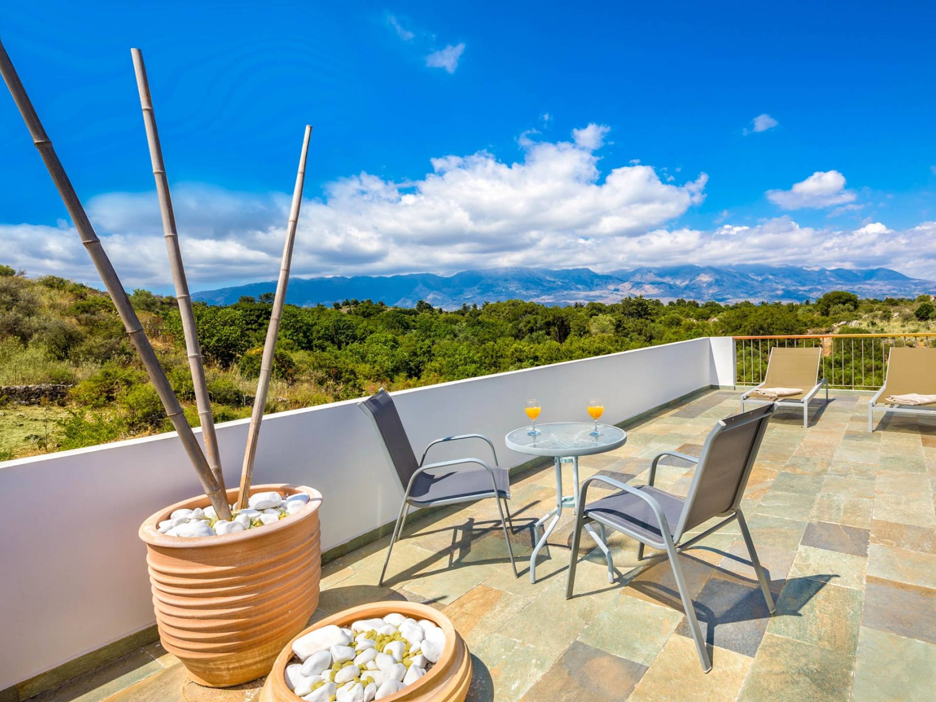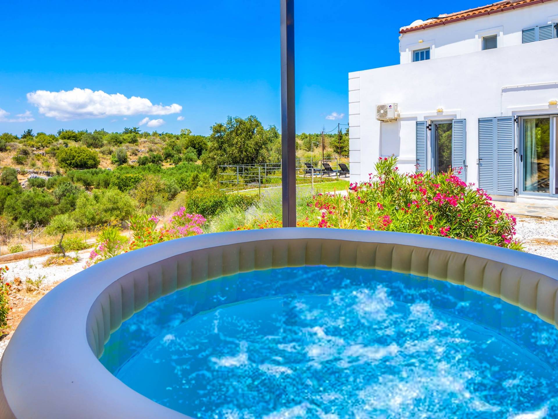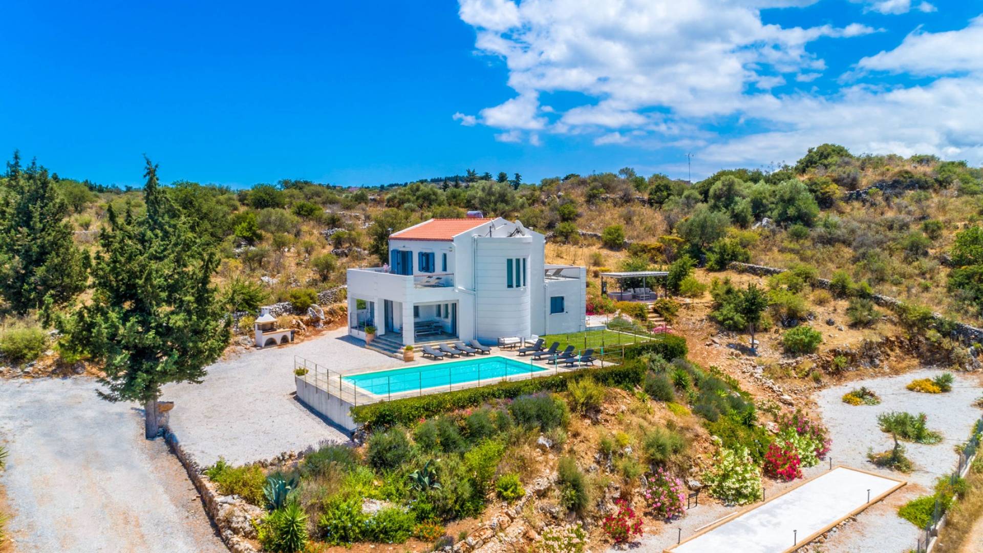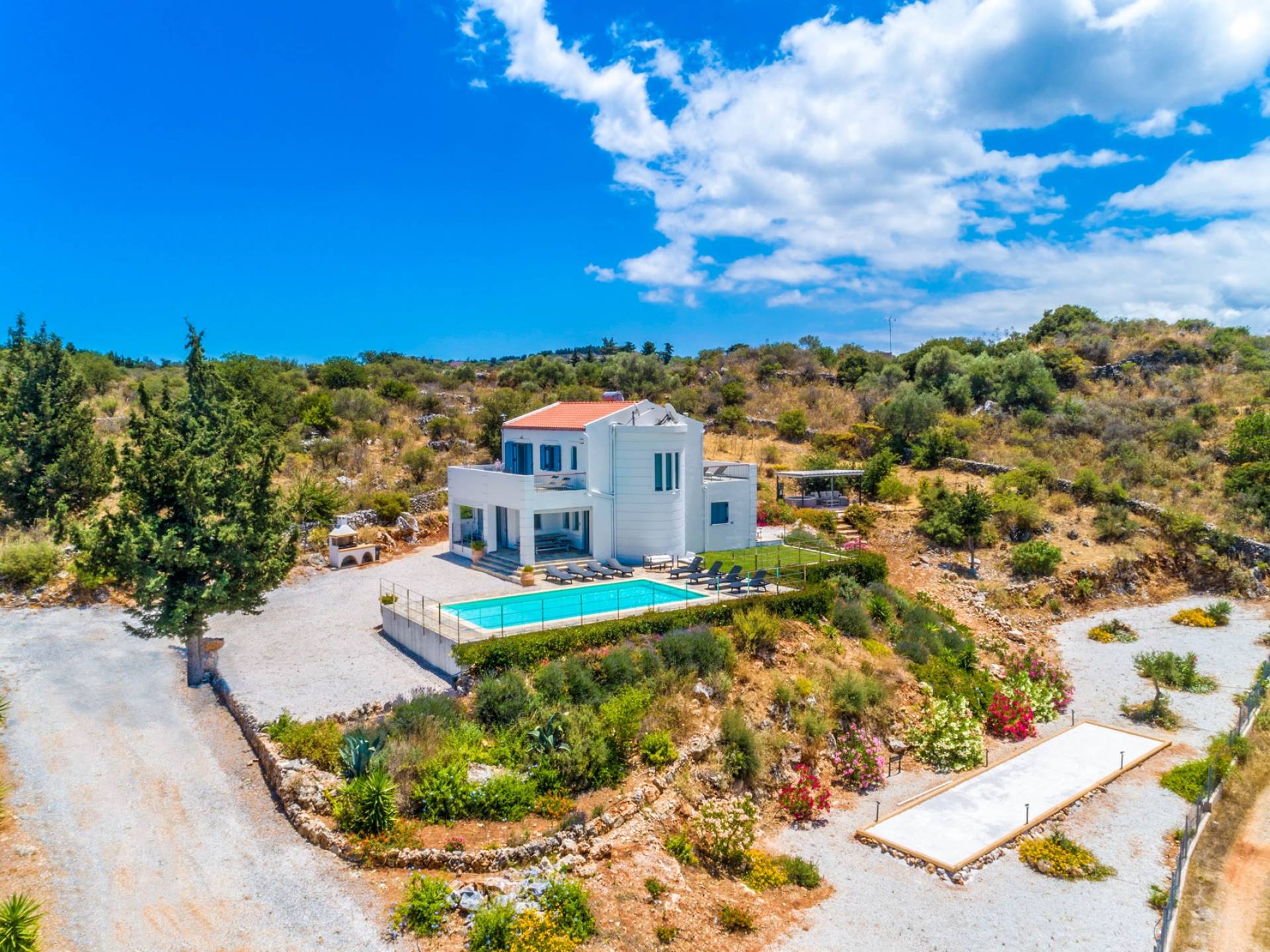Внизу есть две спальни Superior со встроенными шкафами, кондиционером, потолочным вентилятором и выходом прямо на частную панорамную площадку с зонтиком и шезлонгами. Снаружи есть новое поле для игры в петанк или боулинг, панорамная веранда с джакузи и диван для отдыха под солнцем. Недавно построенная вилла в Вамосе, отвечающая самым высоким требованиям, представляет собой современный отель, предлагающий множество превосходных удобств, включая расслабляющее джакузи, потрясающий частный бассейн и просторную солнечную террасу, с которой можно насладиться прекрасным видом. Вилла спроектирована так, чтобы сделать ваш отдых по-настоящему комфортным, чтобы вы почувствовали тепло подлинного гостеприимства Крита.
