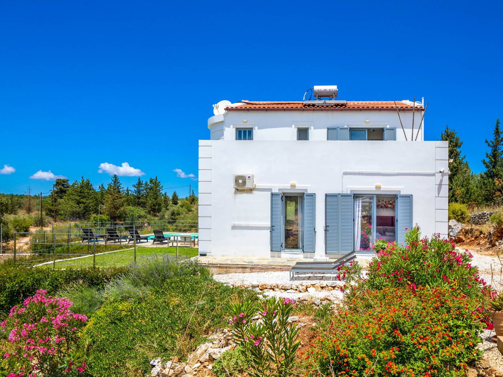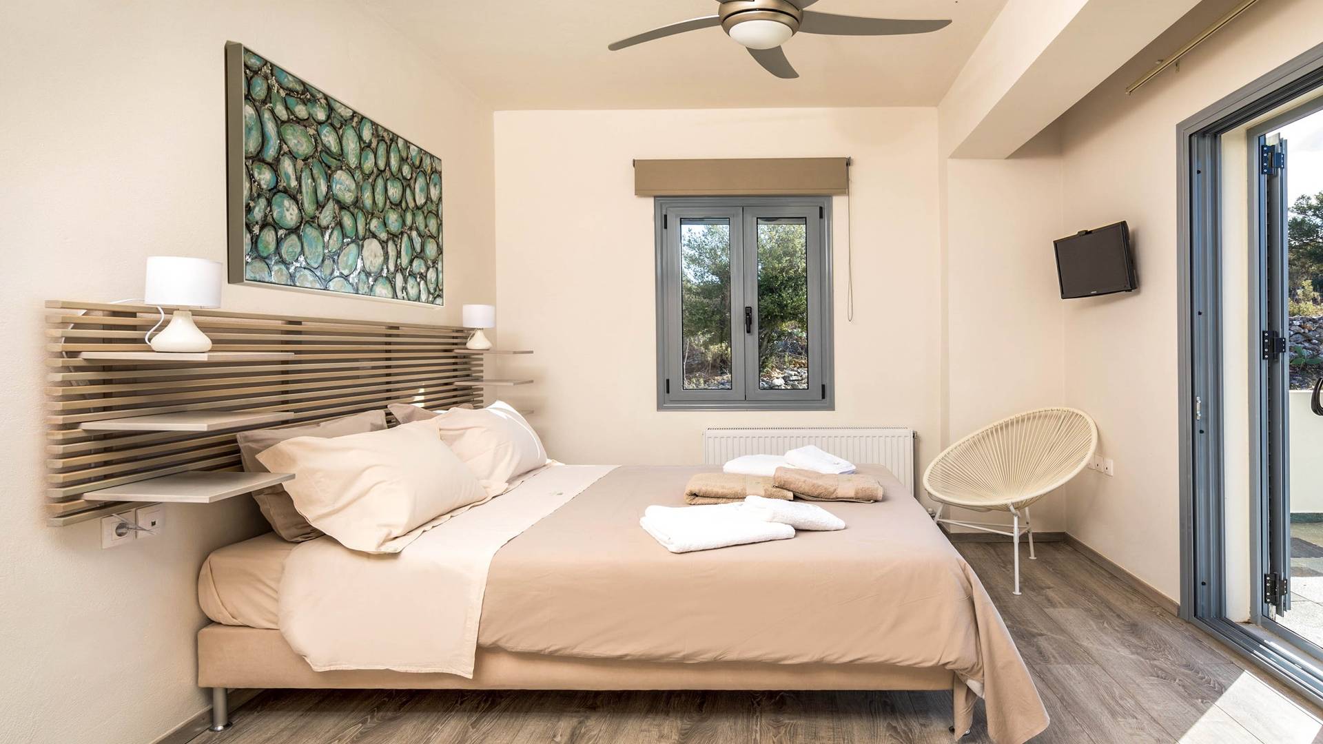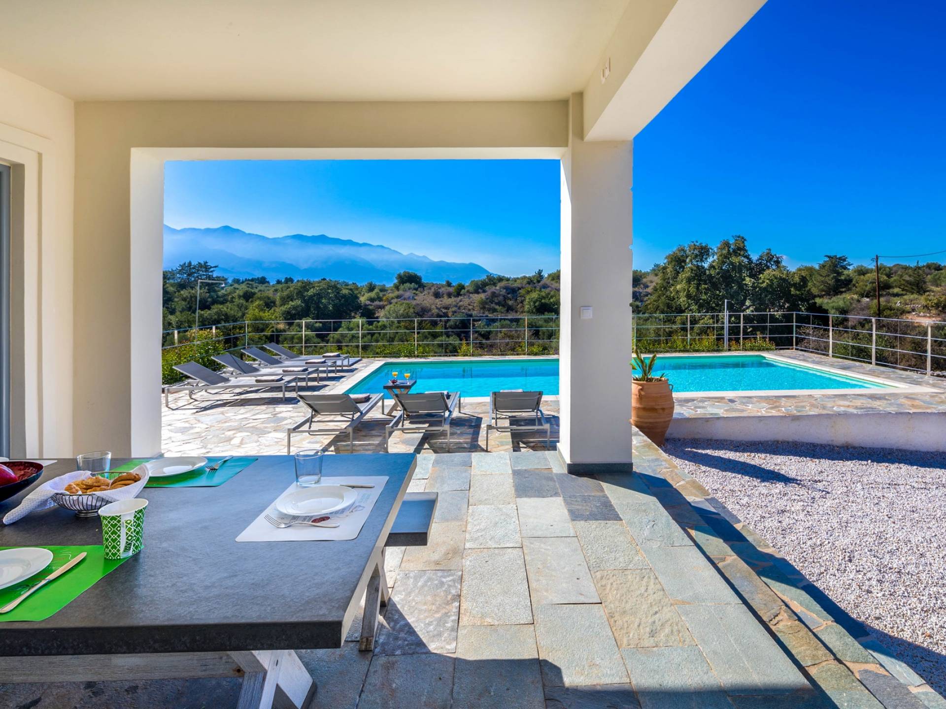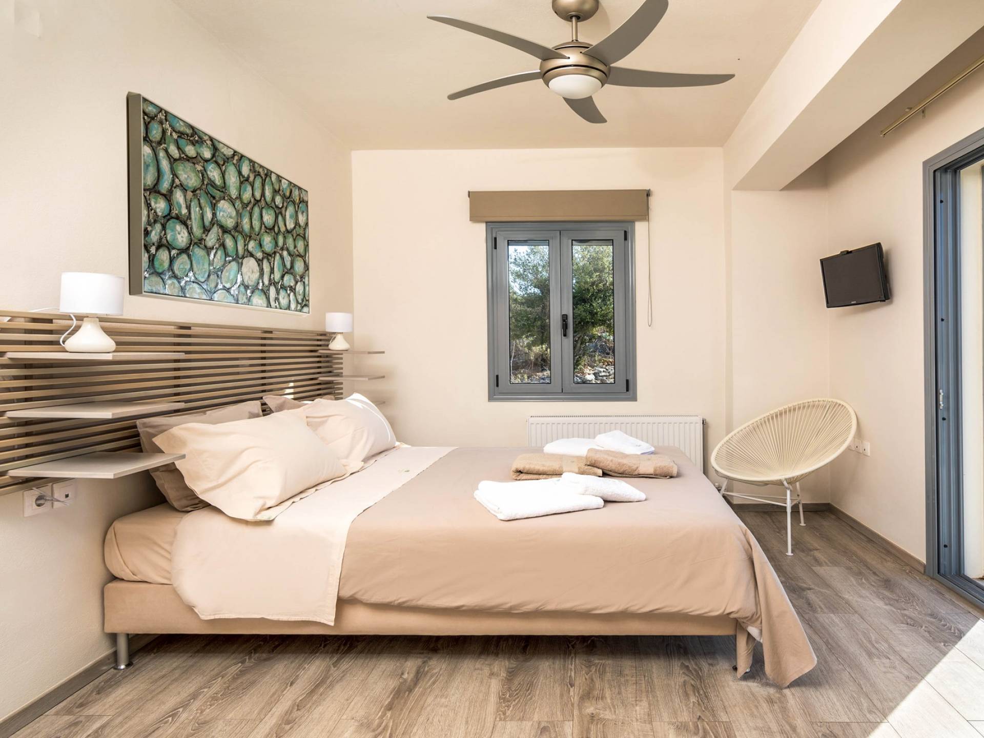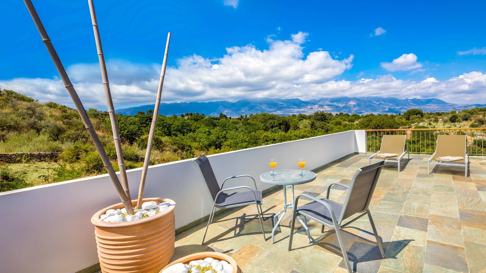 Внизу есть две спальни Superior со встроенными шкафами, кондиционером, потолочным вентилятором и выходом прямо на частную панорамную площадку с зонтиком и шезлонгами. Снаружи есть новое поле для игры в петанк или боулинг, панорамная веранда с джакузи и диван для отдыха под солнцем. Недавно построенная вилла в Вамосе, отвечающая самым высоким требованиям, представляет собой современный отель, предлагающий множество превосходных удобств, включая расслабляющее джакузи, потрясающий частный бассейн и просторную солнечную террасу, с которой можно насладиться прекрасным видом. Вилла спроектирована так, чтобы сделать ваш отдых по-настоящему комфортным, чтобы вы почувствовали тепло подлинного гостеприимства Крита.