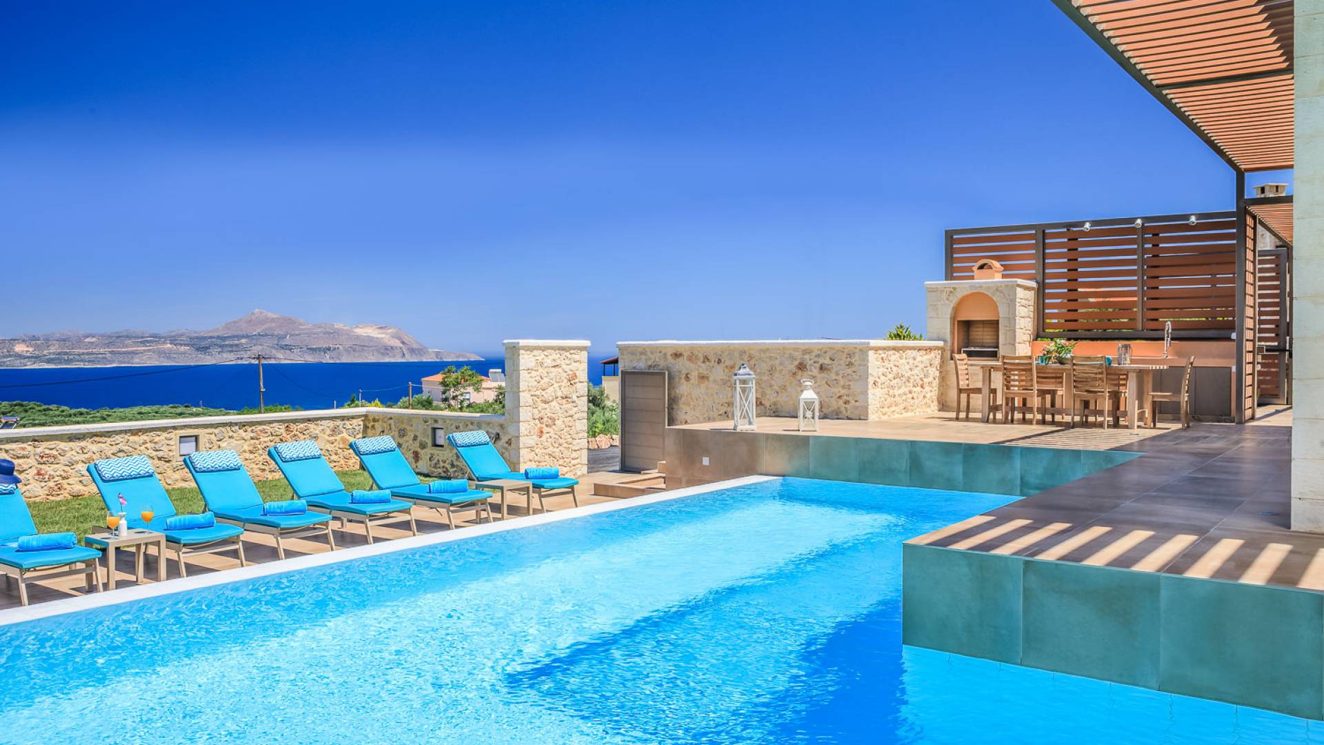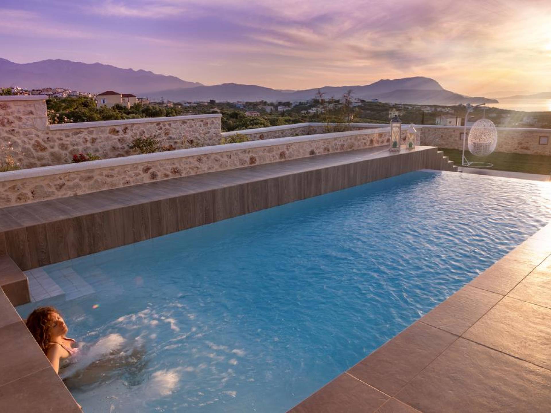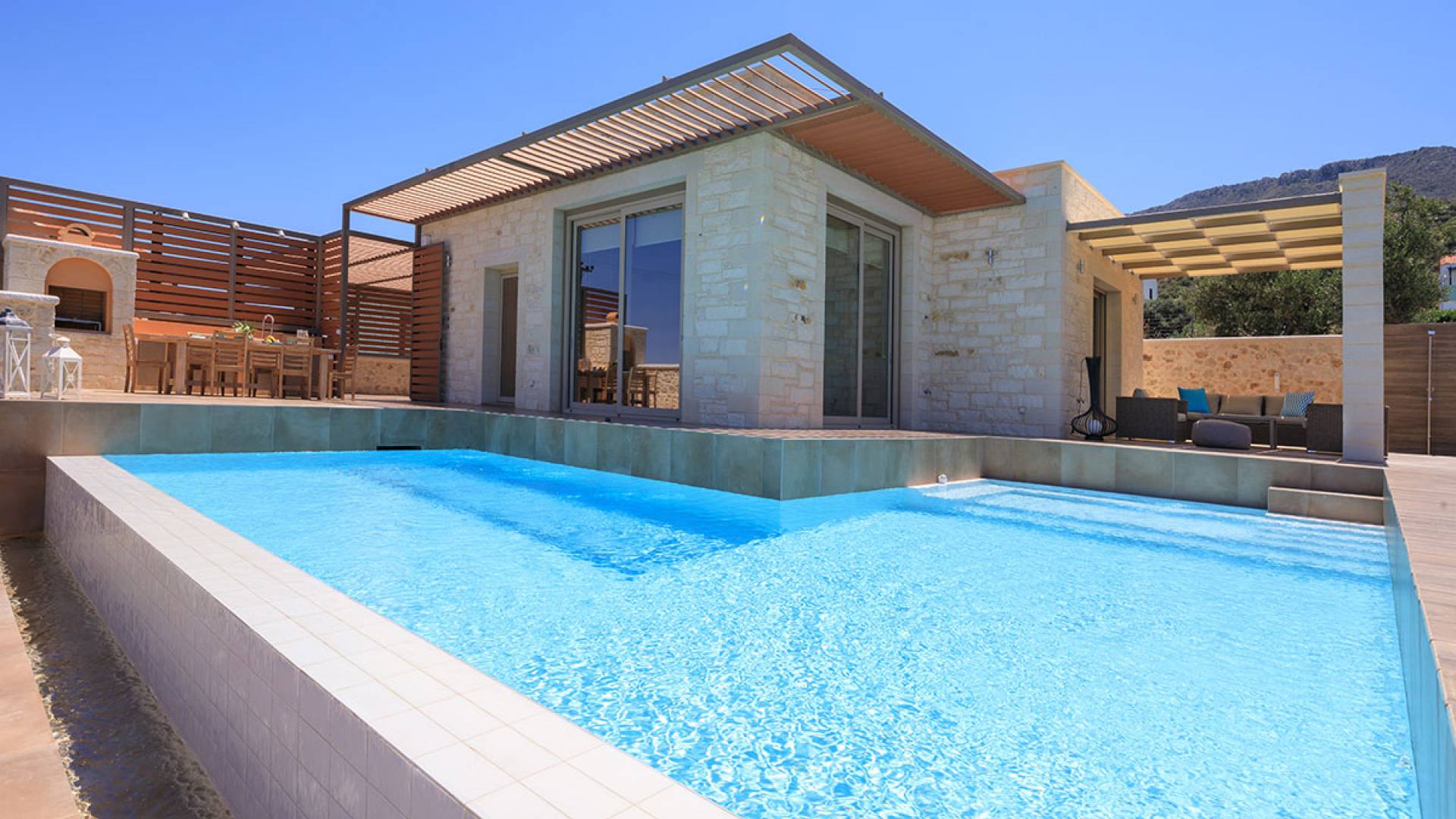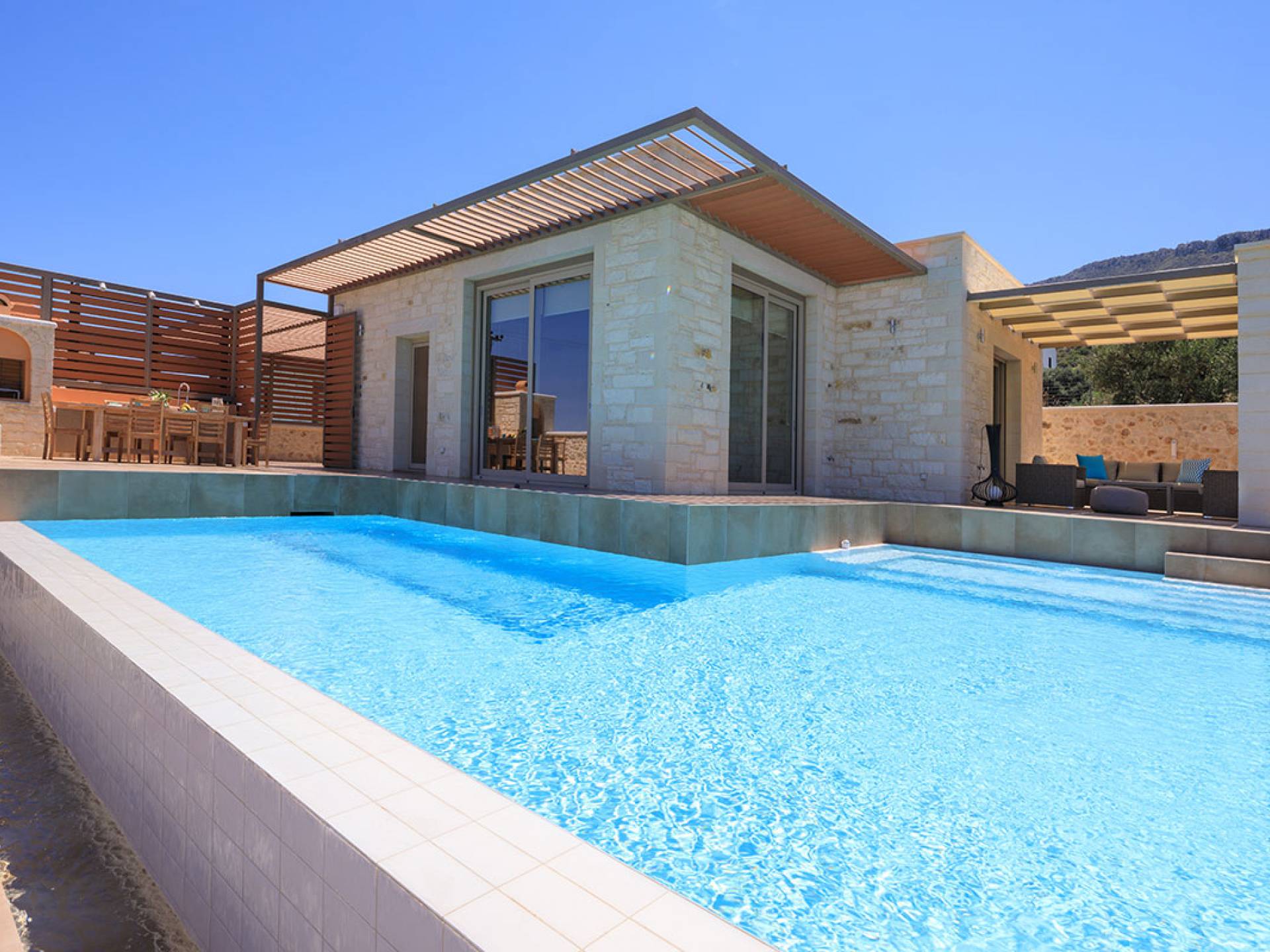 На расстоянии одного метра вы увидите бассейн площадью 60 кв. м, где вы можете насладиться напитком в зоне отдыха с гидромассажем. Здесь также есть барбекю и обеденный стол, а также зона отдыха, где вы можете послушать музыку или даже почитать книгу в сопровождении различных природных звуков критской сельской местности. Вечером вы можете насладиться великолепным романтическим закатом, который раскрашивает прекраснейшими красками чистое синее средиземноморское небо, или вы можете пройти примерно 20 минут до ближайших таверн и отведать блюда критской кухни. По запросу на вилле можно заняться такими видами активного отдыха, как подводное плавание с аквалангом, прогулки на лодке или даже расслабляющий массаж в доме.