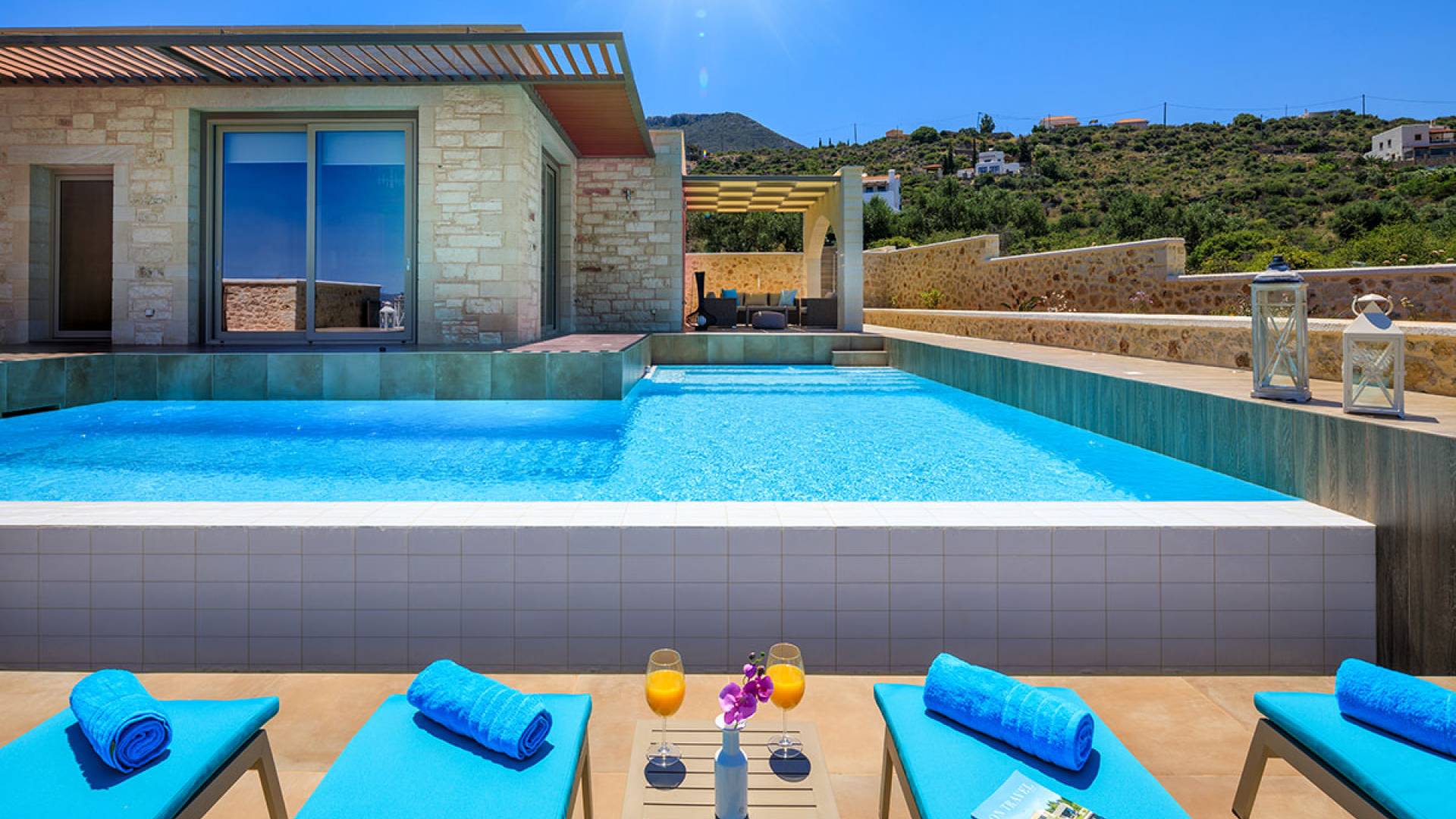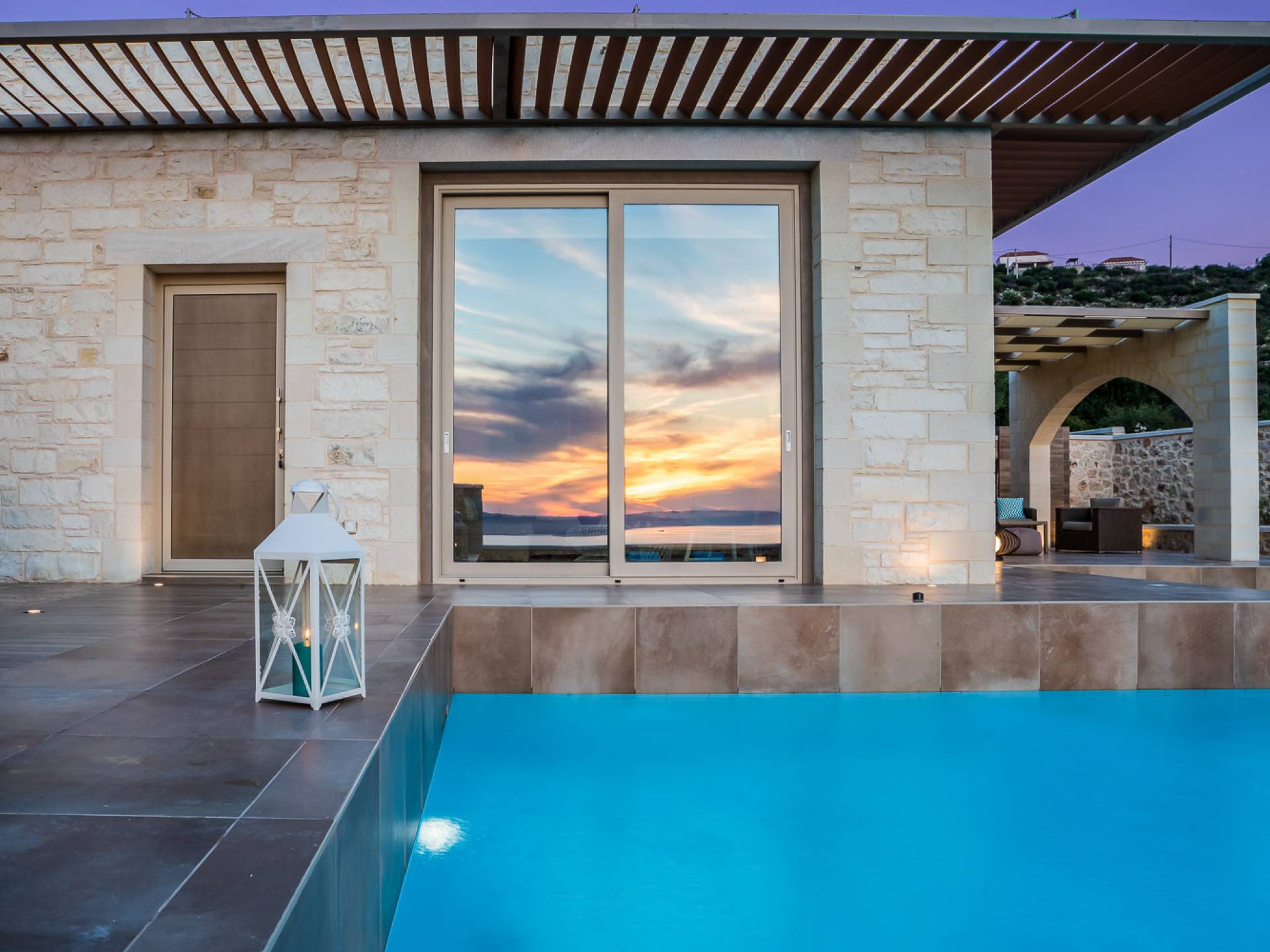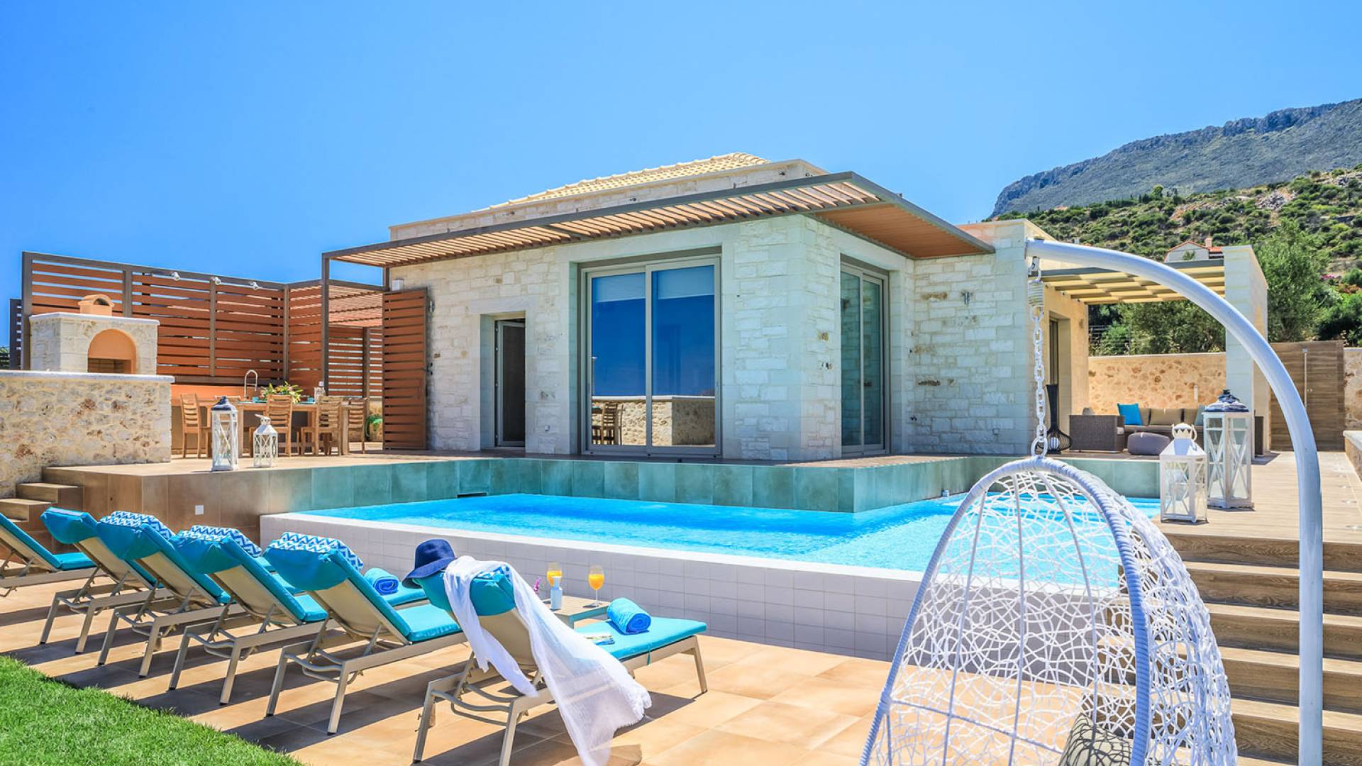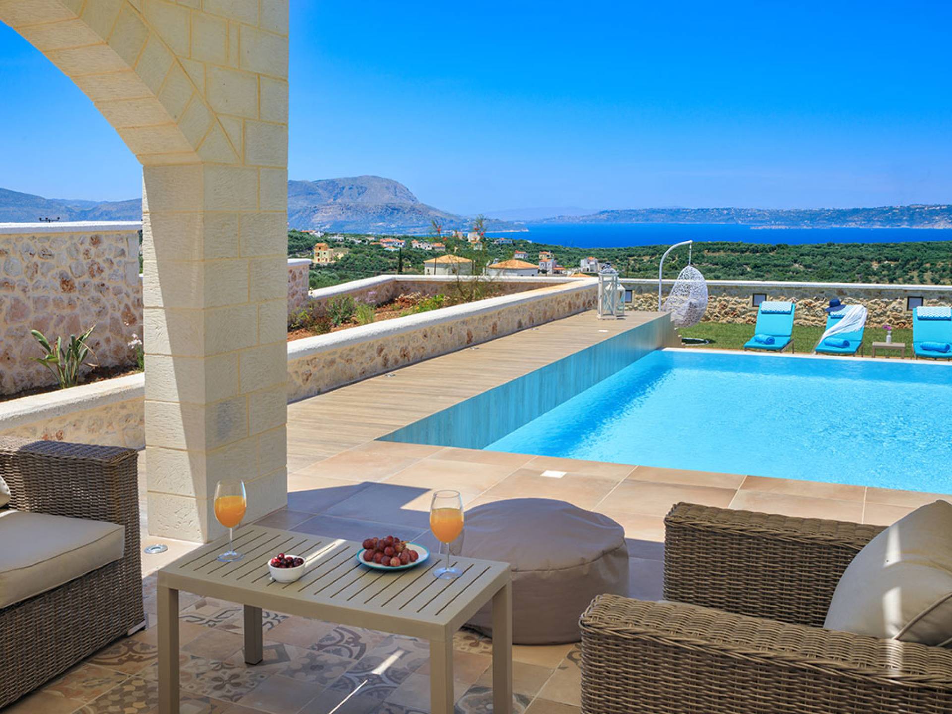 На расстоянии одного метра вы увидите бассейн площадью 60 кв. м, где вы можете насладиться напитком в зоне отдыха с гидромассажем. Здесь также есть барбекю и обеденный стол, а также зона отдыха, где вы можете послушать музыку или даже почитать книгу в сопровождении различных природных звуков критской сельской местности. Вечером вы можете насладиться великолепным романтическим закатом, который раскрашивает прекраснейшими красками чистое синее средиземноморское небо, или вы можете пройти примерно 20 минут до ближайших таверн и отведать блюда критской кухни. По запросу на вилле можно заняться такими видами активного отдыха, как подводное плавание с аквалангом, прогулки на лодке или даже расслабляющий массаж в доме.