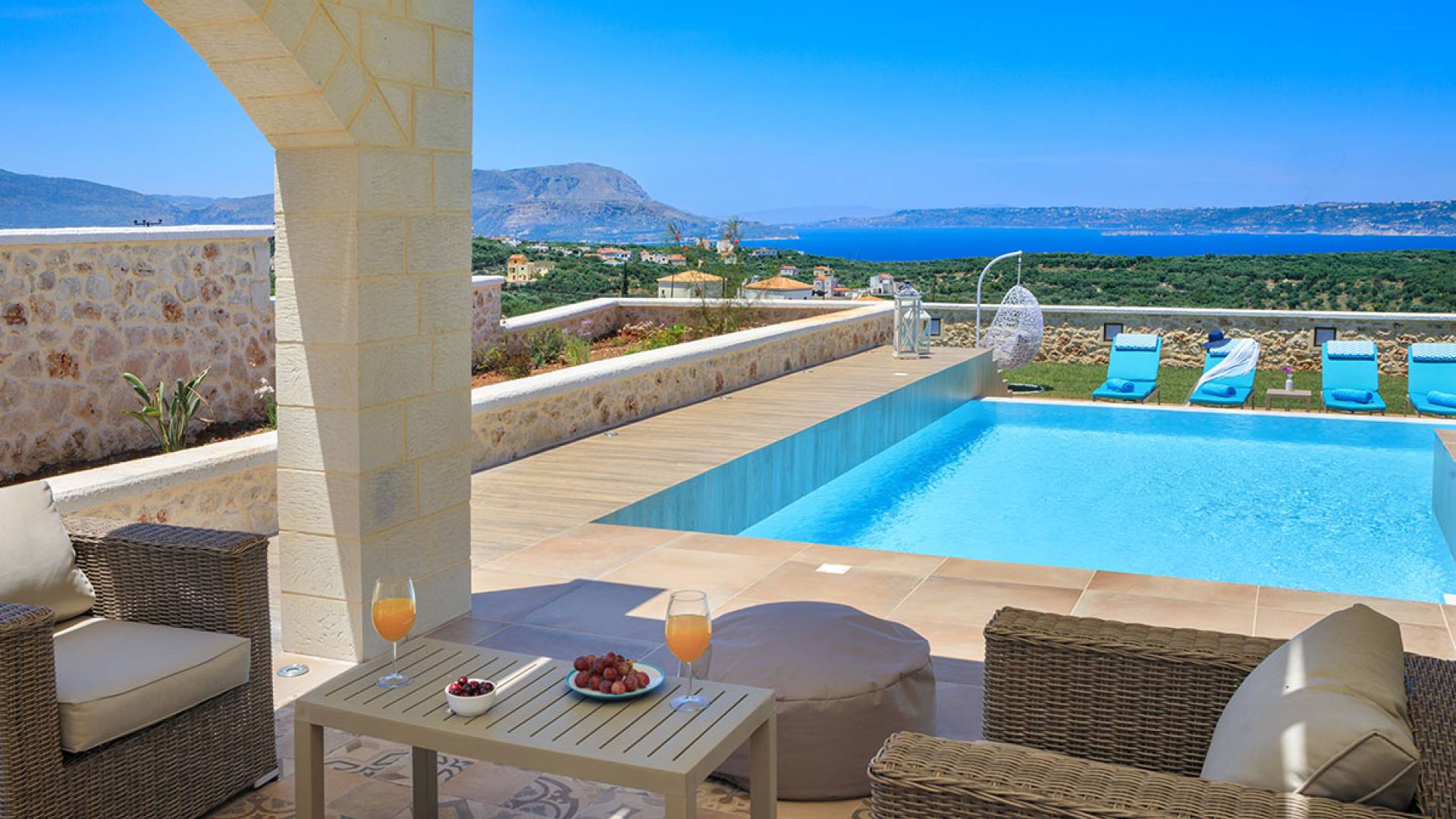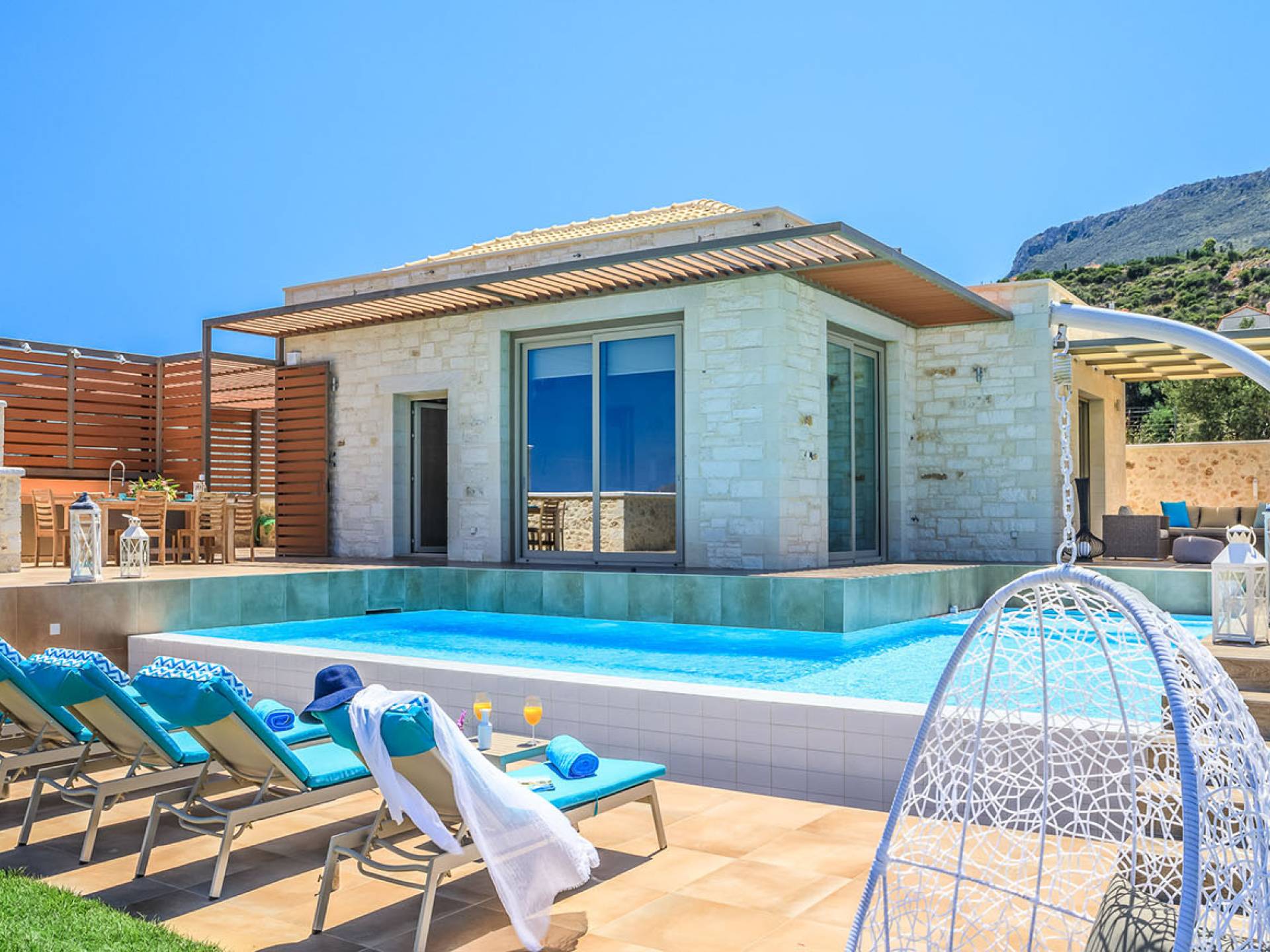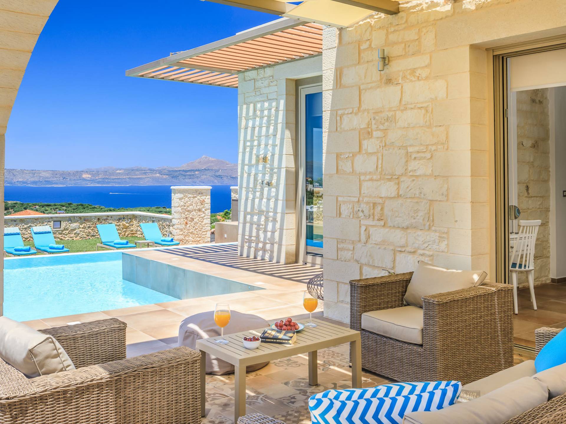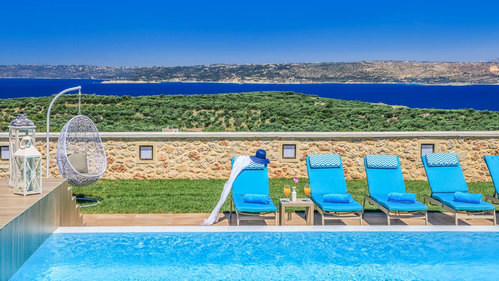 На расстоянии одного метра вы увидите бассейн площадью 60 кв. м, где вы можете насладиться напитком в зоне отдыха с гидромассажем. Здесь также есть барбекю и обеденный стол, а также зона отдыха, где вы можете послушать музыку или даже почитать книгу в сопровождении различных природных звуков критской сельской местности. Вечером вы можете насладиться великолепным романтическим закатом, который раскрашивает прекраснейшими красками чистое синее средиземноморское небо, или вы можете пройти примерно 20 минут до ближайших таверн и отведать блюда критской кухни. По запросу на вилле можно заняться такими видами активного отдыха, как подводное плавание с аквалангом, прогулки на лодке или даже расслабляющий массаж в доме.