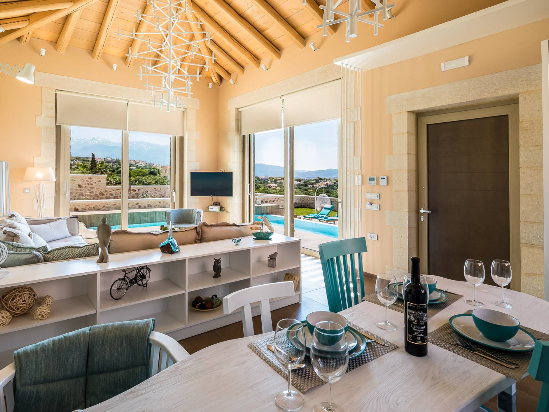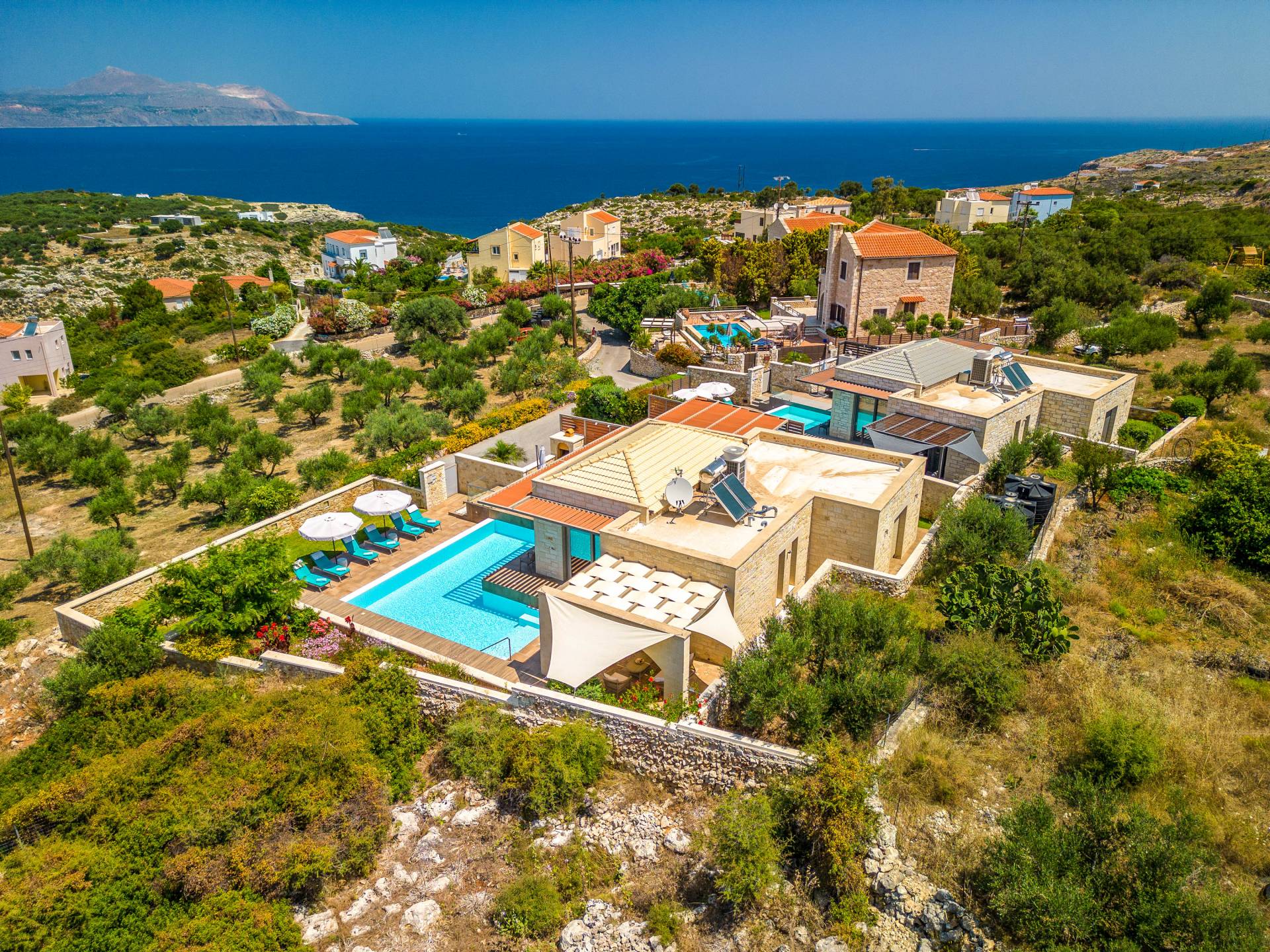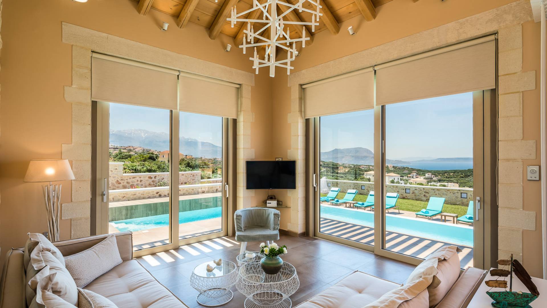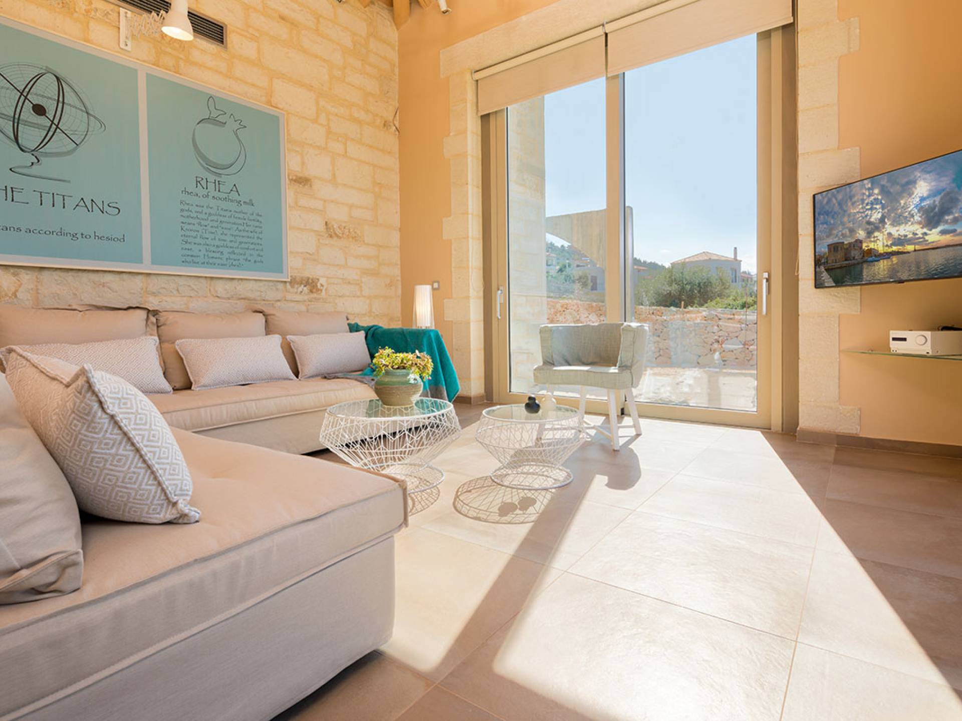 Вилла Rhea Crete состоит из двух спален с двуспальными кроватями с собственными душевыми и туалетами, а также спальни с двумя односпальными кроватями. Есть общий санузел с двухместной ванной типа джакузи и душевой кабиной. Кухня полностью оборудована и представляет собой зону открытой планировки с зоной отдыха. Есть две большие оконные двери высотой 3,5 м, поэтому вы не упустите ничего из вида, даже находясь внутри.