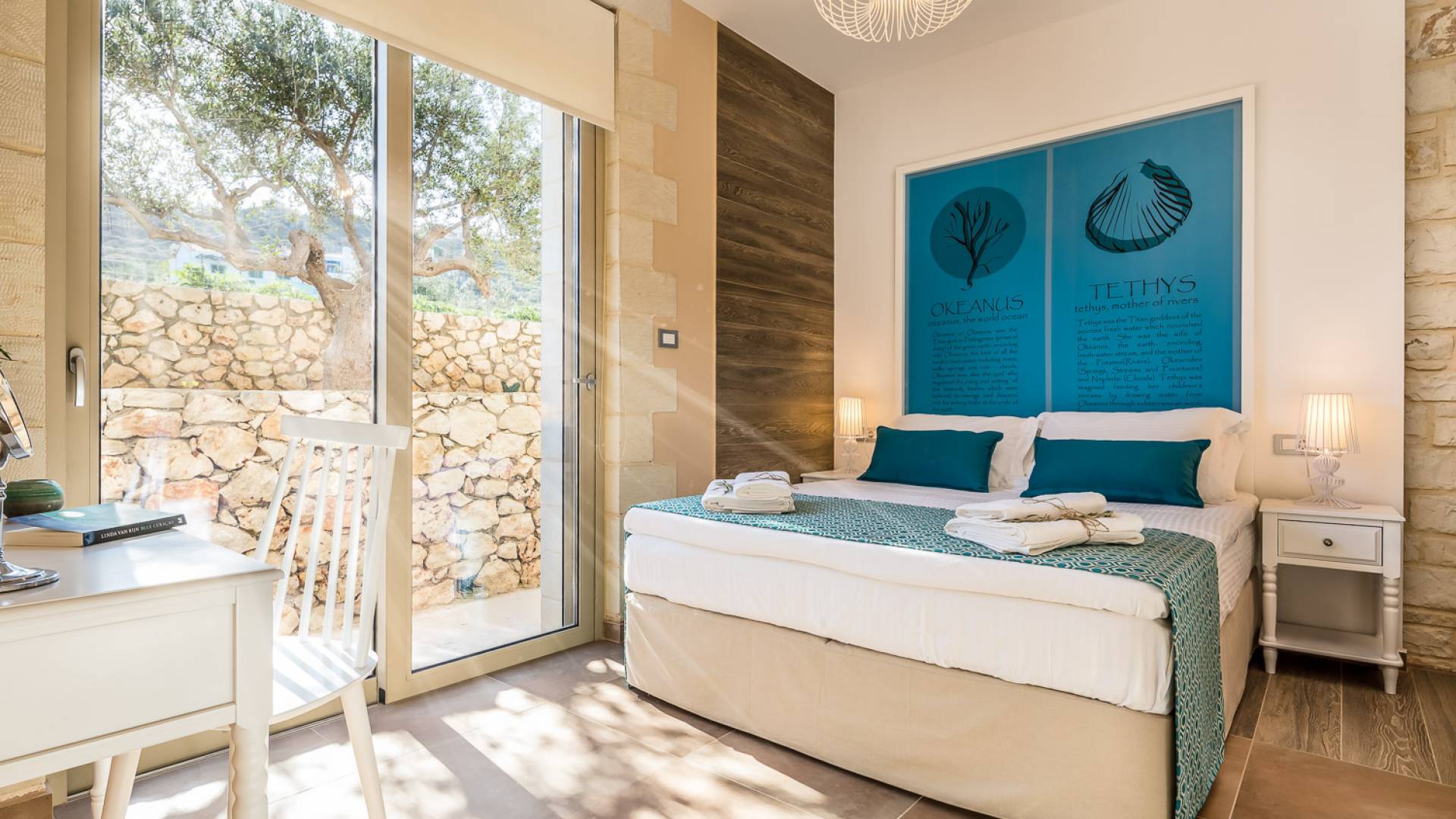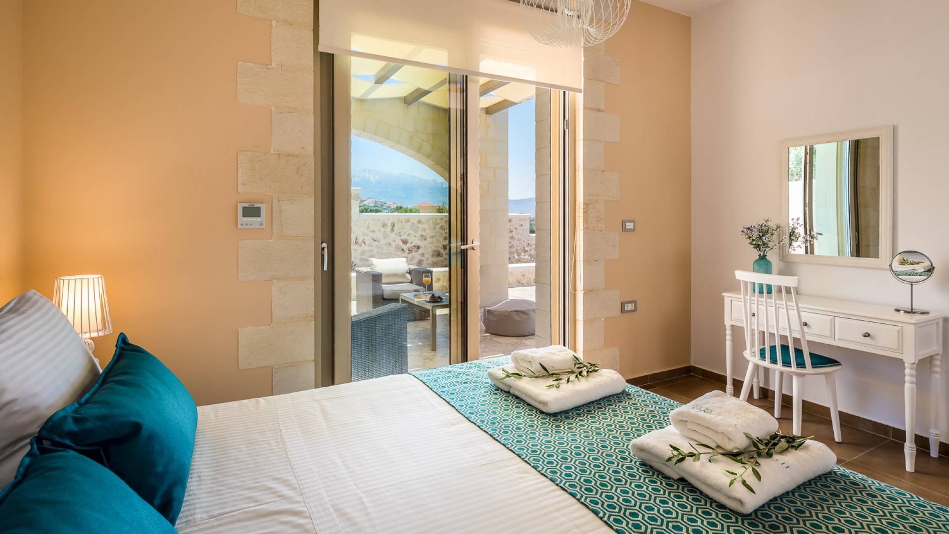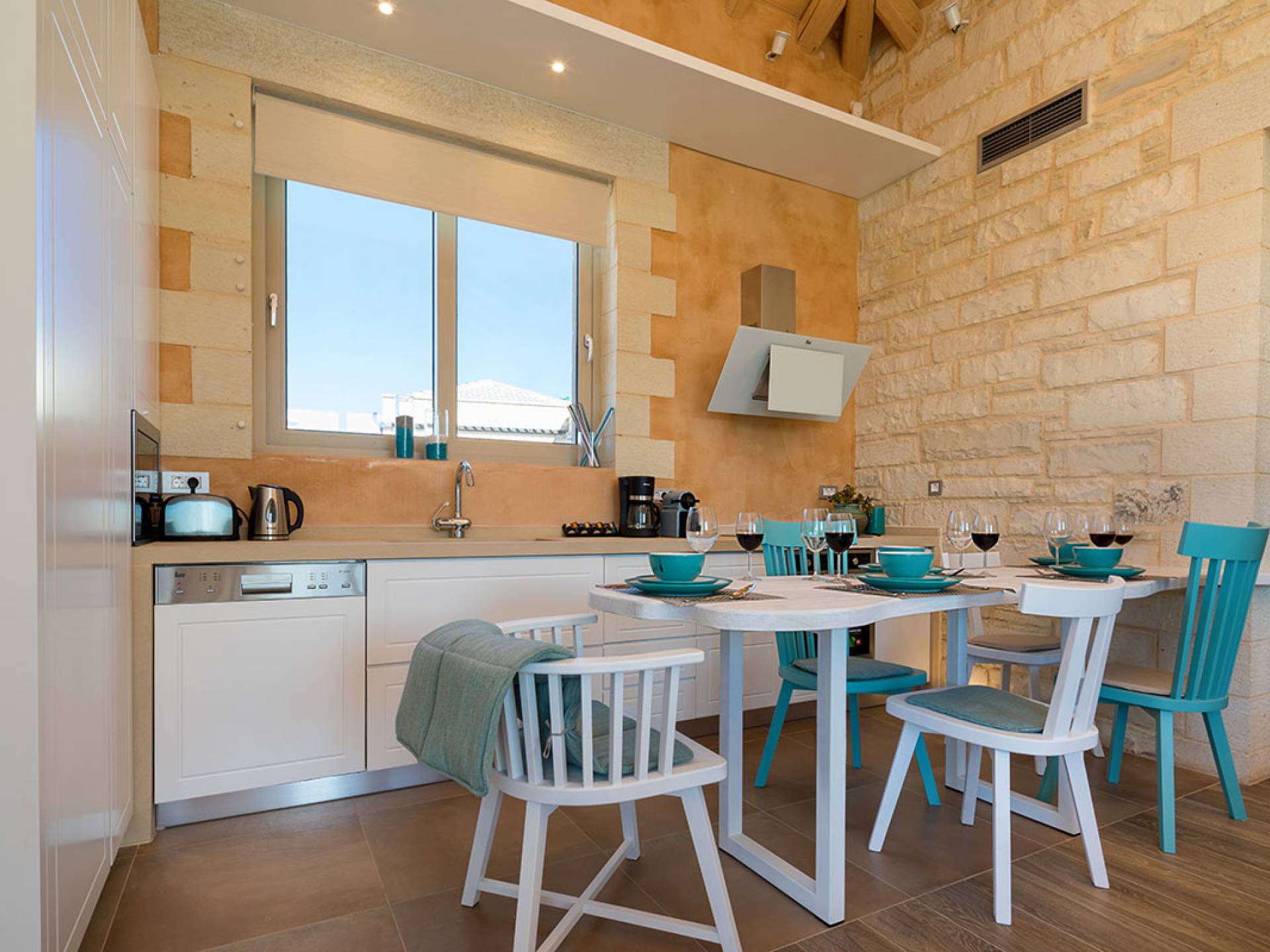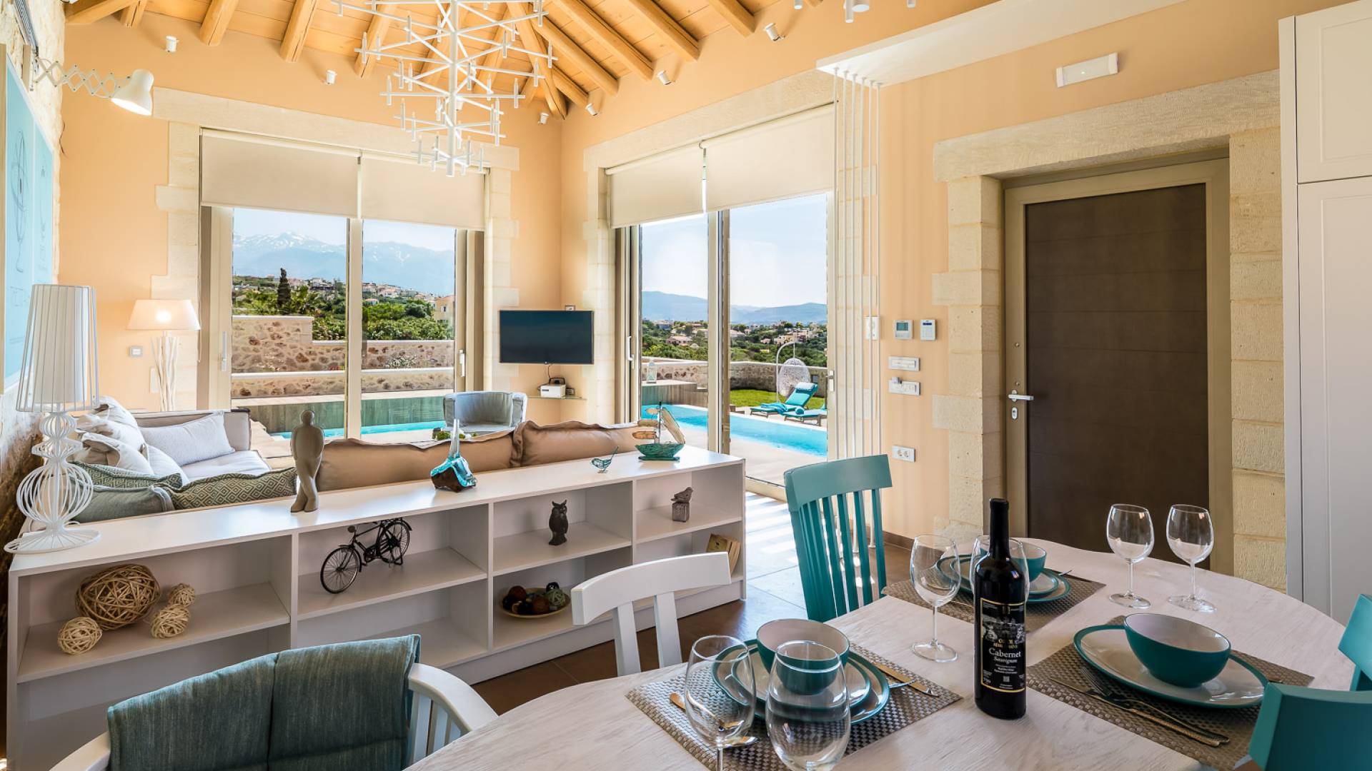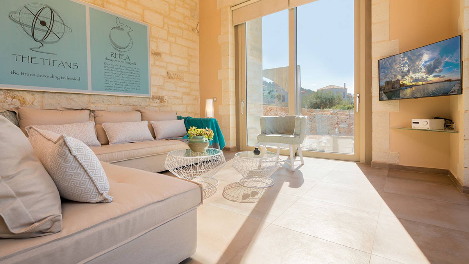 Вилла Rhea Crete состоит из двух спален с двуспальными кроватями с собственными душевыми и туалетами, а также спальни с двумя односпальными кроватями. Есть общий санузел с двухместной ванной типа джакузи и душевой кабиной. Кухня полностью оборудована и представляет собой зону открытой планировки с зоной отдыха. Есть две большие оконные двери высотой 3,5 м, поэтому вы не упустите ничего из вида, даже находясь внутри.