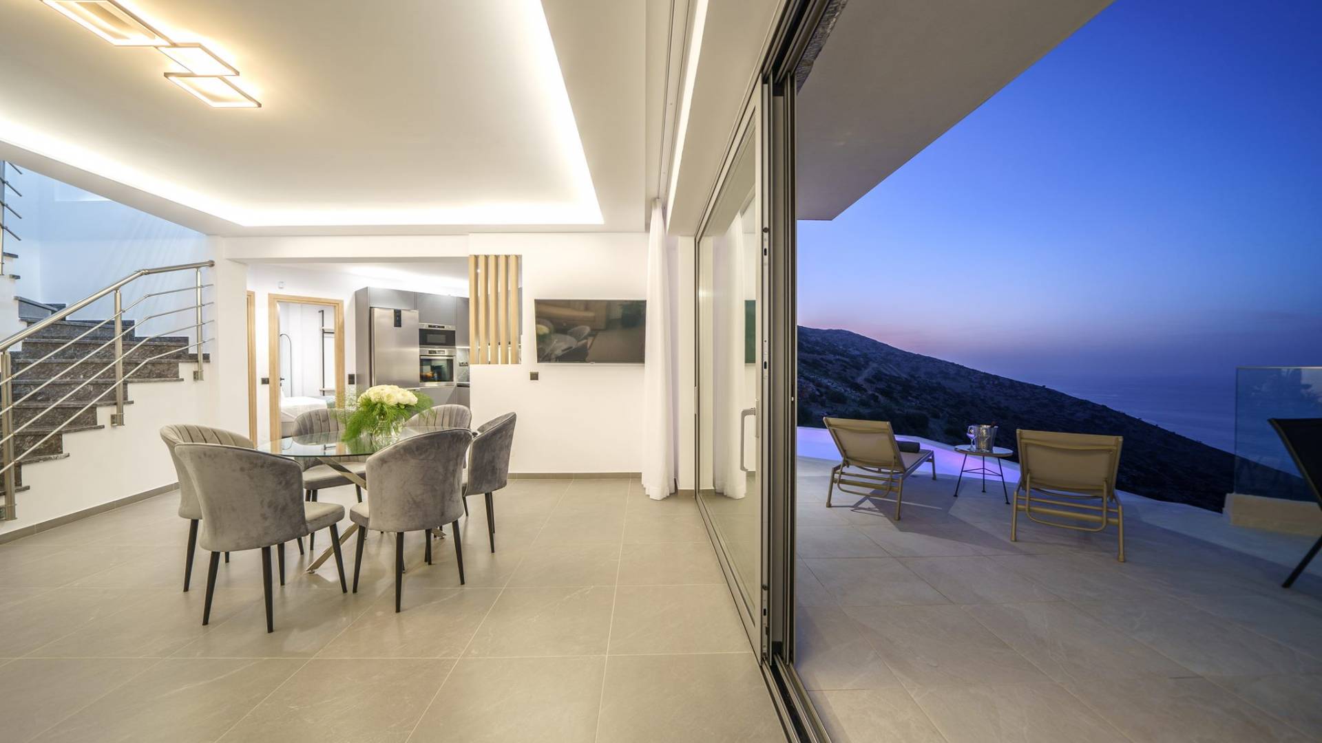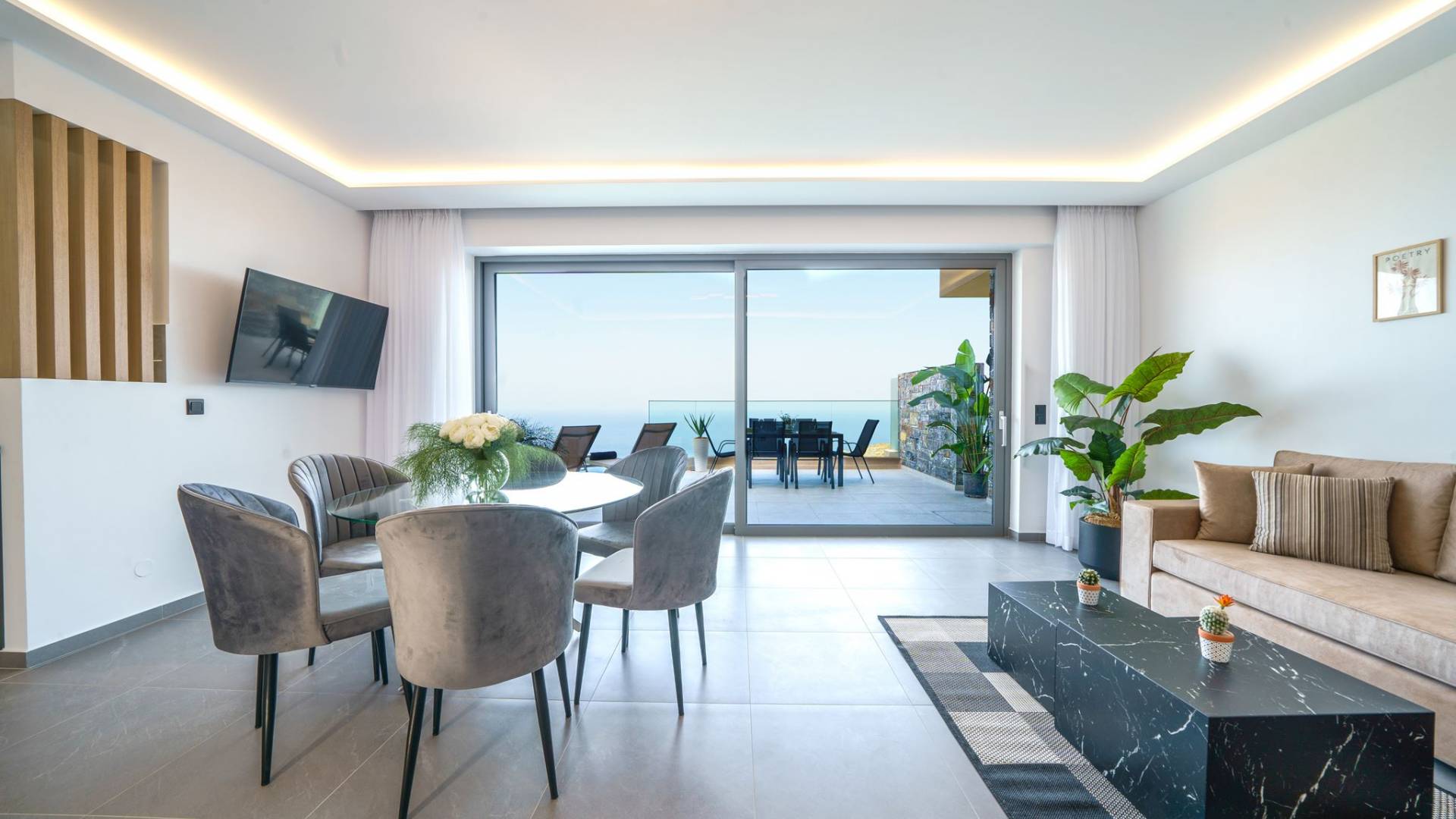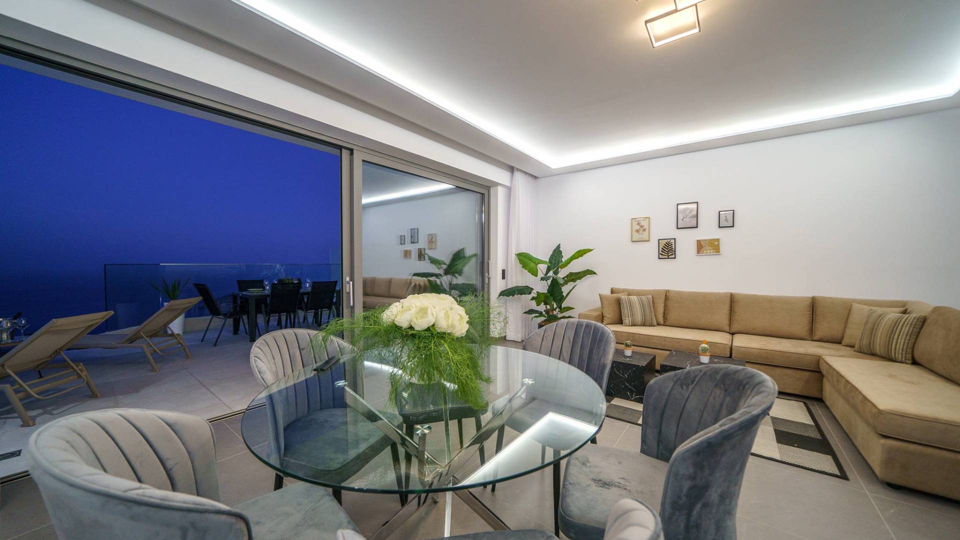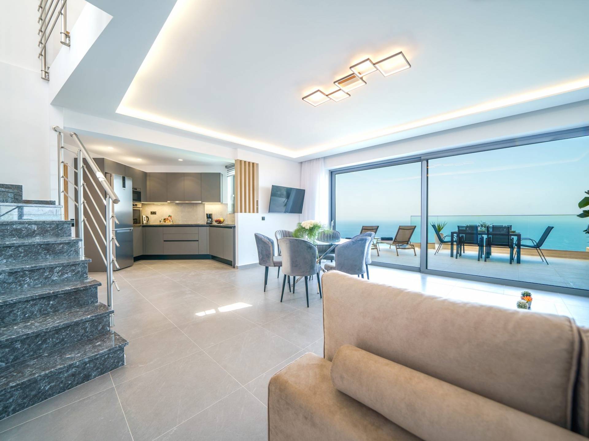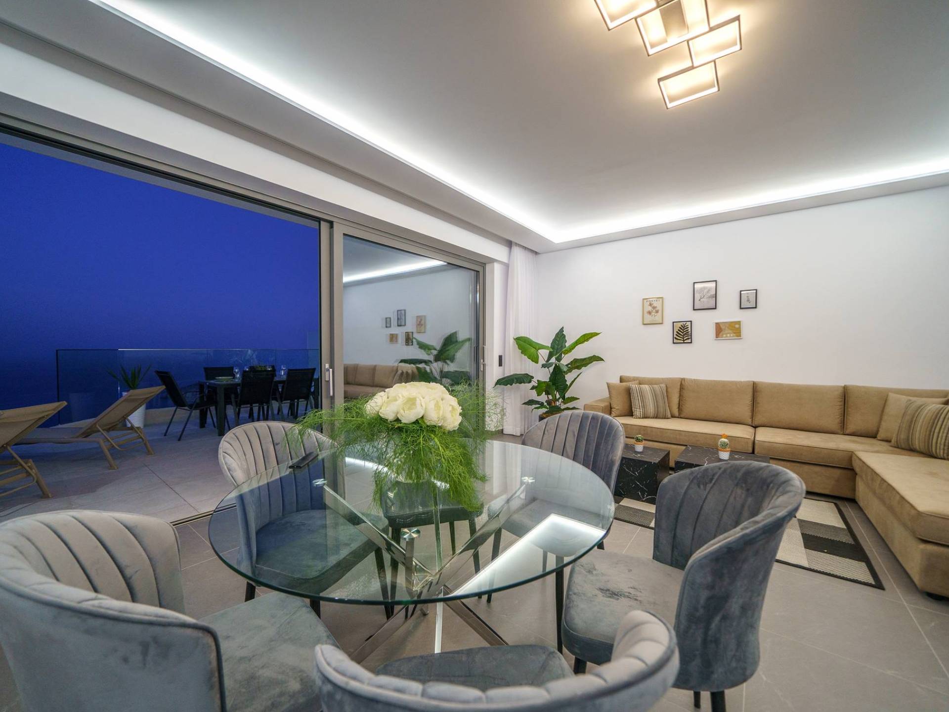 Гостиная приветствует вас стильным гостиным уголком с 50-дюймовым смарт-телевизором, который идеально подходит для расслабляющих вечеров, пока вы путешествуете дальше. Вы будете очарованы центром гостиной: просторным веранда с захватывающим видом на море, приглашающая вас насладиться красотой природы.