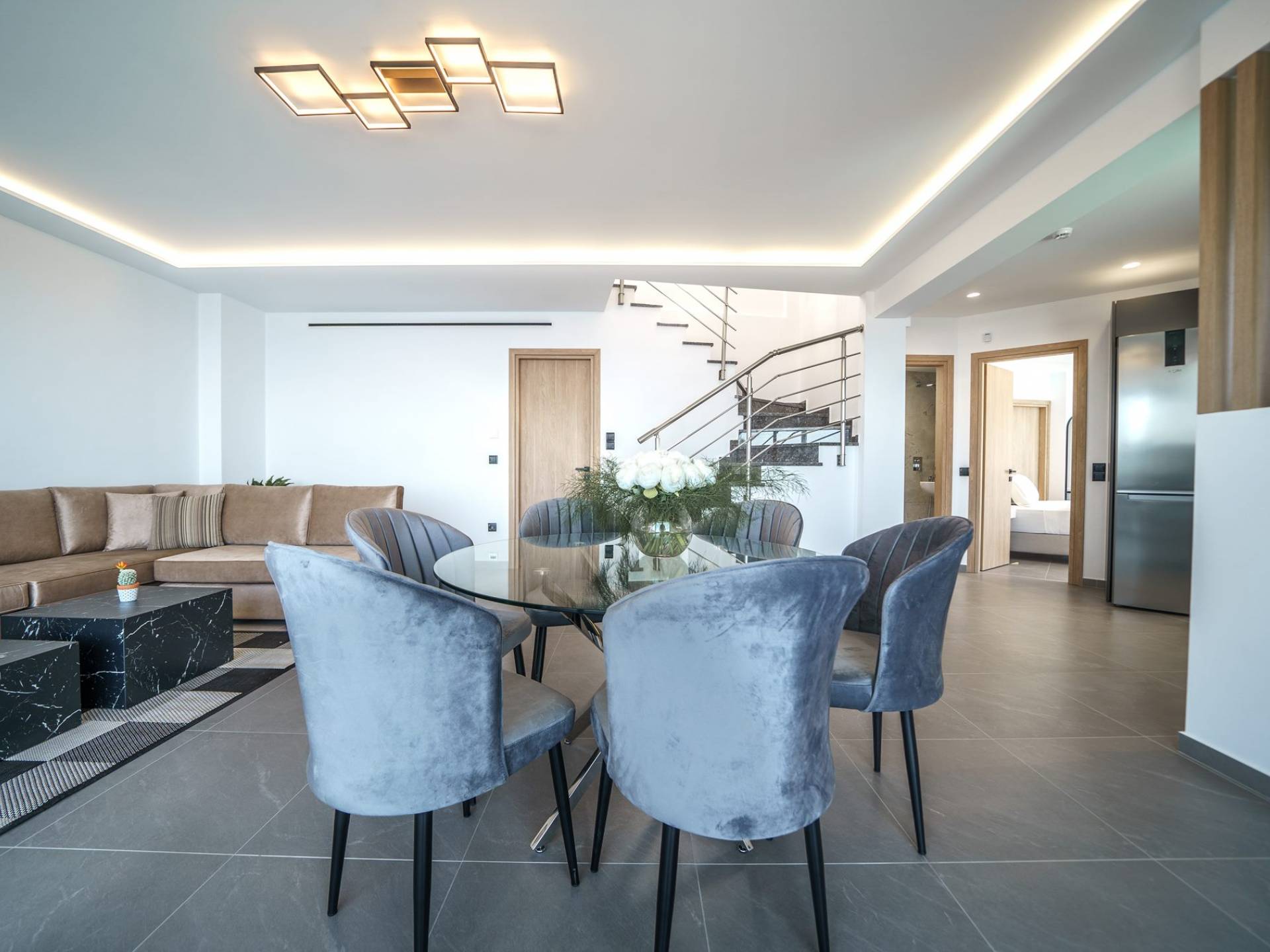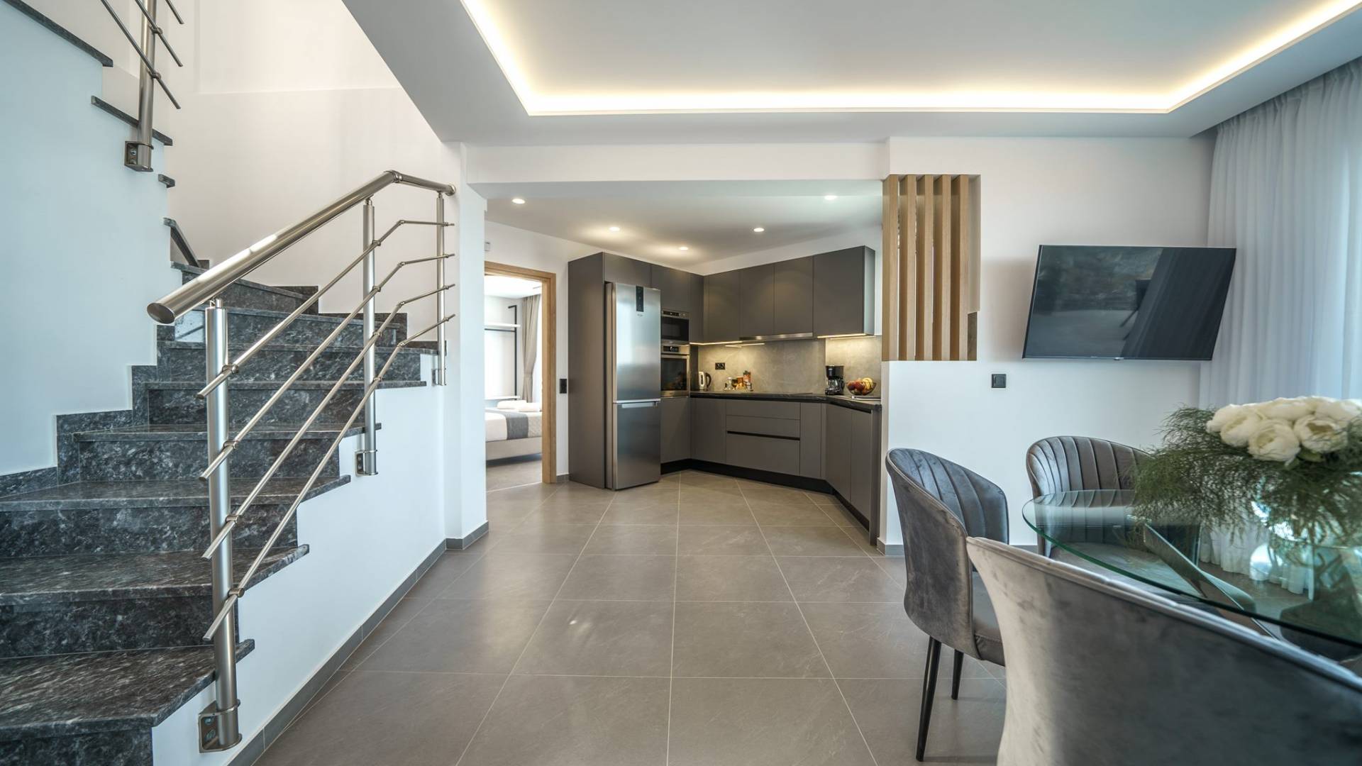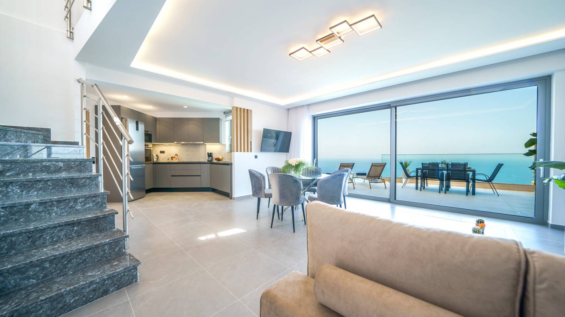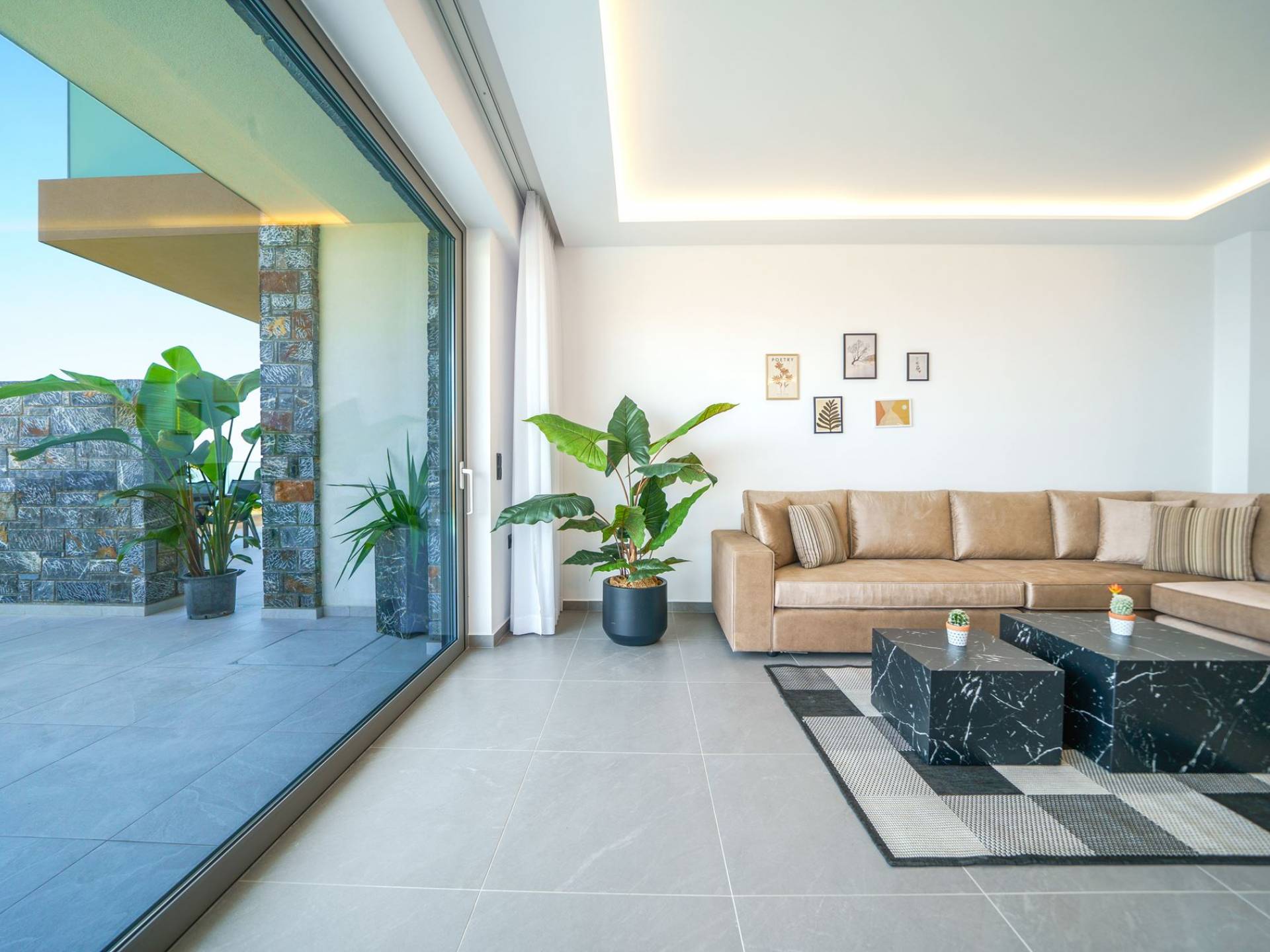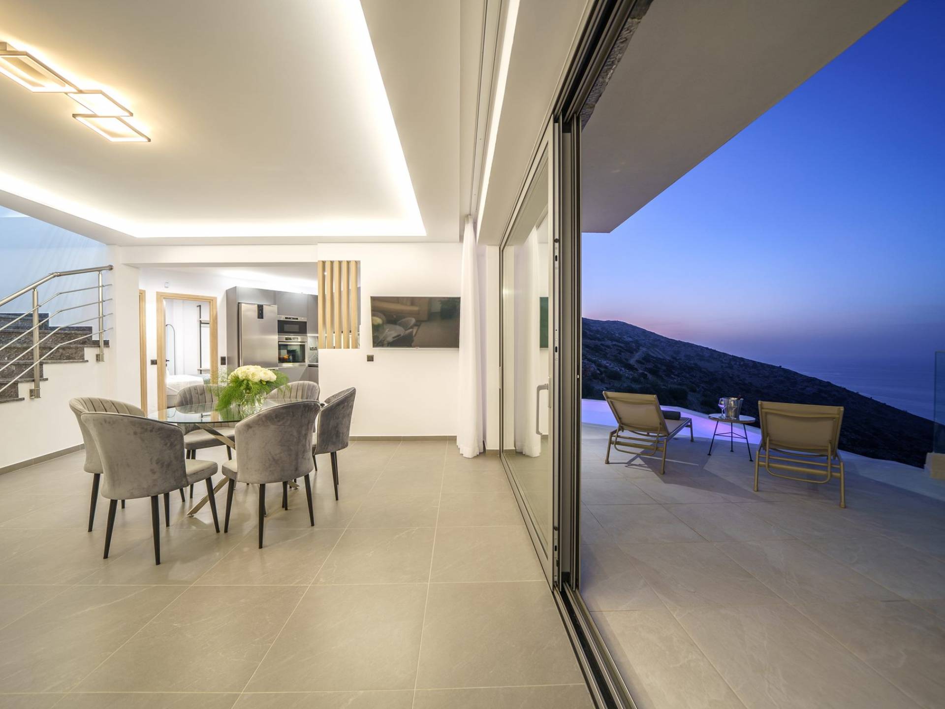 Гостиная приветствует вас стильным гостиным уголком с 50-дюймовым смарт-телевизором, который идеально подходит для расслабляющих вечеров, пока вы путешествуете дальше. Вы будете очарованы центром гостиной: просторным веранда с захватывающим видом на море, приглашающая вас насладиться красотой природы.