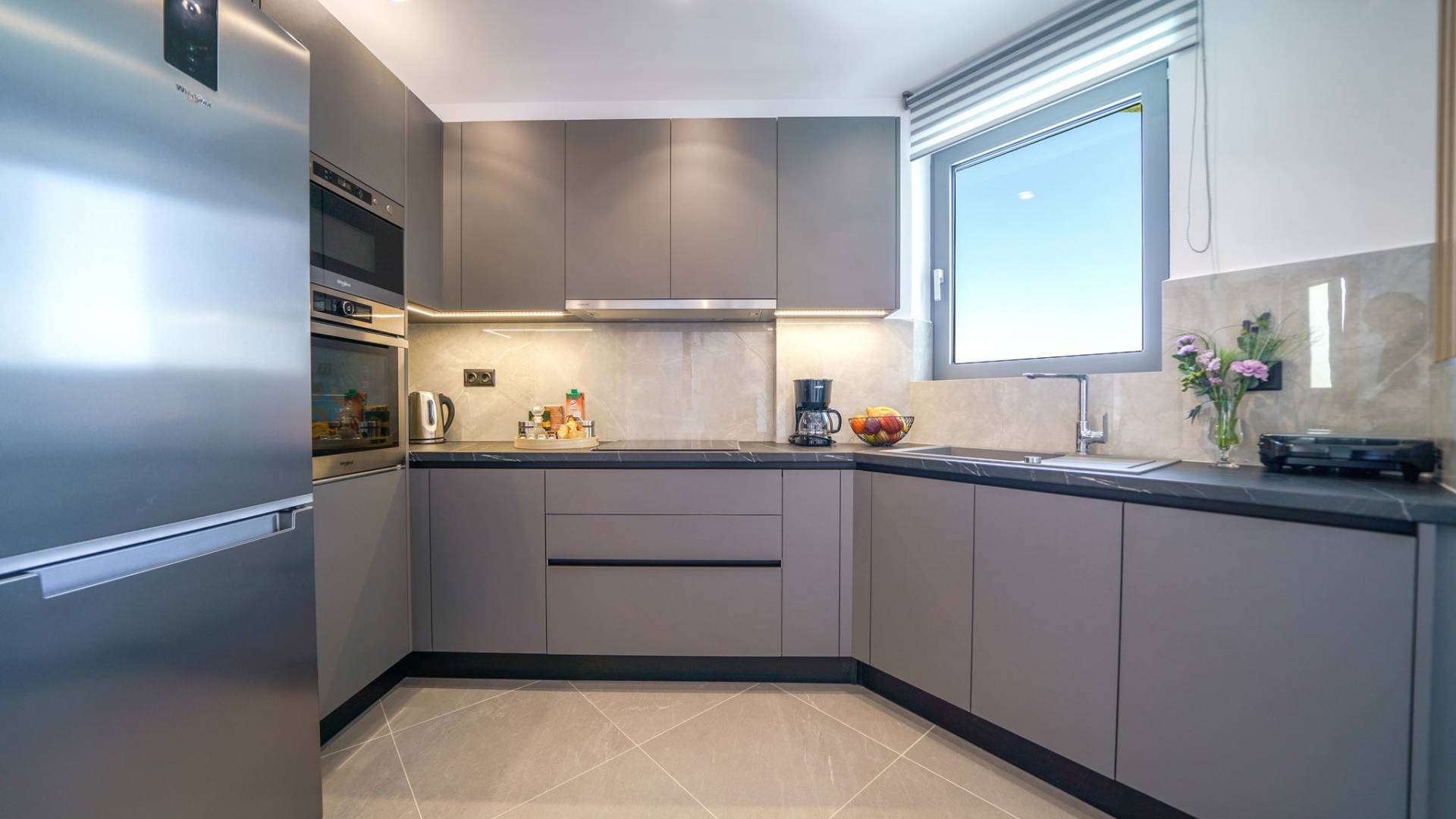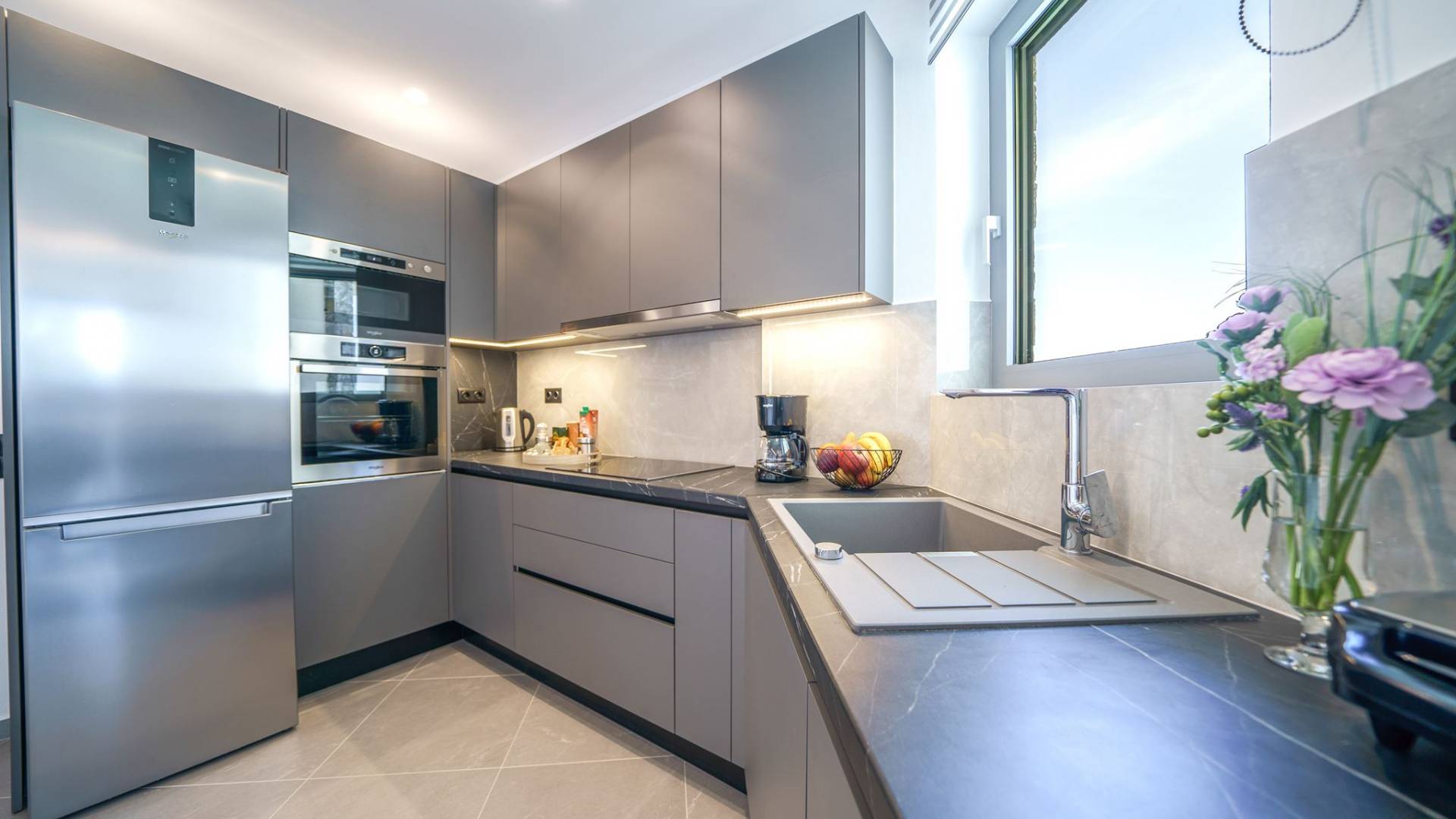 Рядом с гостиной вы найдете полностью оборудованную кухню, способную удовлетворить все ваши кулинарные пристрастия, а также прилегающий обеденный стол на 6 персон с потрясающим видом из больших окон.