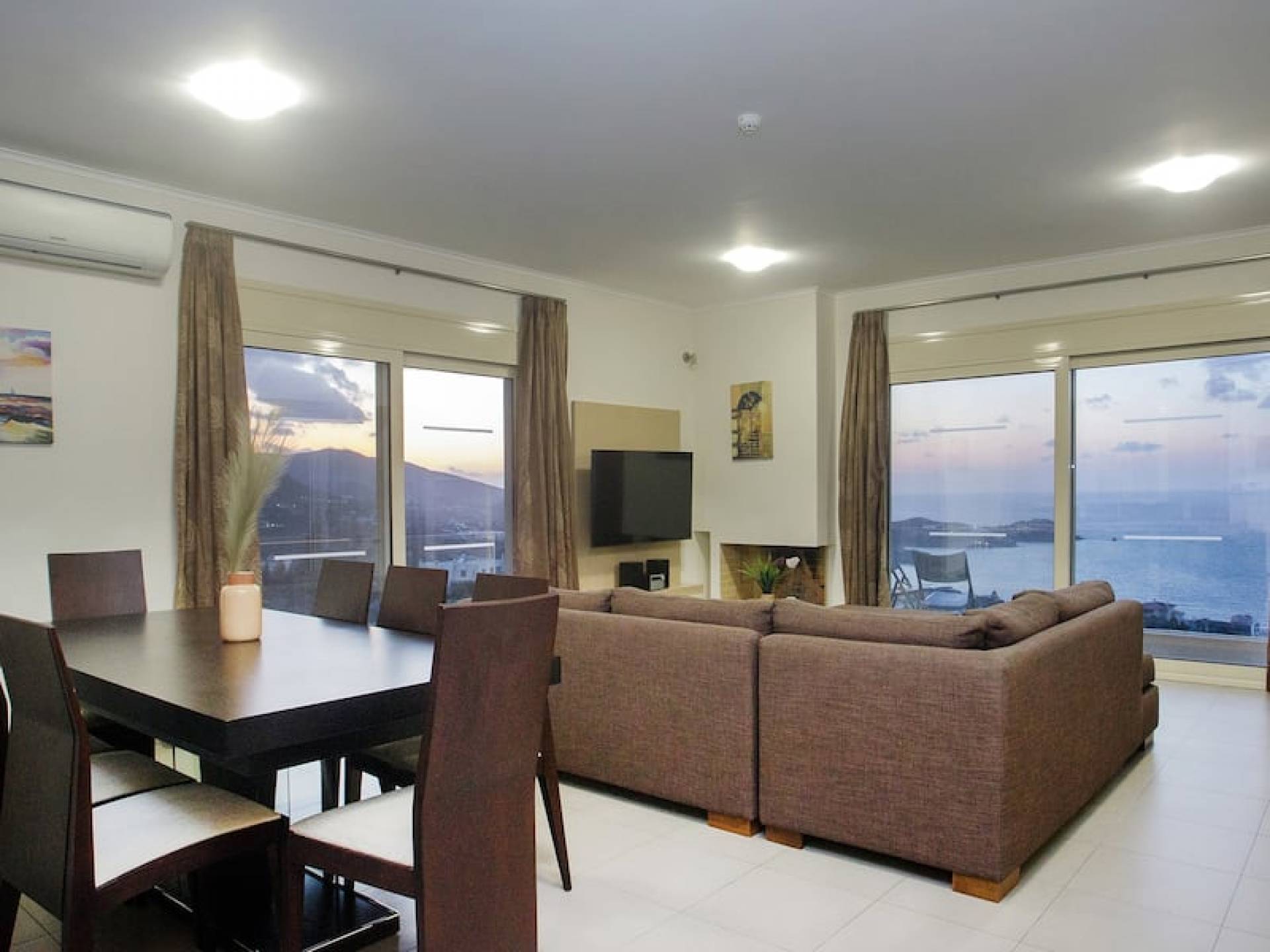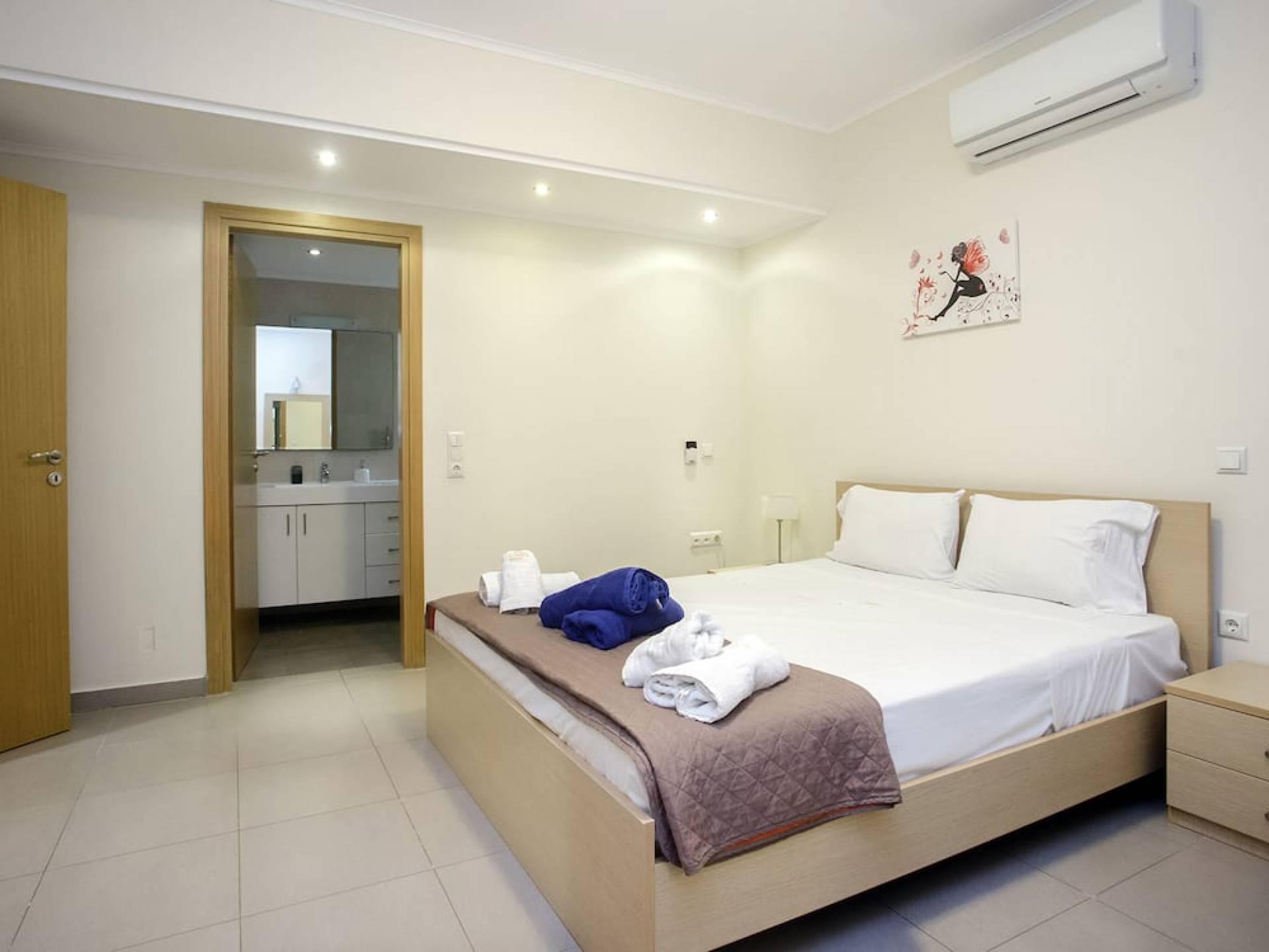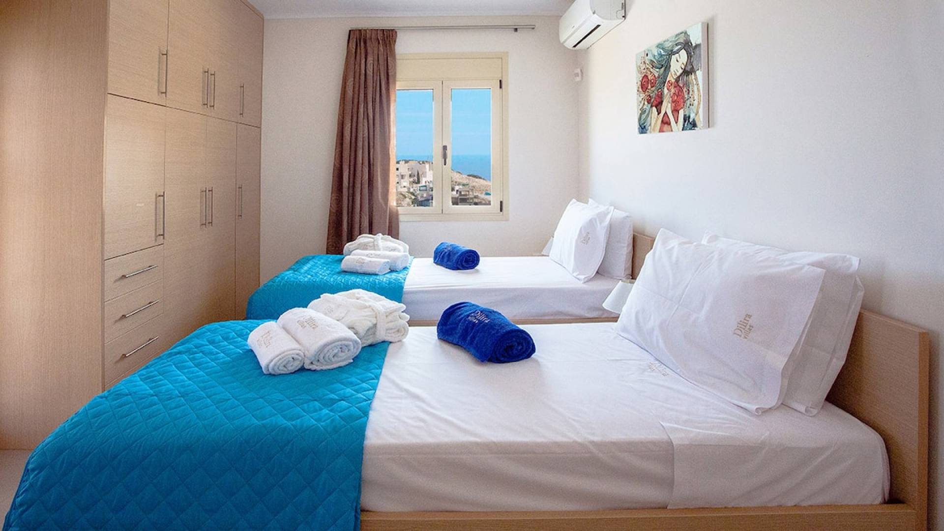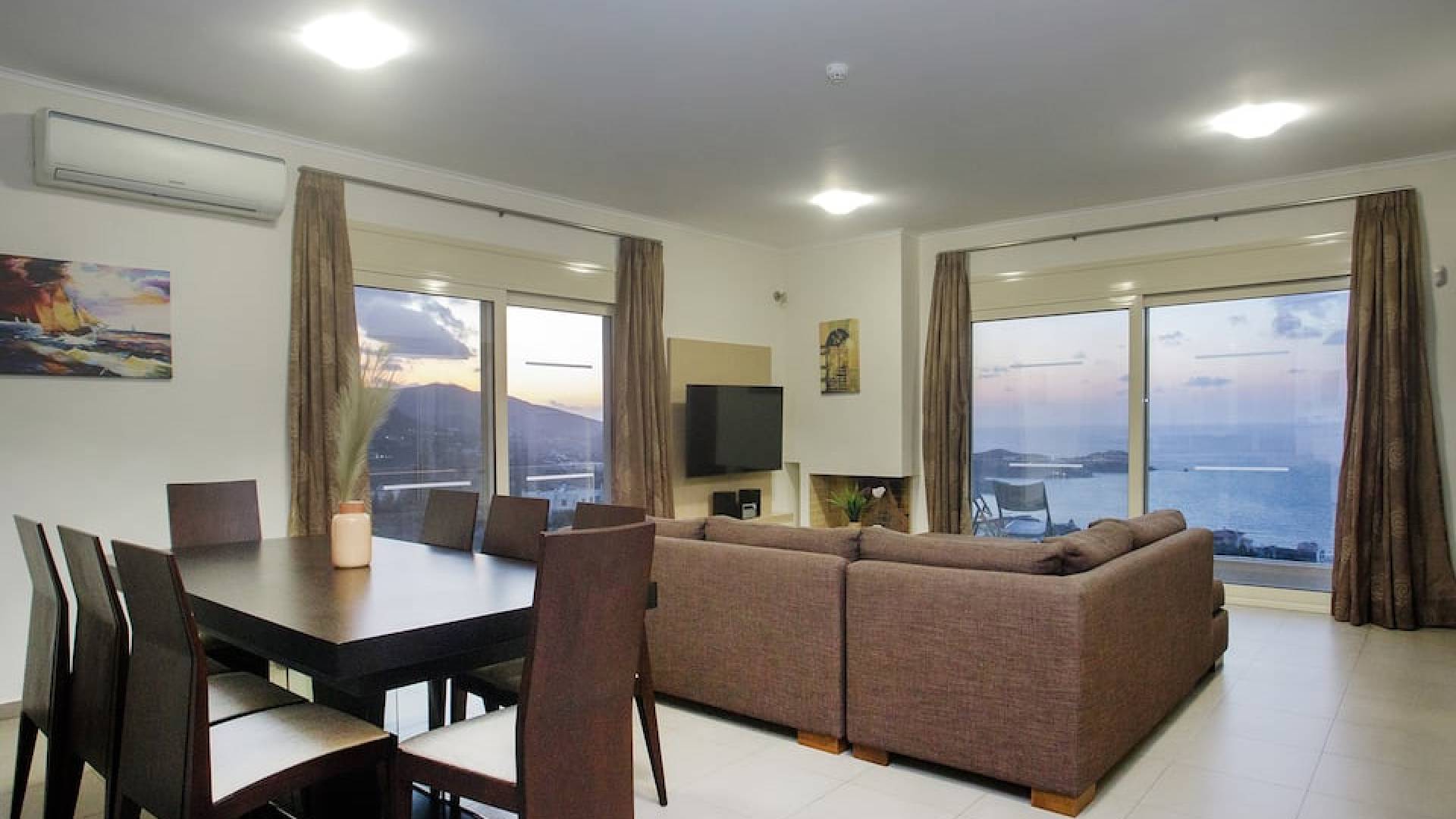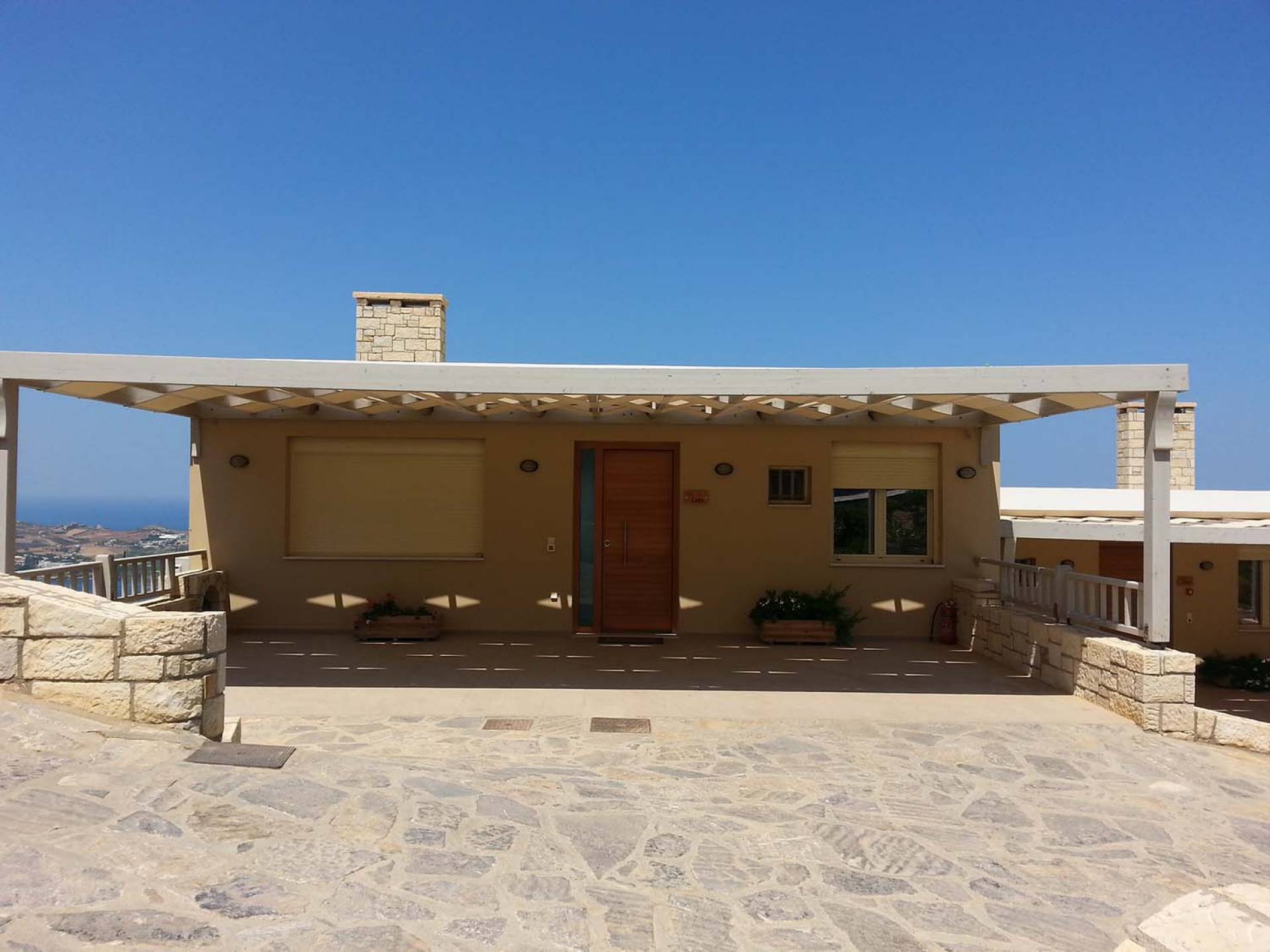 Вилла Лида Ираклион имеет 4 спальни (2 комнаты с двуспальными кроватями и 2 комнаты с двумя односпальными кроватями) и 2 ванные комнаты (одна общая и одна ванная в главной спальне) на первом этаже. Каждая комната имеет выход на веранду. Верхний этаж представляет собой общую зону с кухней, гостиной и столовой. Он окружен балконами с панорамным видом на море и горы.