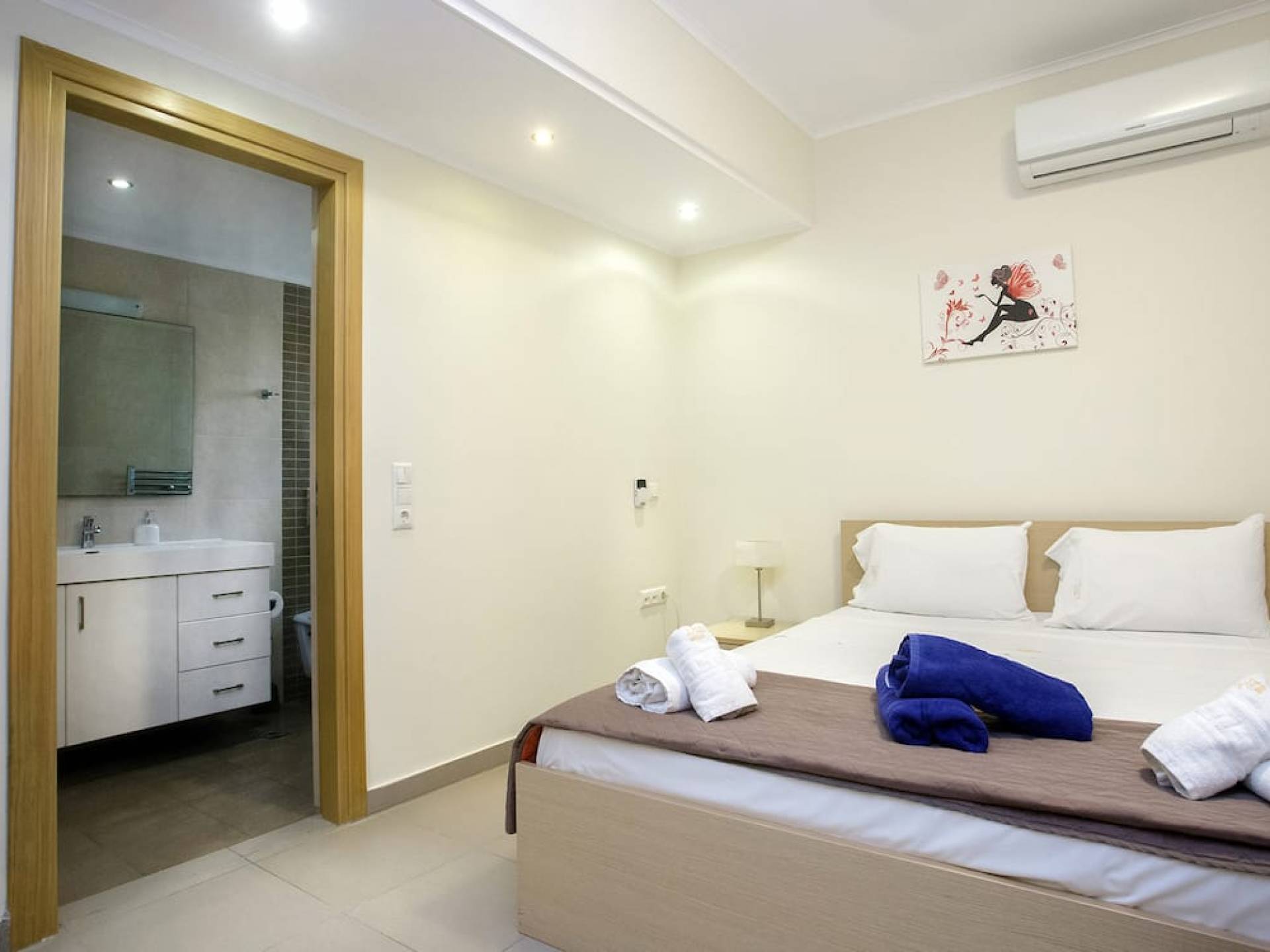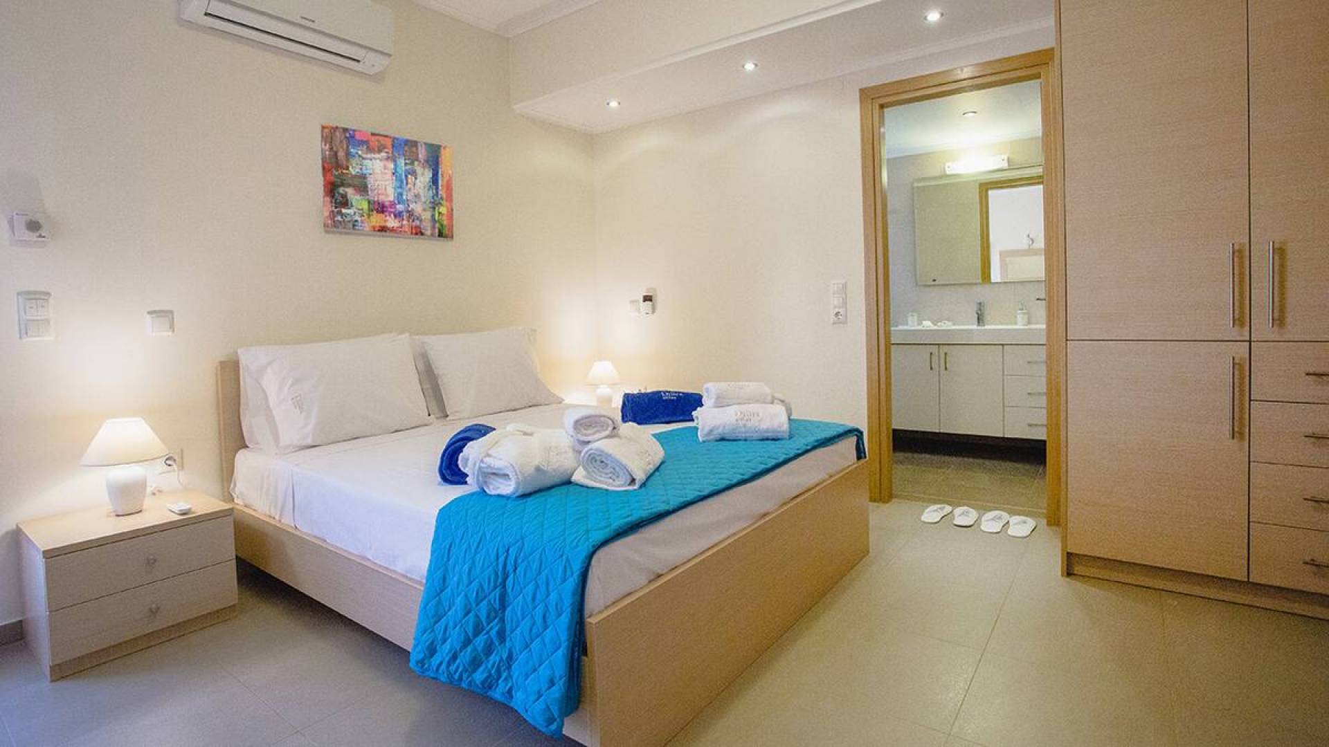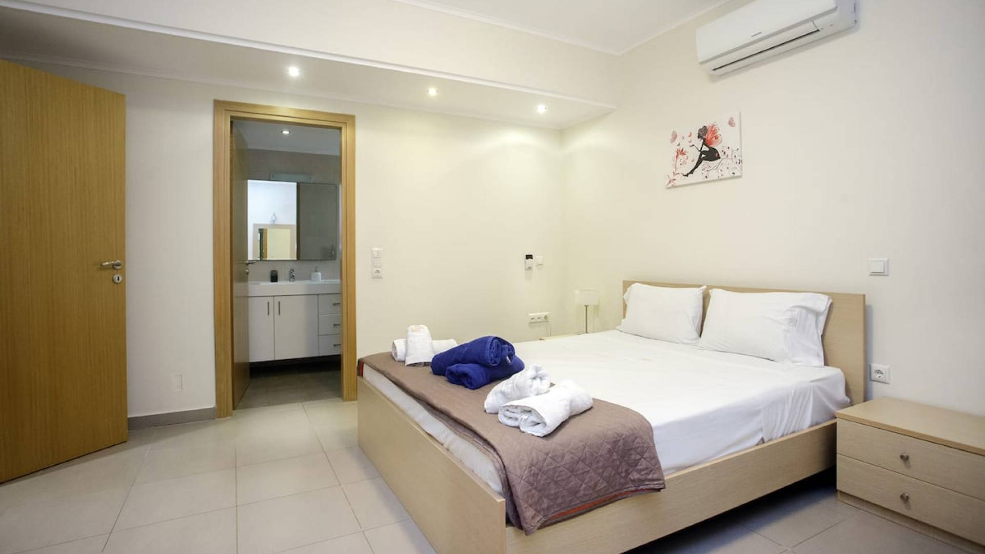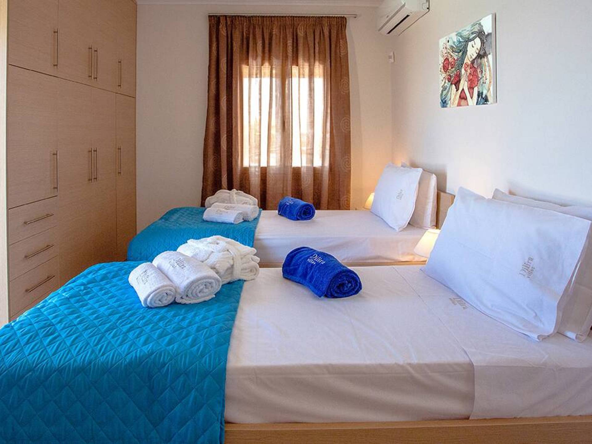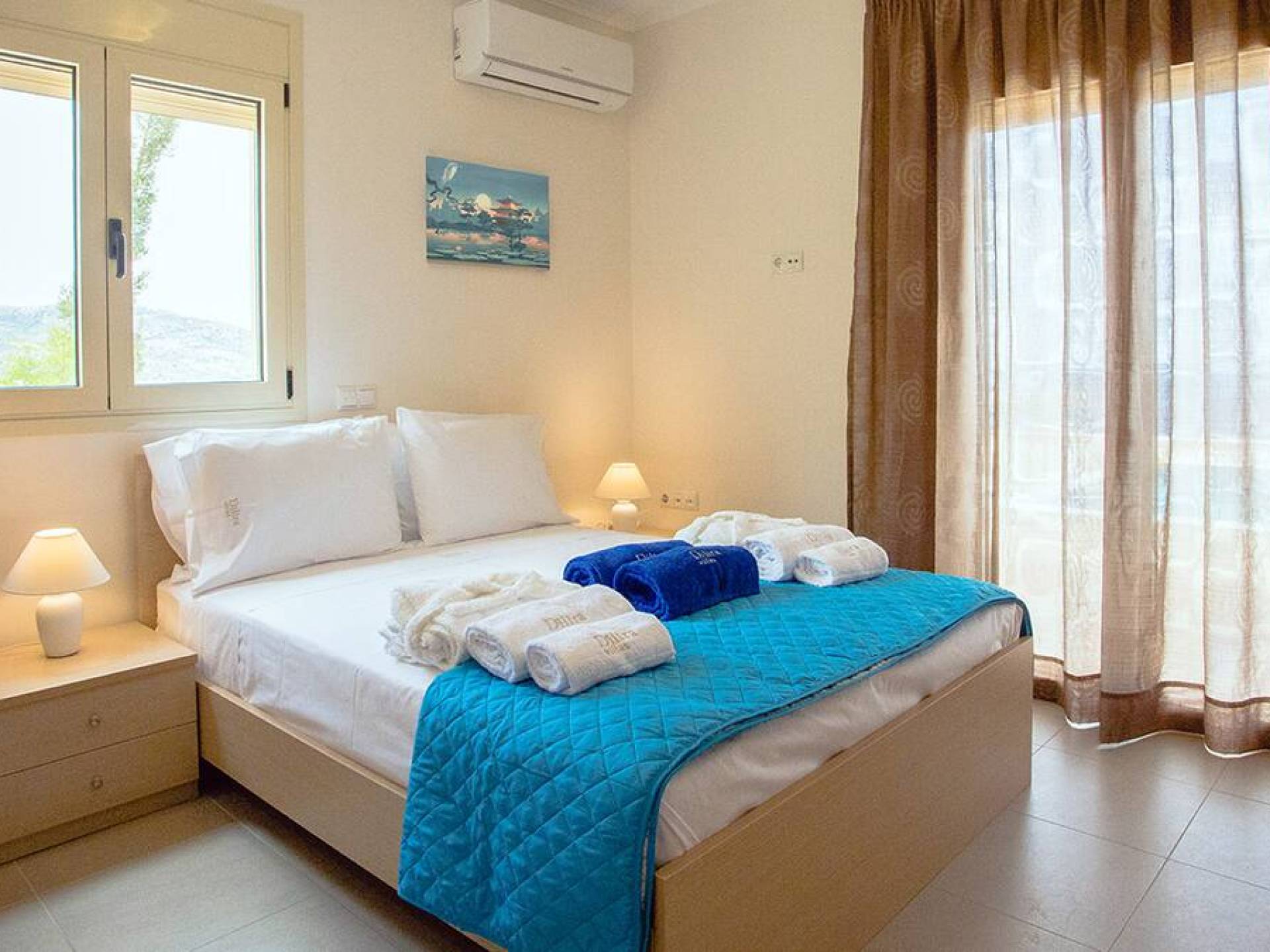 Вилла Лида Ираклион имеет 4 спальни (2 комнаты с двуспальными кроватями и 2 комнаты с двумя односпальными кроватями) и 2 ванные комнаты (одна общая и одна ванная в главной спальне) на первом этаже. Каждая комната имеет выход на веранду. Верхний этаж представляет собой общую зону с кухней, гостиной и столовой. Он окружен балконами с панорамным видом на море и горы.